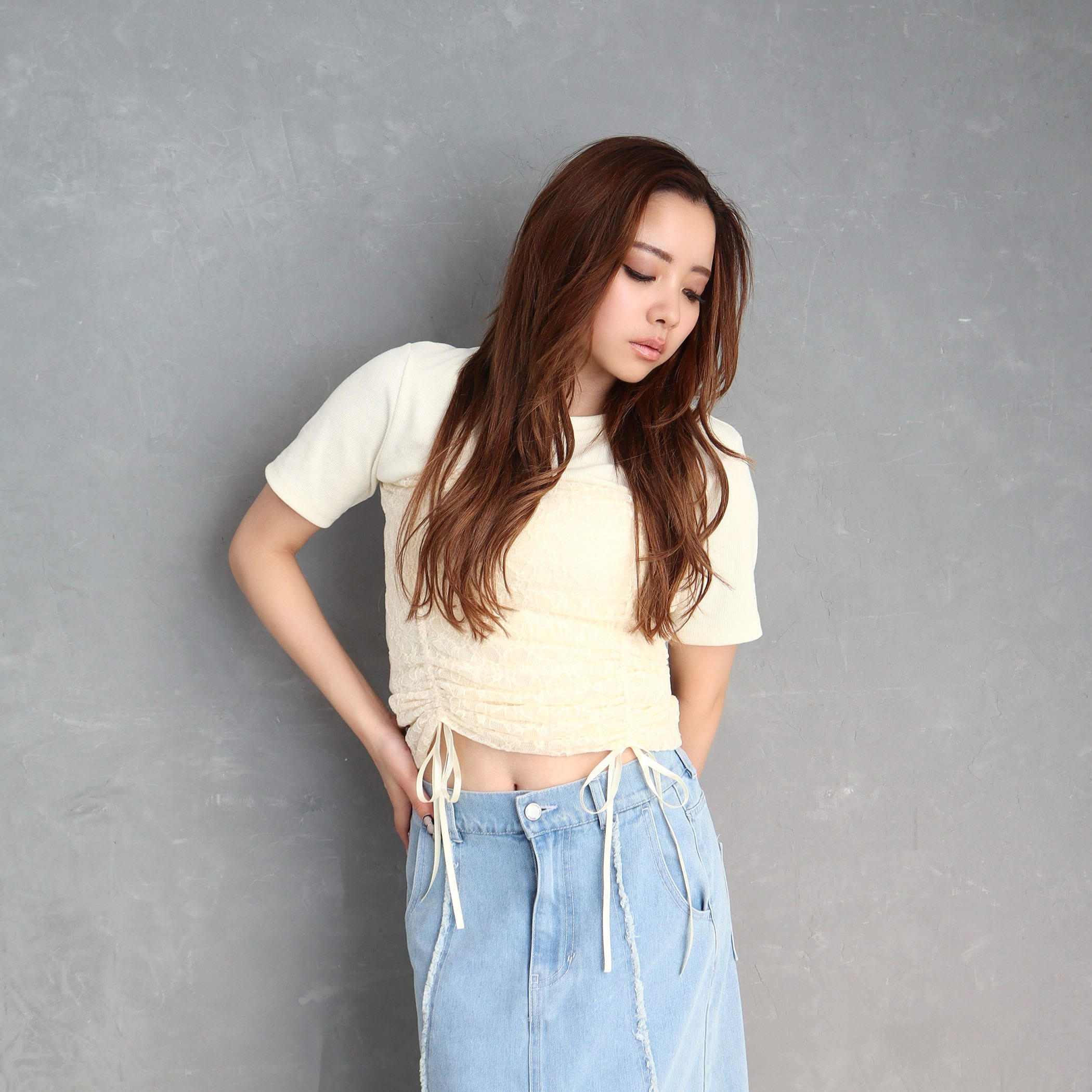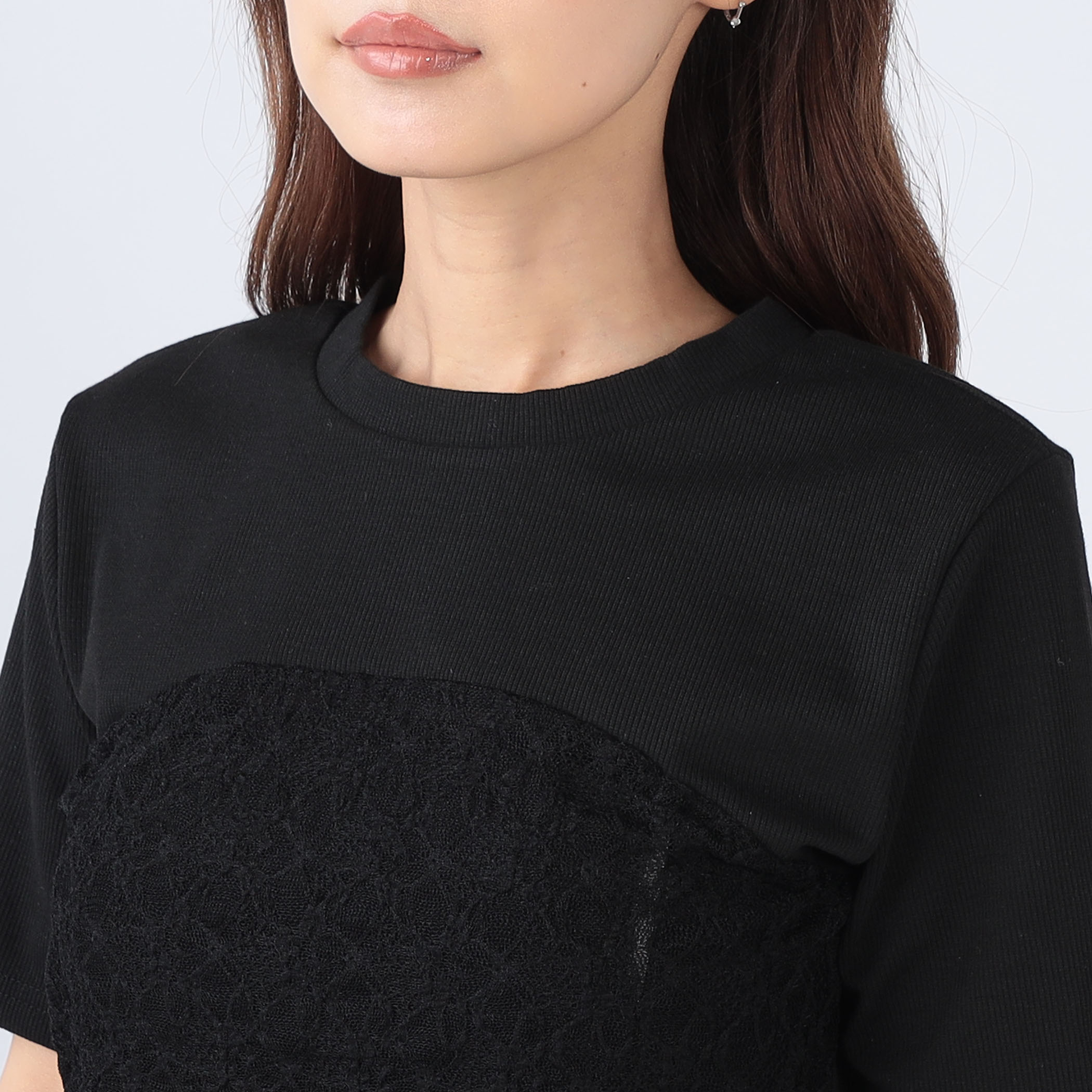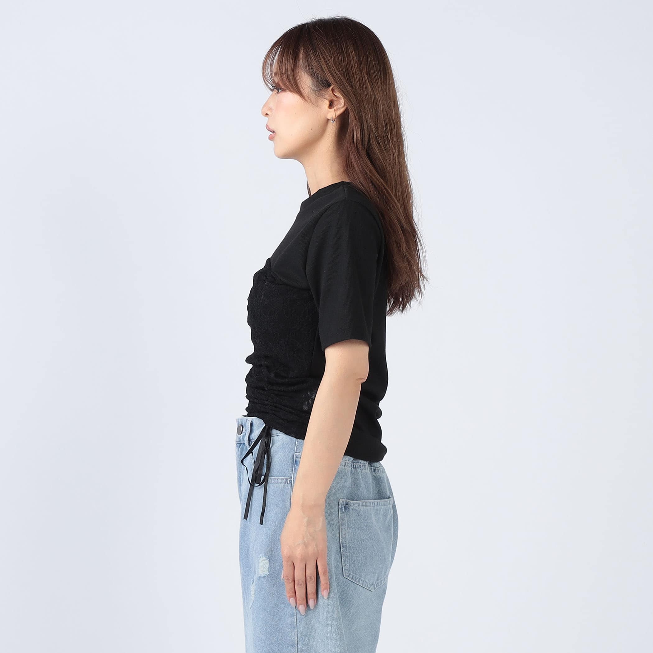 レース重ねが女性らしいデザインリブトップス。ドロスト仕様でシルエット調整ができるのが嬉しいポイント。伸縮性のあるリブ素材で着心地も◎。デニムにもスカートにもマッチする万能トップスです。
