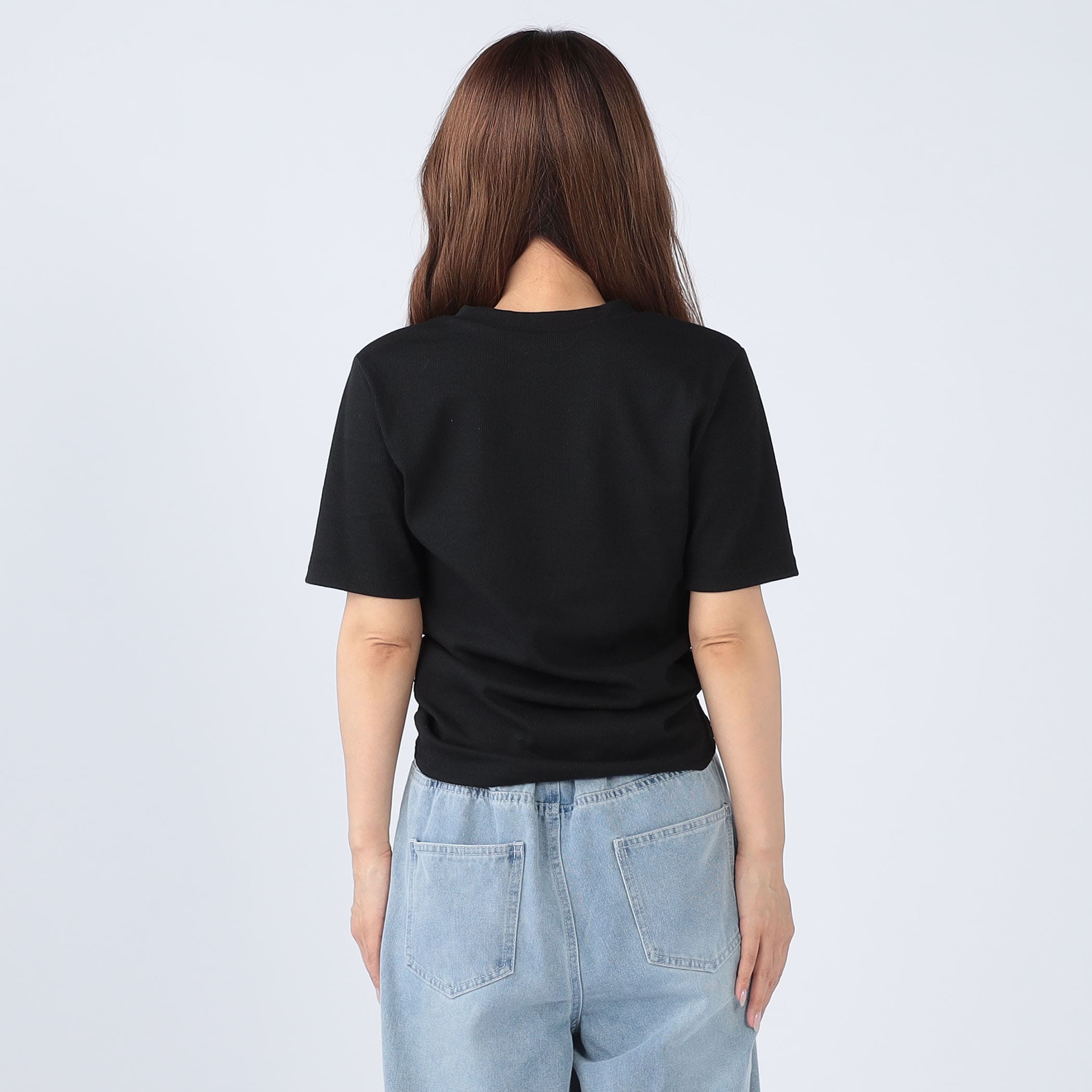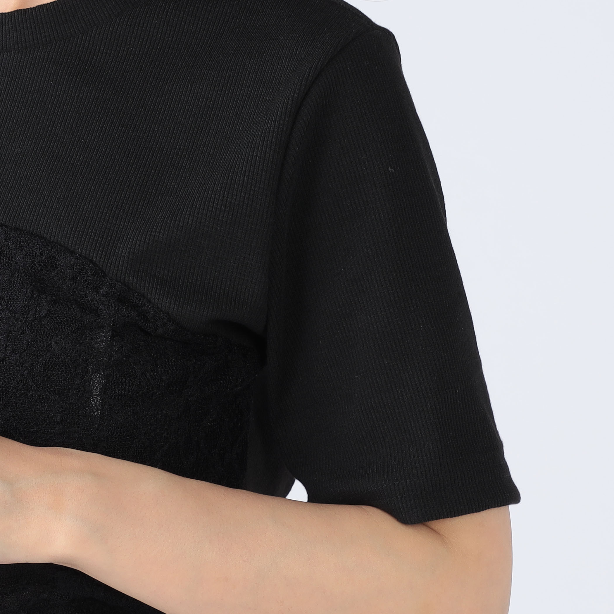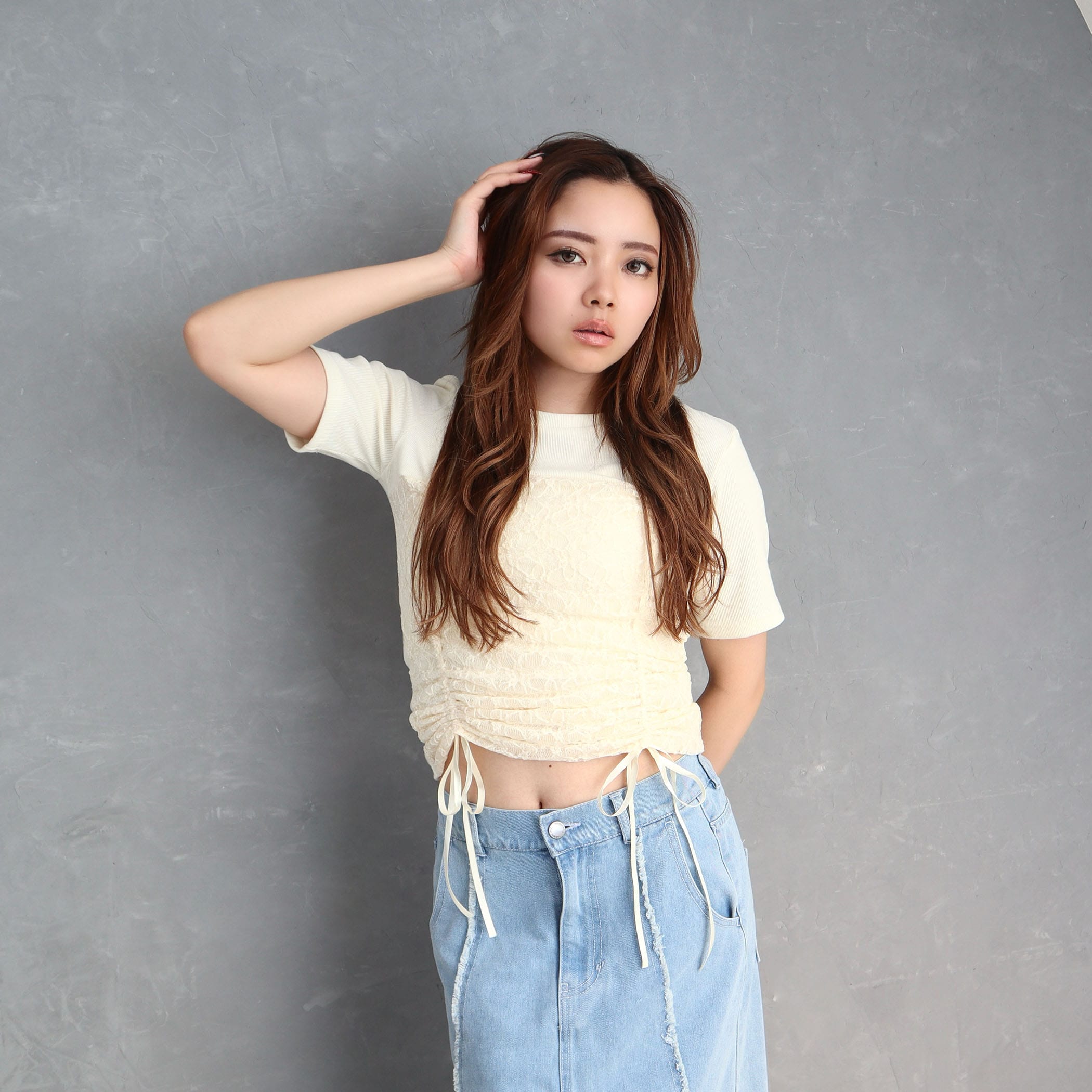 レース重ねが女性らしいデザインリブトップス。ドロスト仕様でシルエット調整ができるのが嬉しいポイント。伸縮性のあるリブ素材で着心地も◎。デニムにもスカートにもマッチする万能トップスです。