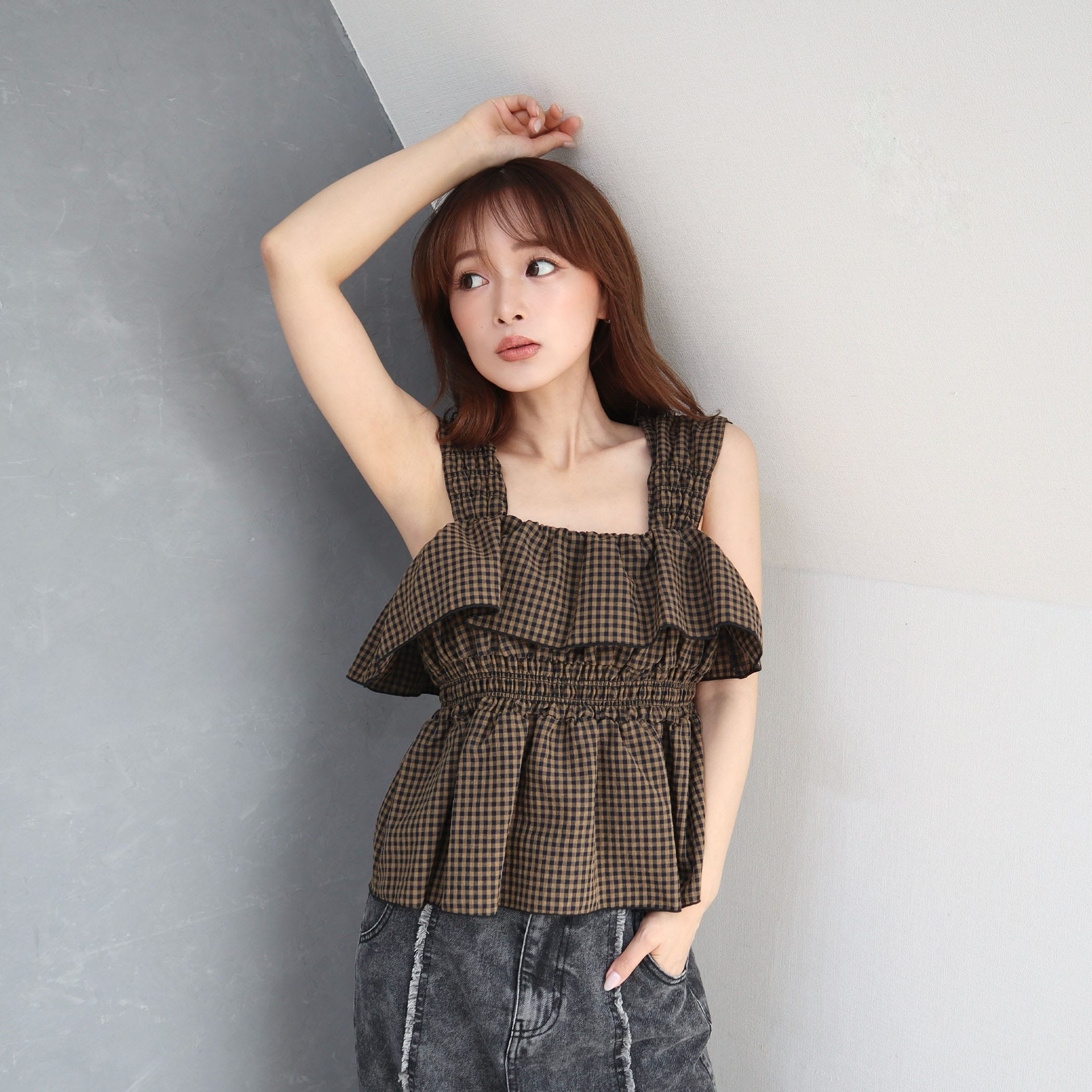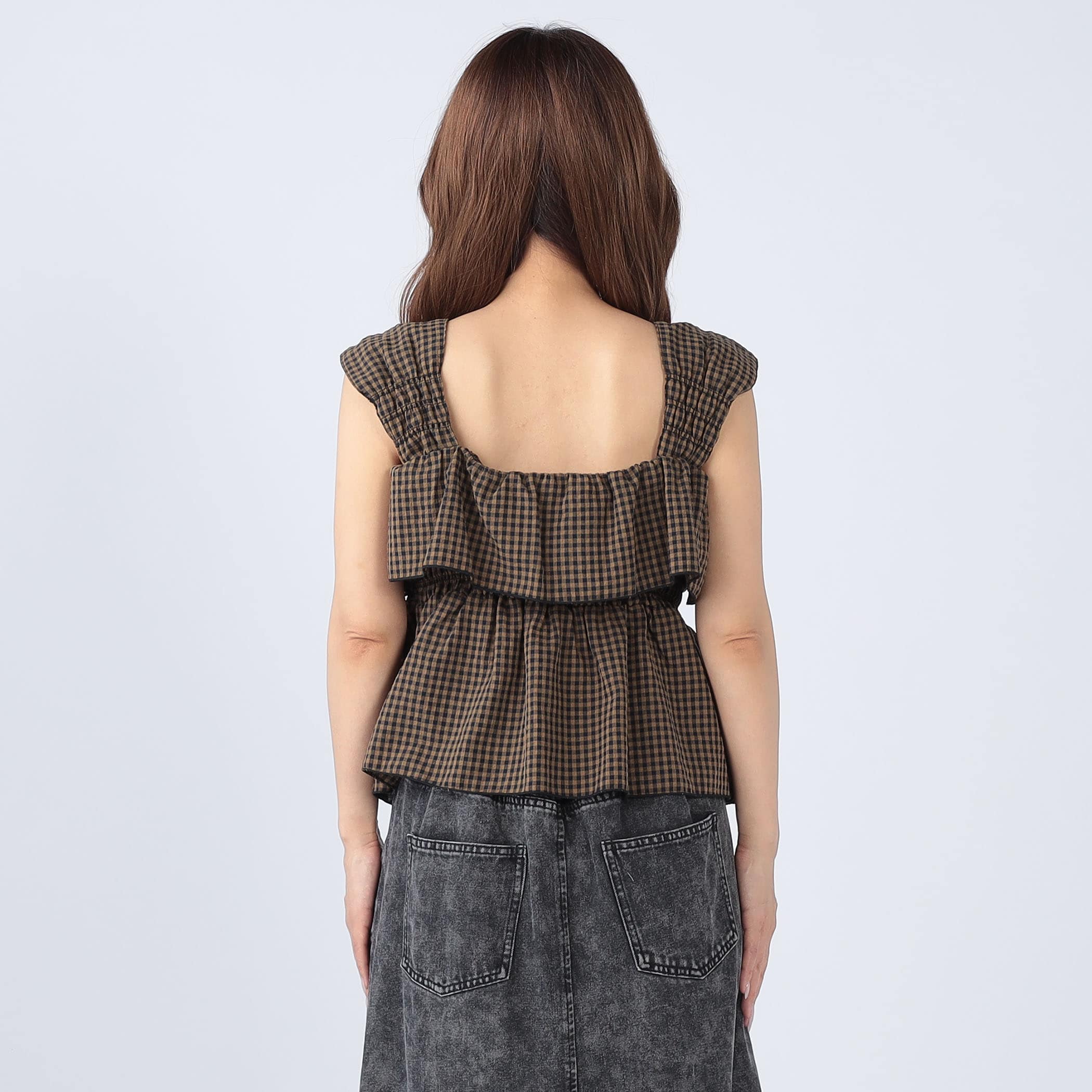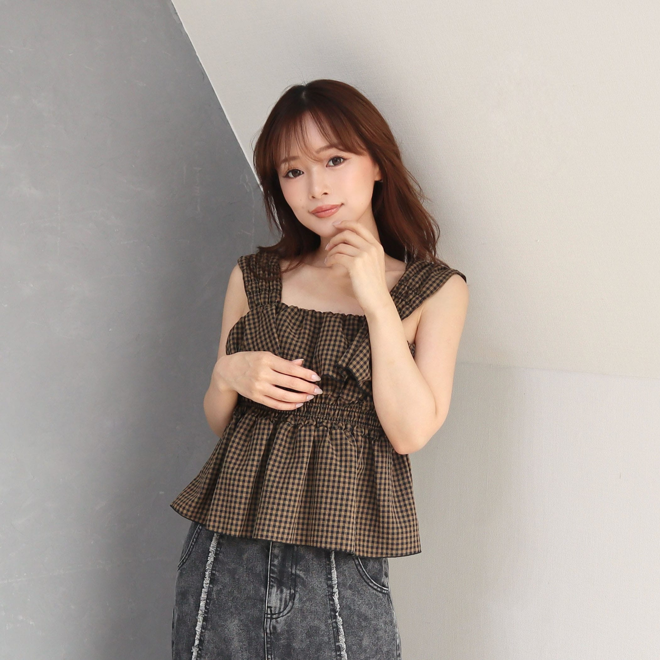 胸元のフリルとシャーリングがメリハリのある美シルエットを演出。キャミ×ビスチェ風デザインでトレンド感たっぷり♪デニムにもスカートにも映える一枚です。