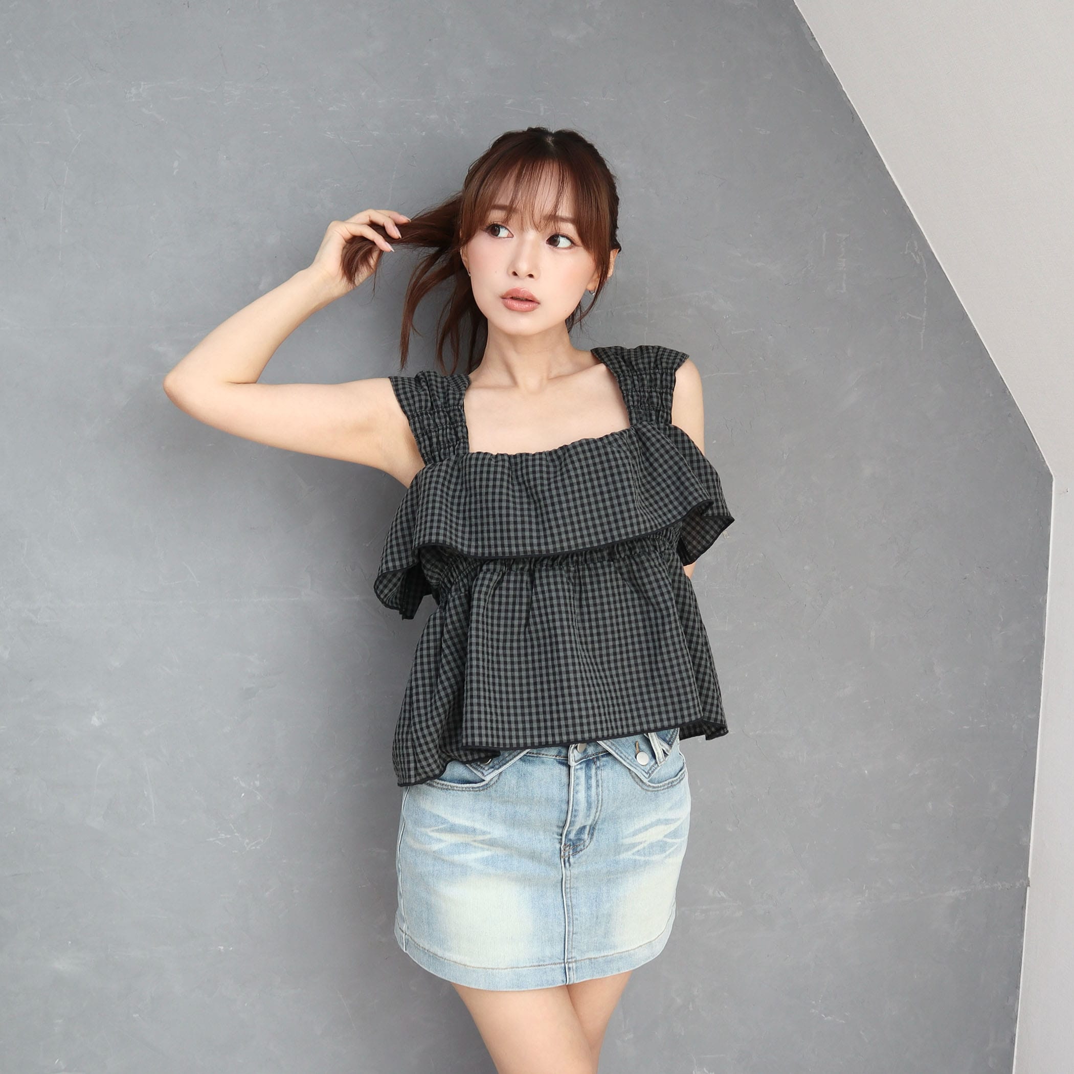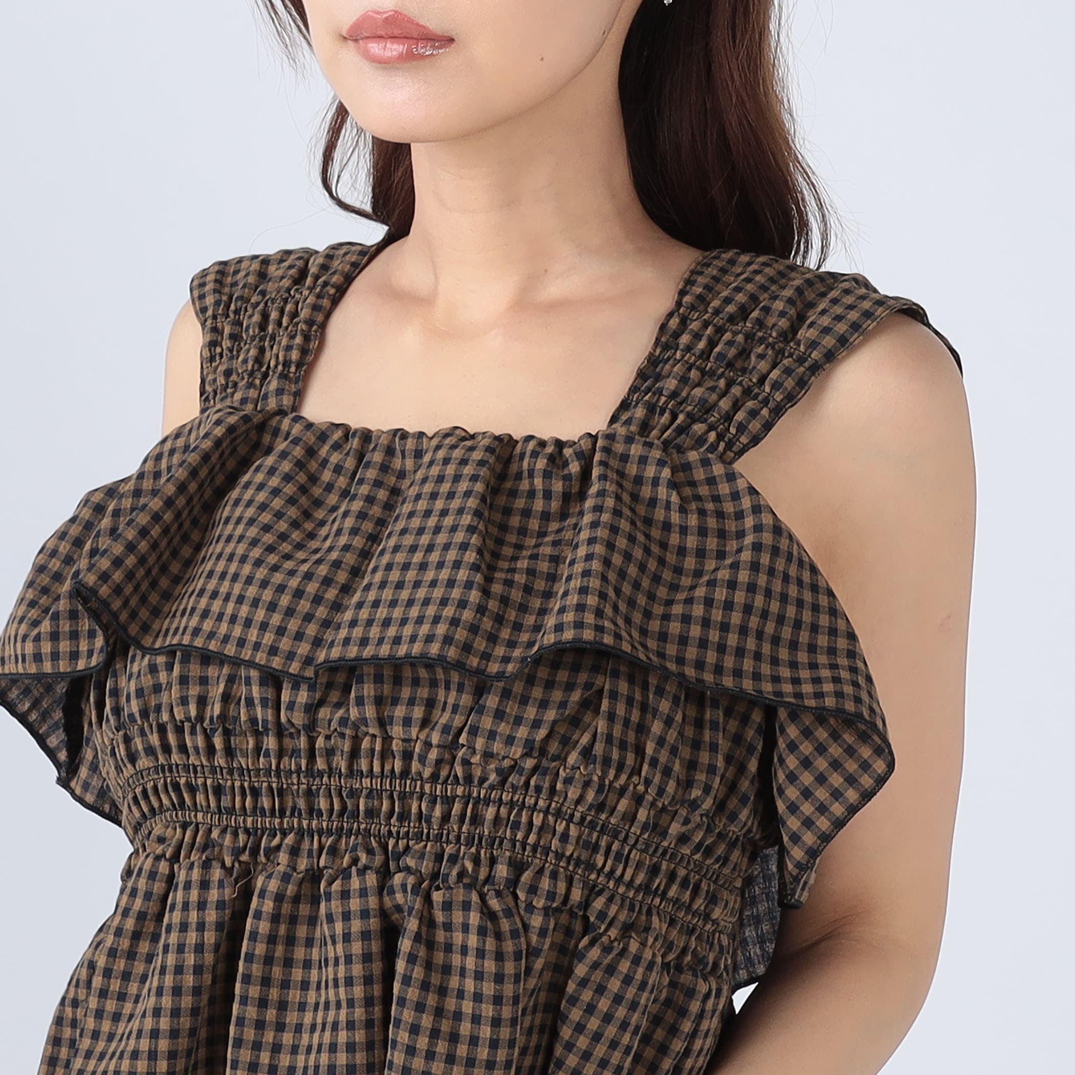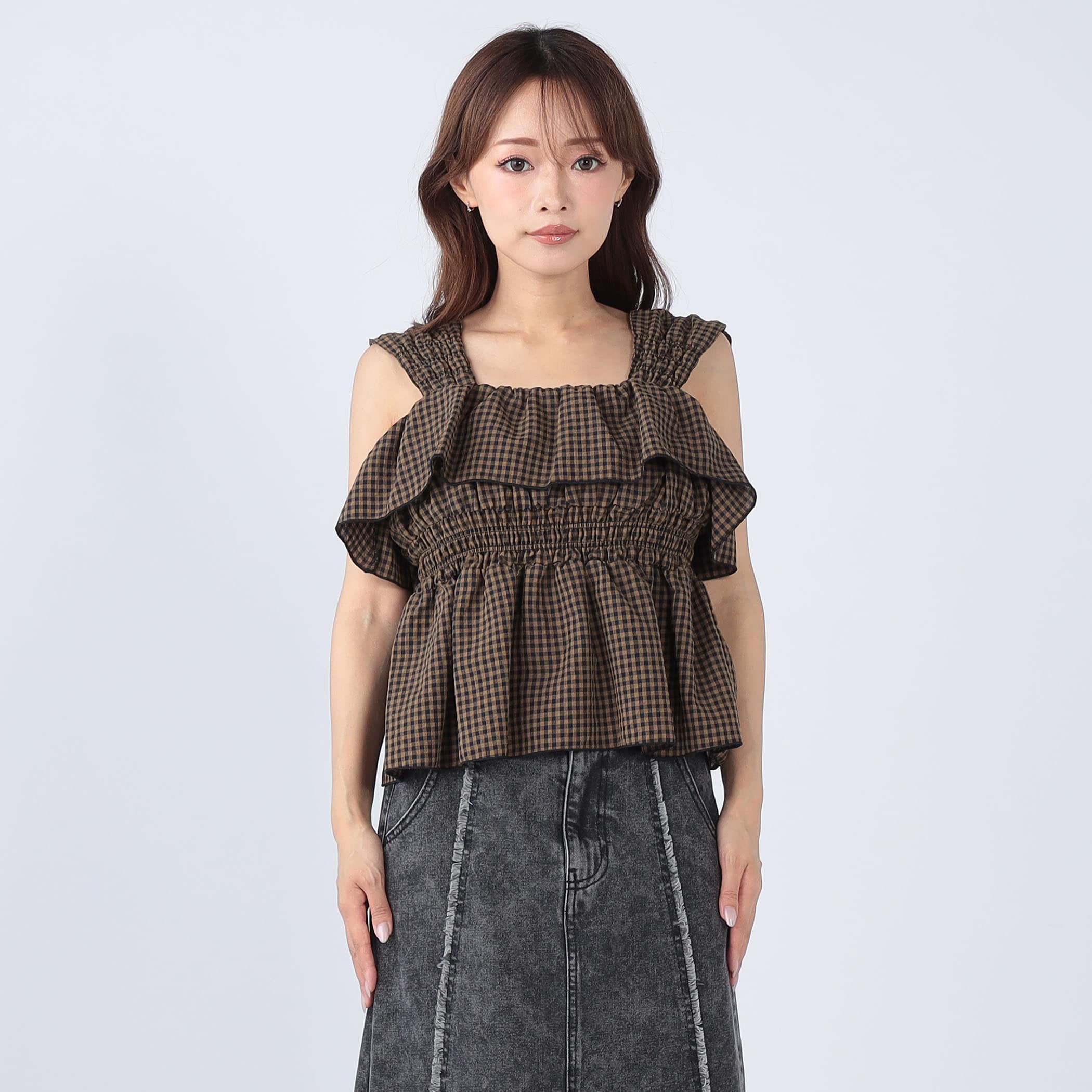 胸元のフリルとシャーリングがメリハリのある美シルエットを演出。キャミ×ビスチェ風デザインでトレンド感たっぷり♪デニムにもスカートにも映える一枚です。