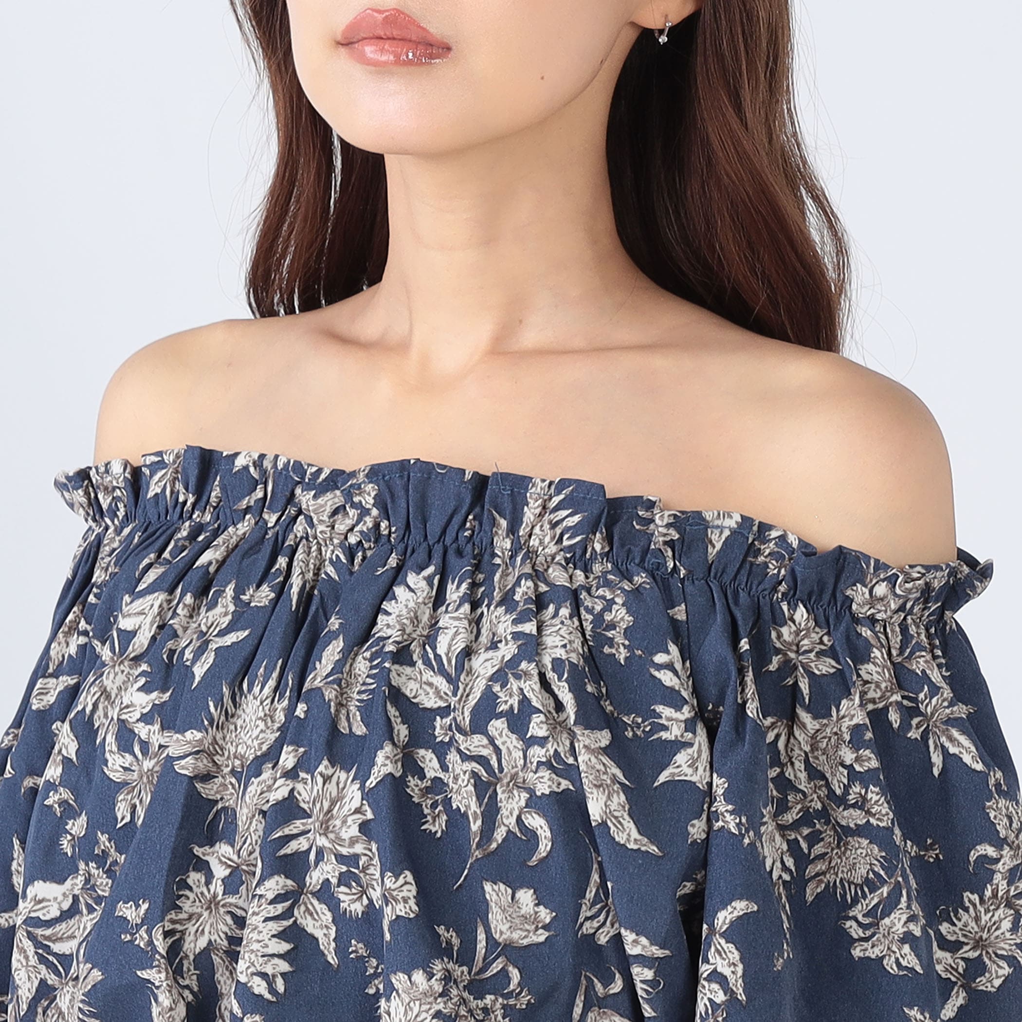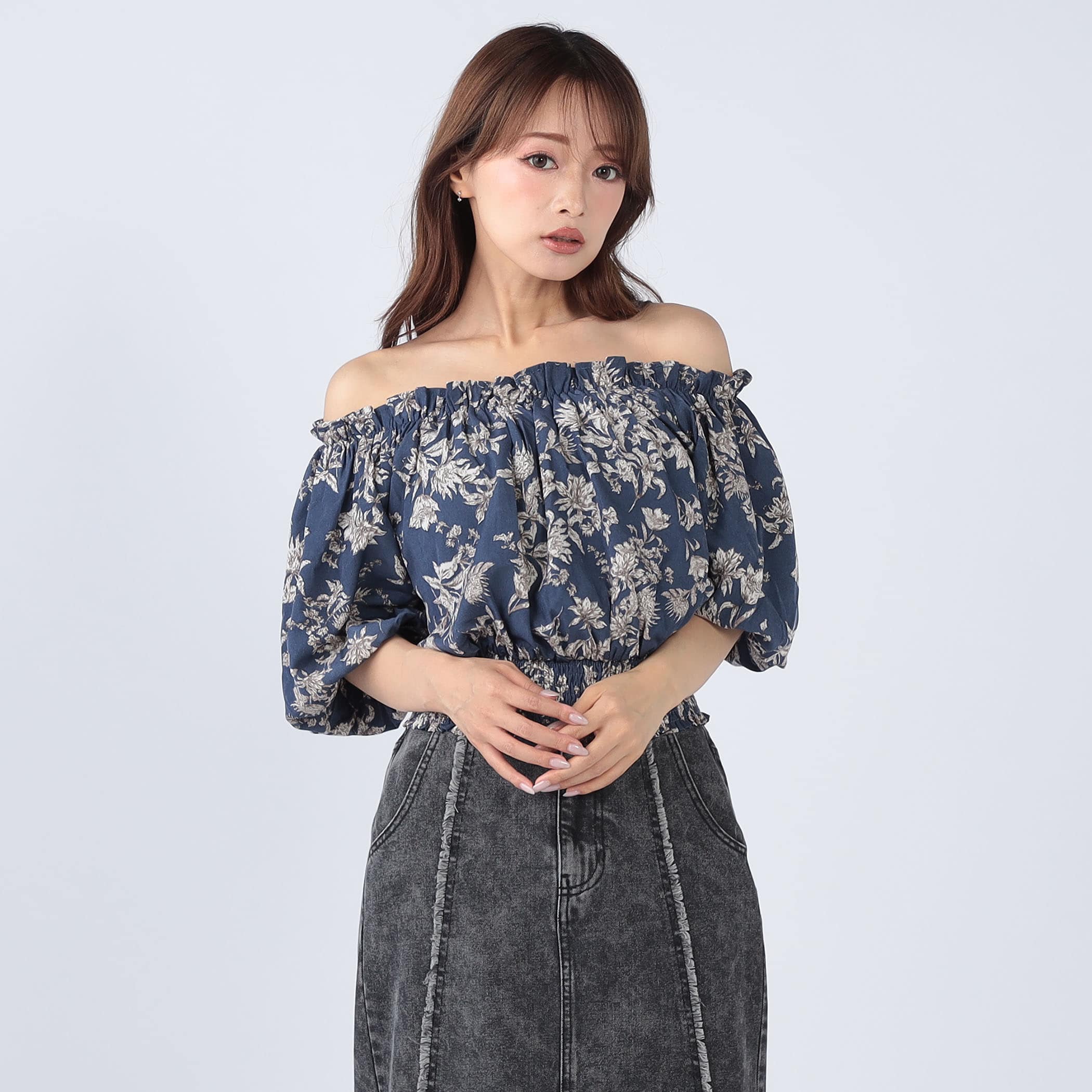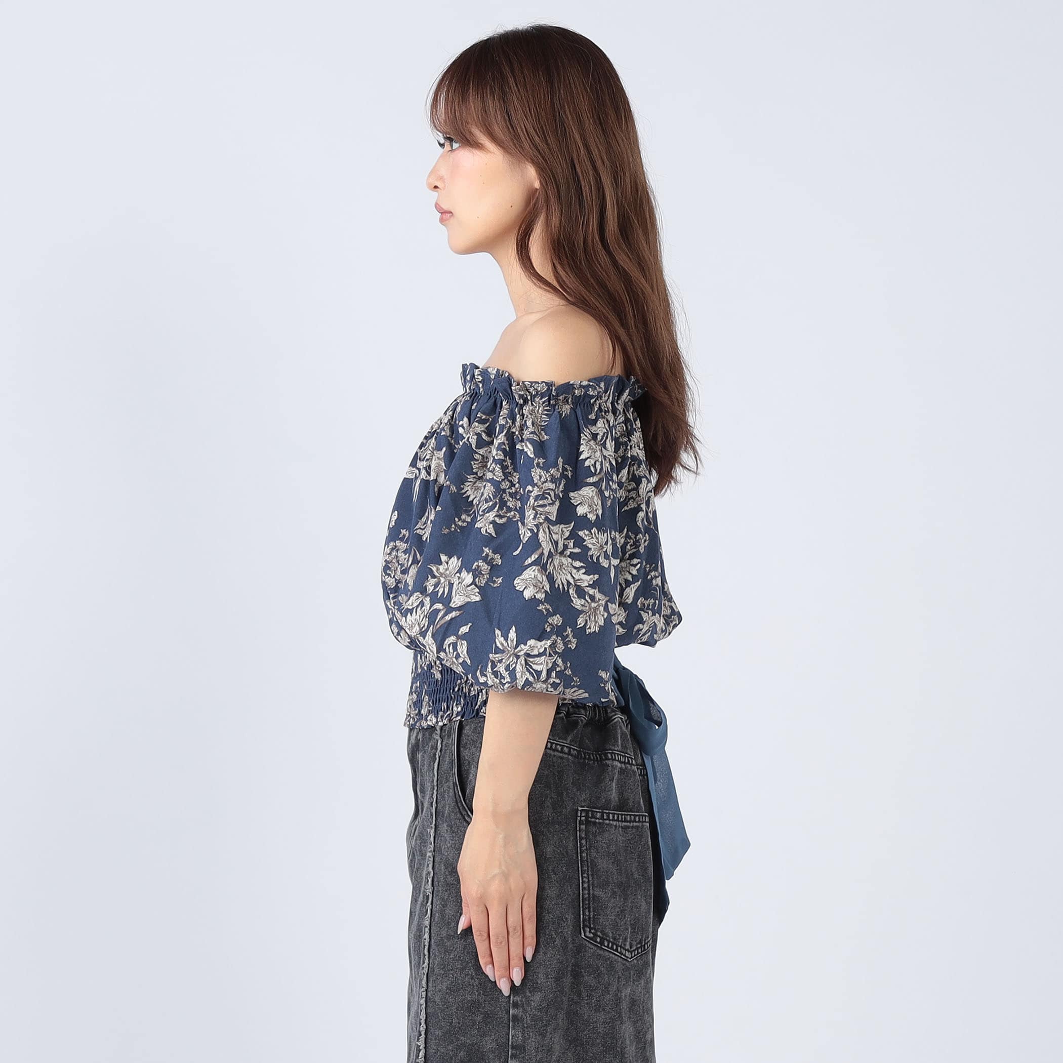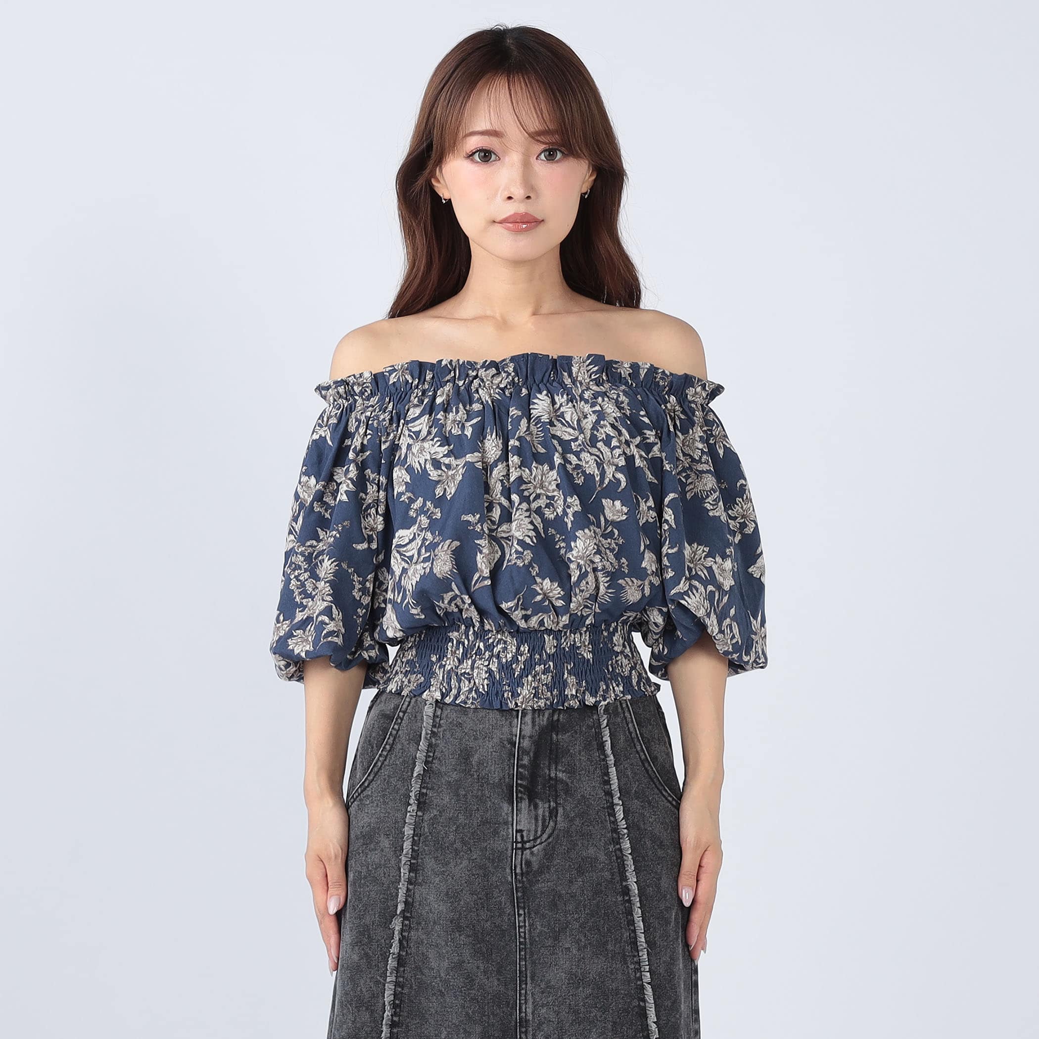 ボタニカル柄がクラシカルで涼しげな印象を与えてくれるオフショルトップス。淡色デニムと合わせれば、爽やかなガーリースタイルが完成します。