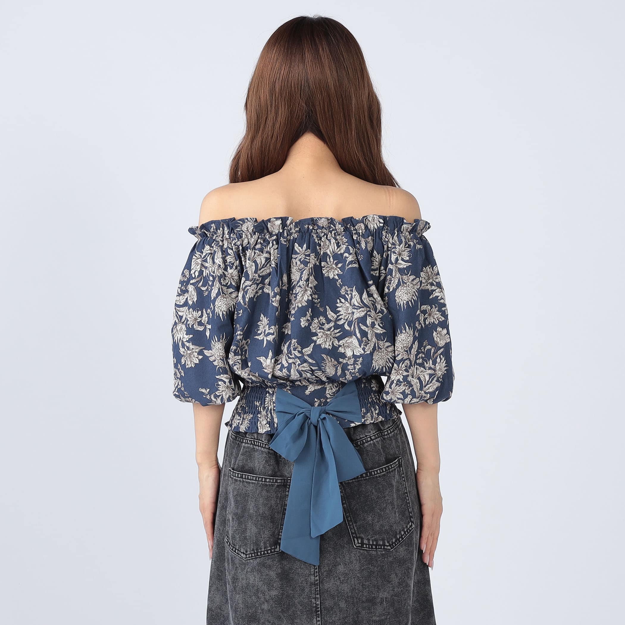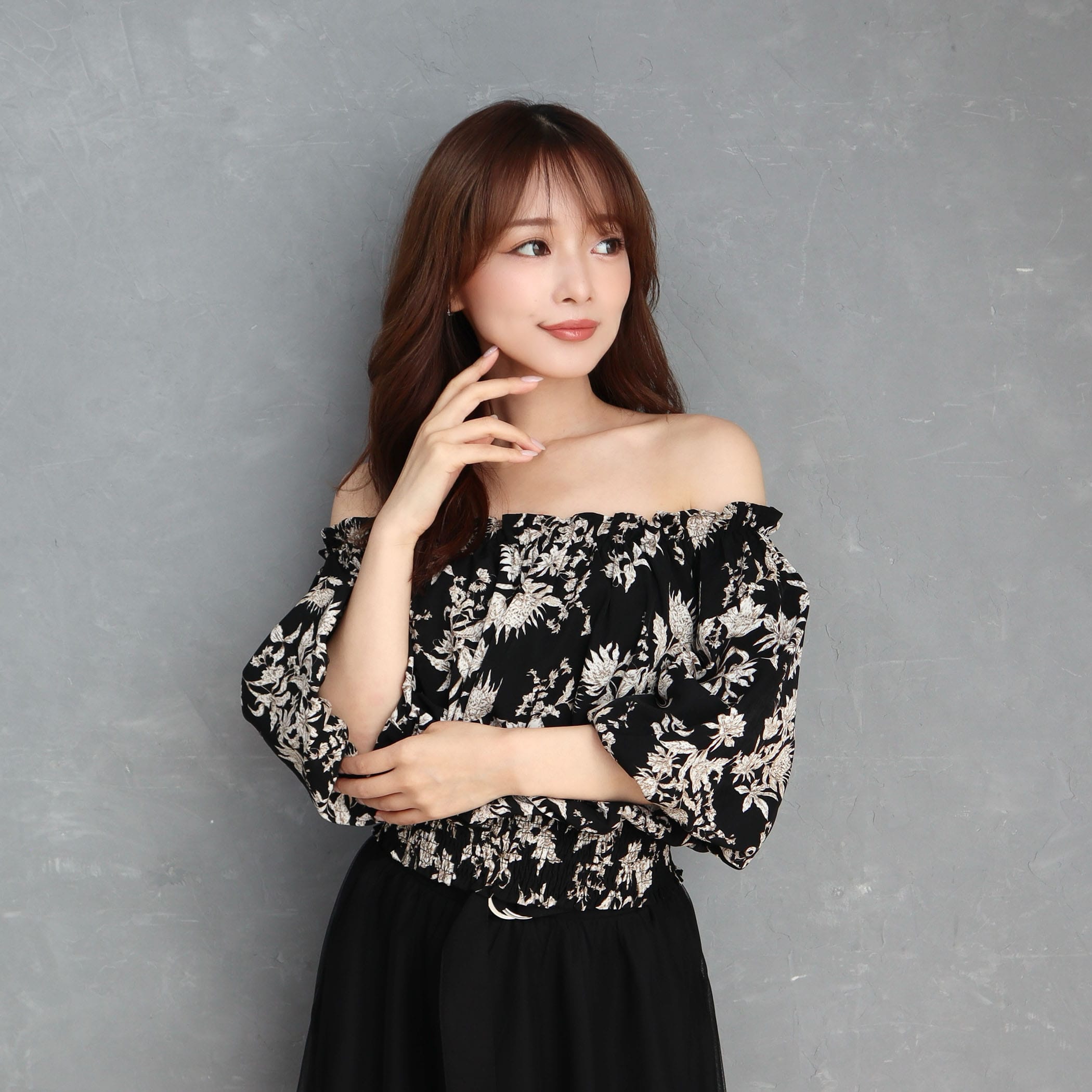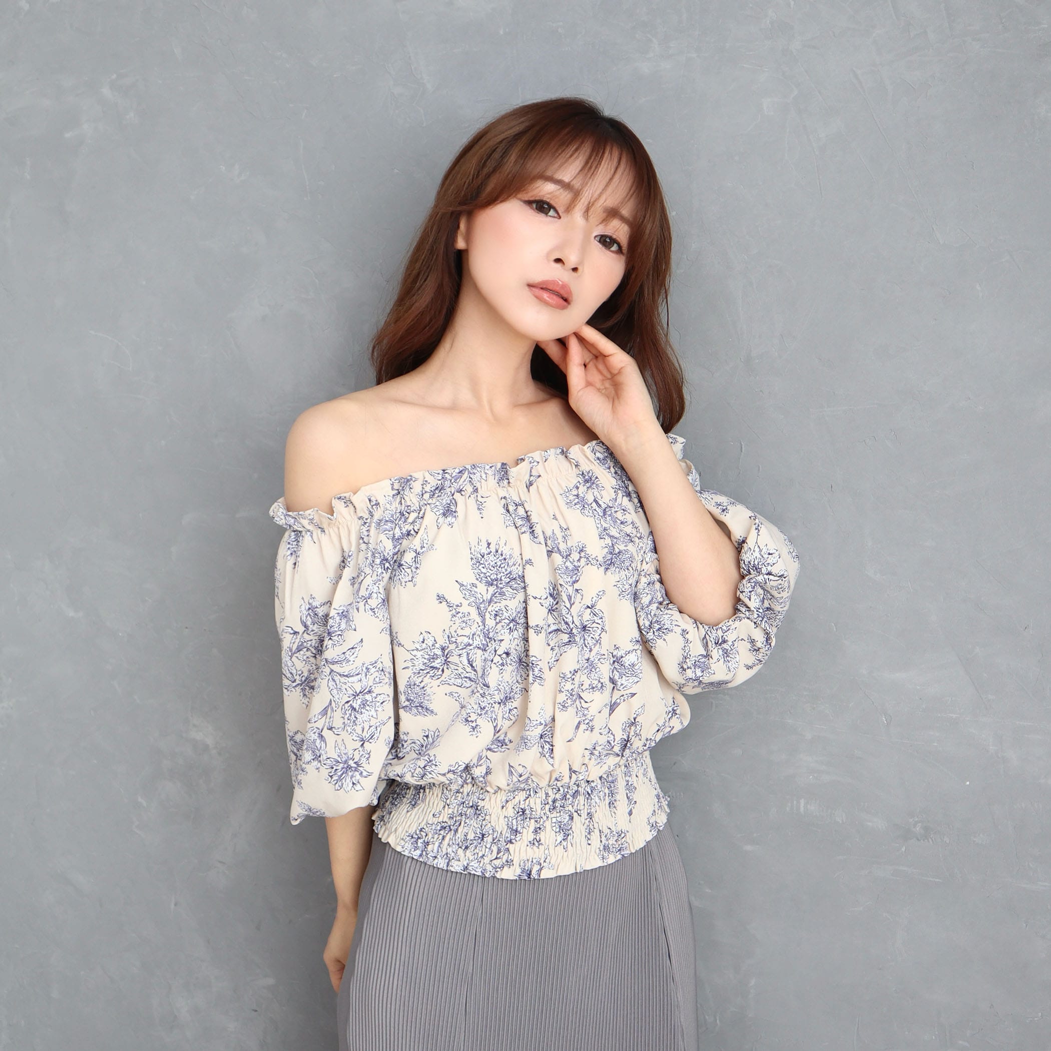 ボタニカル柄がクラシカルで涼しげな印象を与えてくれるオフショルトップス。淡色デニムと合わせれば、爽やかなガーリースタイルが完成します。