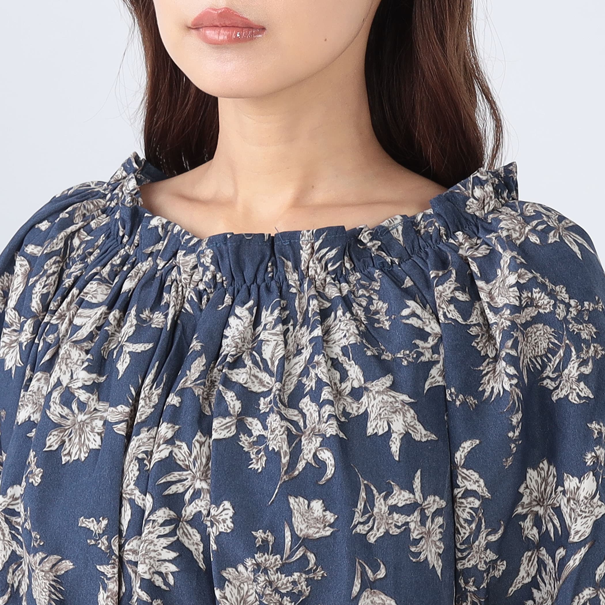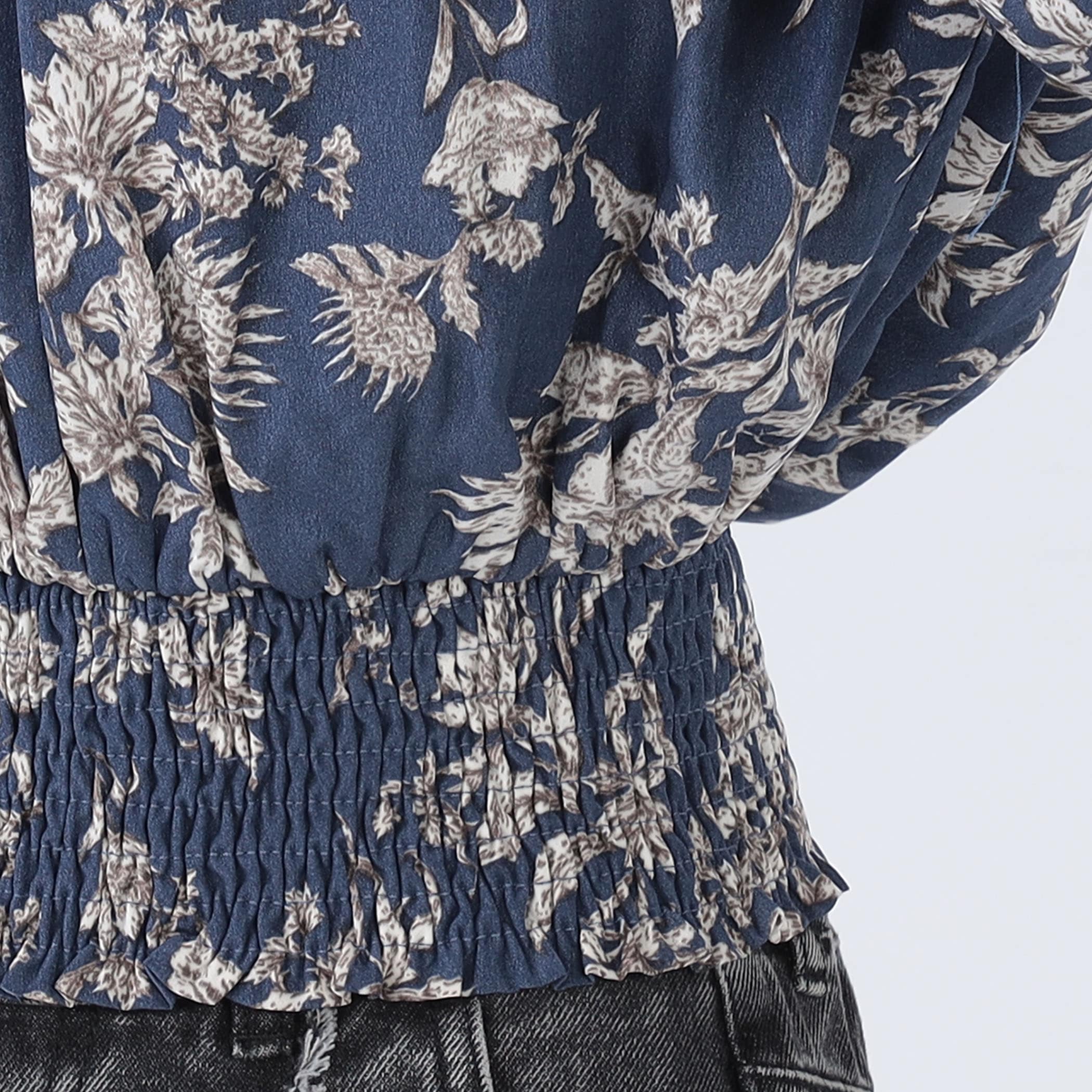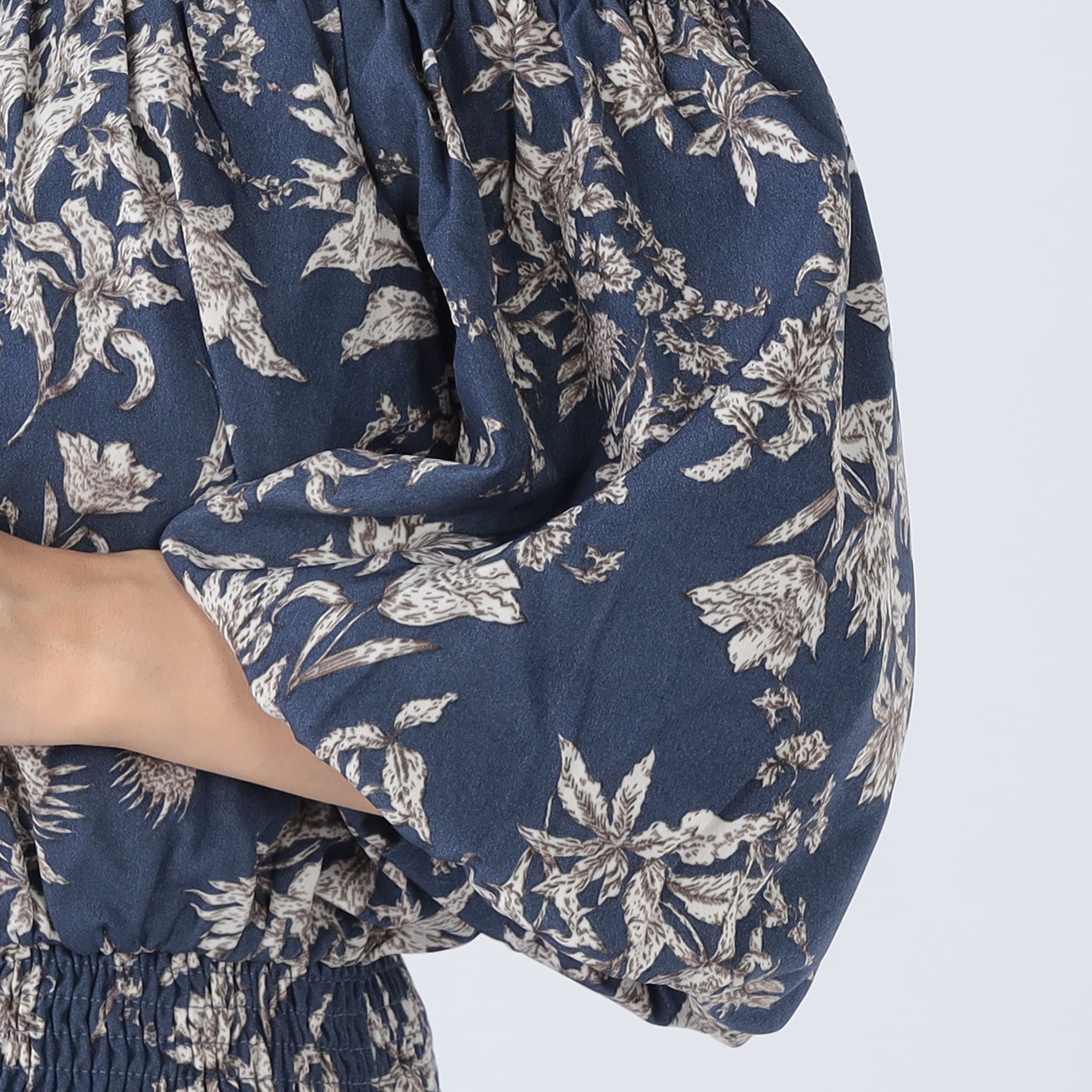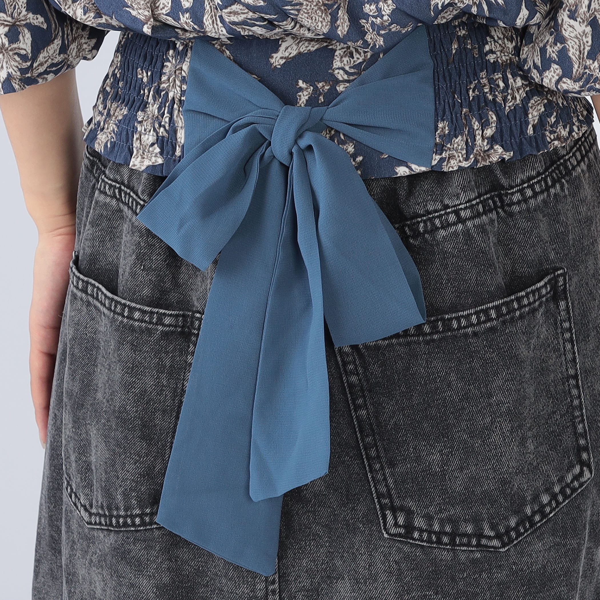 ボタニカル柄がクラシカルで涼しげな印象を与えてくれるオフショルトップス。淡色デニムと合わせれば、爽やかなガーリースタイルが完成します。