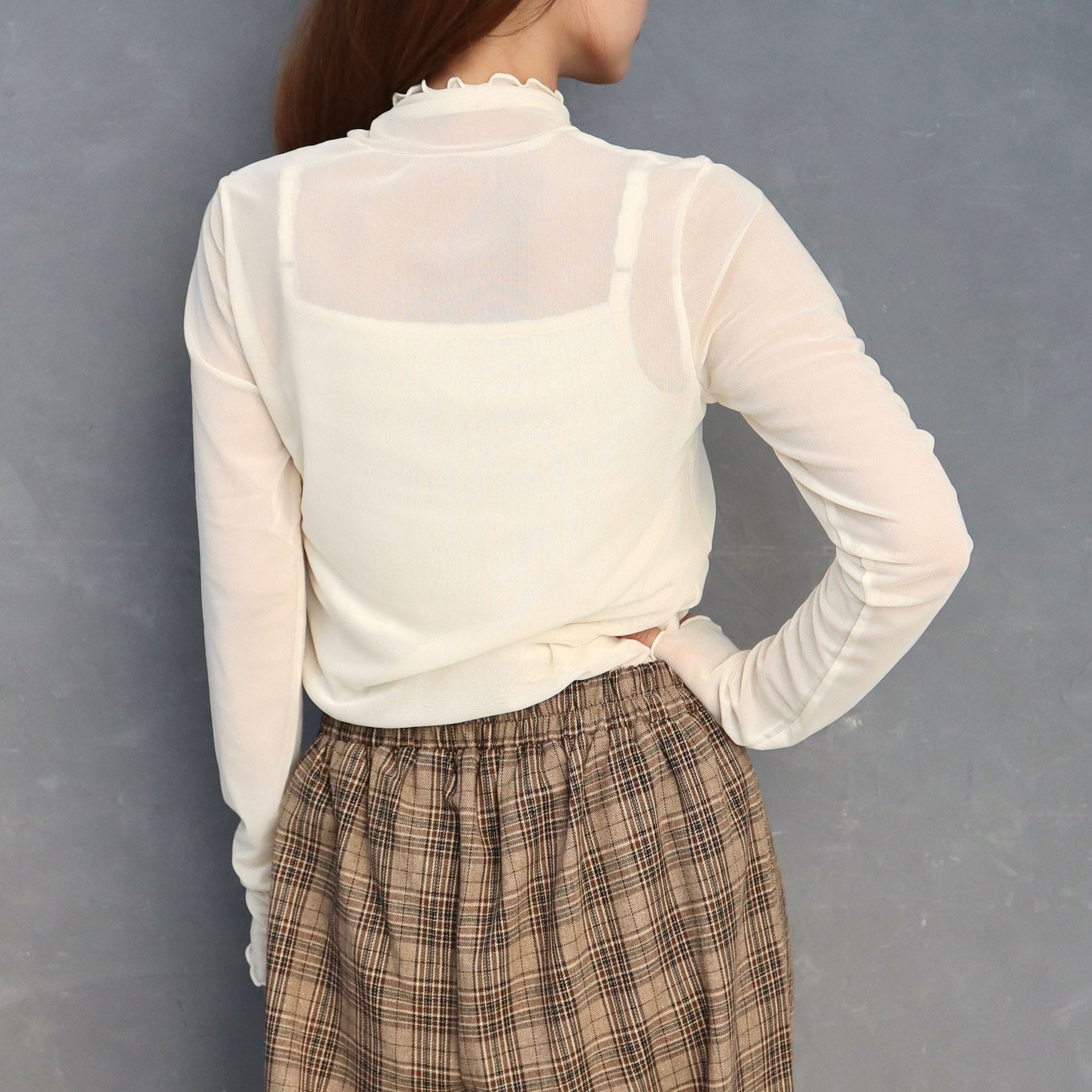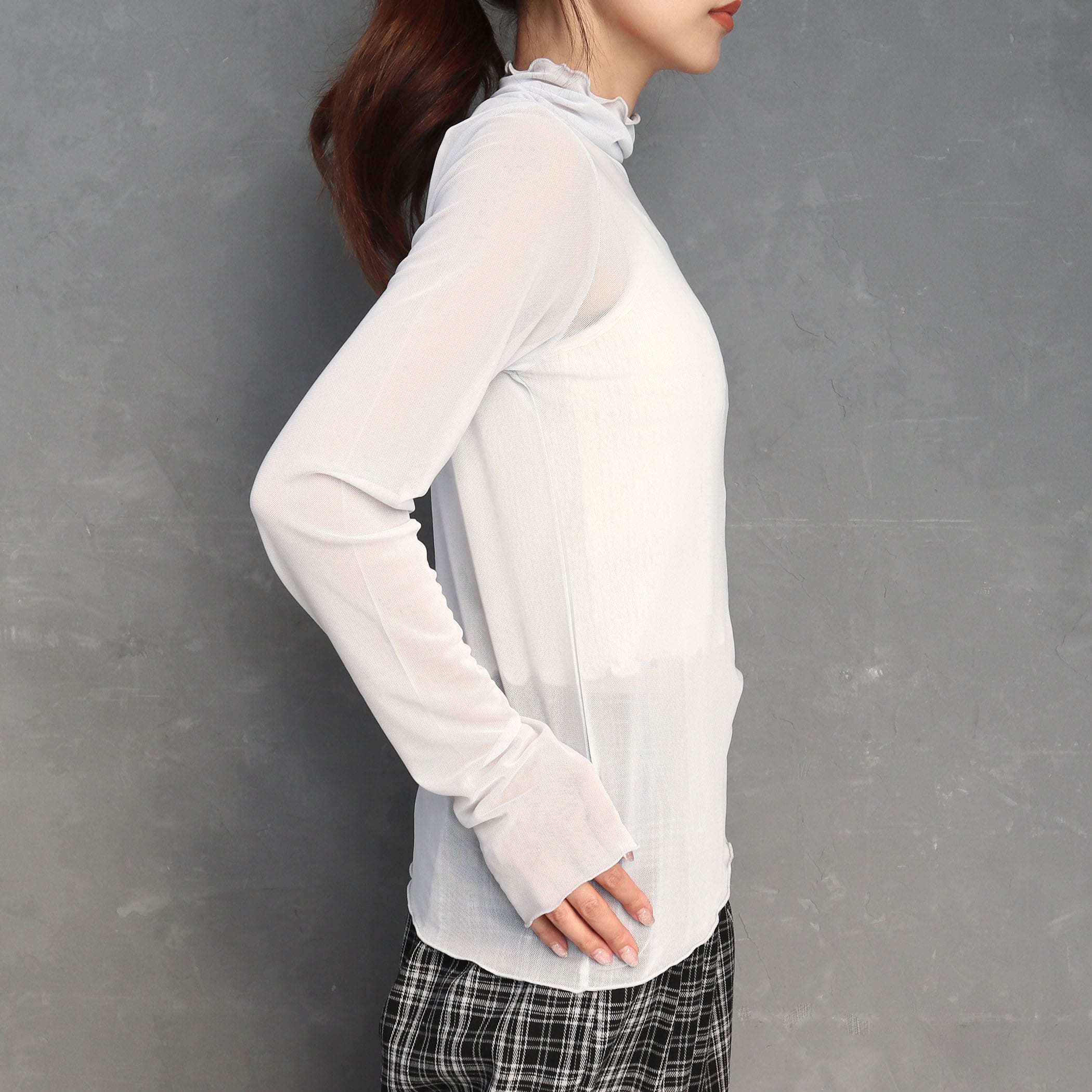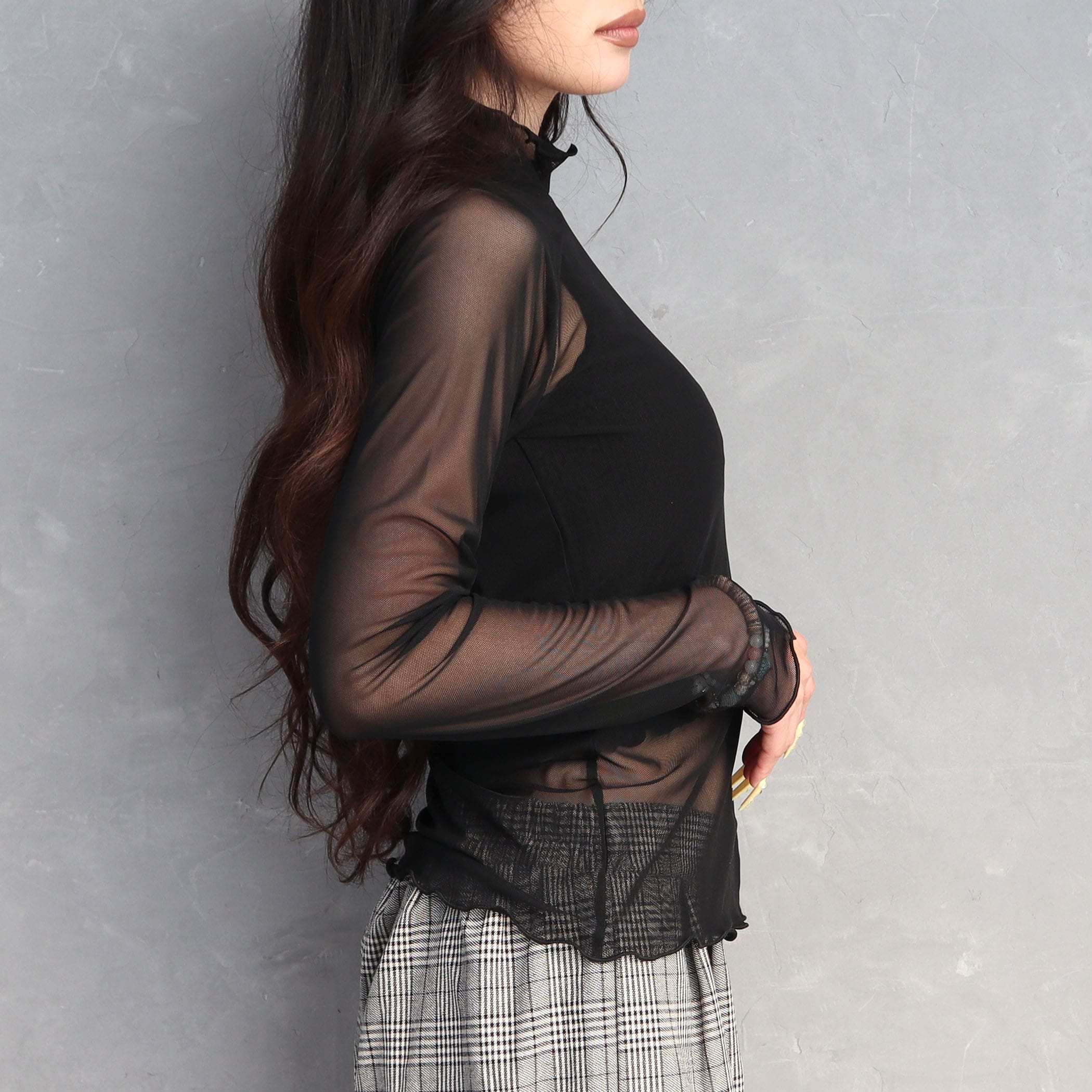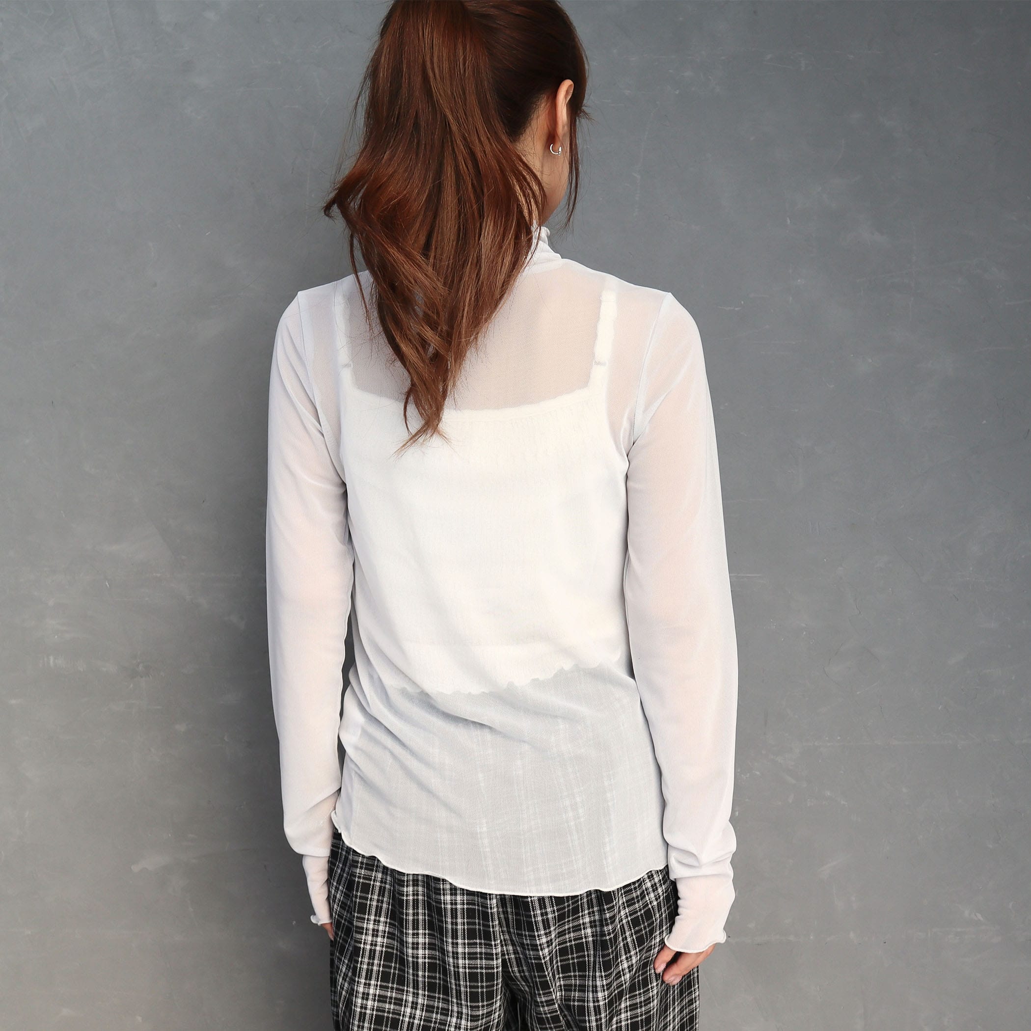 シンプルなタートルネックカットソーに、裾や袖口のメローディテールを効かせた大人可愛い一枚。ストレッチ性のあるパワーネット素材で軽やかな着心地ながら、レイヤードするだけでこなれ感をプラス。スカートにもパンツにも合わせやすく、デイリー使いからオフィスカジュアルまで幅広く活躍します。