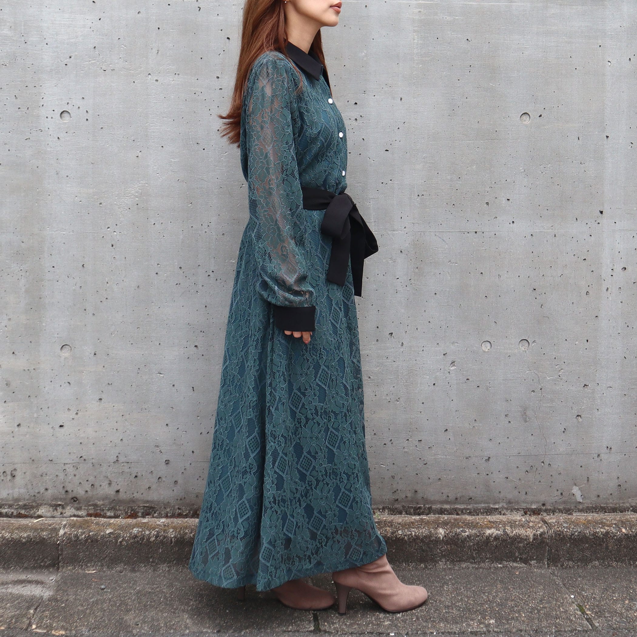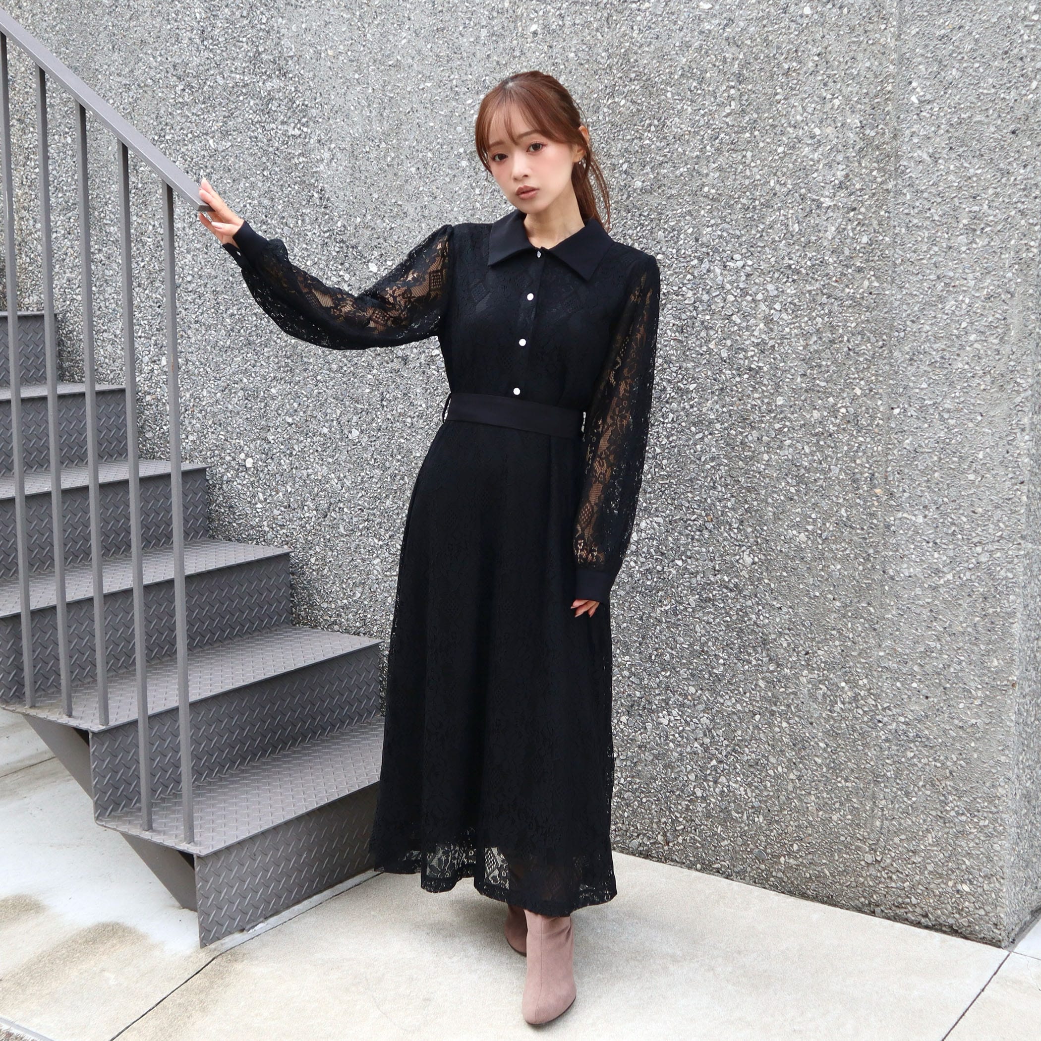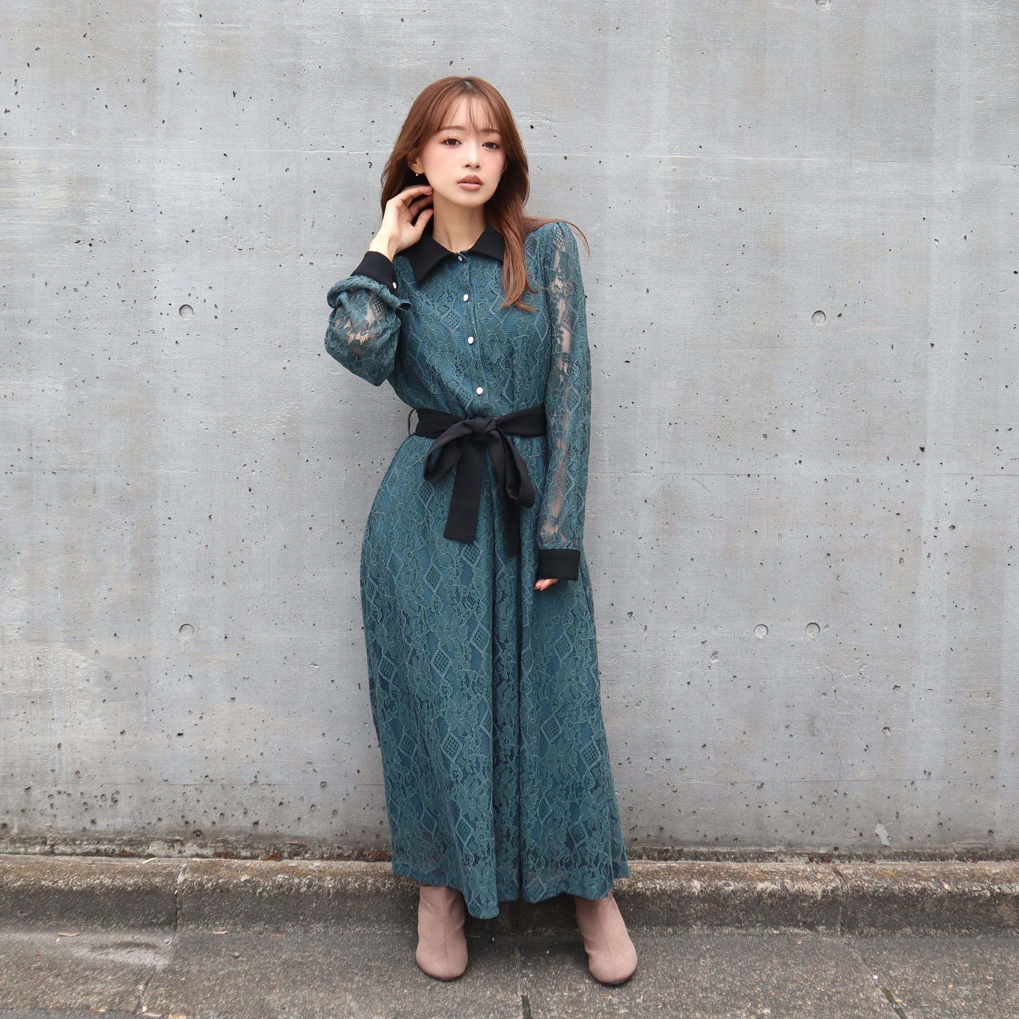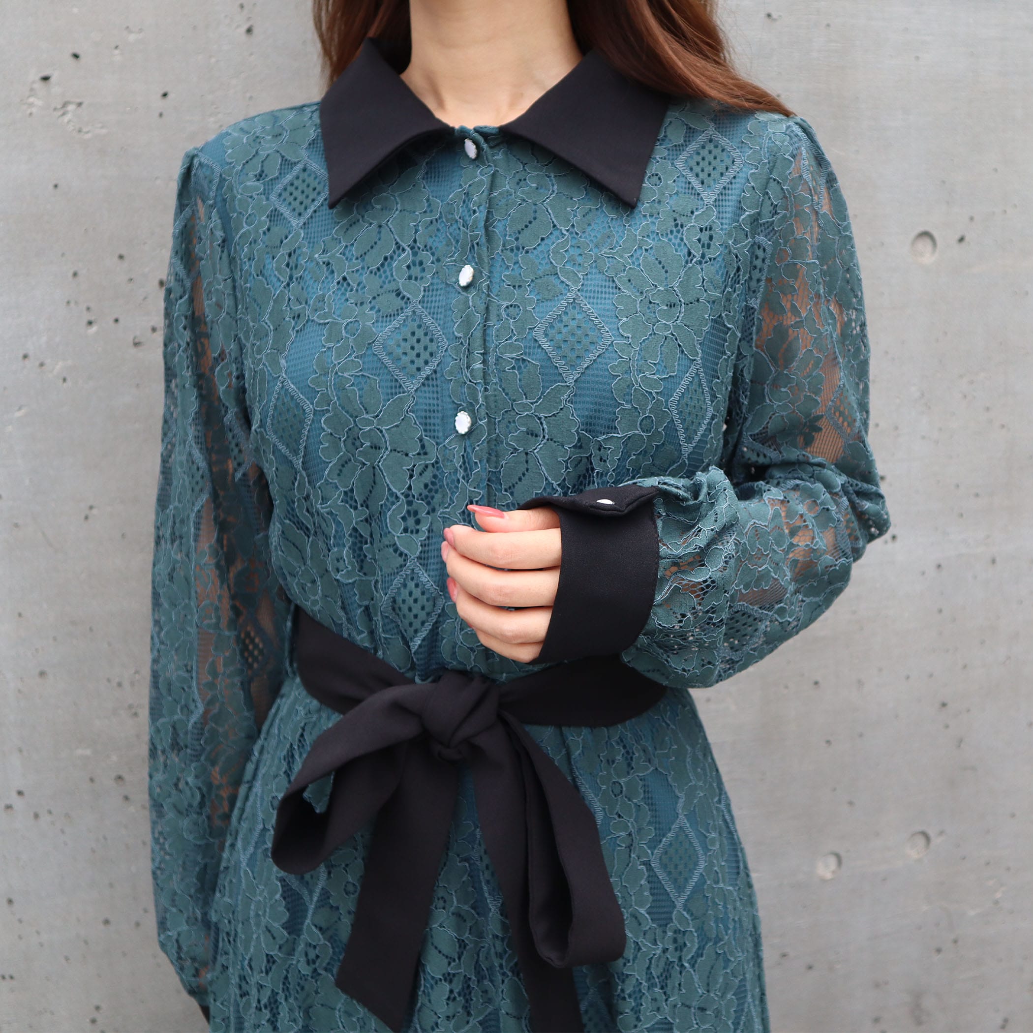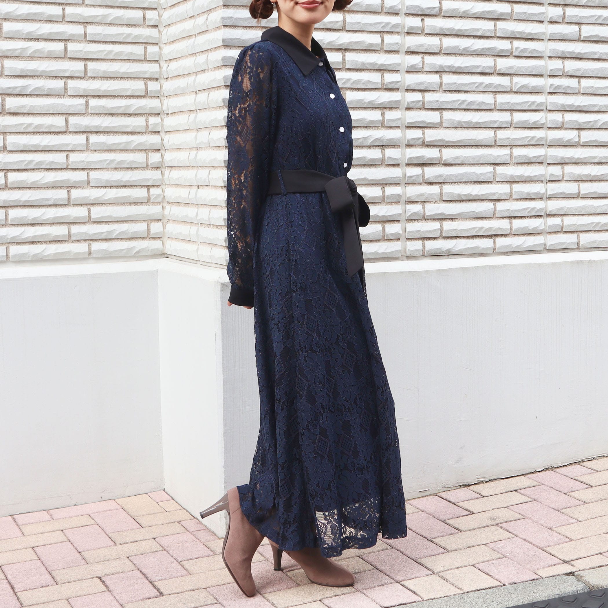 大人な雰囲気のレースワンピース。合わせるアウターや足元のコーデによって大人っぽいスタイリングからガーリー韓国ファッションスタイルまで楽しめます。リボンベルトでウエストをマークすればスタイルUP効果も◎オフィスカジュアルやちょっとした特別な日にもオススメの1着です。上品な総レース使いでオケージョンシーンにもピッタリ。キラキラなパール釦がぐっと上品さもプラスしてくれます。■共生地ベルト付■後ろウエストゴム仕様■裏地付