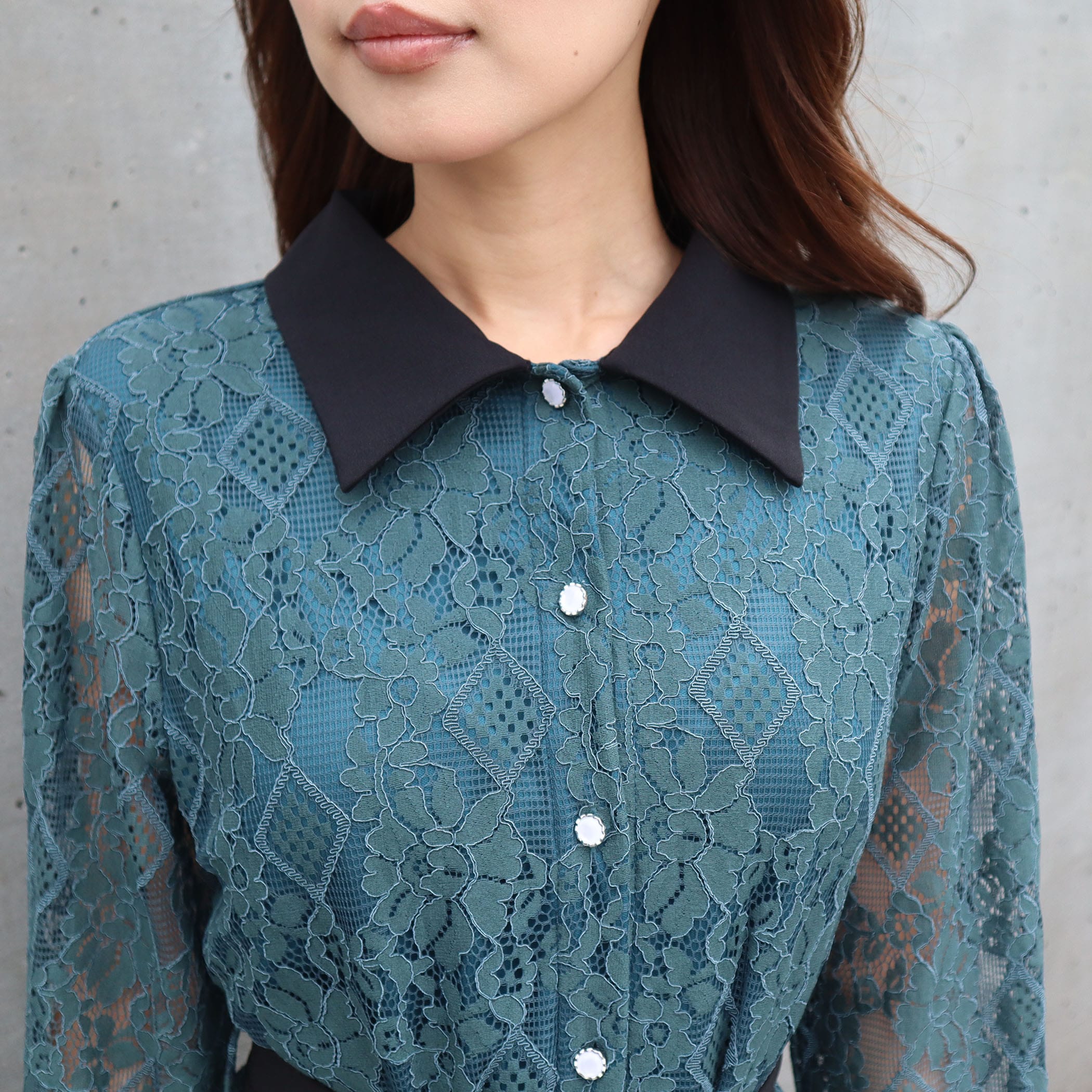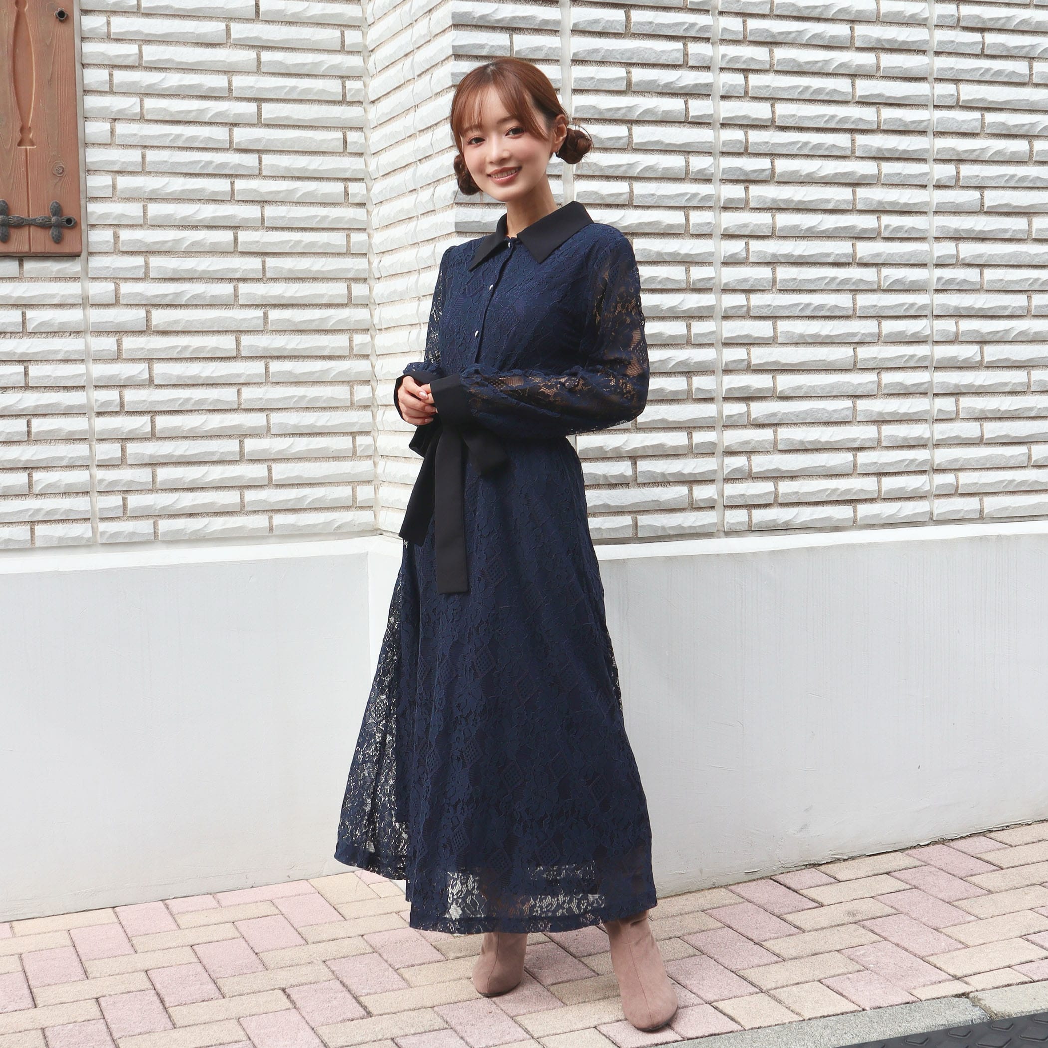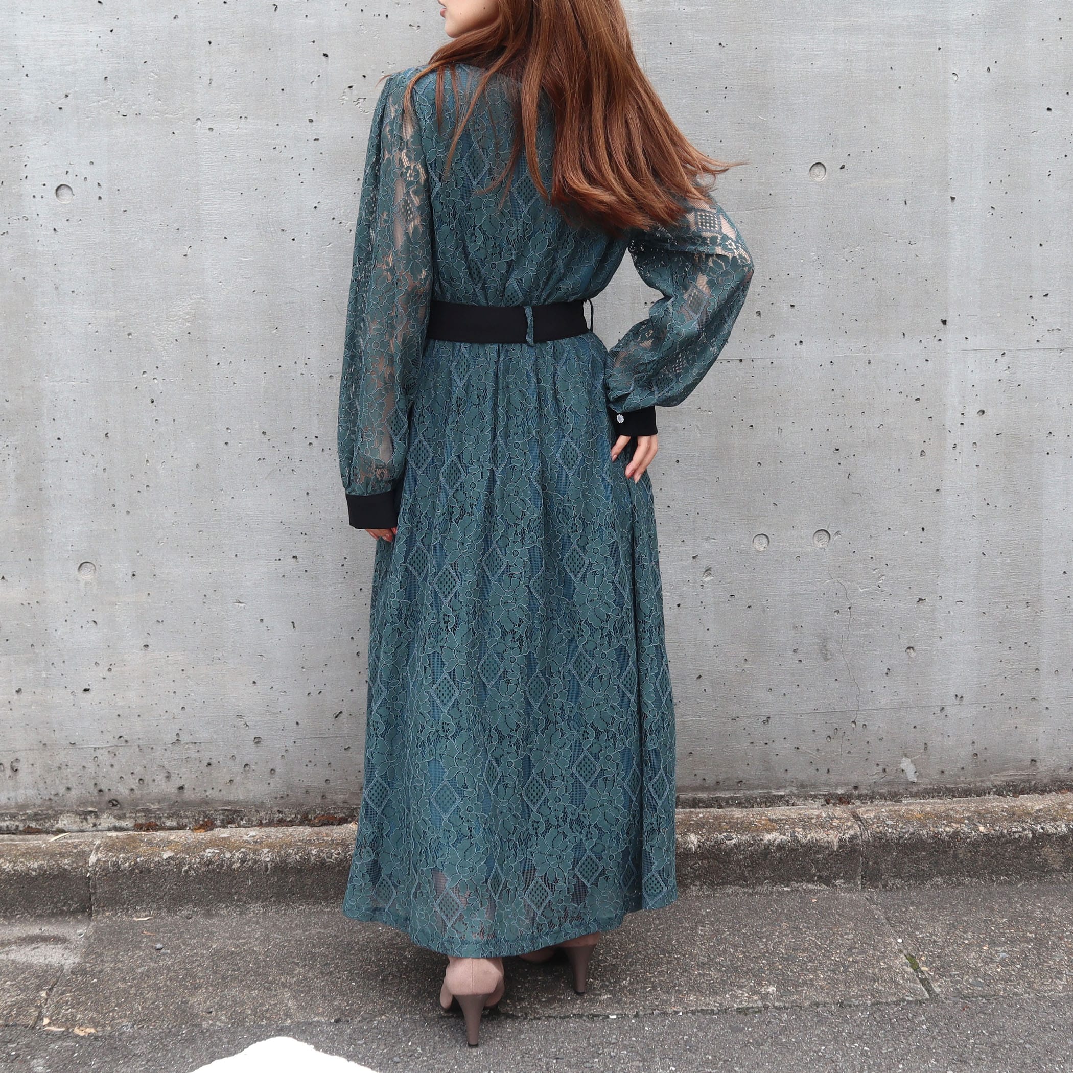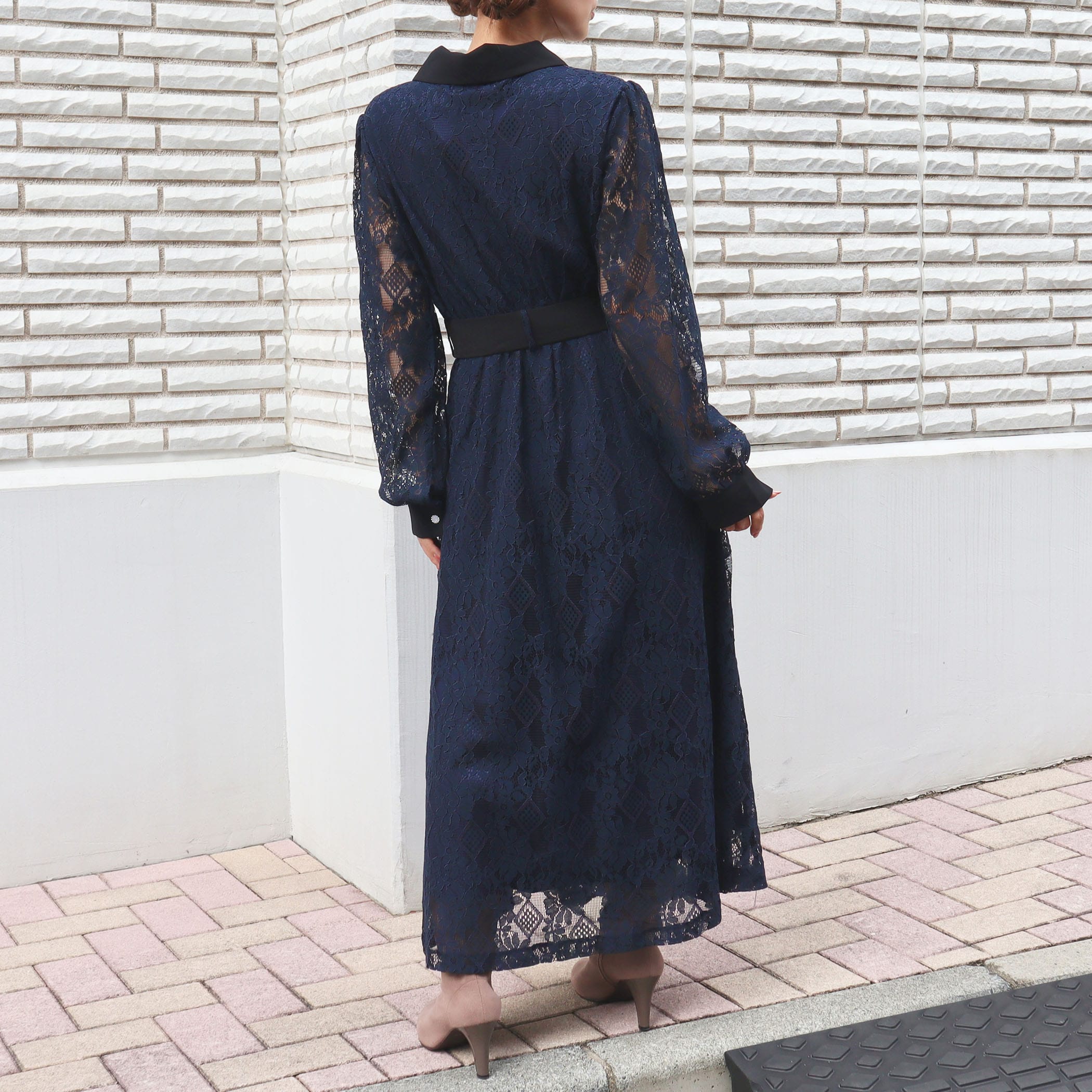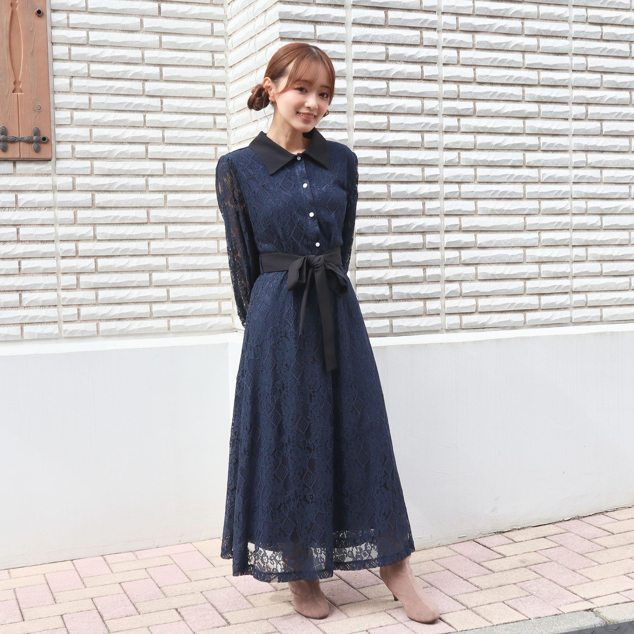 大人な雰囲気のレースワンピース。合わせるアウターや足元のコーデによって大人っぽいスタイリングからガーリー韓国ファッションスタイルまで楽しめます。リボンベルトでウエストをマークすればスタイルUP効果も◎オフィスカジュアルやちょっとした特別な日にもオススメの1着です。上品な総レース使いでオケージョンシーンにもピッタリ。キラキラなパール釦がぐっと上品さもプラスしてくれます。■共生地ベルト付■後ろウエストゴム仕様■裏地付
