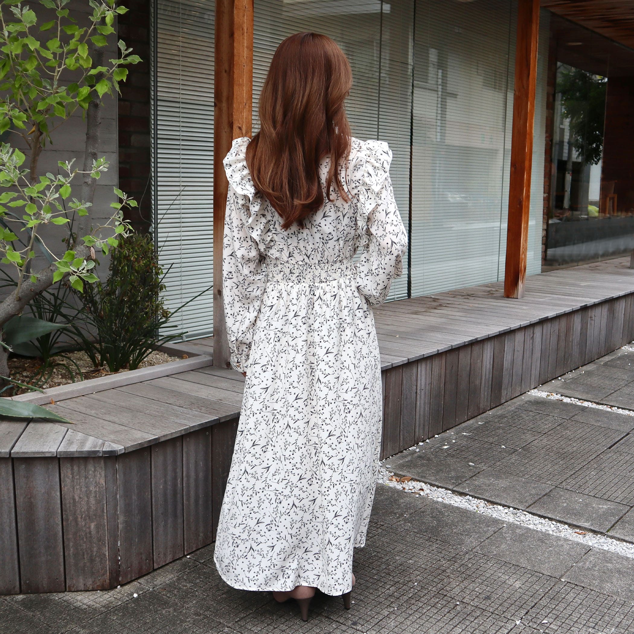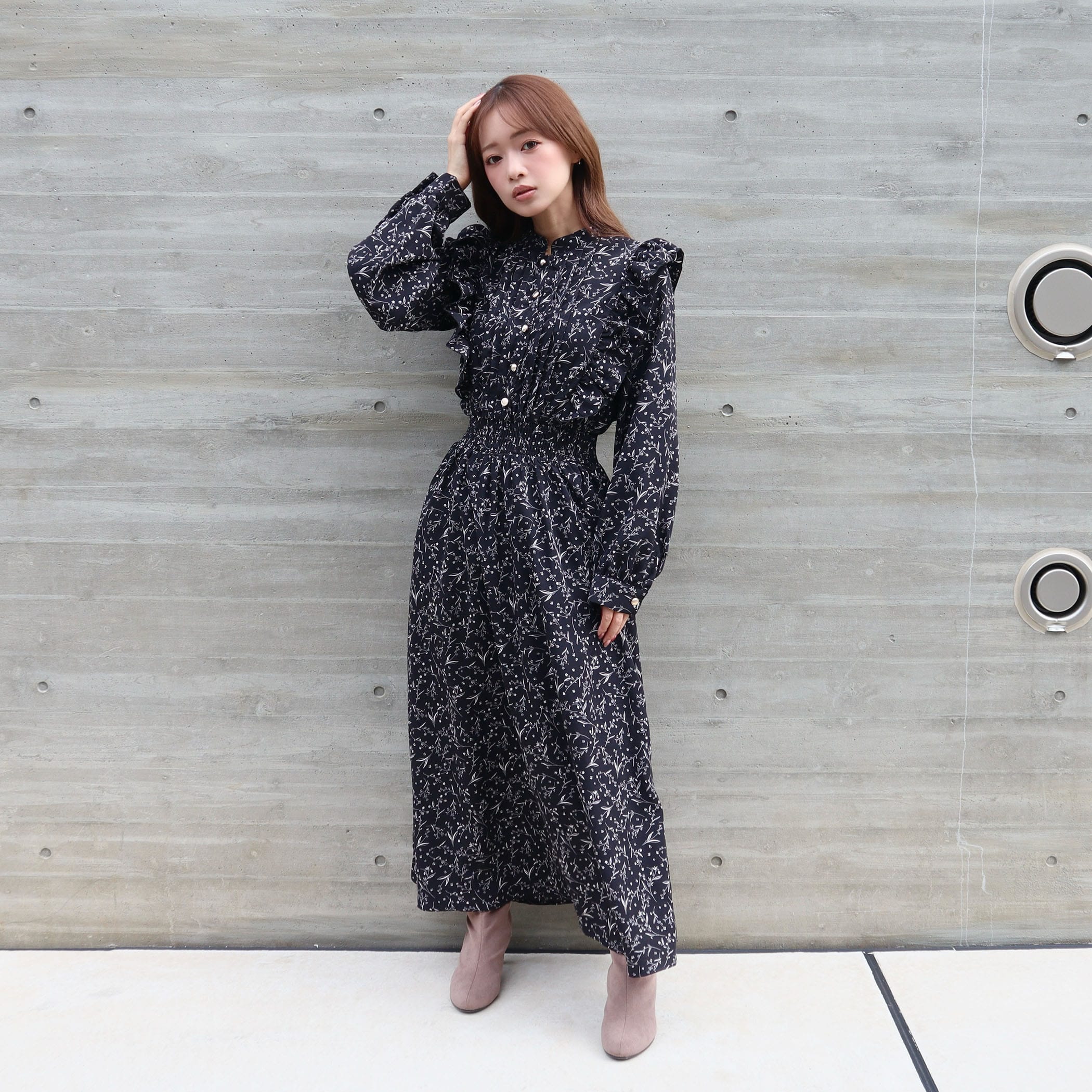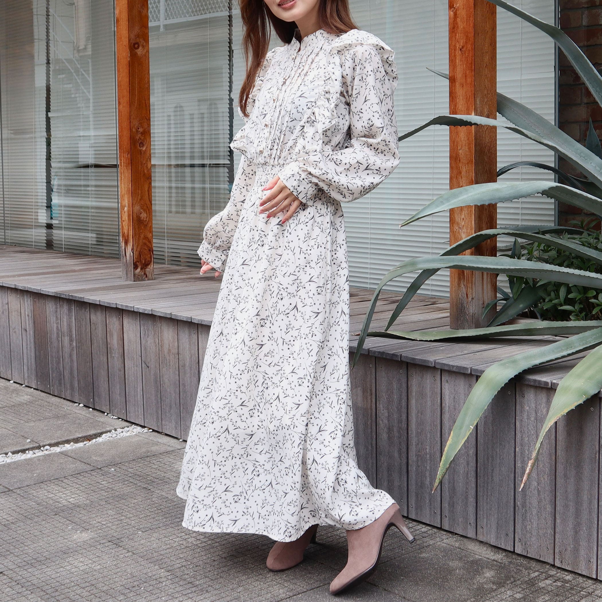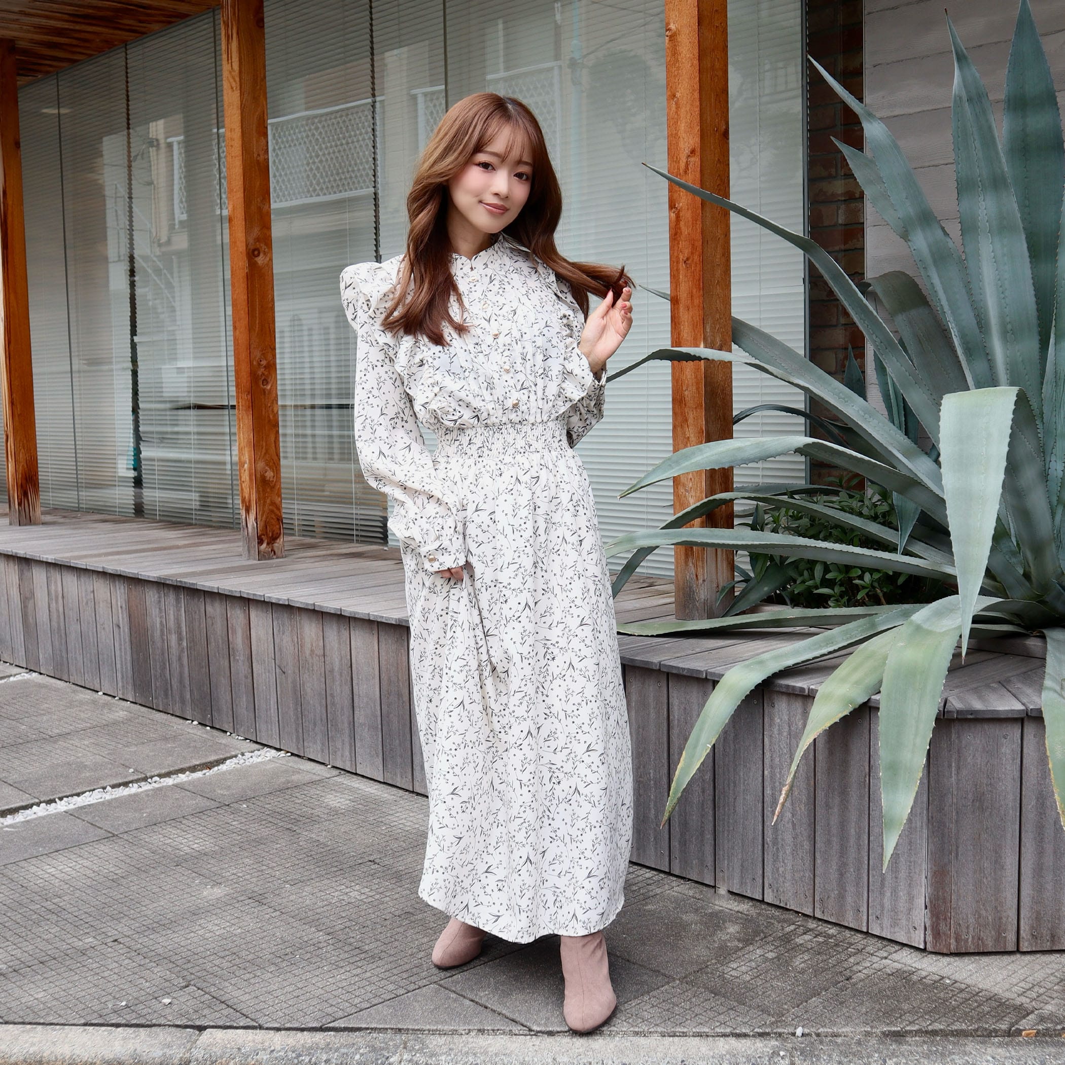 花柄とフリル袖が可愛い長袖ロングワンピース。フリル使いとお花柄で可愛いを詰め込んだ長袖ワンピース。存在感のあるワンピースは着るだけで主役級な着こなしを楽しめ、女子会やちょっとしたお呼ばれにも◎キラキラなゴールドボタンはジャケットやカーデ合わせでチラ見せすれば上品な大人な雰囲気も楽しめます。ボリュームのある靴を合わせれば韓国ファッションな着こなしに。ハイウエストのウエスト位置はスタイルUP見え効果も。長袖のワンピースは秋服・冬服コーデはもちろんのこと春先まで楽しめるので、長く楽しめるアイテムです。
