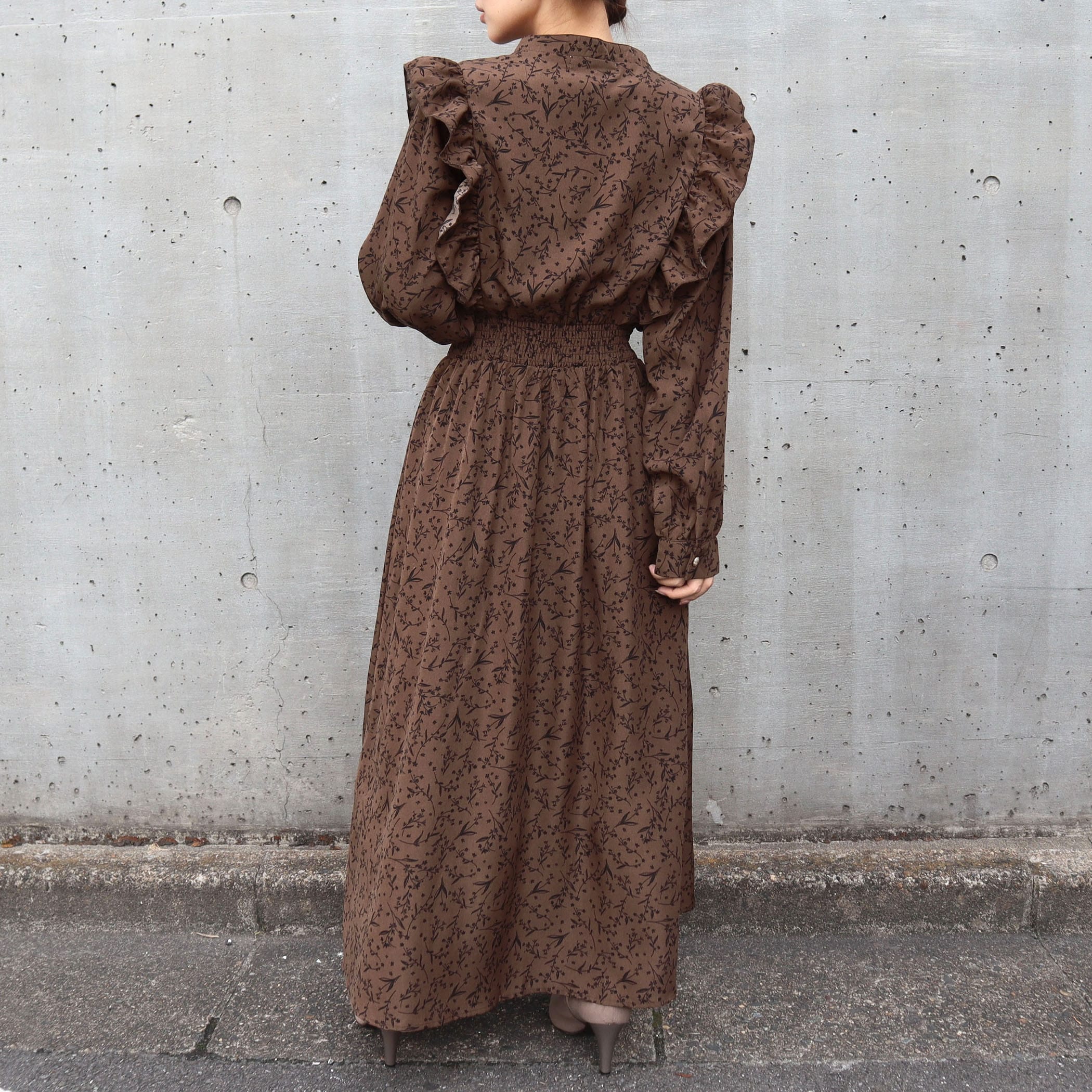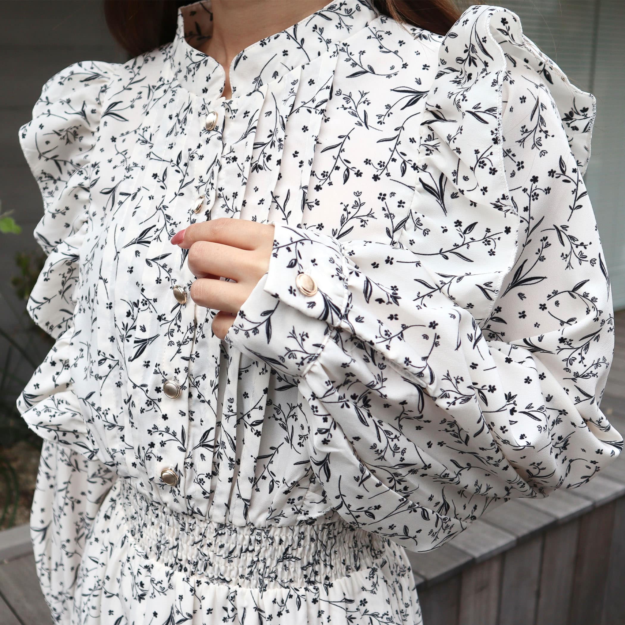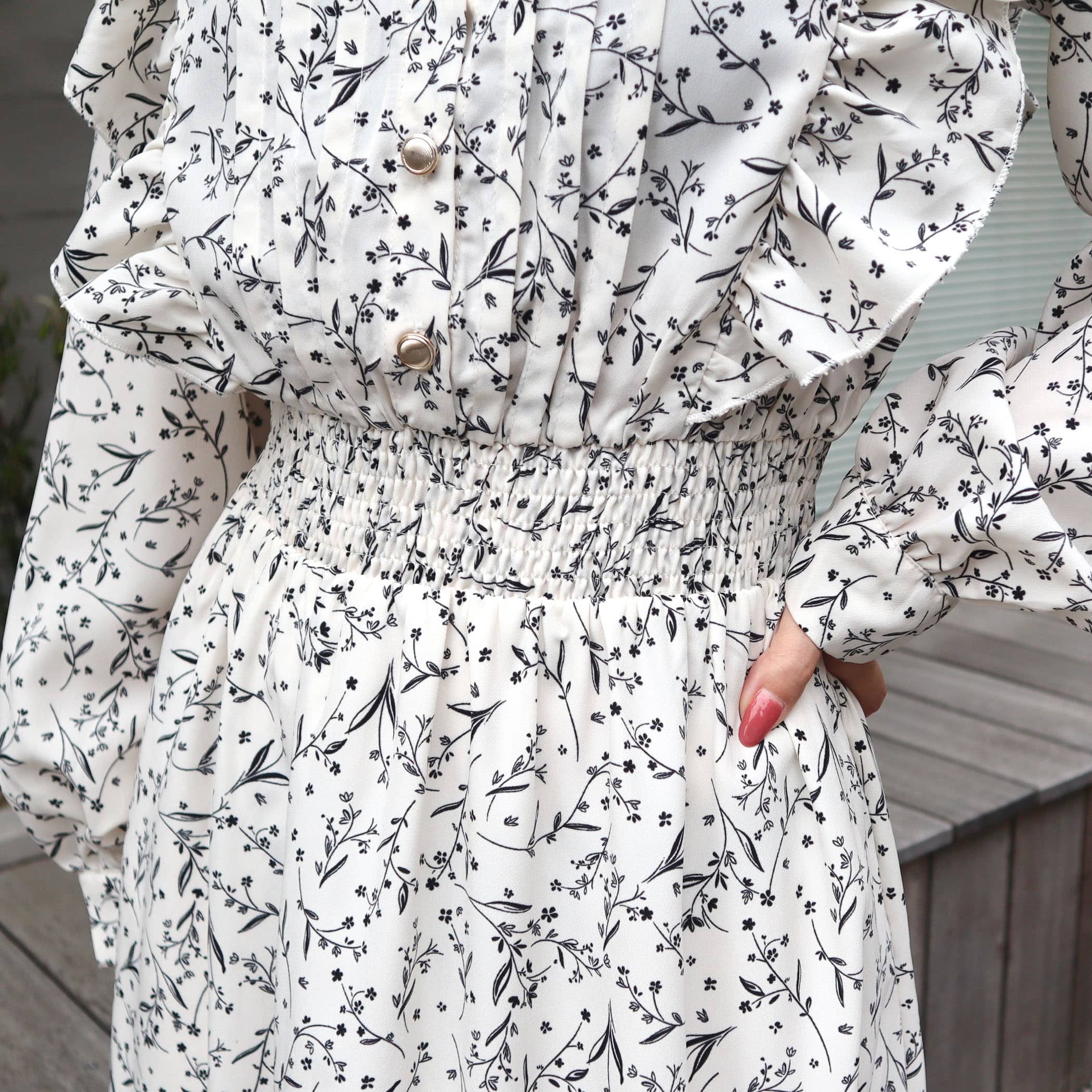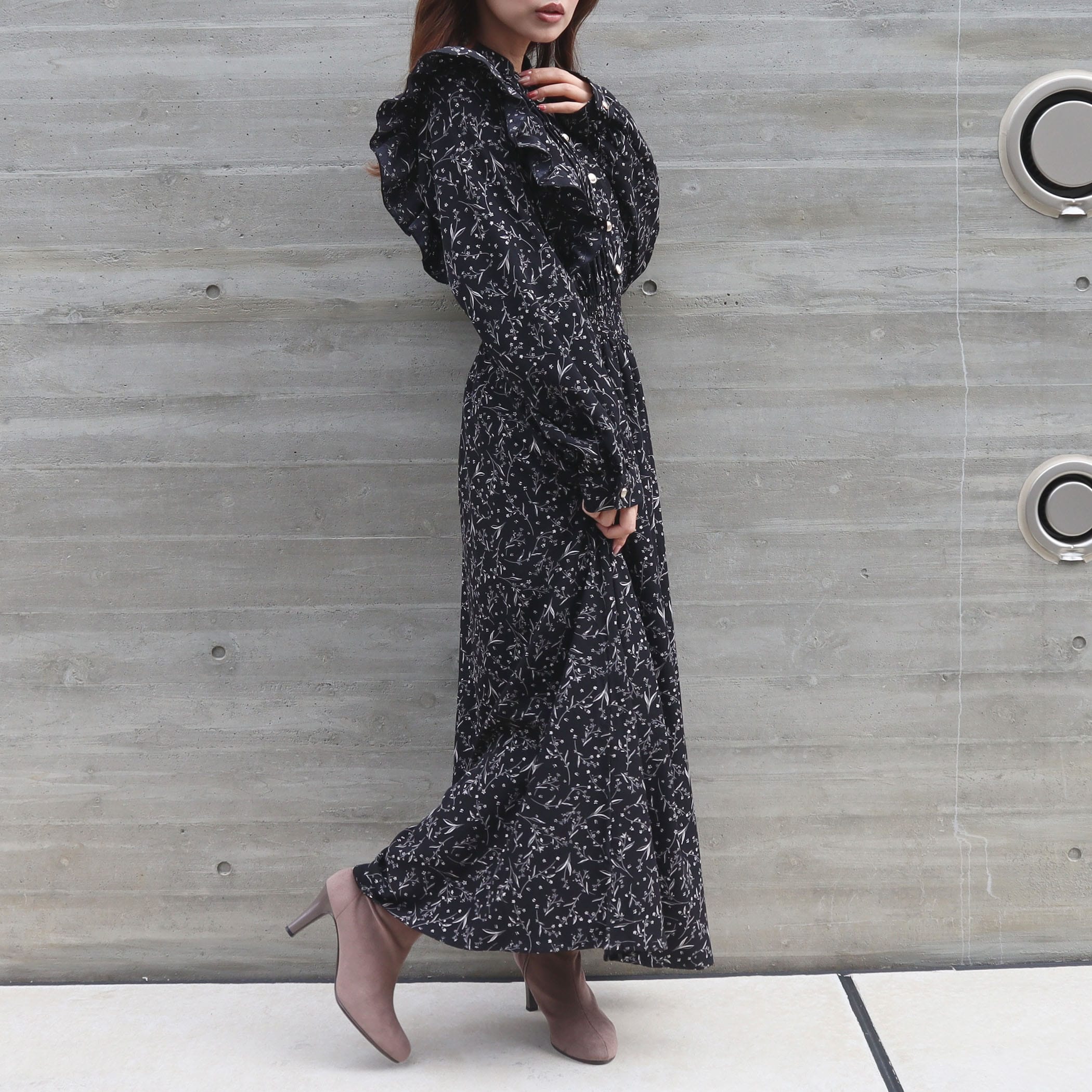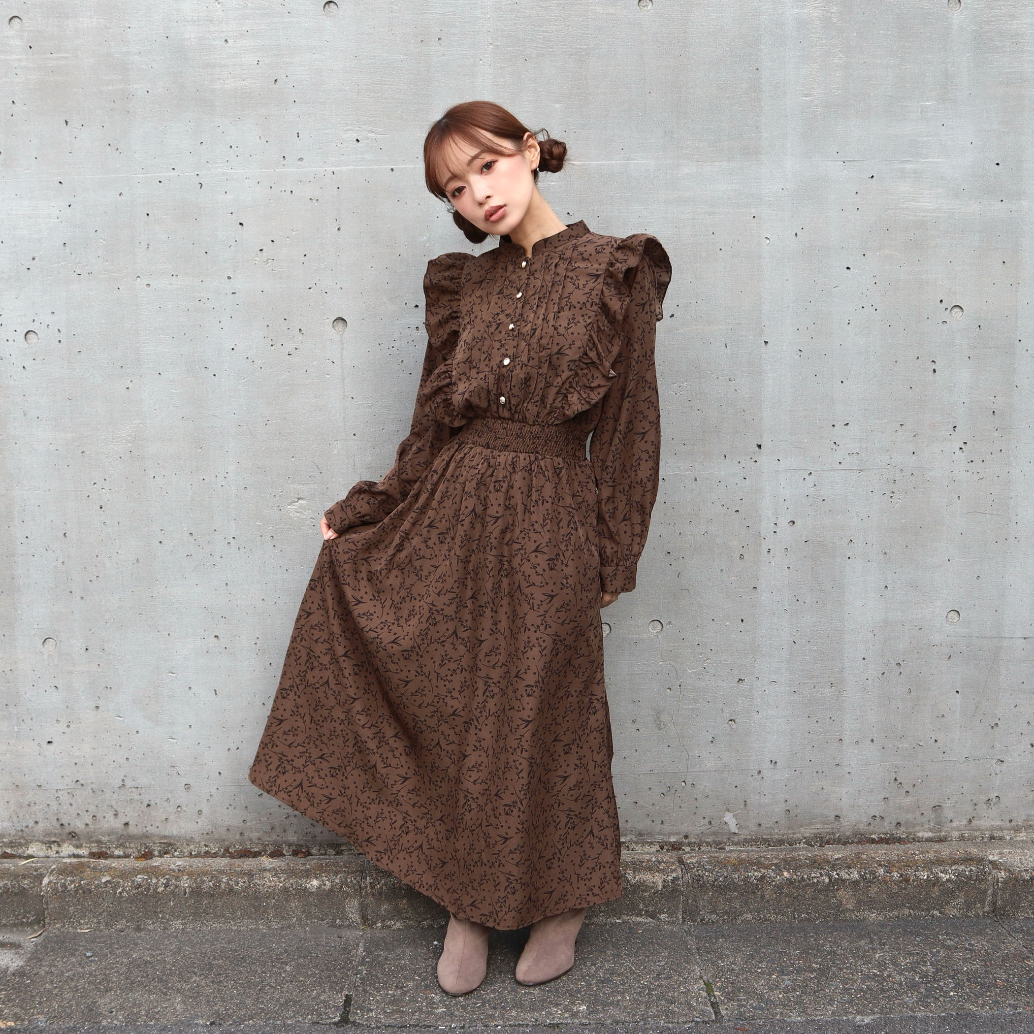 花柄とフリル袖が可愛い長袖ロングワンピース。フリル使いとお花柄で可愛いを詰め込んだ長袖ワンピース。存在感のあるワンピースは着るだけで主役級な着こなしを楽しめ、女子会やちょっとしたお呼ばれにも◎キラキラなゴールドボタンはジャケットやカーデ合わせでチラ見せすれば上品な大人な雰囲気も楽しめます。ボリュームのある靴を合わせれば韓国ファッションな着こなしに。ハイウエストのウエスト位置はスタイルUP見え効果も。長袖のワンピースは秋服・冬服コーデはもちろんのこと春先まで楽しめるので、長く楽しめるアイテムです。
