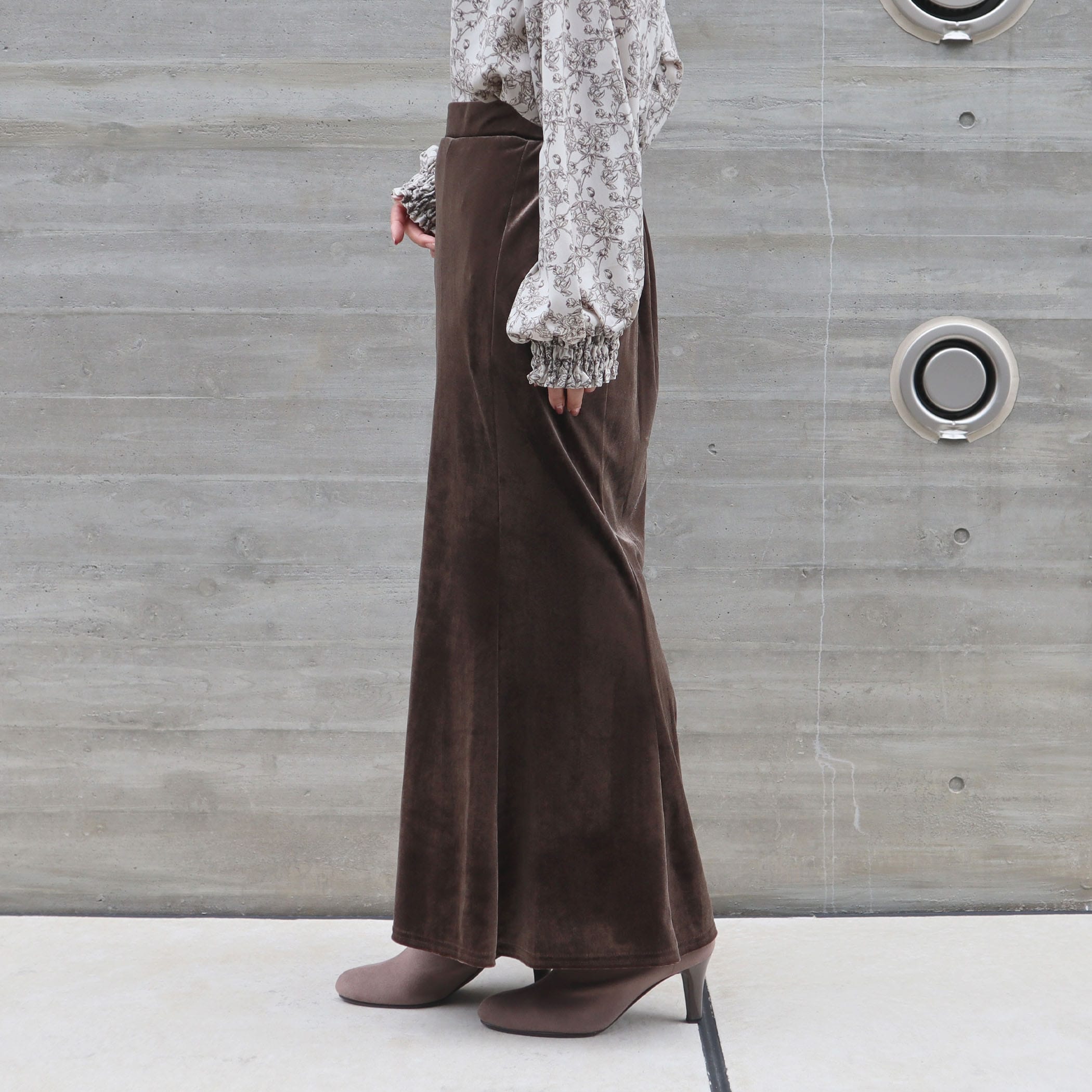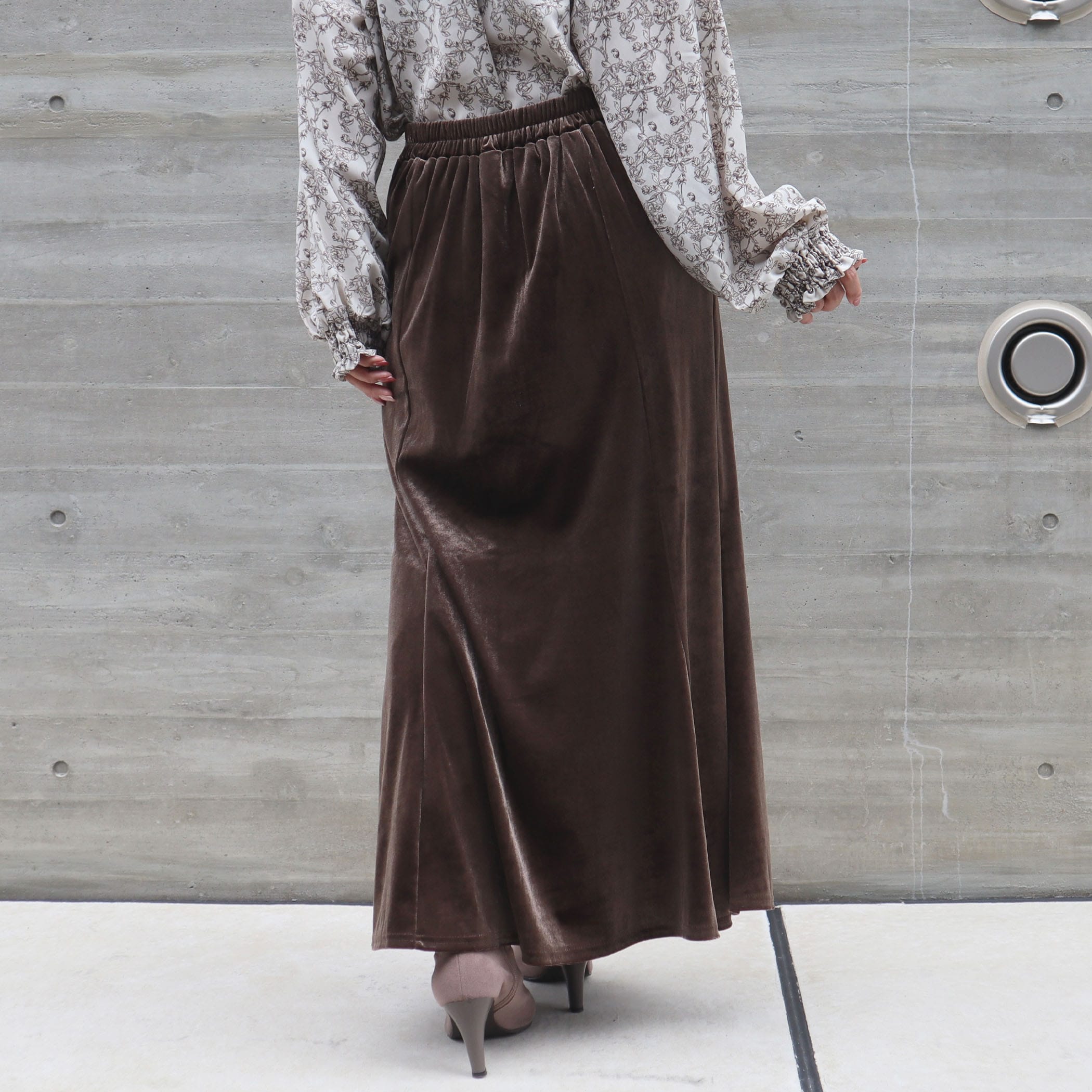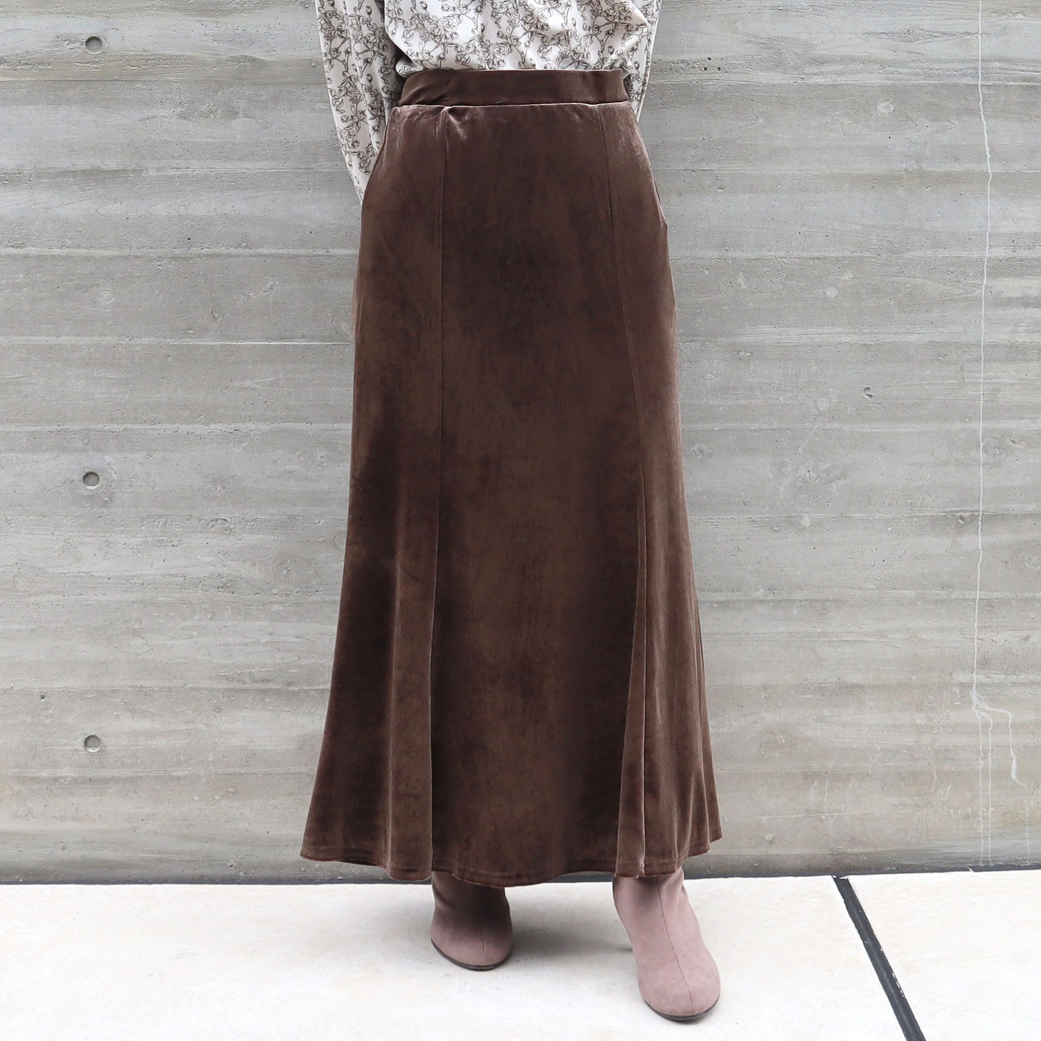 着映えする華やかな秋冬コーデにぴったりなベロアプリーツスカート。こなれた印象を演出し、動くたびに光沢感が高見えします。マーメイドラインのシルエットが様々なトップスとのバランスが取りやすく、綺麗め~カジュアルな雰囲気まで幅広いコーデがしやすい万能アイテムです。