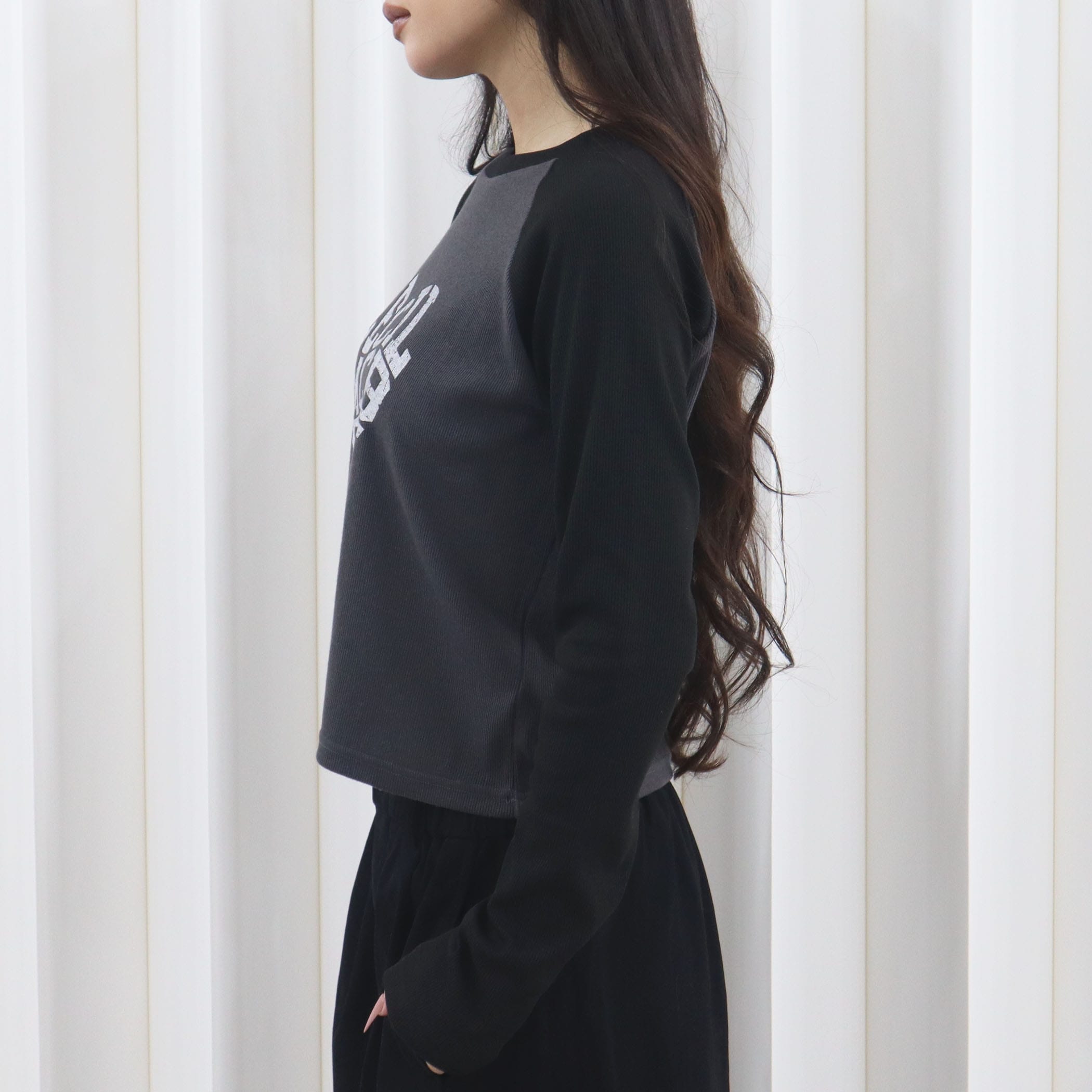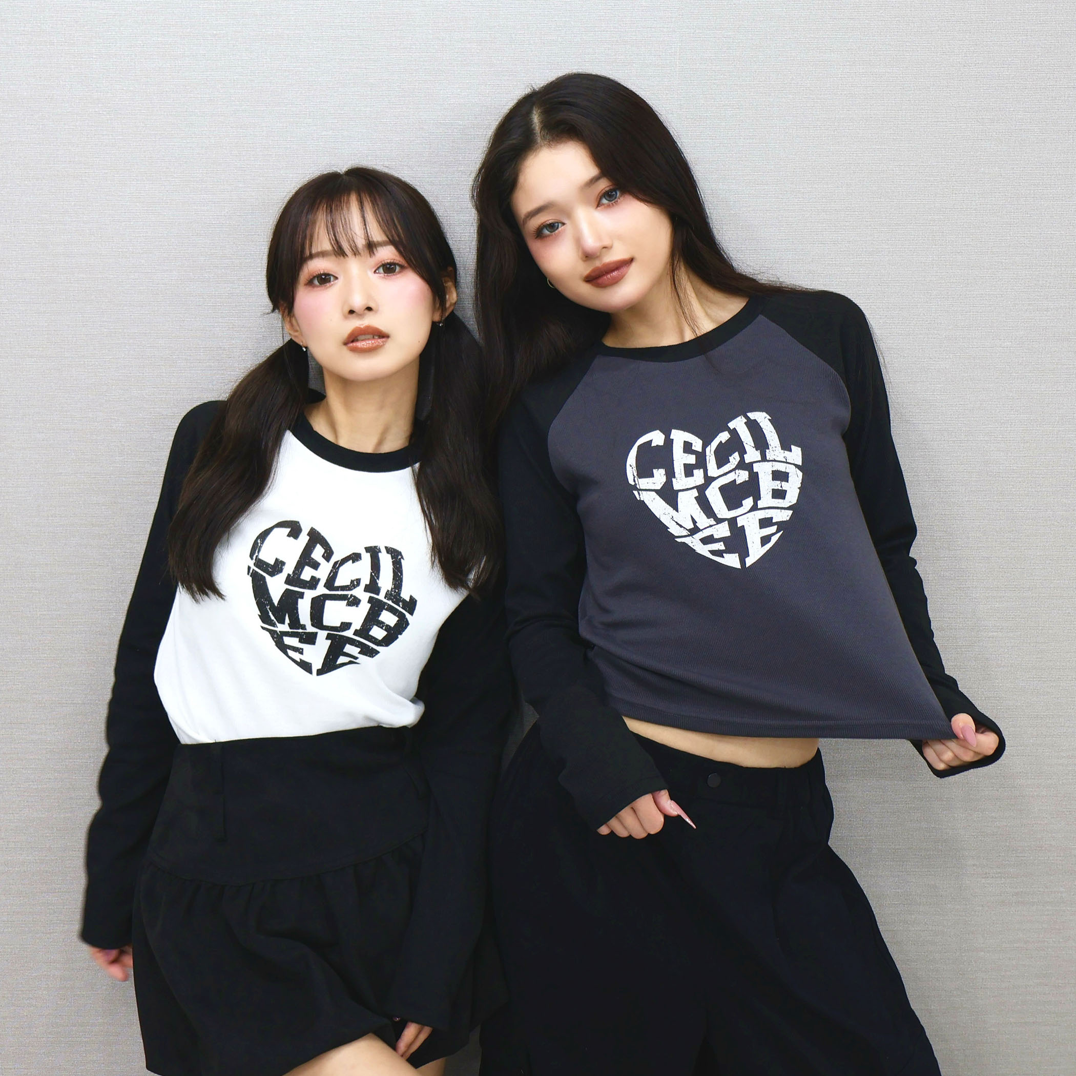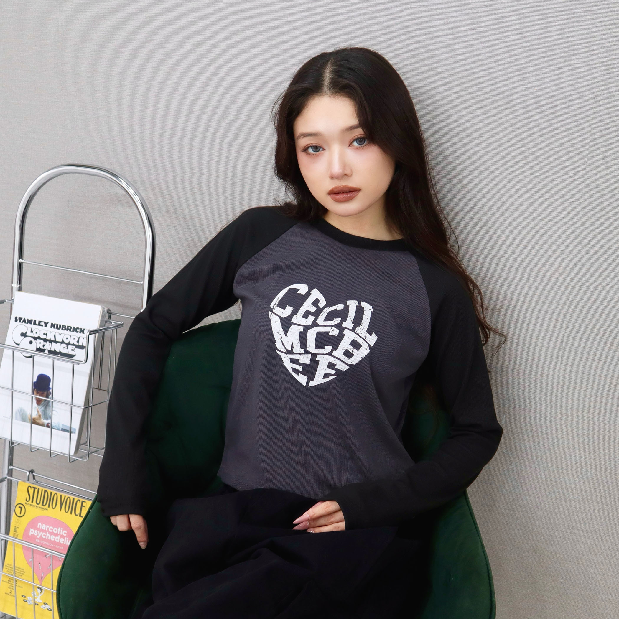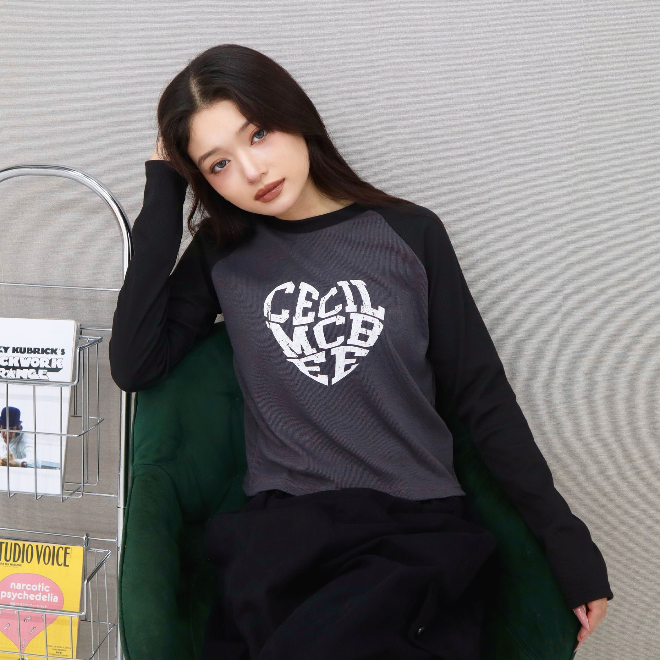 フロントのハートロゴが目を引くラグラン切替のリブトップス。コンパクトなシルエットですが伸縮性のあるリブ素材なので、締め付けもなく程よく体にフィットしてくれます。短めの丈なのでハイウエストボトムとの相性はもちろん、ローウエストと合わせて肌見せでの着用も楽しめます。