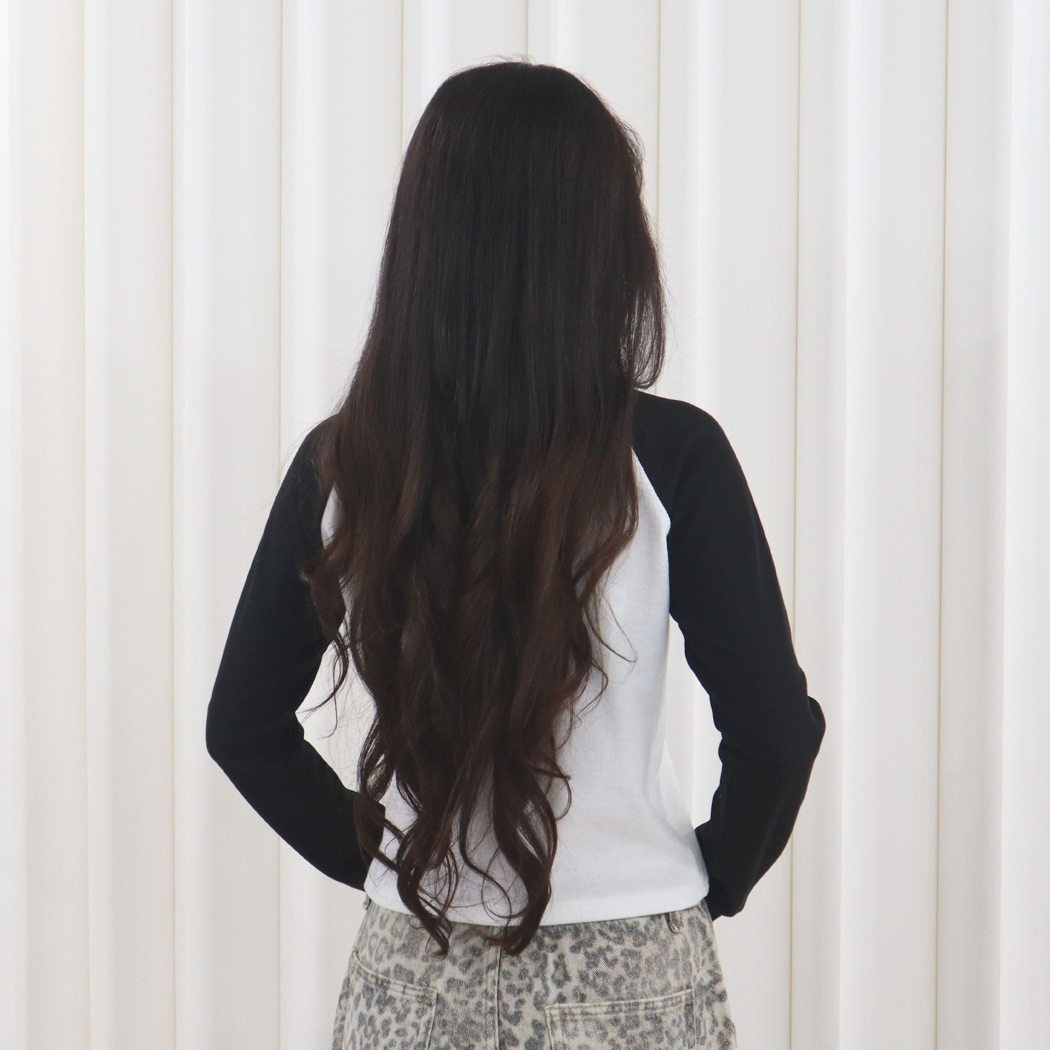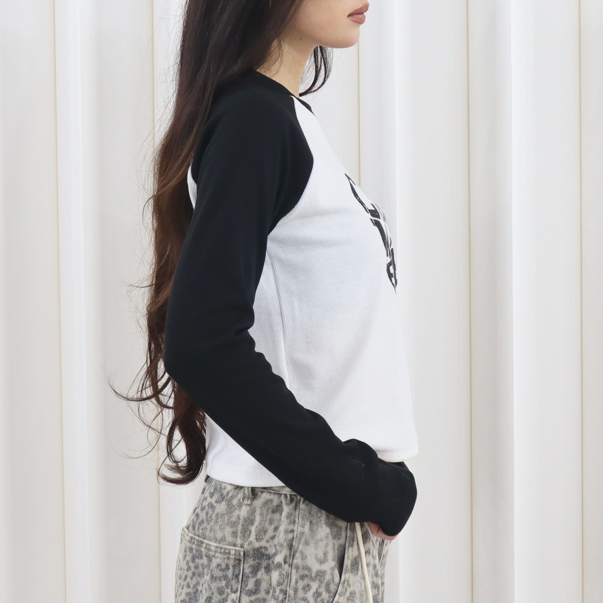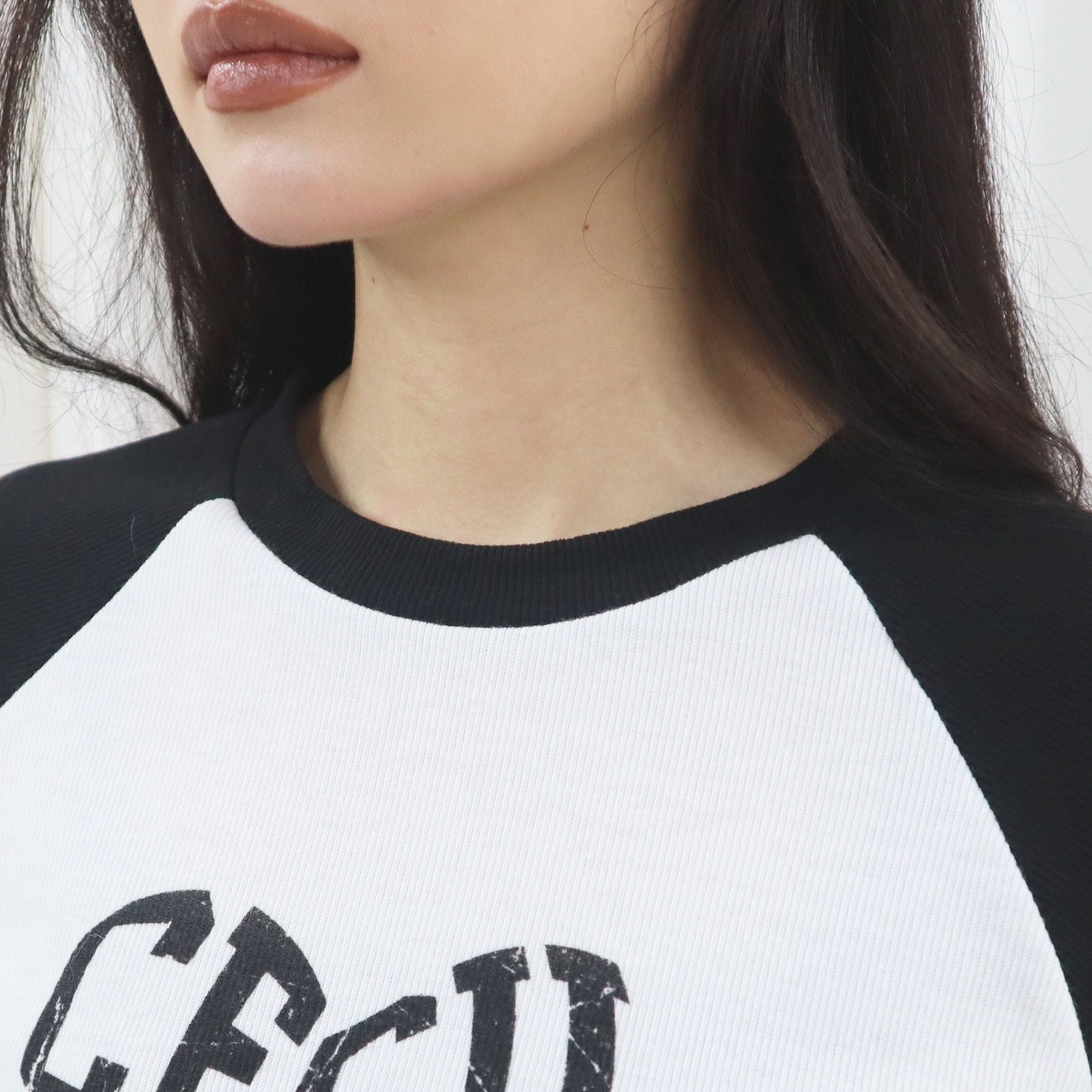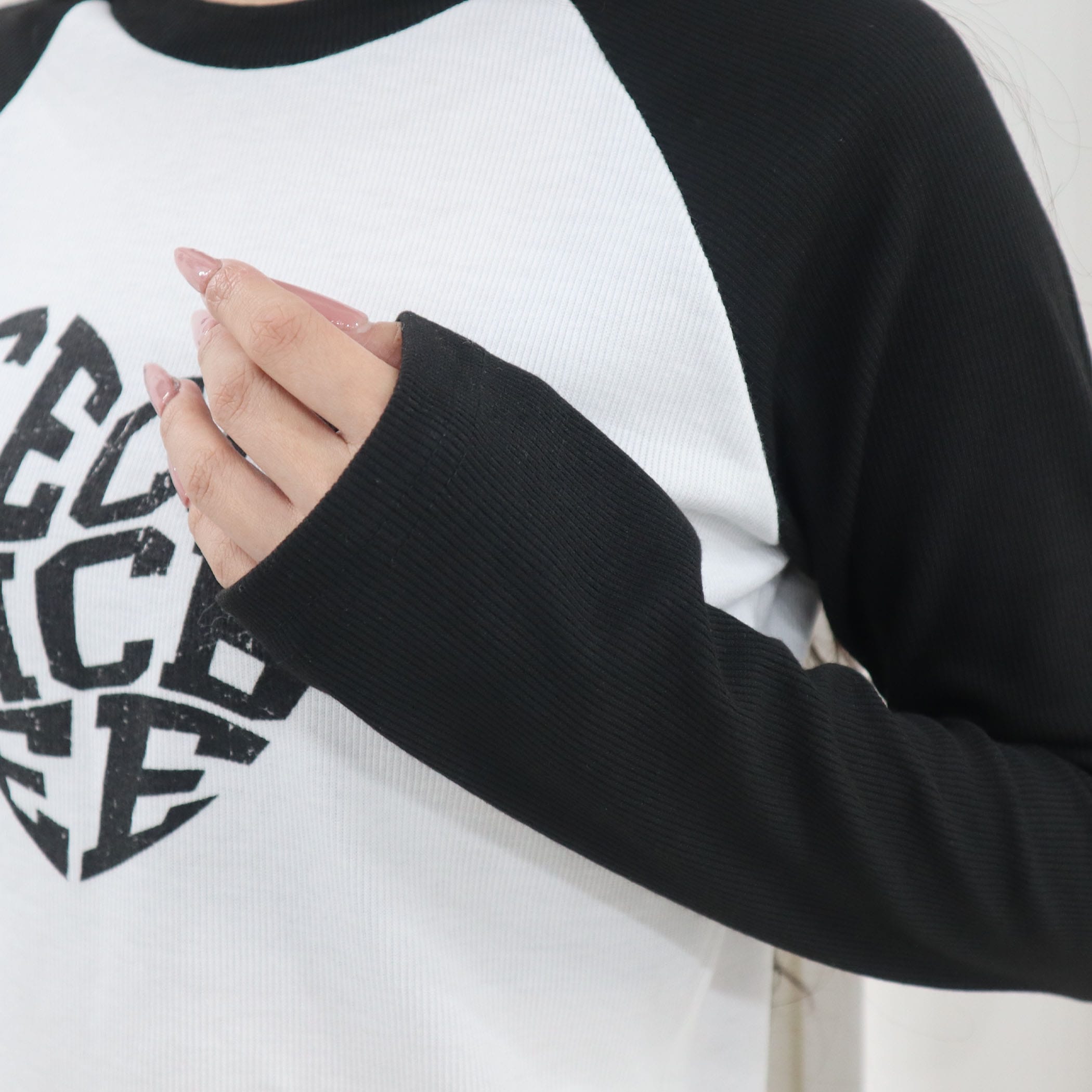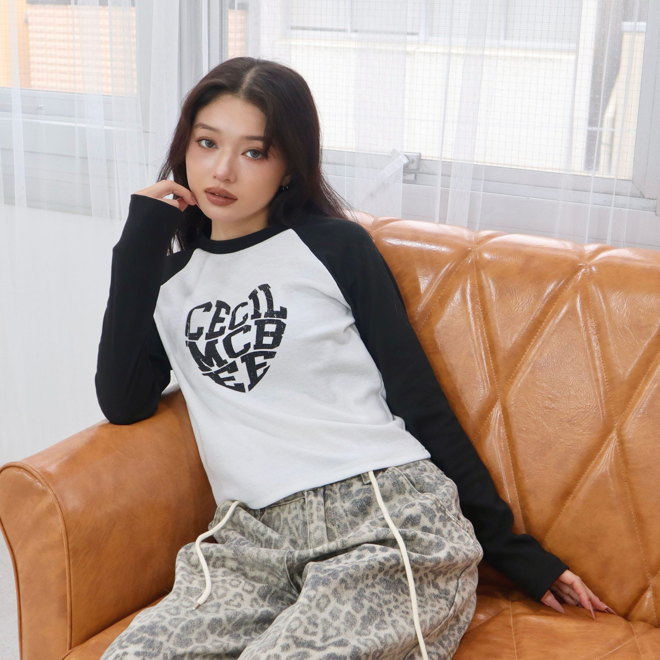 フロントのハートロゴが目を引くラグラン切替のリブトップス。コンパクトなシルエットですが伸縮性のあるリブ素材なので、締め付けもなく程よく体にフィットしてくれます。短めの丈なのでハイウエストボトムとの相性はもちろん、ローウエストと合わせて肌見せでの着用も楽しめます。