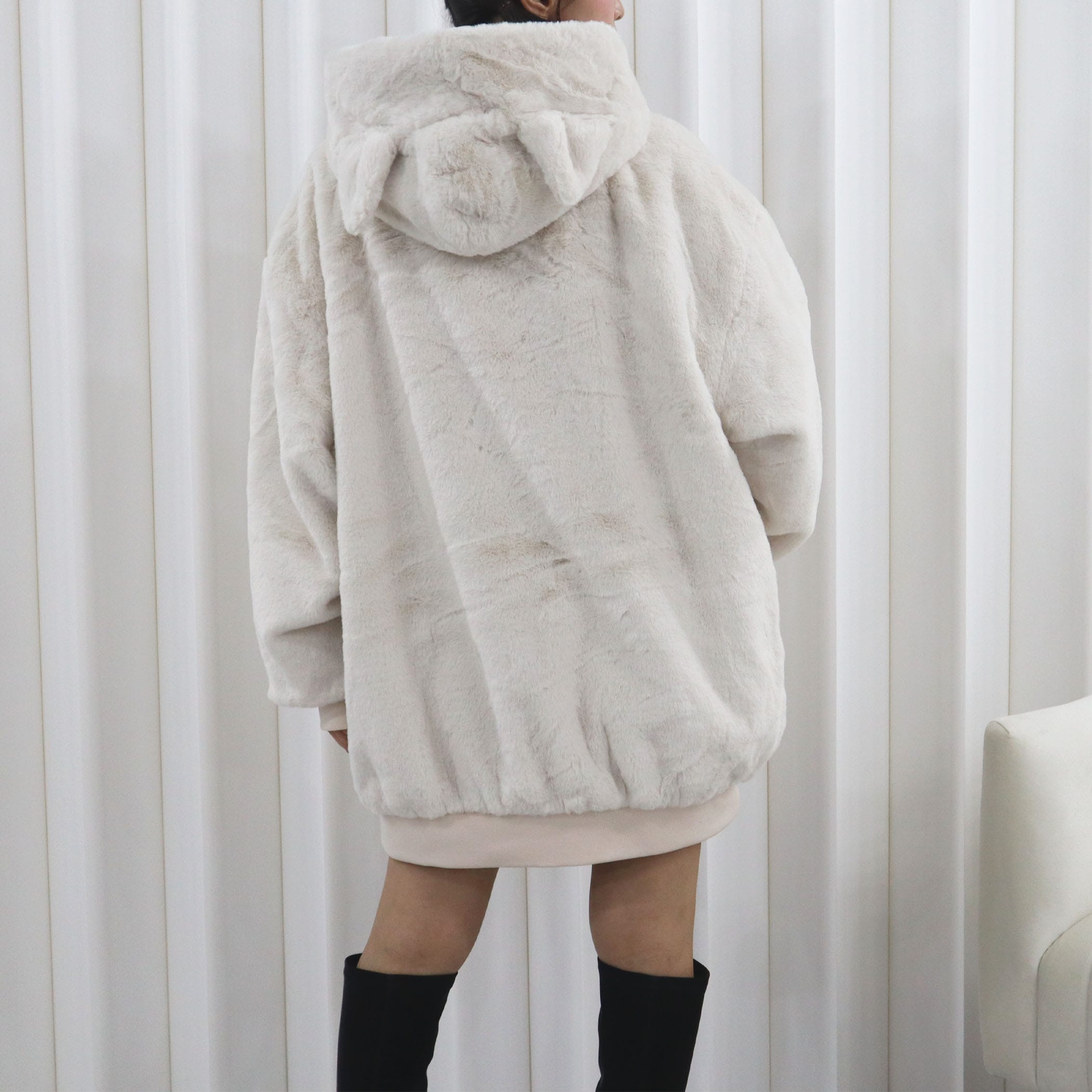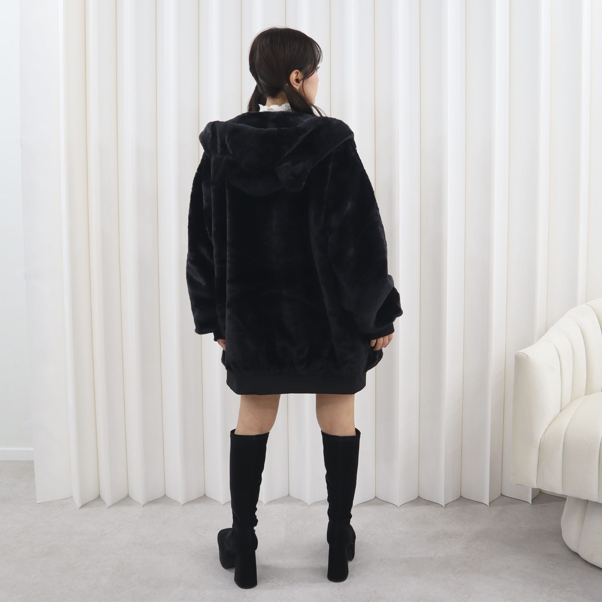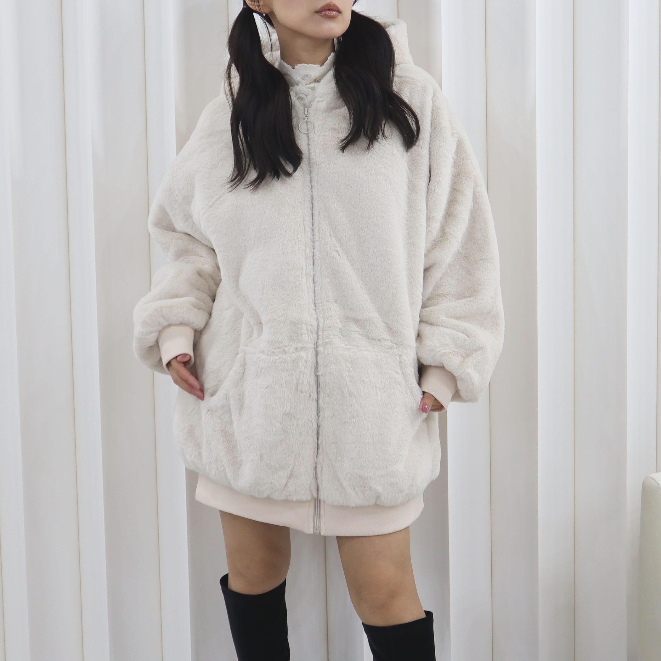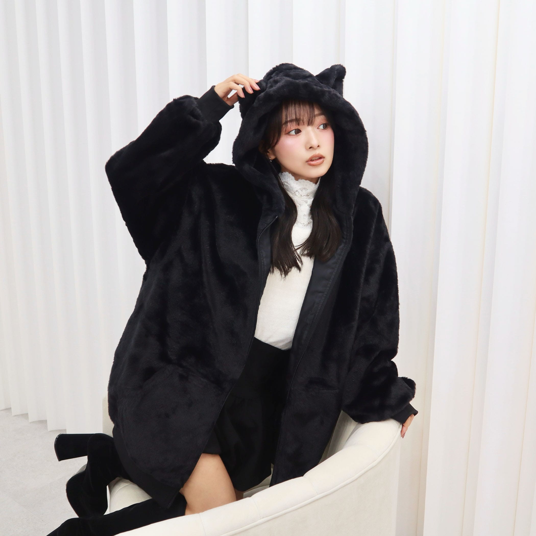 思わず触れたくなるような、ふわふわのファー素材が魅力的なでネコ耳付きのフーディアウター。大きめのサイズ感にゆ丸みのあるシルエットが◎。ボトムはタイトからワイドまで幅広いデザインと相性が良く、着回しのできる一枚です。