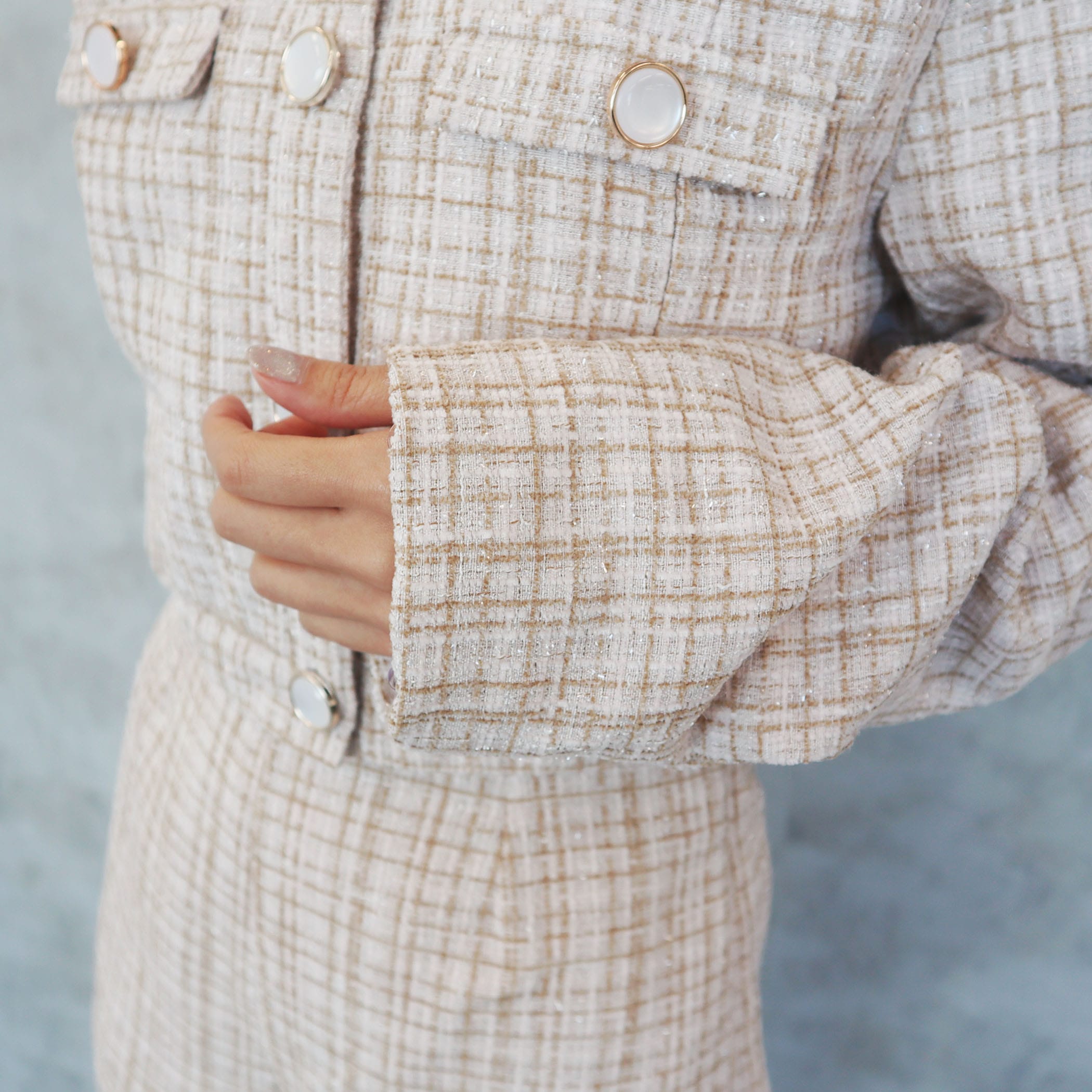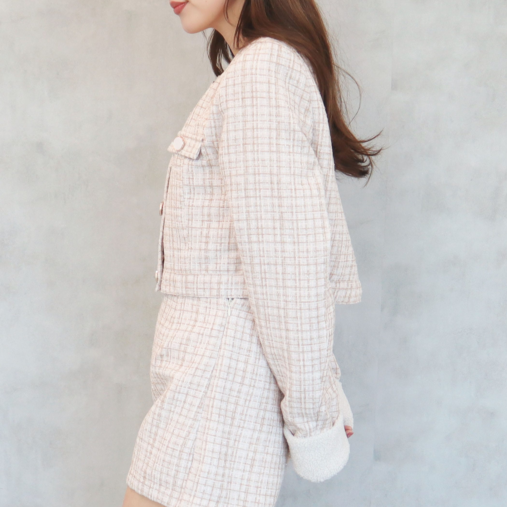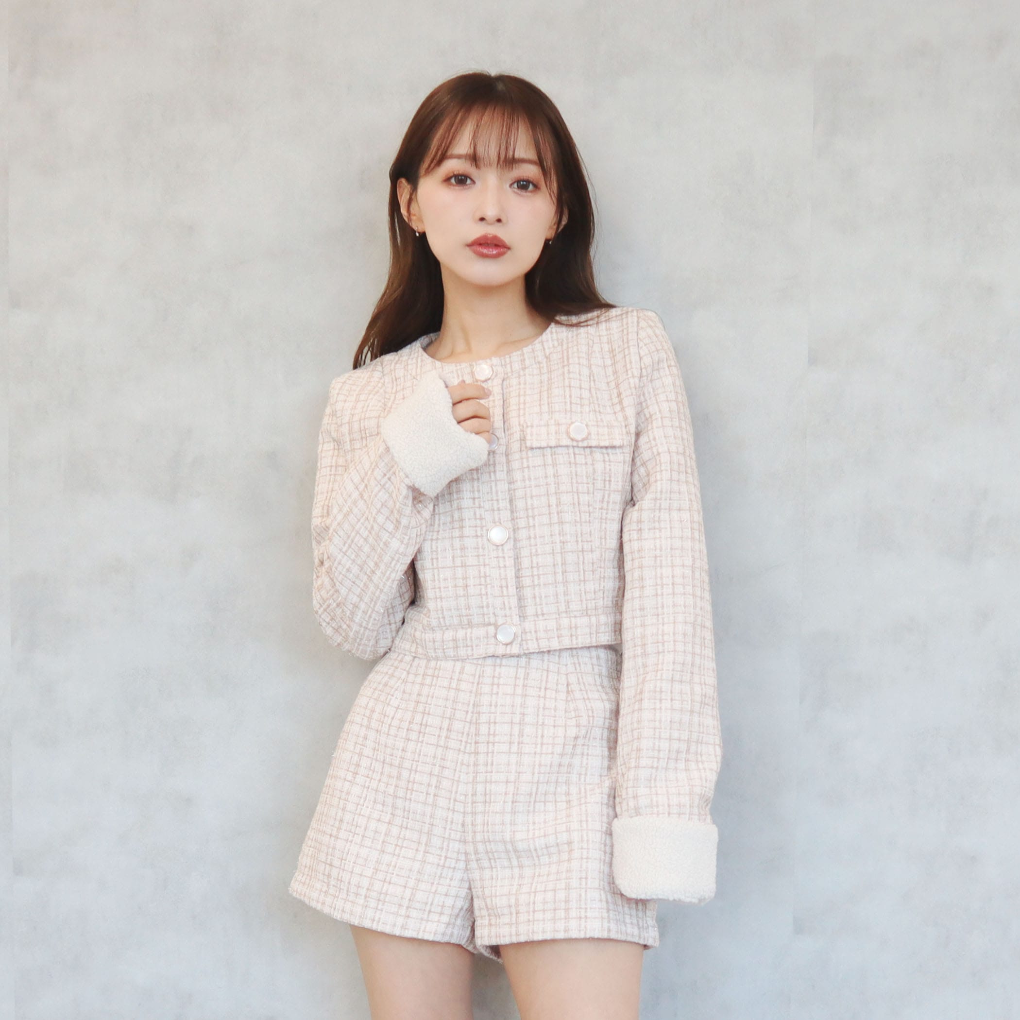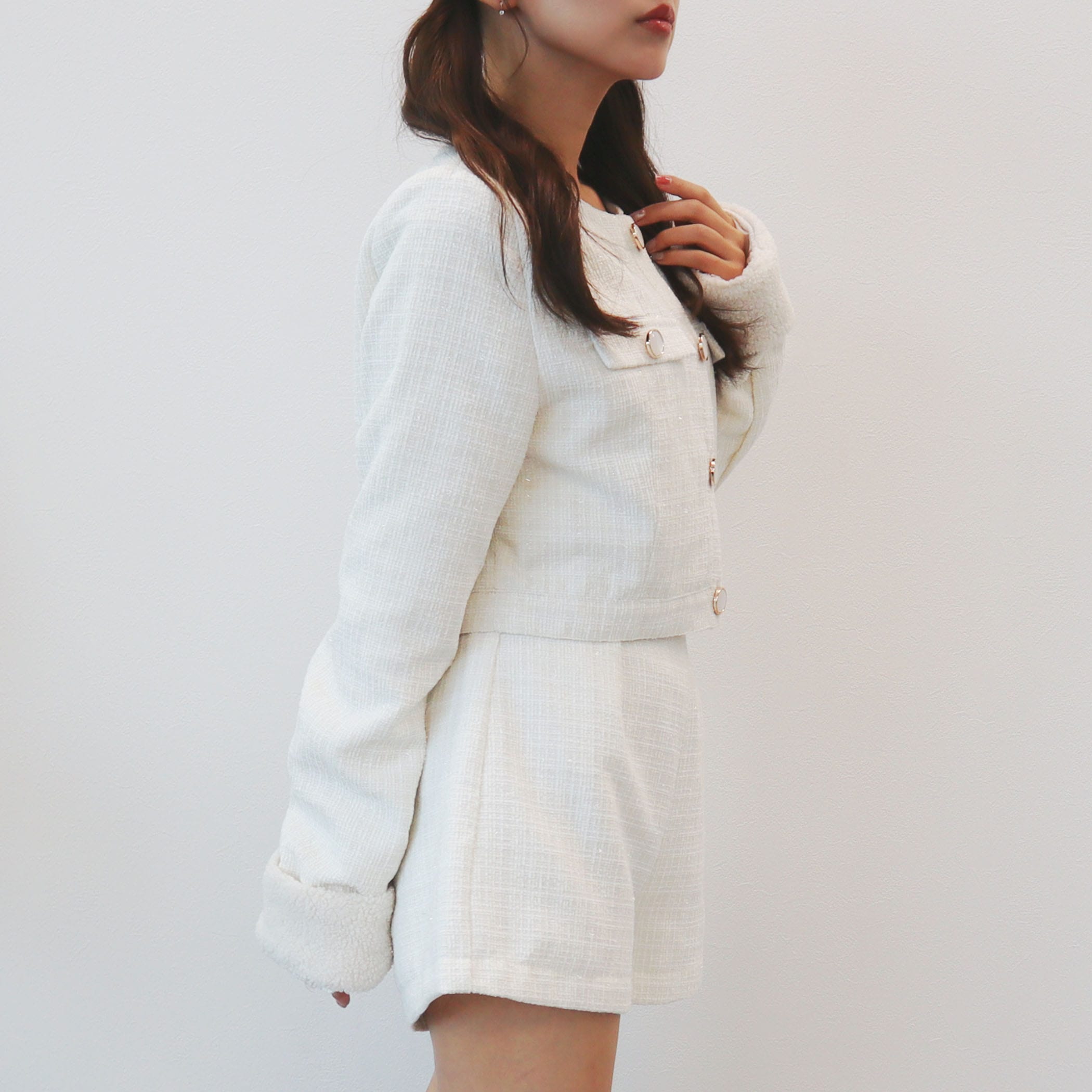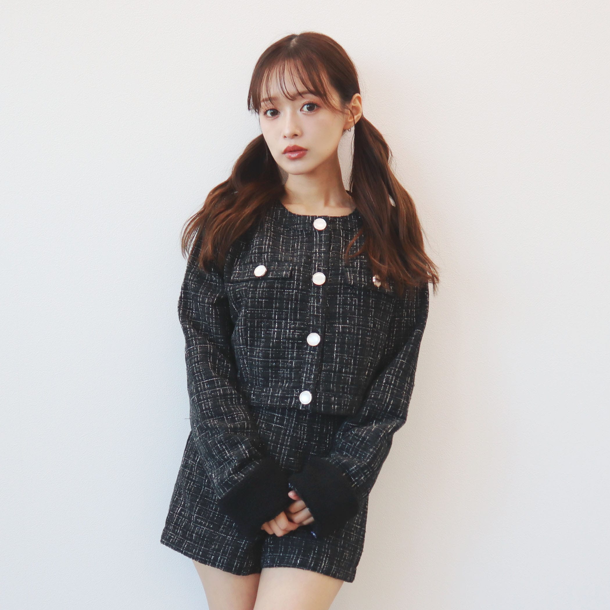 ほんのりのラメが可愛いボア取り外し可能のツイードショート丈ジャケット。ツイード素材×大き目ボタンでキチンと魅えに◎レトロな雰囲気はオフィスカジュアルからデニム合わせの大人キレイ目カジュアルまで幅広く楽しめます。ツイード素材は春服コーデは勿論の事、秋服冬服コーデにも◎