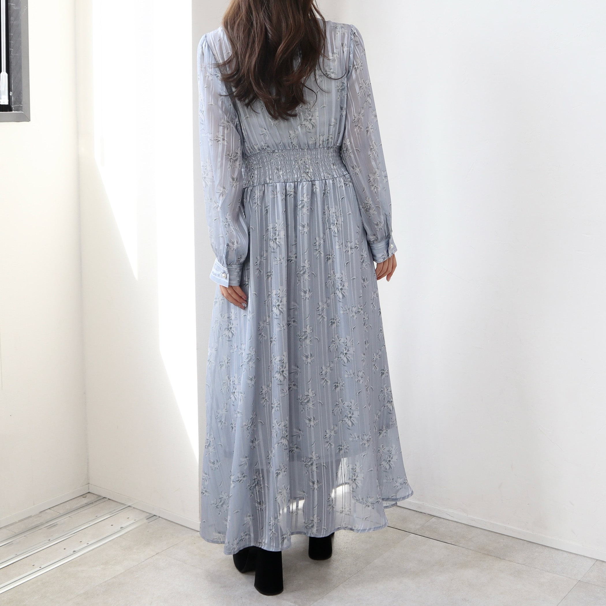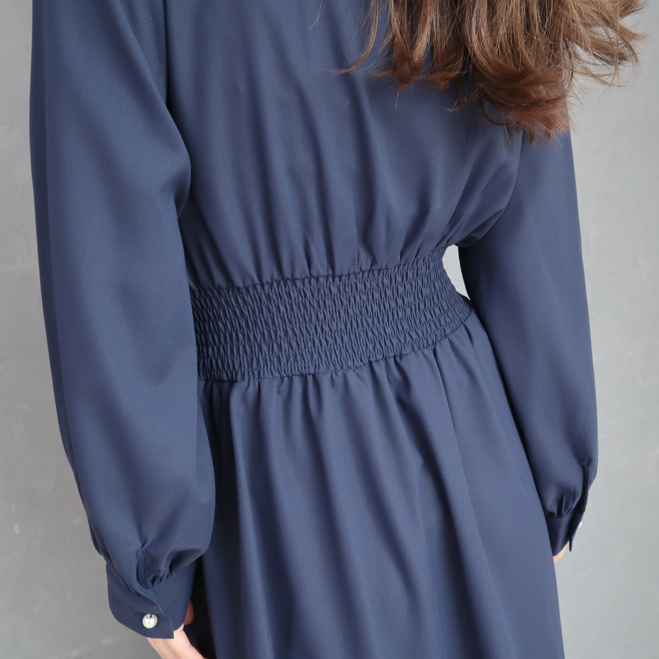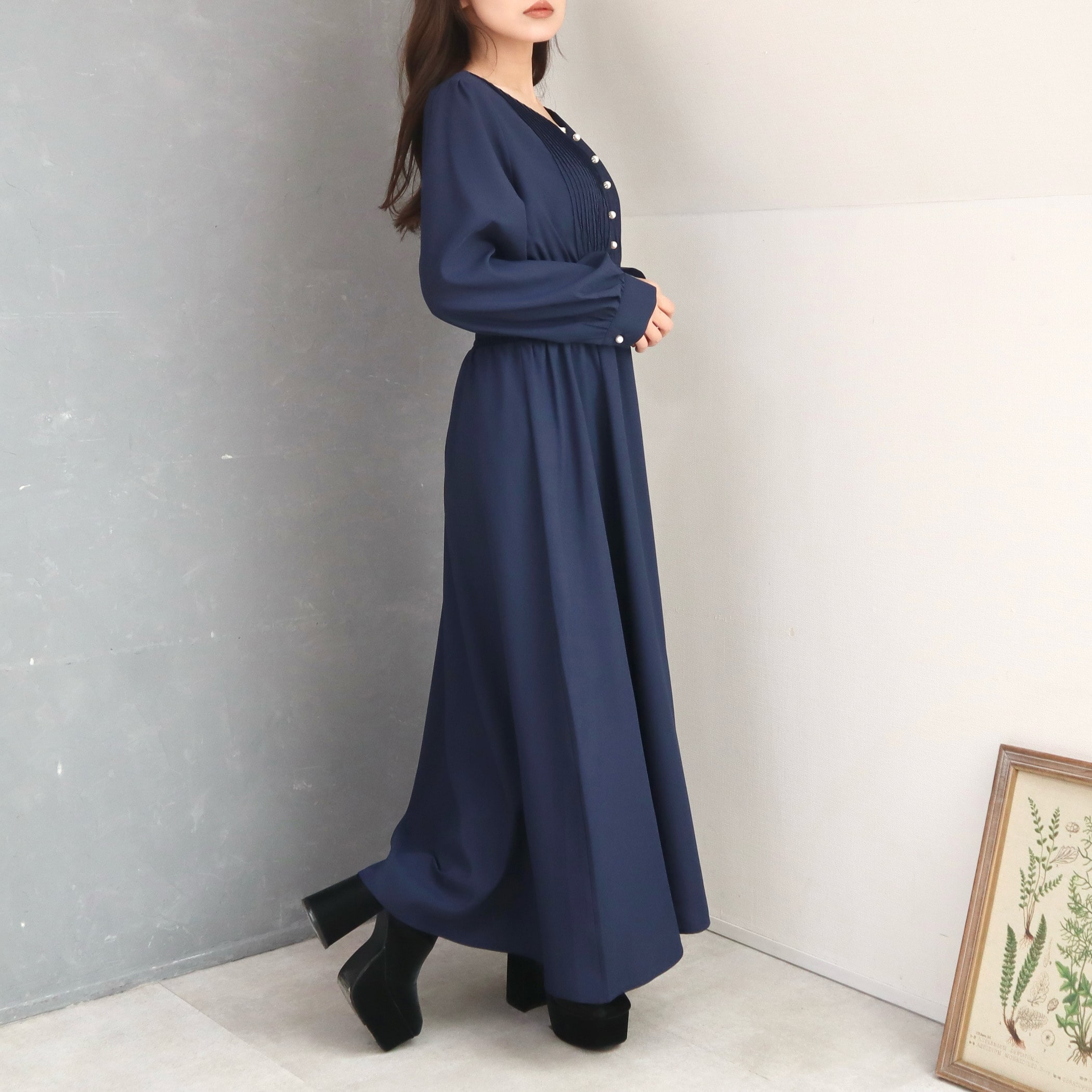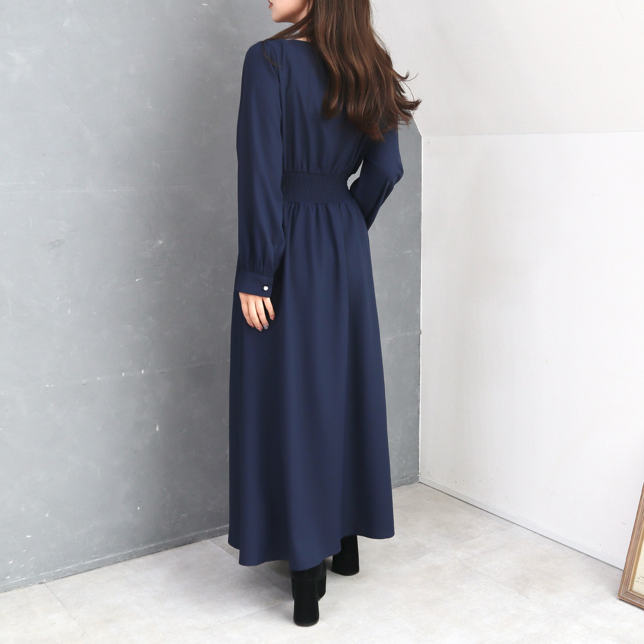 お顔周りをスッキリ見せるVネックワンピース。フロントと袖口にパール釦をあしらって上品エレガントな雰囲気をプラス◎胸下から切り替えたウエストデザインでナチュラルにくびれをメイクし、細見え&足長効果も◎メリハリのあるシルエットを構築しつつ、大人のこなれ感あるロング丈でリラクシーに着られます。