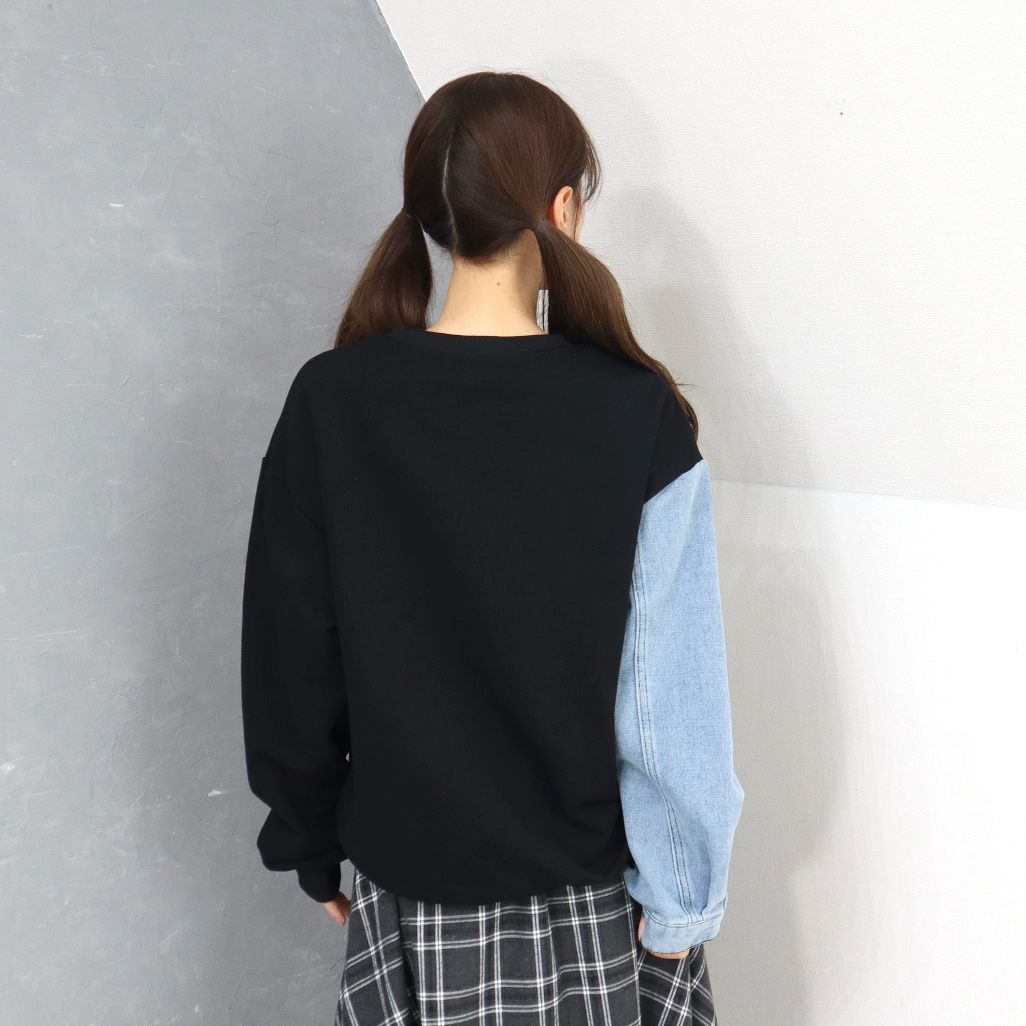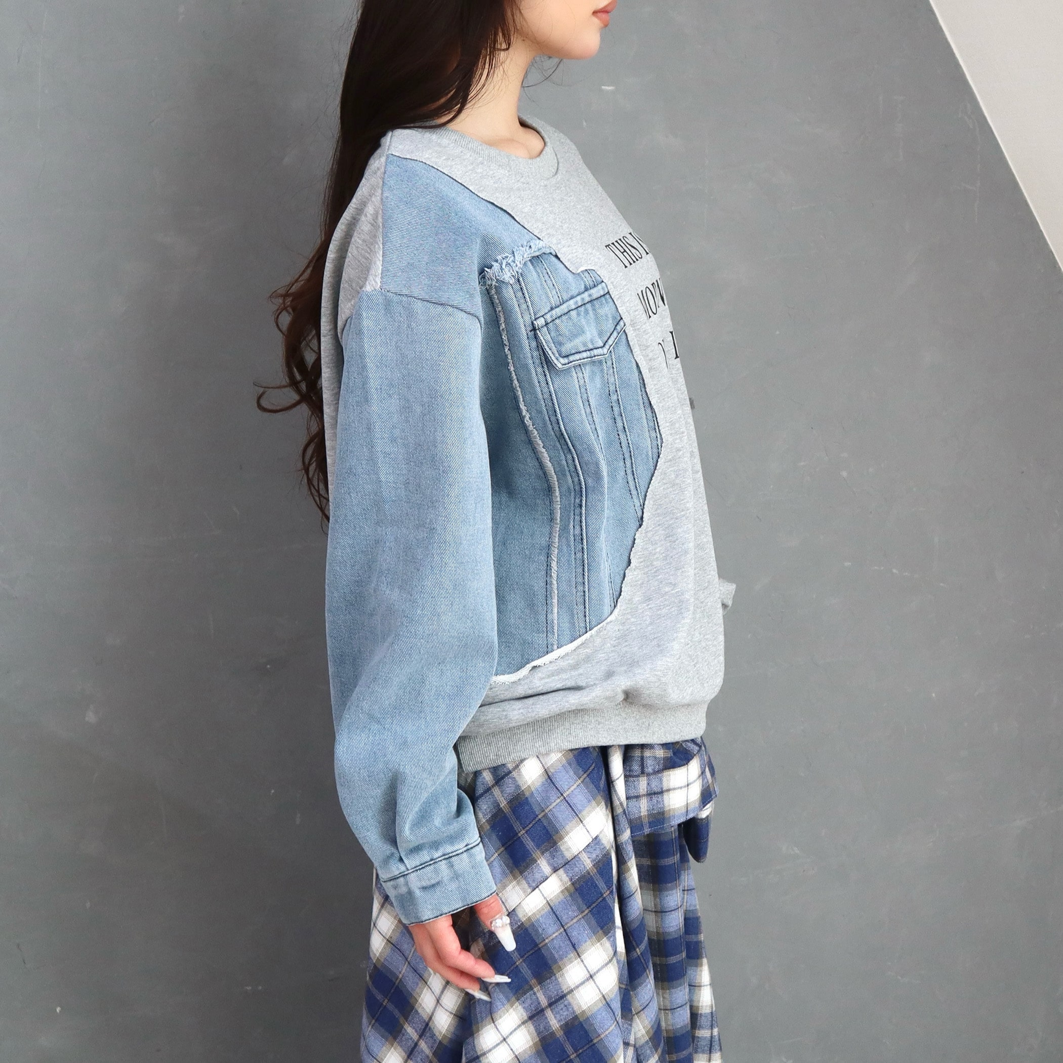 デニム使い裏毛ロゴプリントプルオーバー