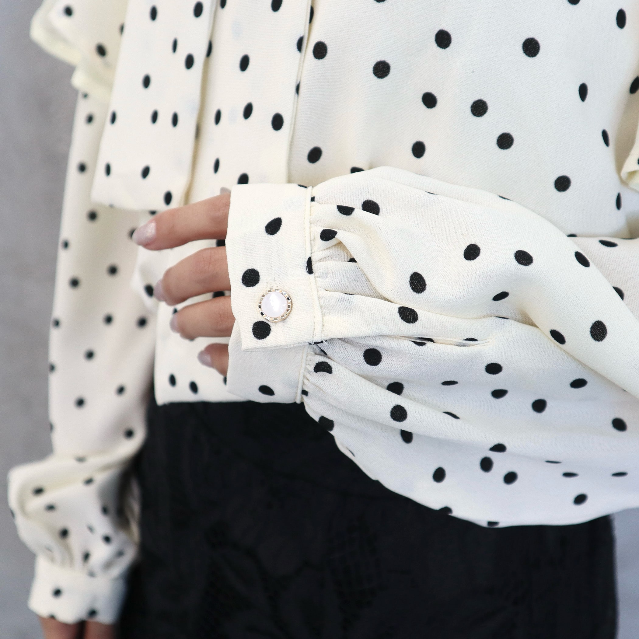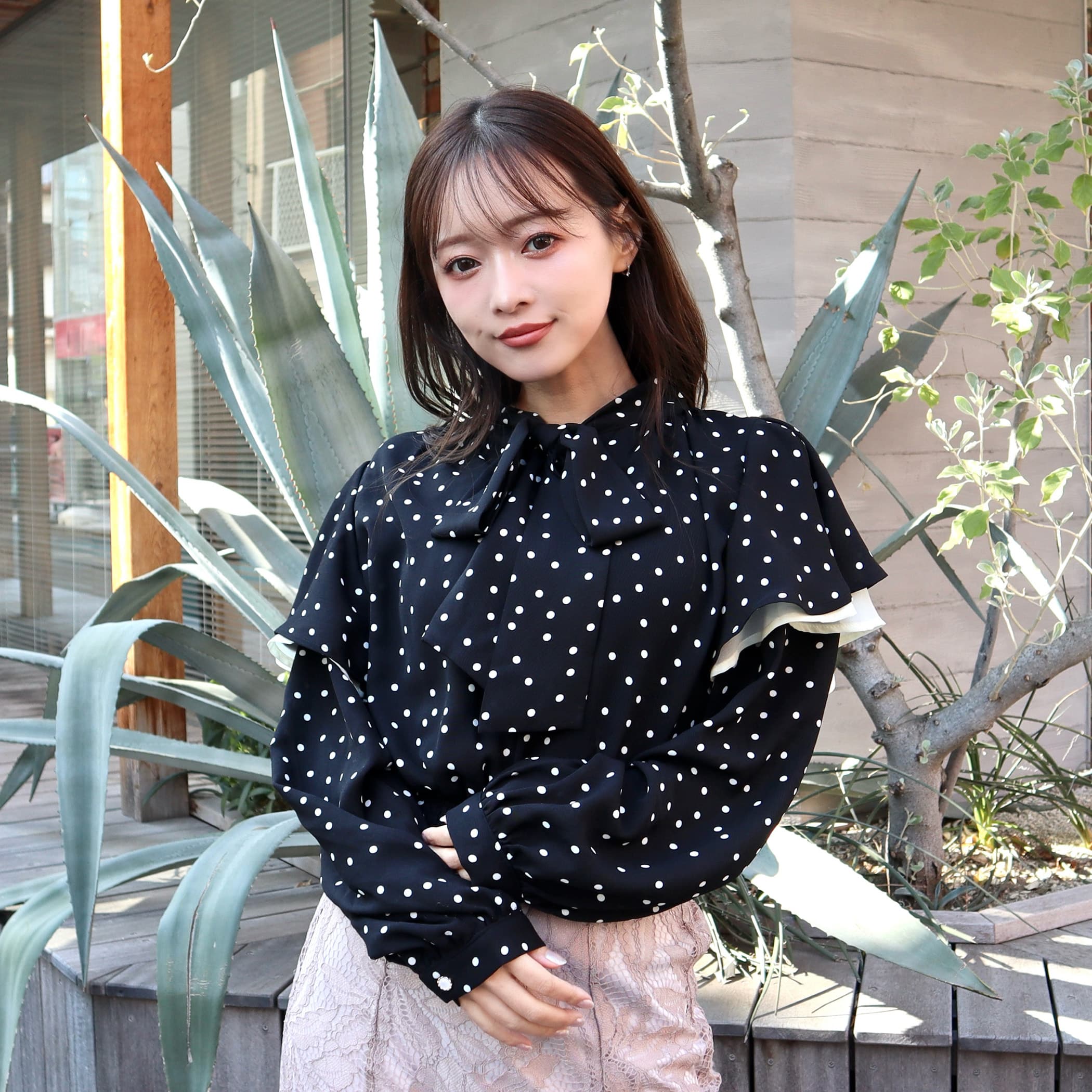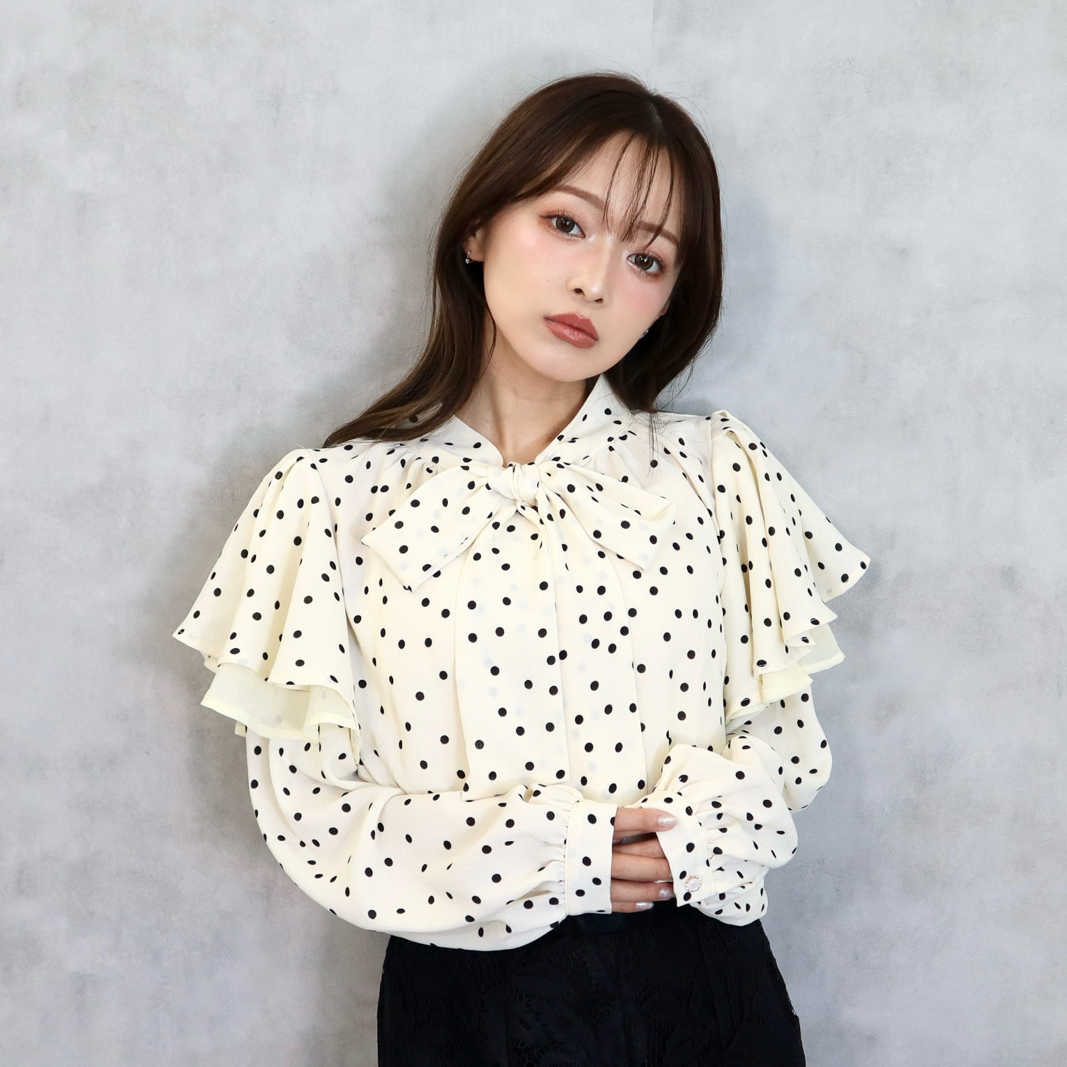 上品なボウタイリボンのドット柄 フェミニンブラウス。ガーリーなドット柄とボウタイデザインが大人可愛いアイテム。着用するだけで女性らしいフェミニンなコーデに。ふんわりとしたシルエットで肩の部分にはフリルをあしらったデザインで、よりガーリーな雰囲気になります。ネック部分はボリュームのあるボウタイデザインになっているのもポイント。上品できちんとした印象を演出。裾部分はシャーリングゴム仕様になっていて、スタイルアップ効果も◎デニムパンツなどのボトムスと合わせればガーリーなカジュアルコーデに。スラックスパンツやロングスカートなどキレイめな印象のボトムスと合わせれば大人フェミニンなコーディネートに。コーデに取り入れるだけでかわいらしい春服コーデになるアイテムです。