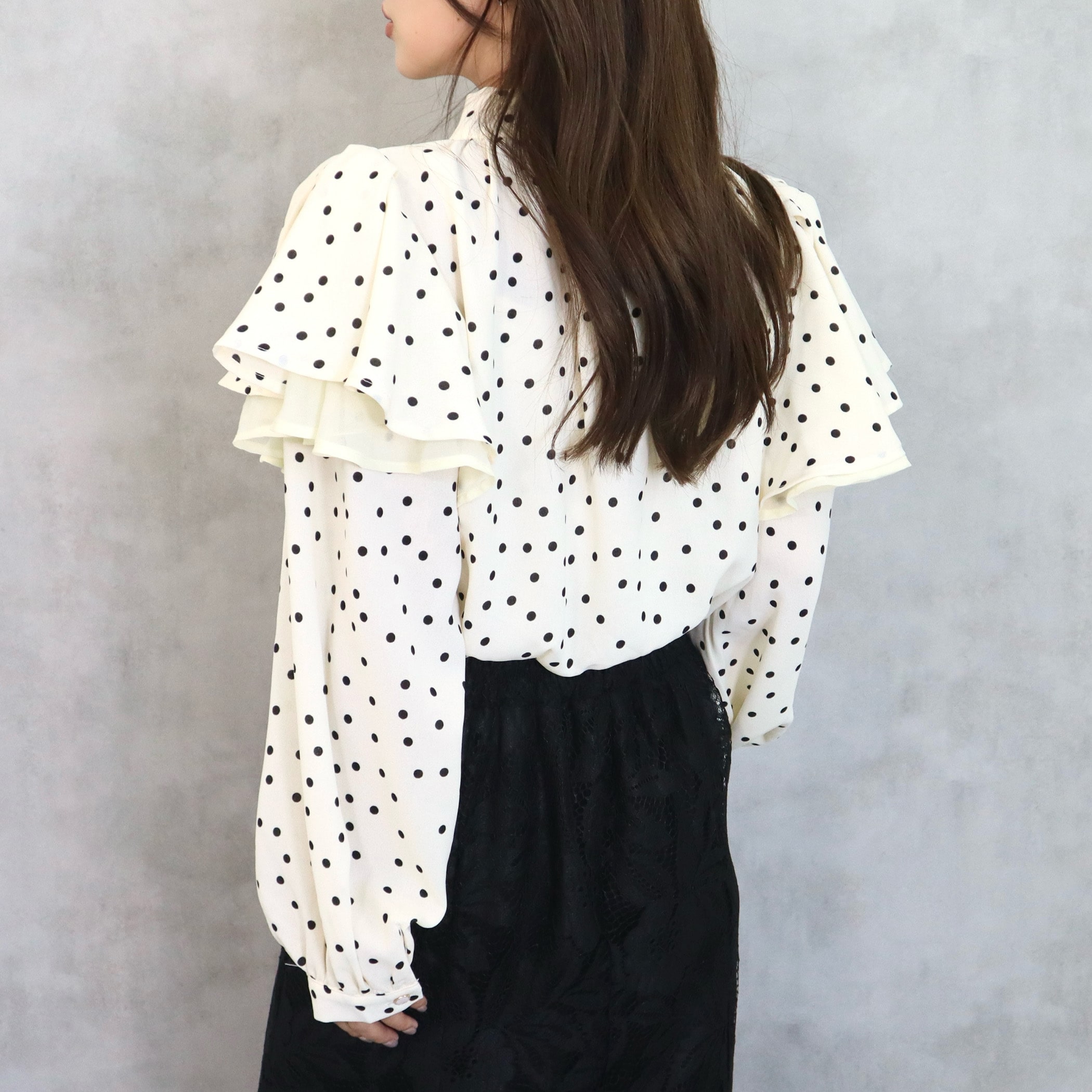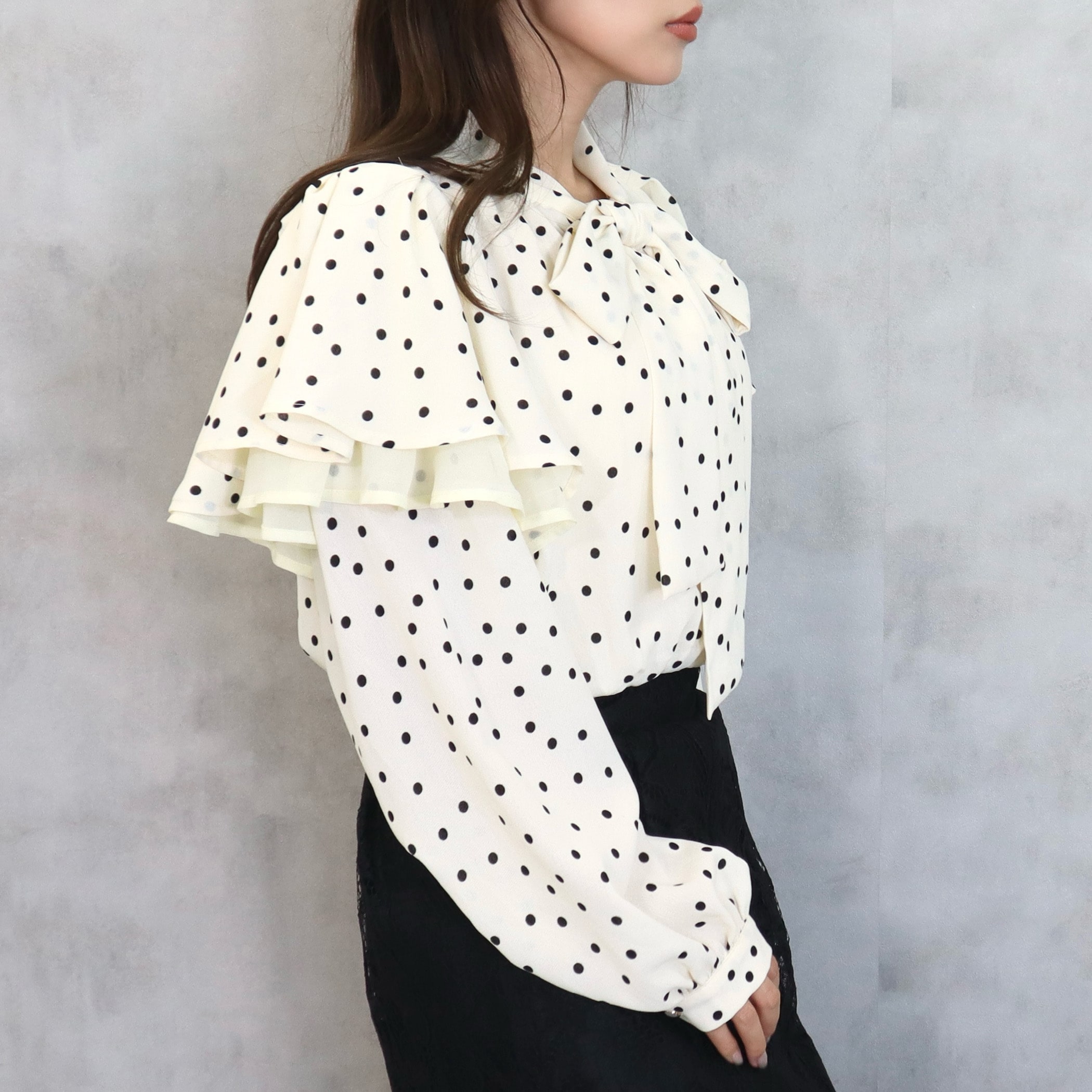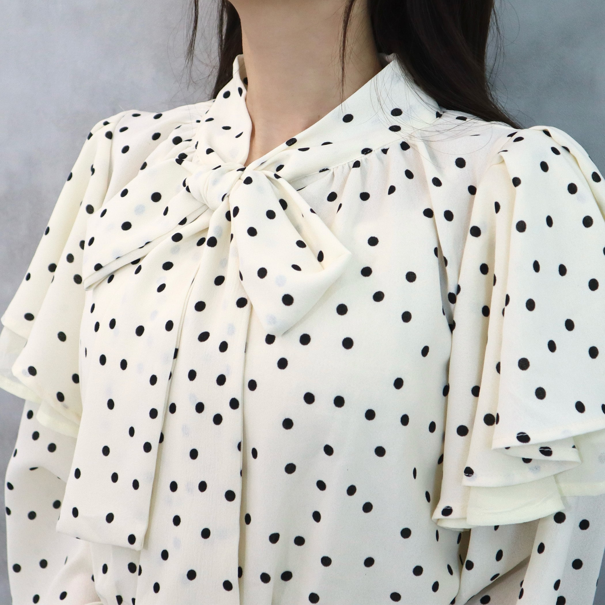 ドット柄棒タイ2枚フリルブラウス