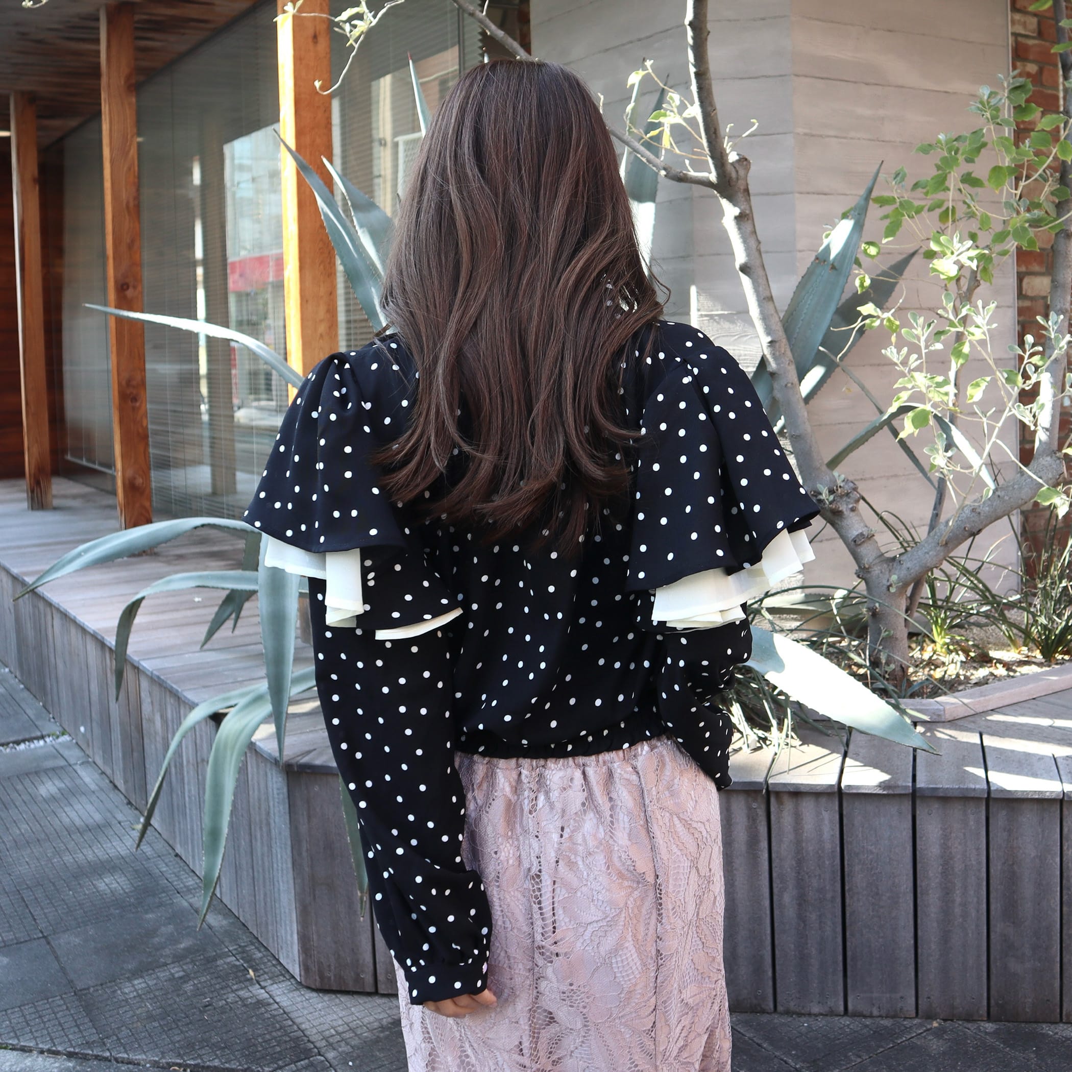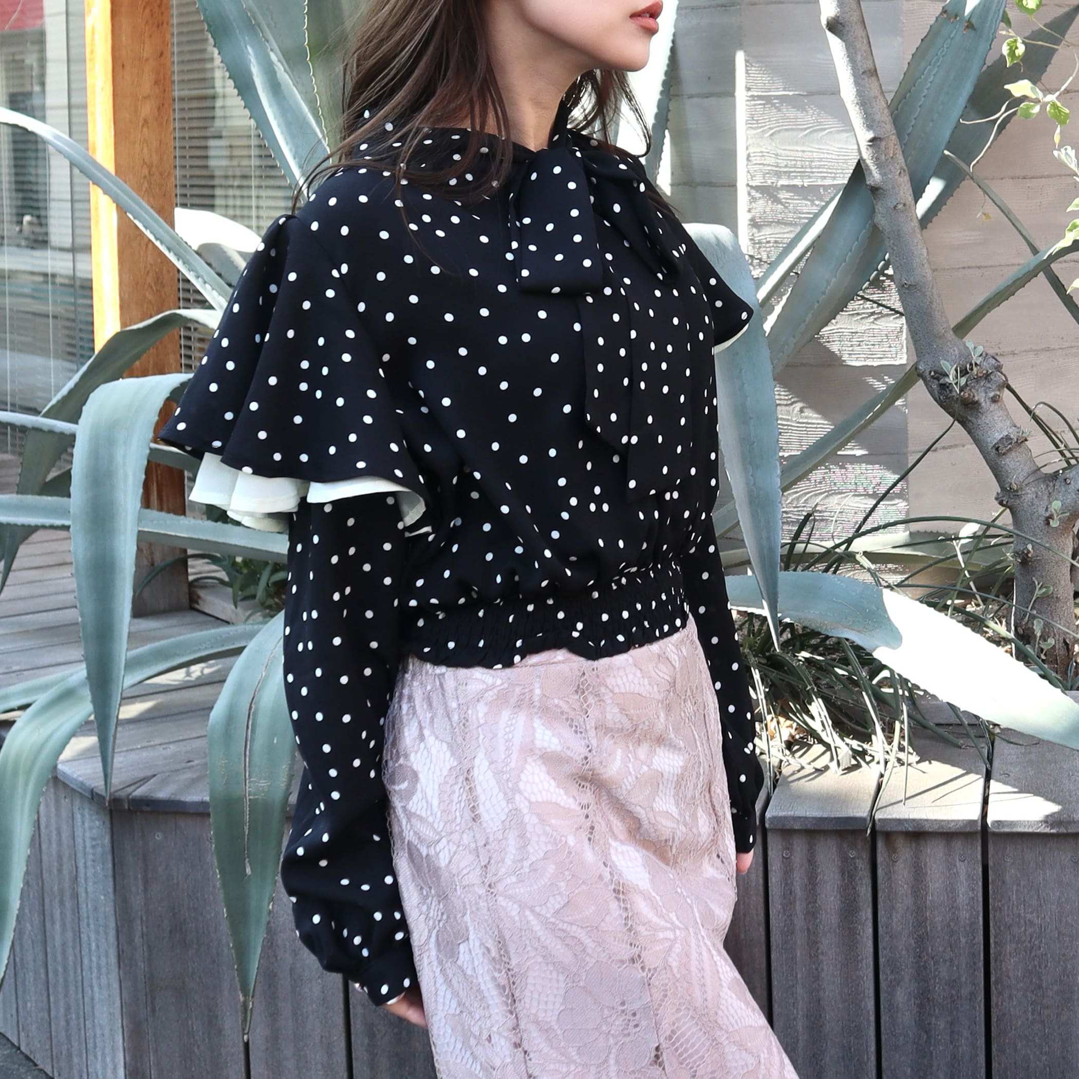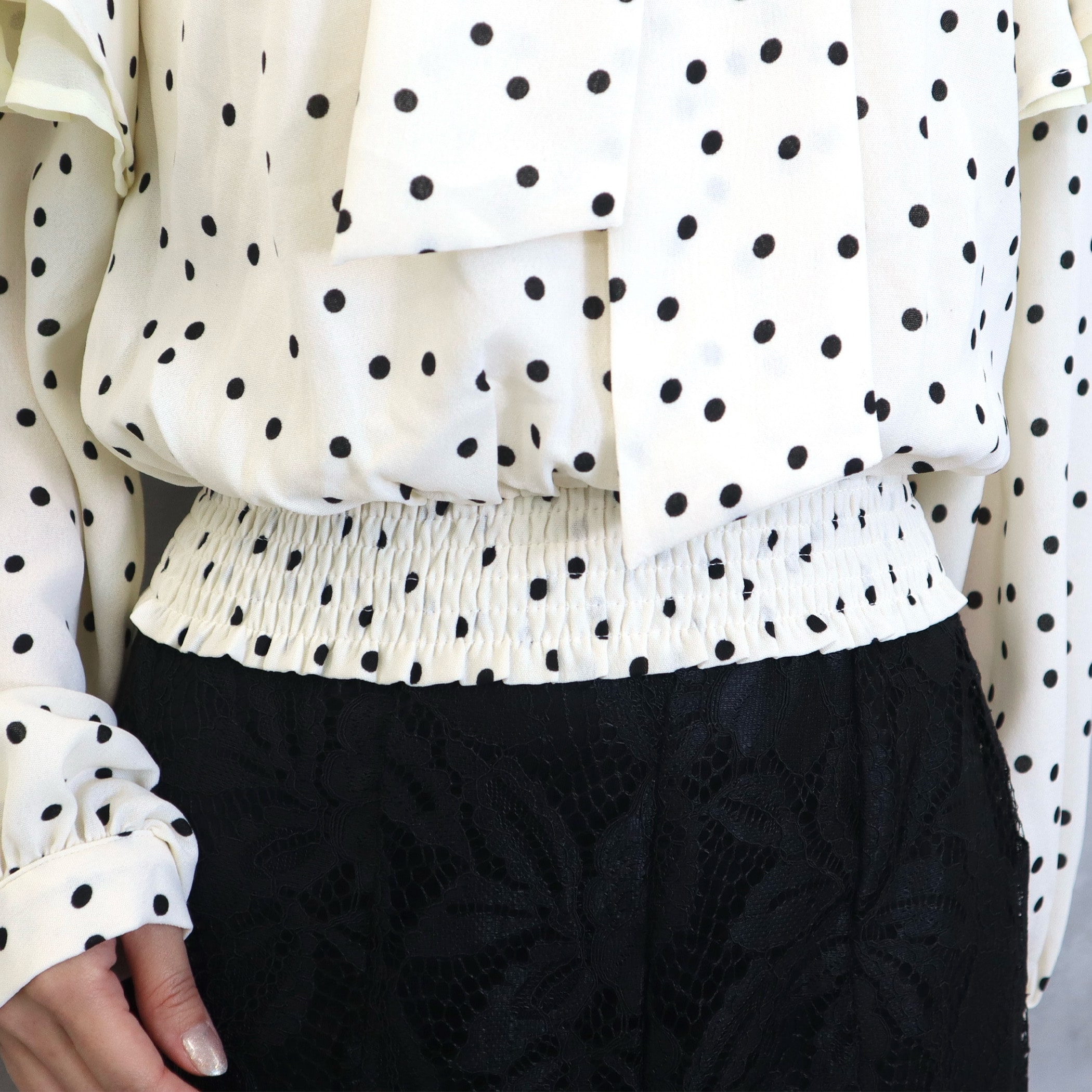 ドット柄棒タイ2枚フリルブラウス