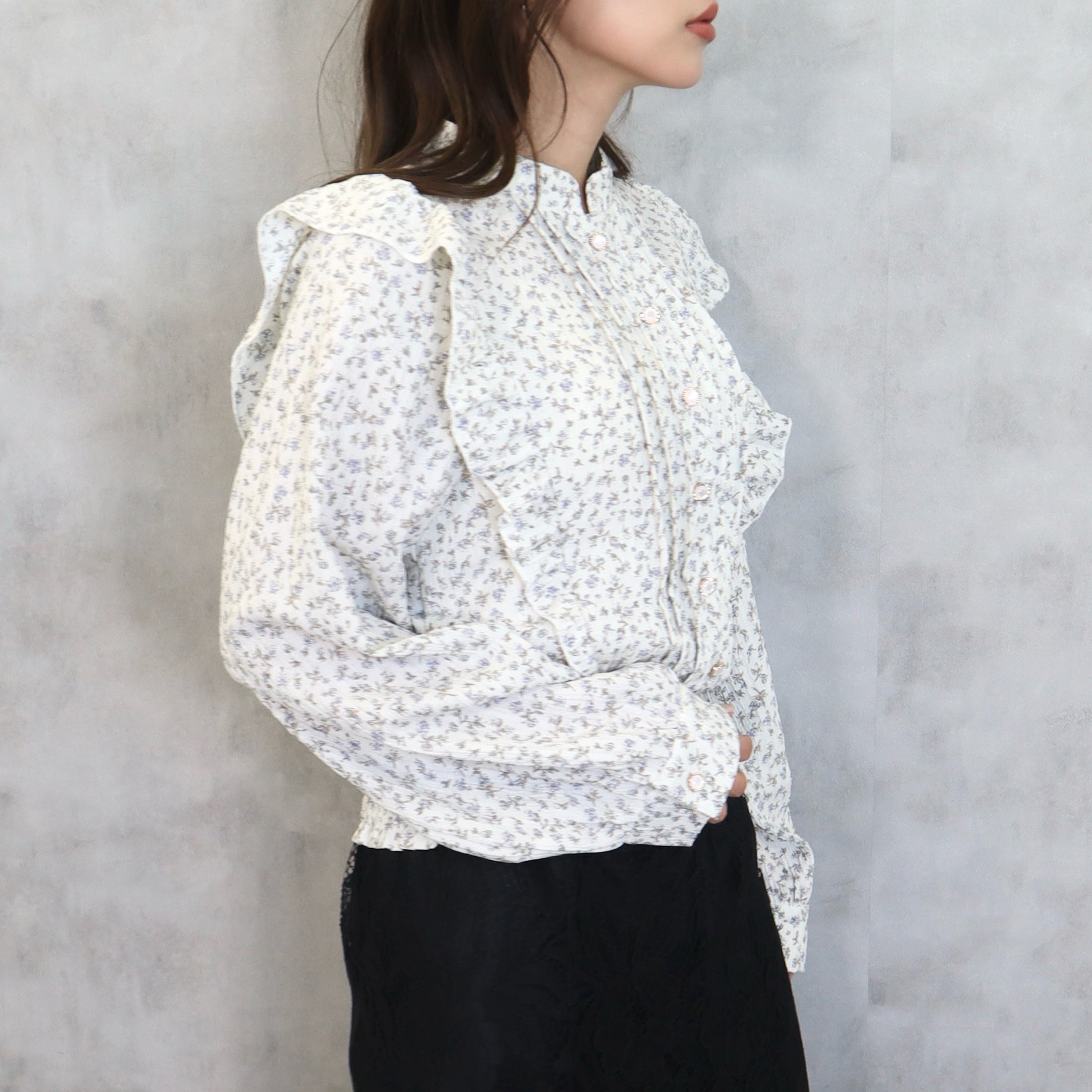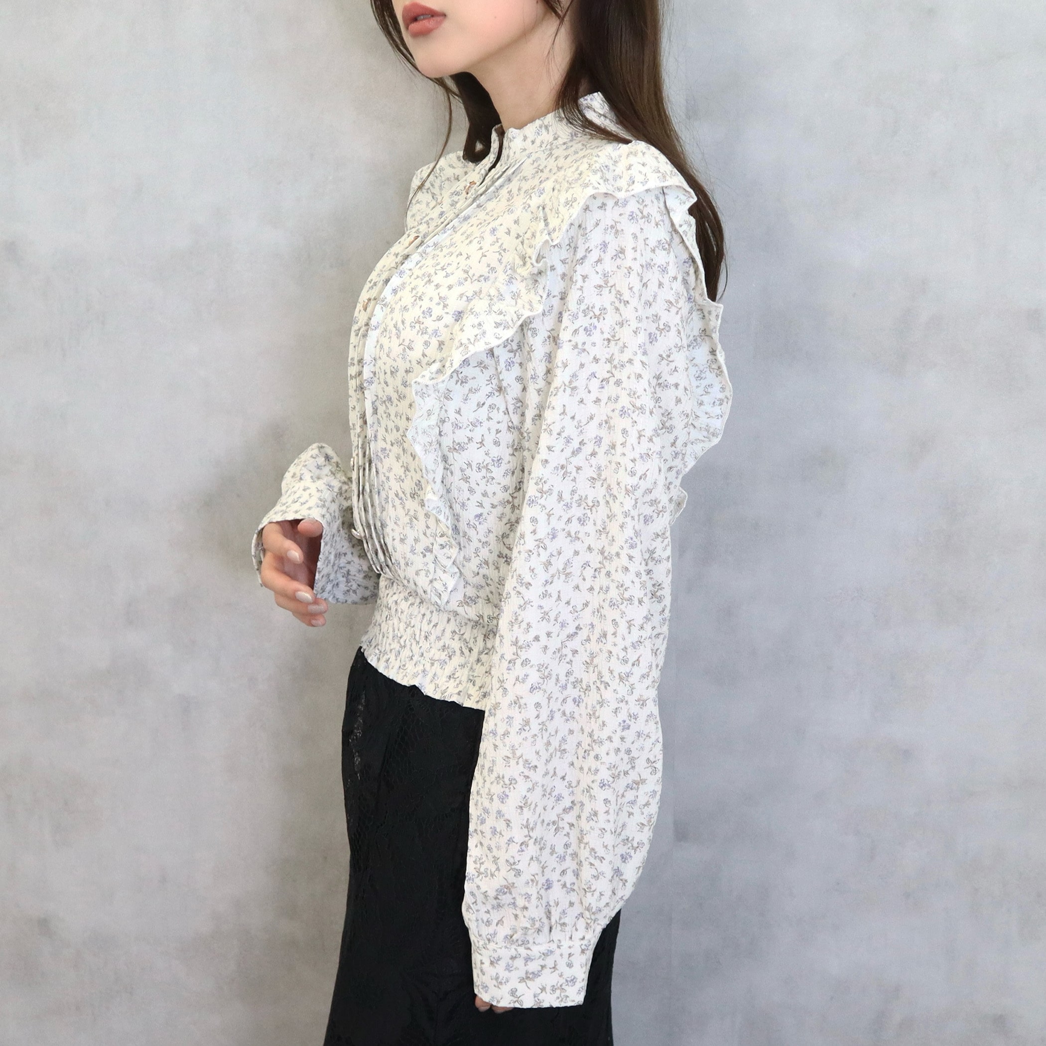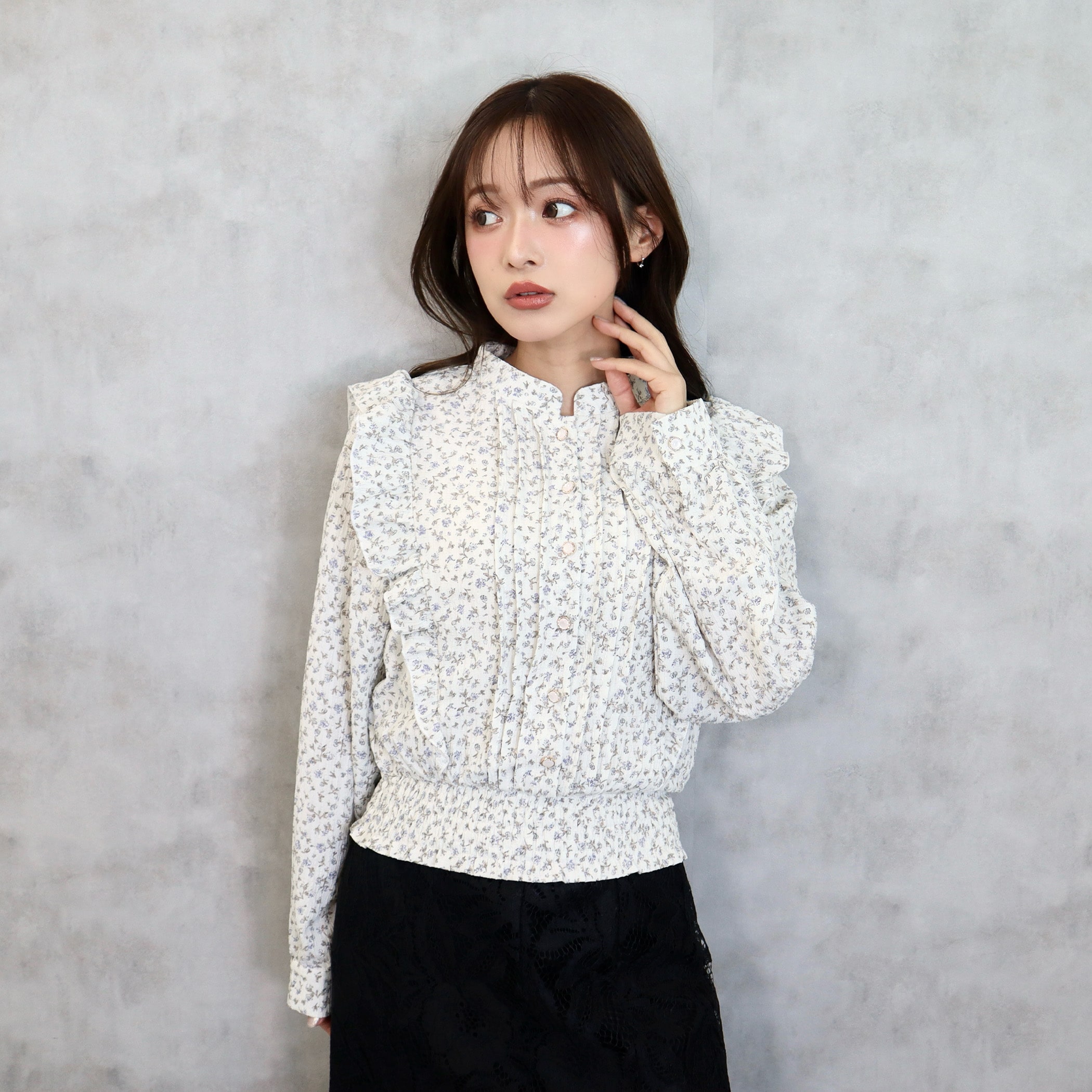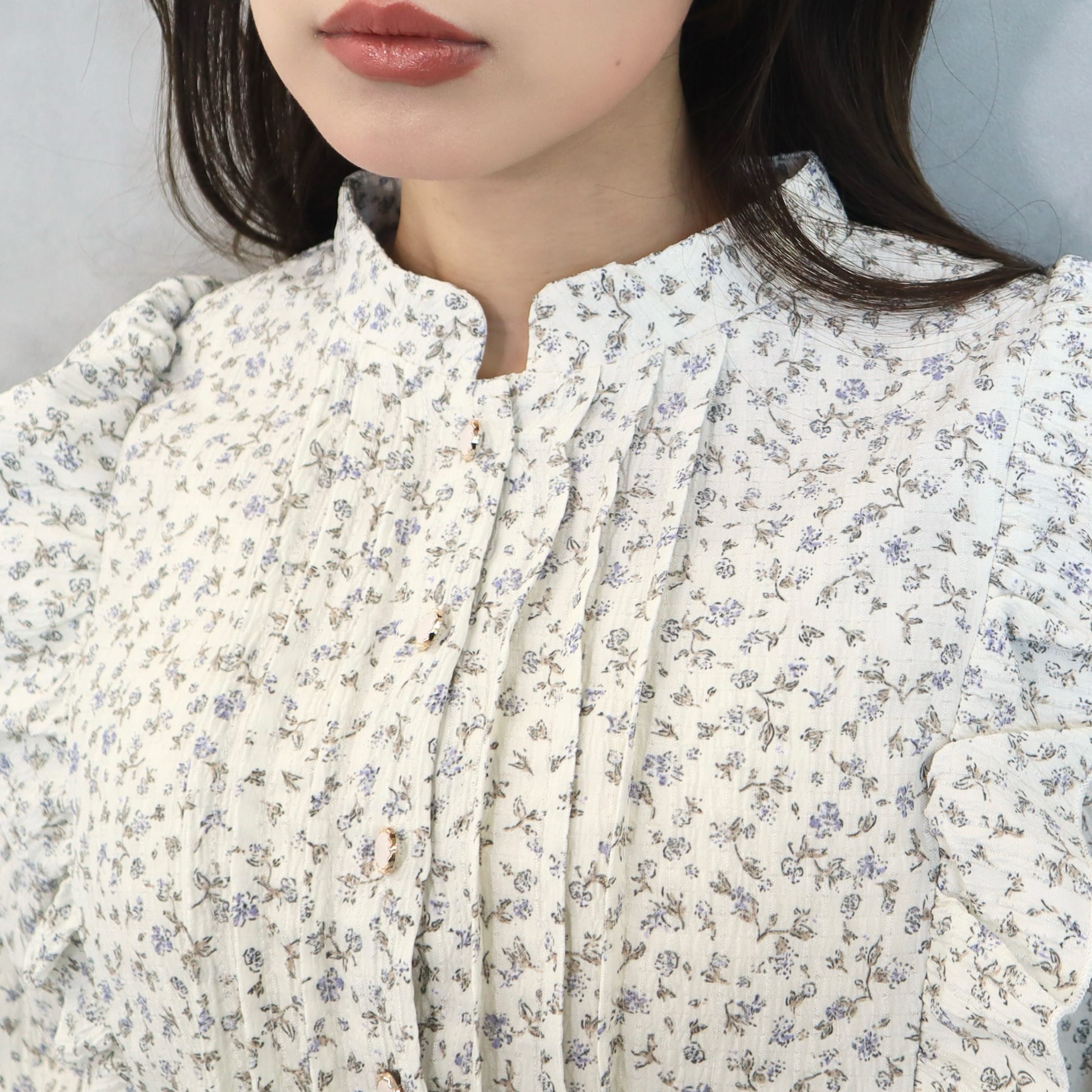 花柄が目を惹く、1枚で主役級のブラウス!フロントのピンタックとショルダーのフリルが華やかさをプラス。軽やかな素材を使用し、上品見えが叶います◎すっきりしたスタンドカラーがきれいめかつ大人なデザイン♪ボトムスはマーメイドスカートやフレアスカートとのコーデがおすすめ。デニムやパンツと合わせてきれいめカジュアルコーデに仕上げるのも◎ジャケットやカーディガンなどアウターを羽織ればロングシーズン活躍できます。デイリー使いはもちろん、オフィスやよそ行きなど特別な日にも♪