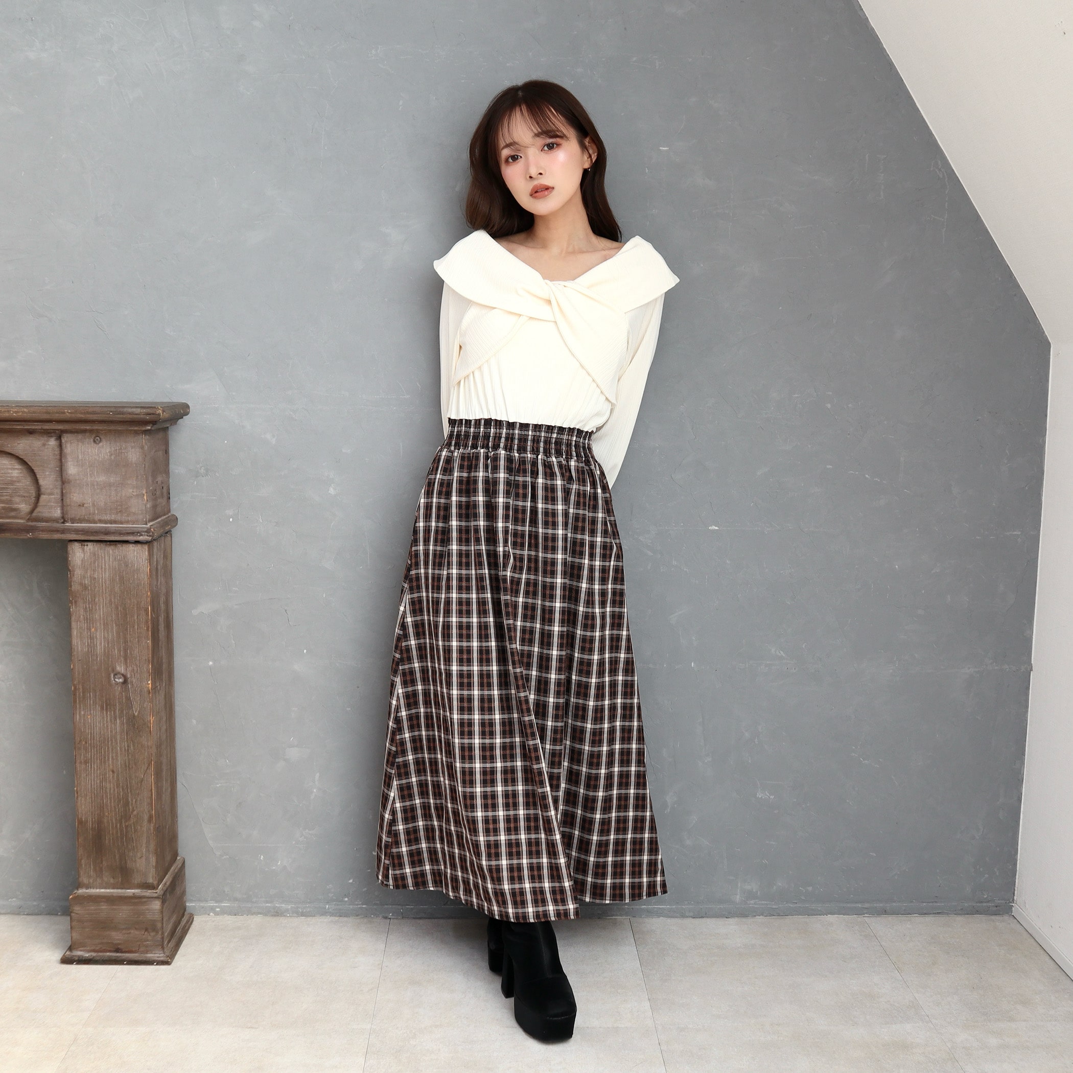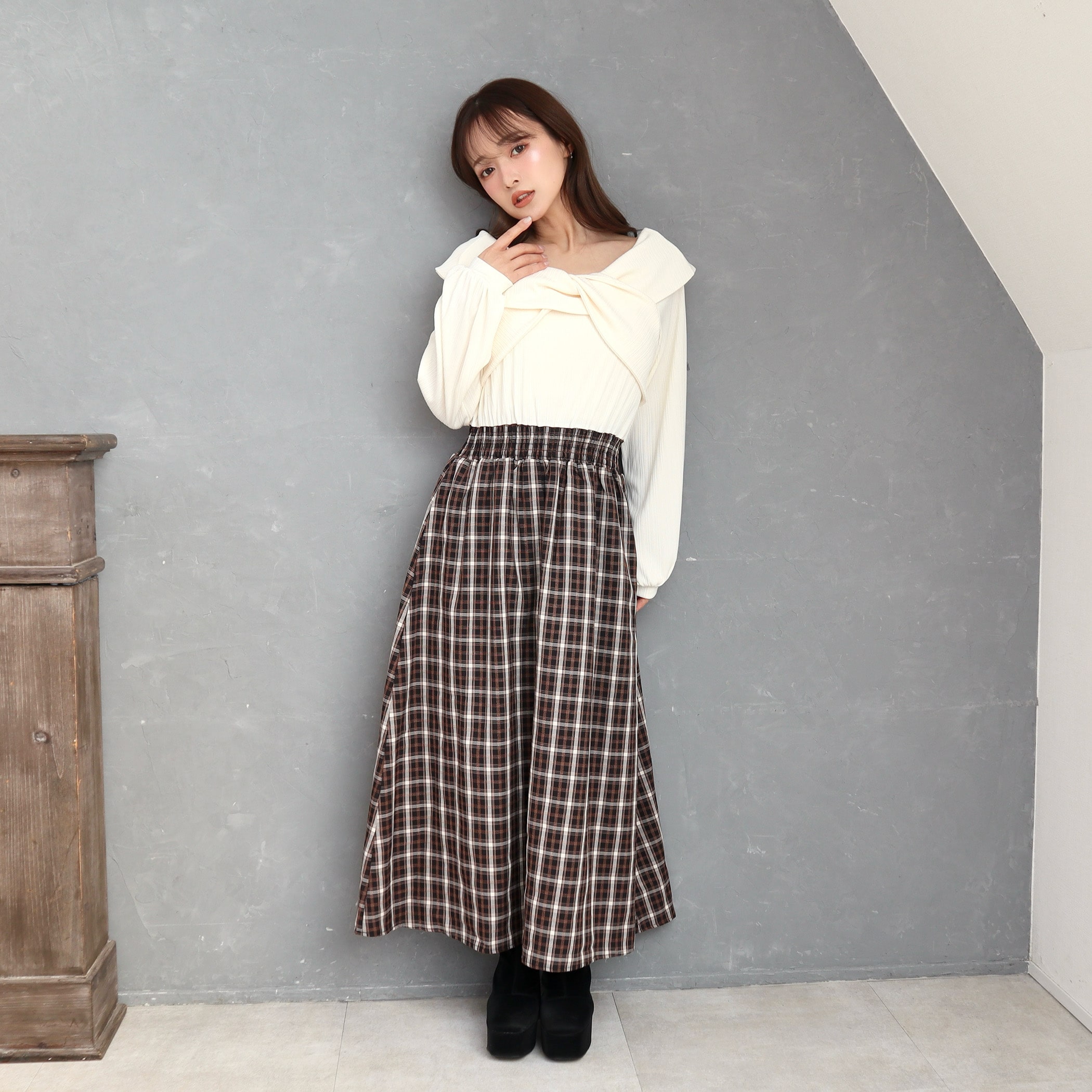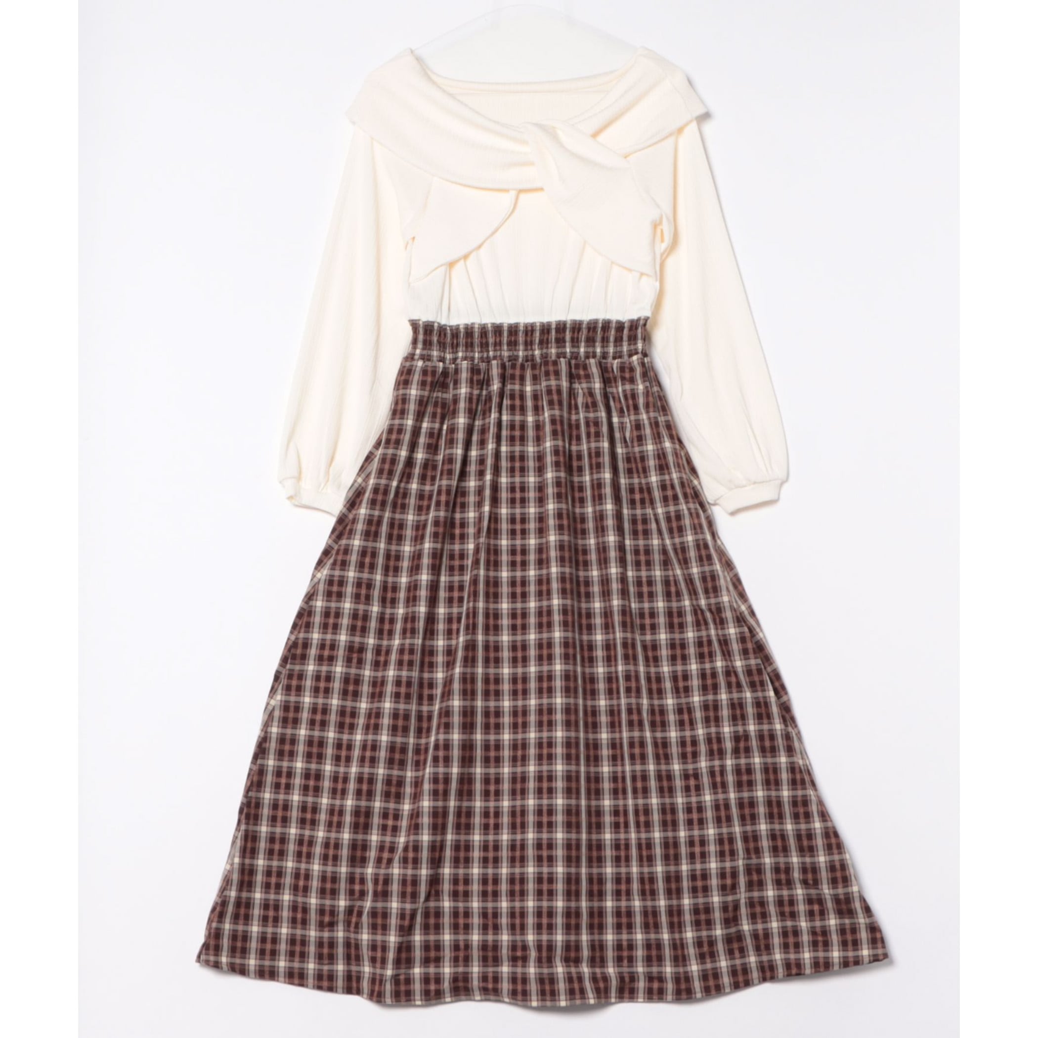 ネックラインををツイストさせたデザインでデコルテを綺麗に魅せてくれるワンピース。チェック柄の切替えが大人可愛く、ふんわりシルエットのスカートで体系もカバーしてくれます◎