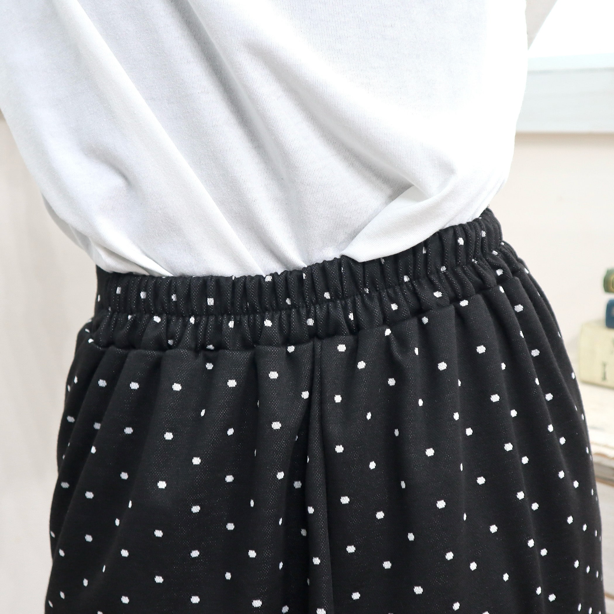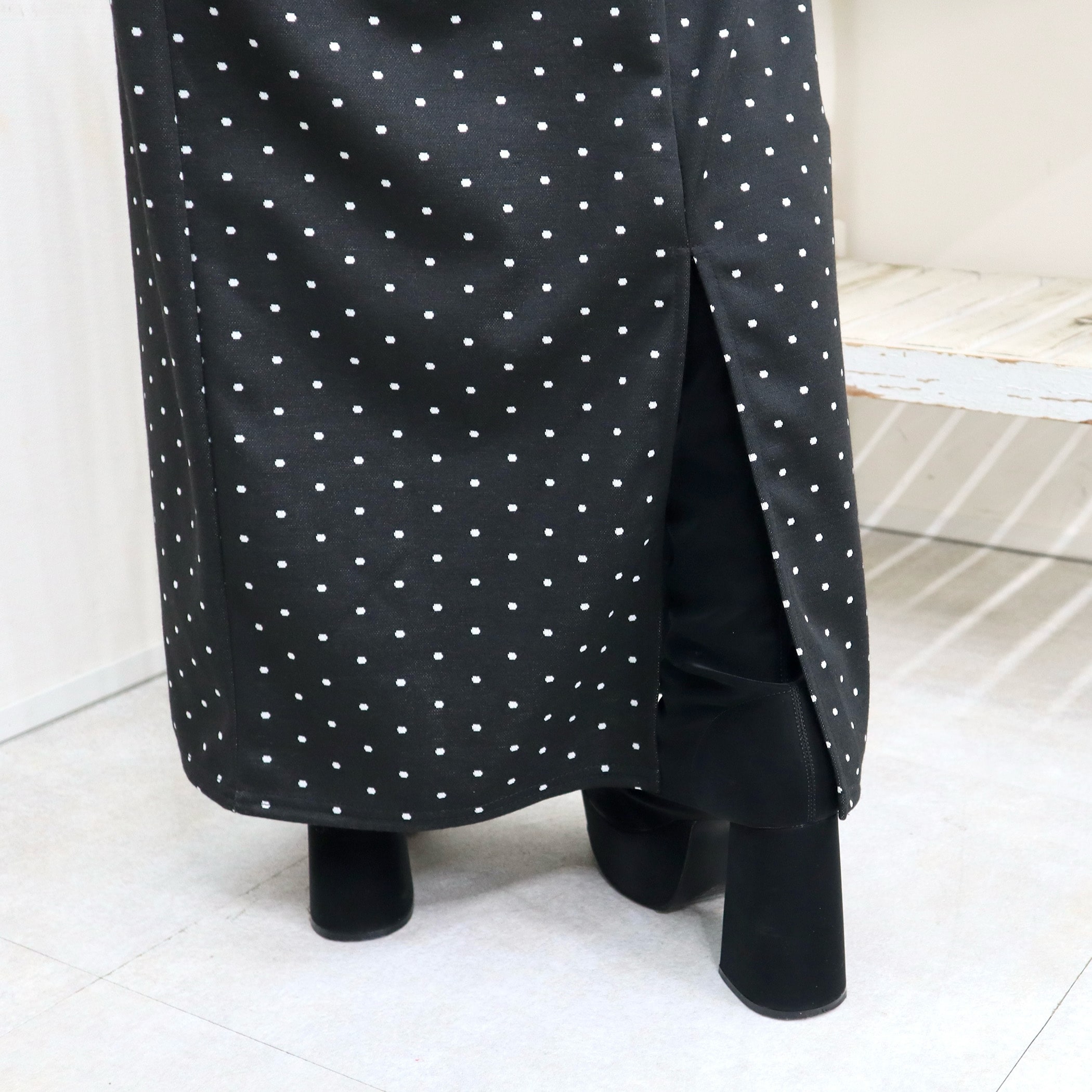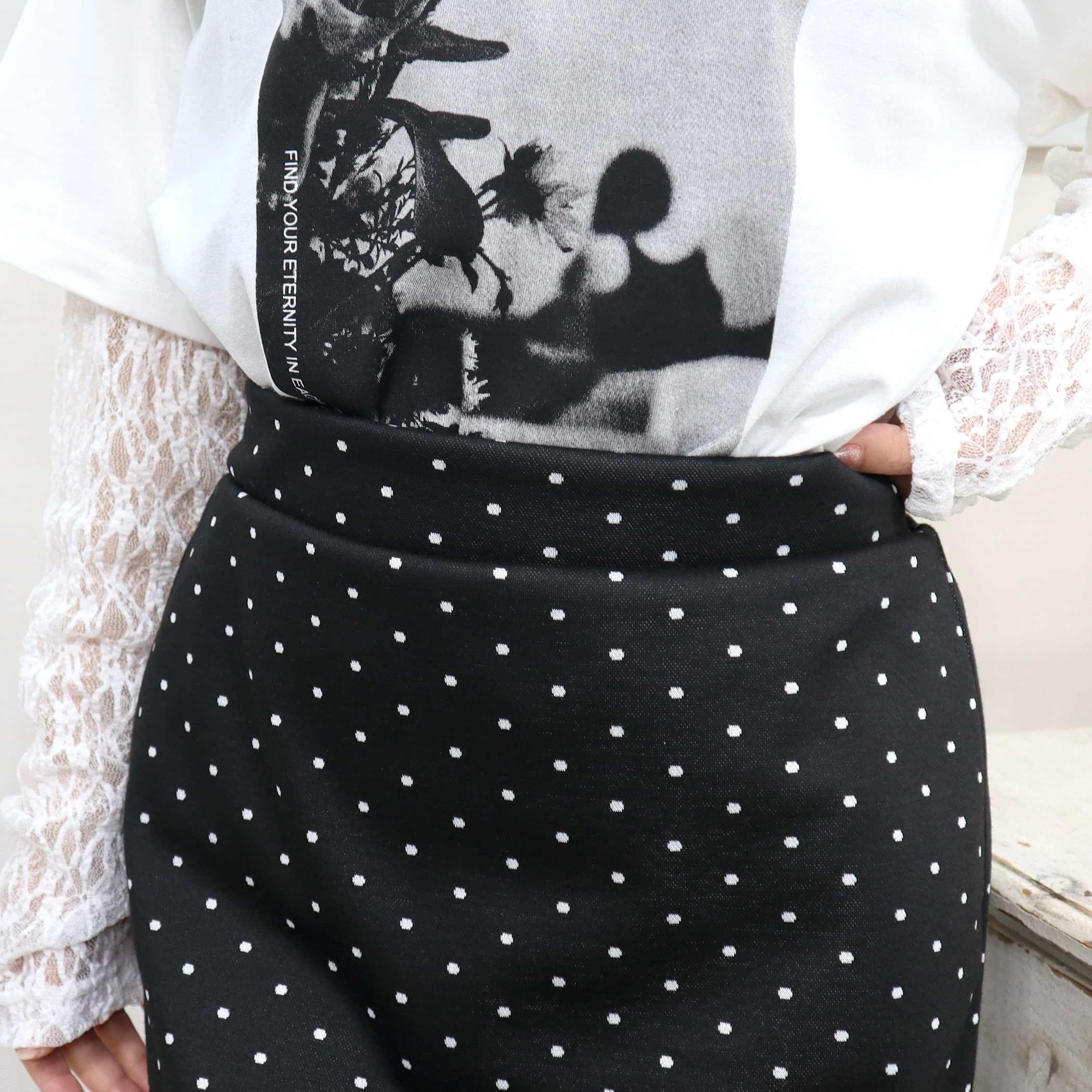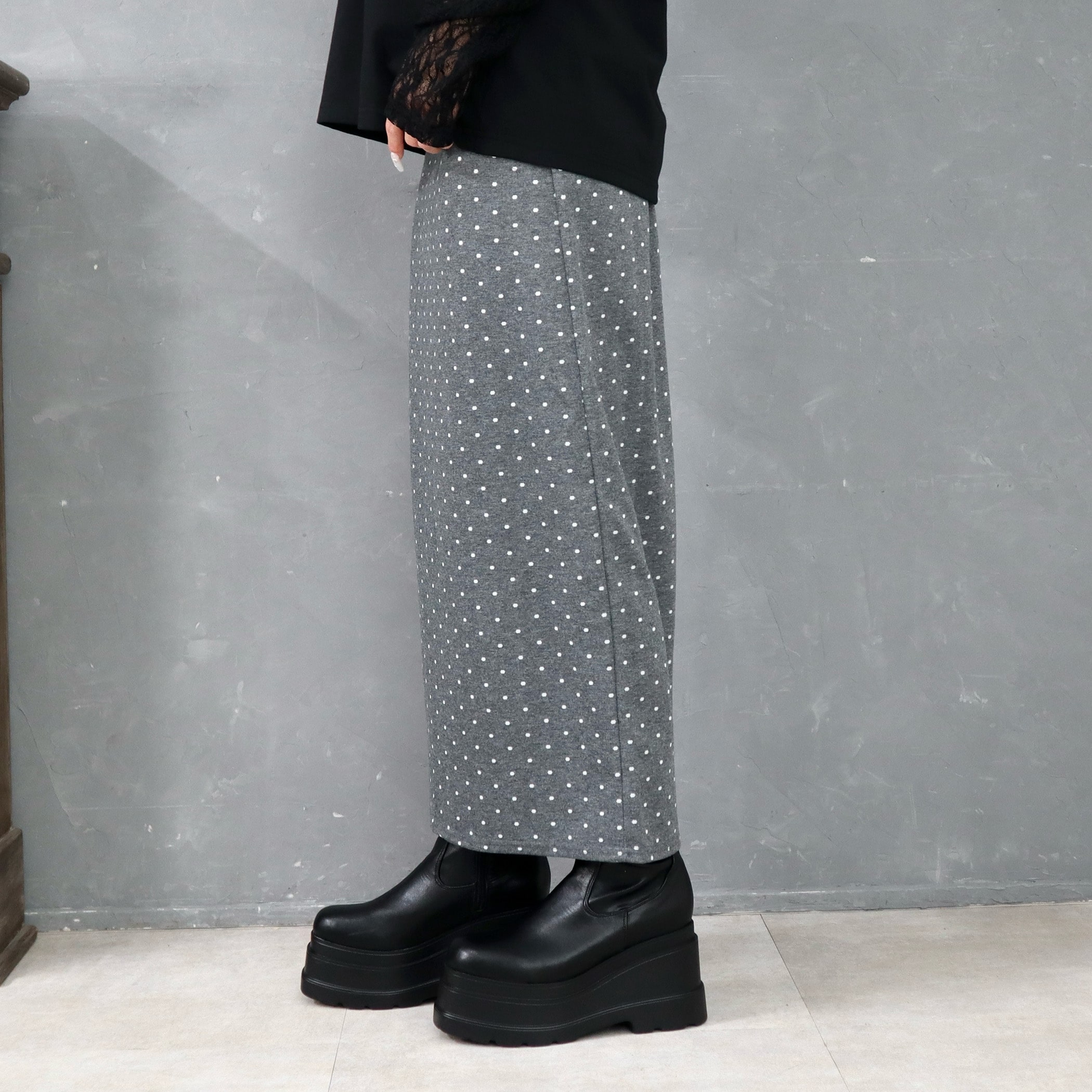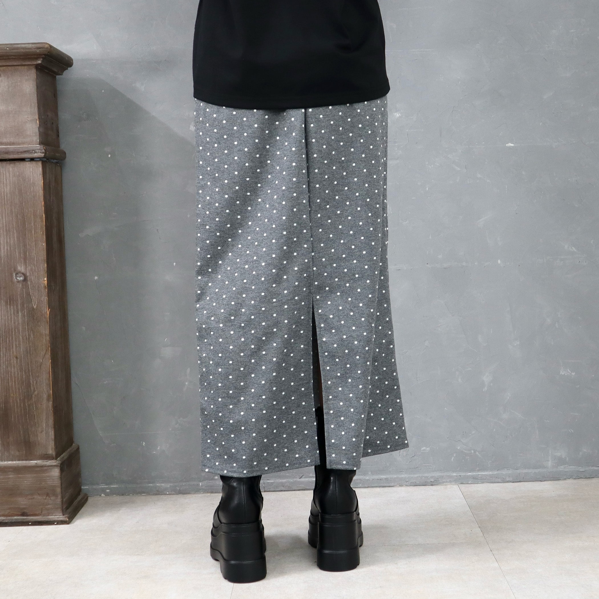 さりげないドット柄がコーデに可愛らしさをプラスするナロースカート。すっきりとしたIラインシルエットで、縦ラインを強調し細見え効果を演出します。伸びの良い素材感とウエストゴム仕様で、ストレスフリーな穿き心地。きれいめにもカジュアルにも合わせやすく、デイリーに活躍する一枚です。