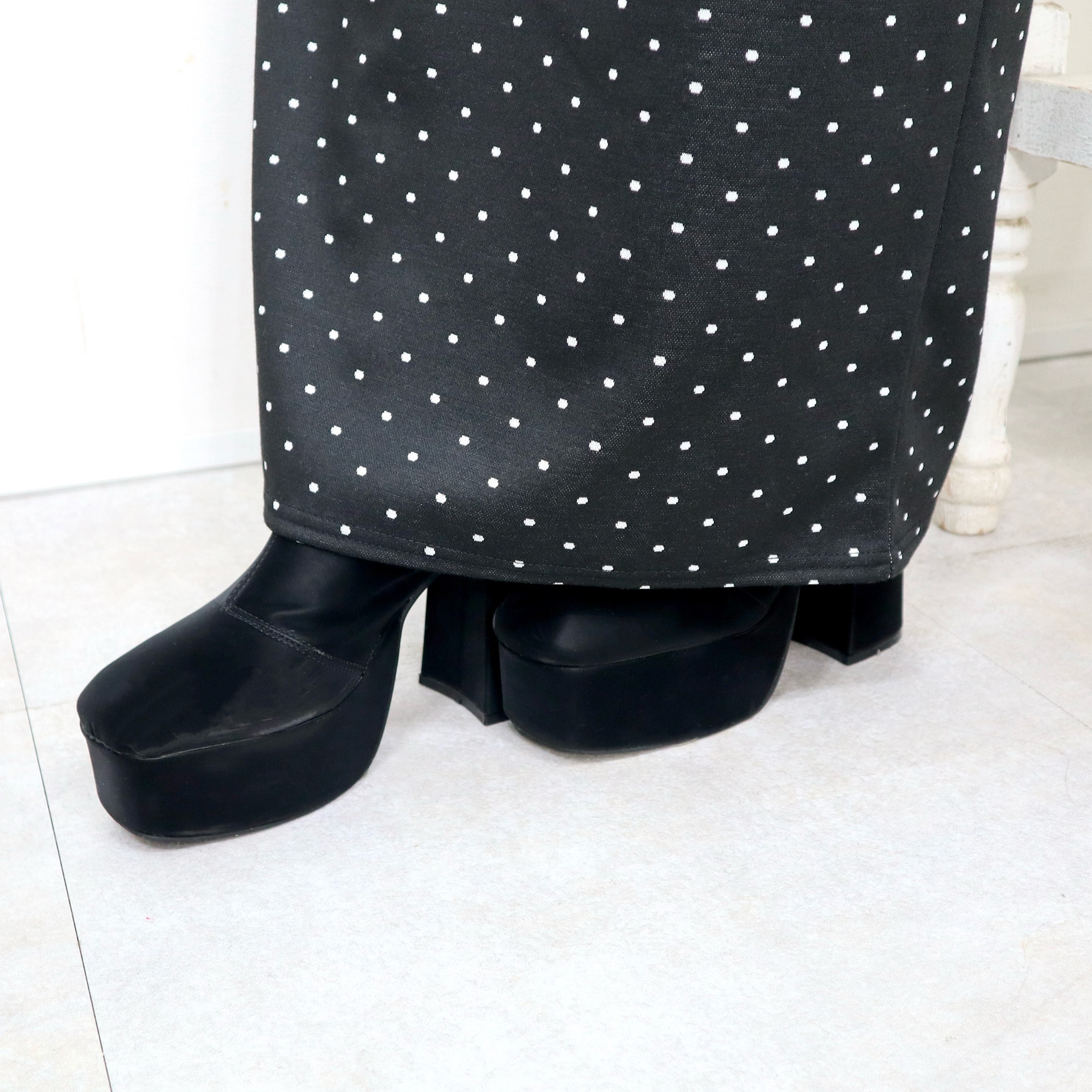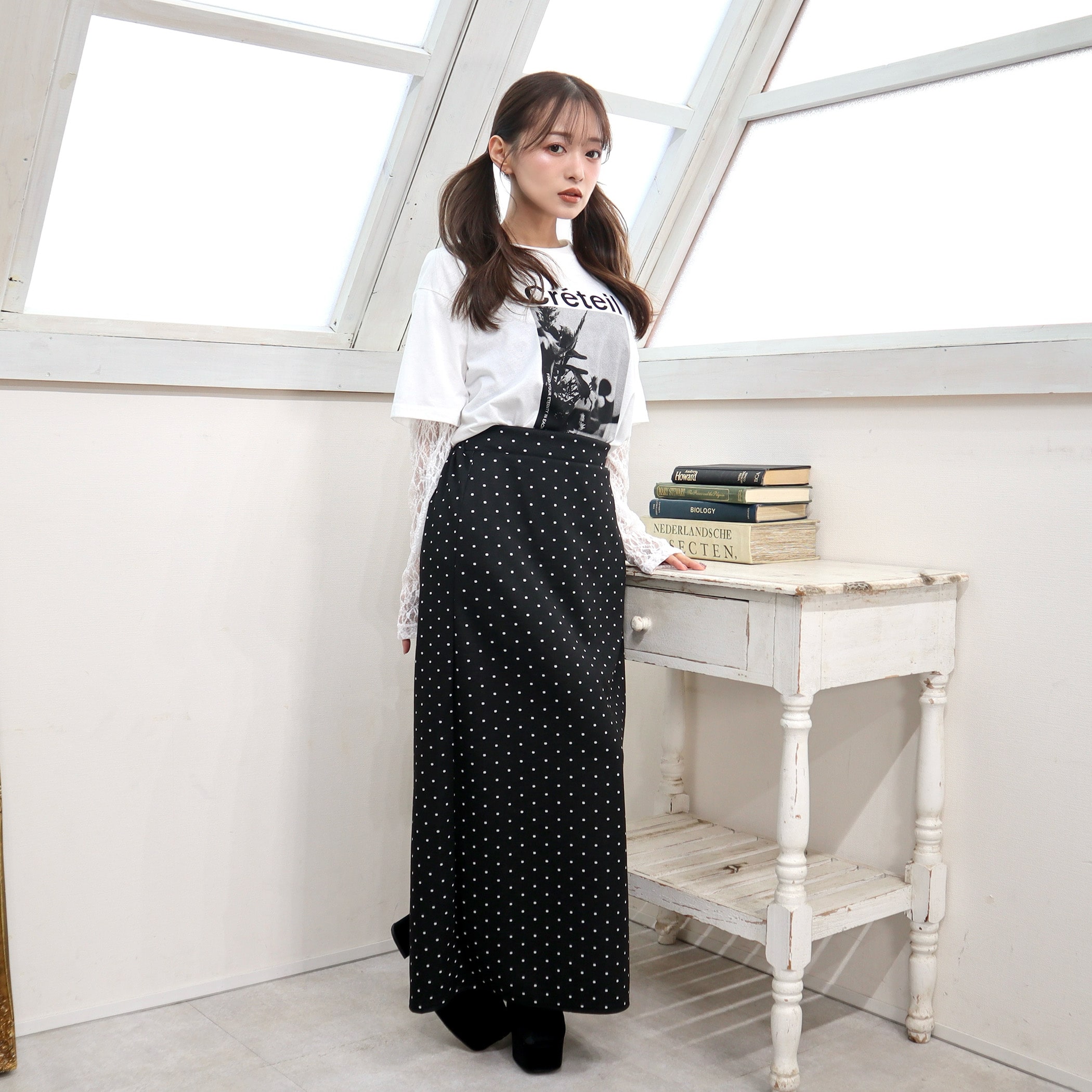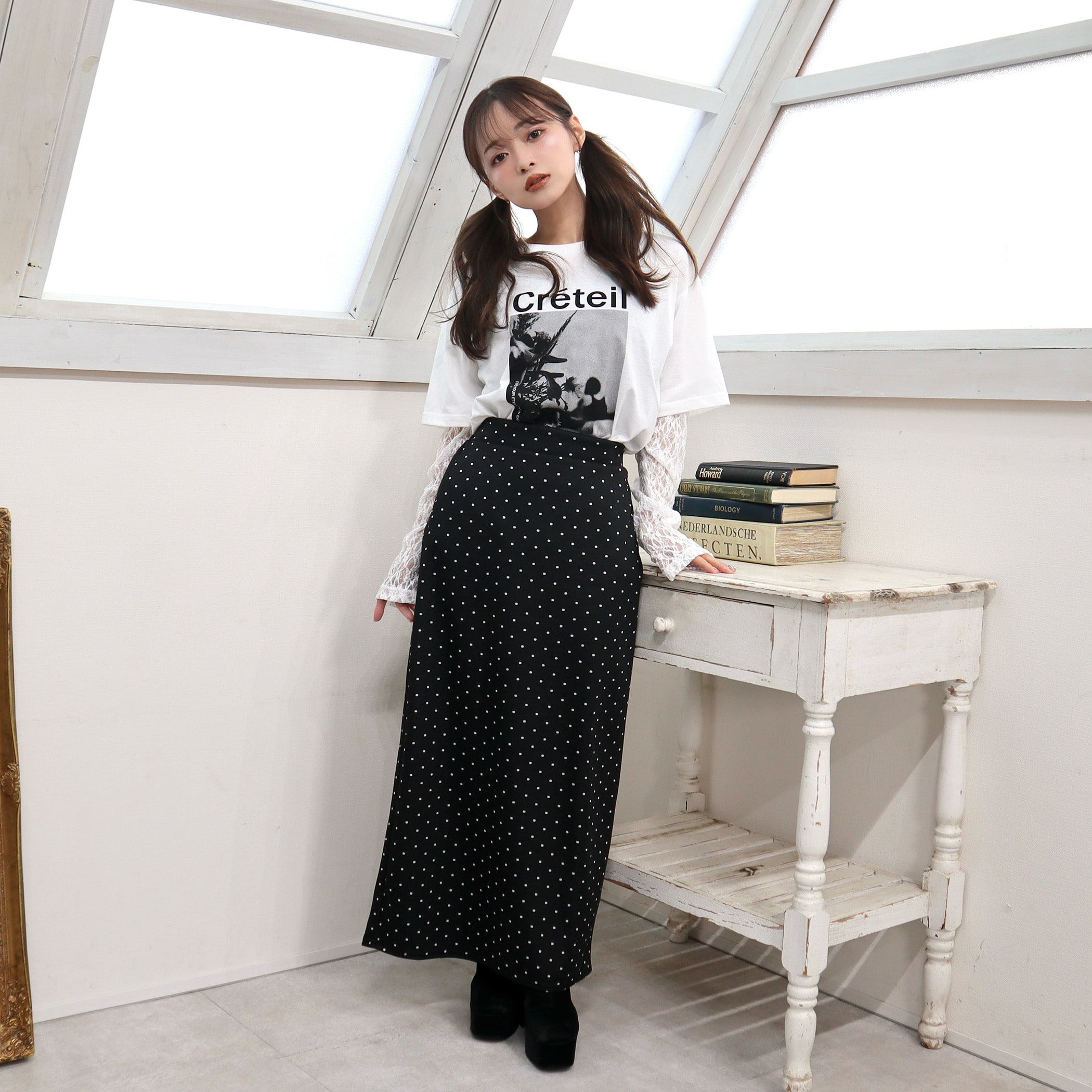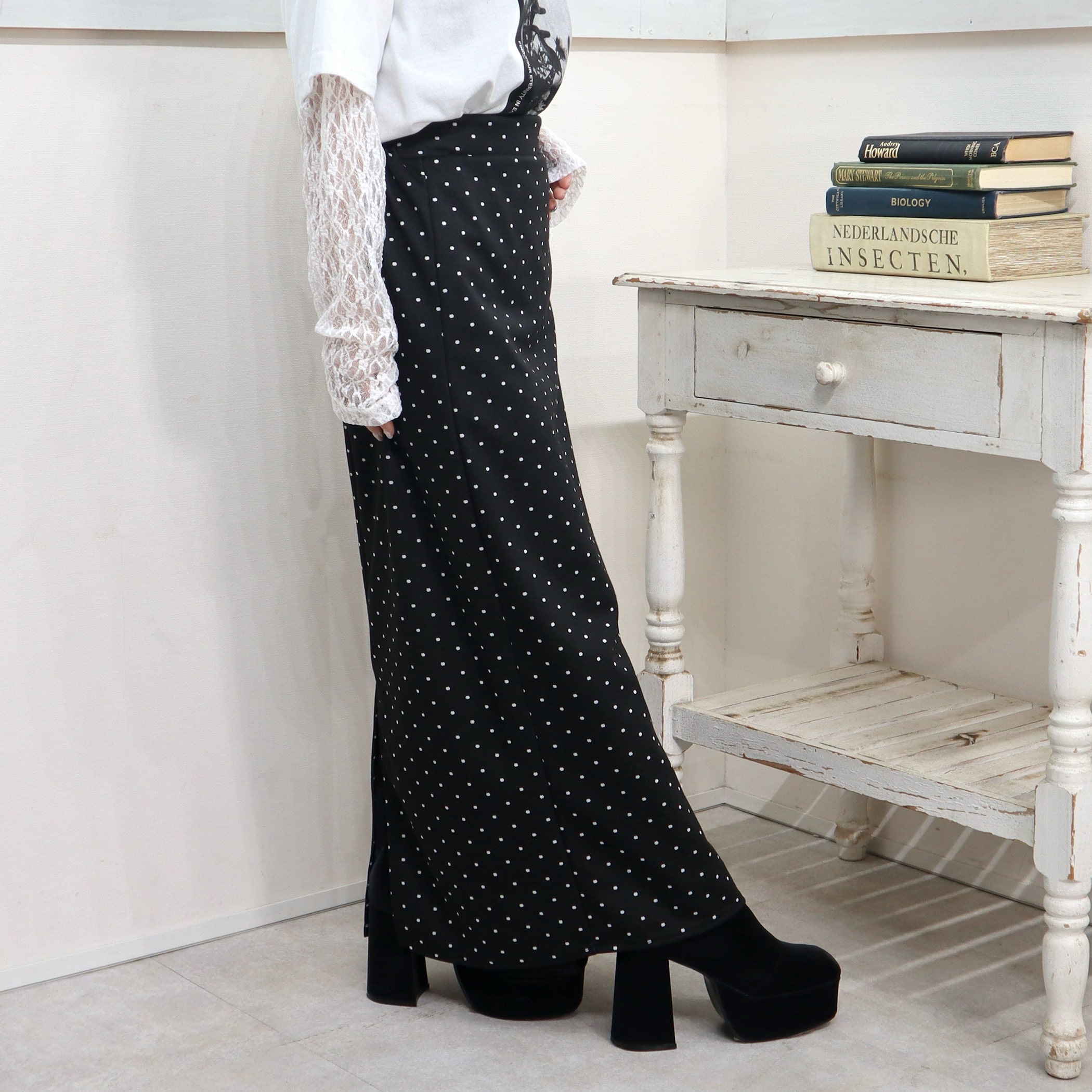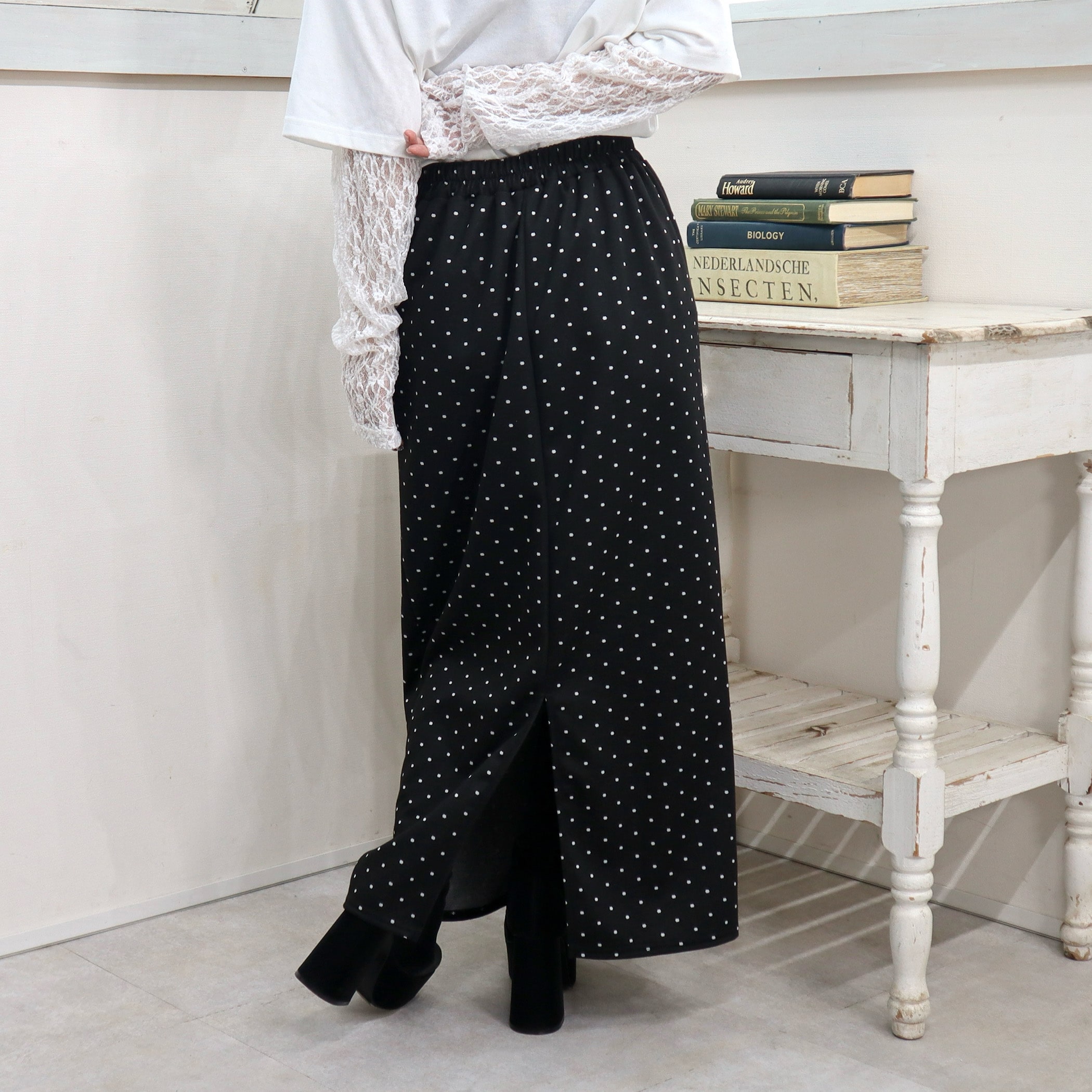 さりげないドット柄がコーデに可愛らしさをプラスするナロースカート。すっきりとしたIラインシルエットで、縦ラインを強調し細見え効果を演出します。伸びの良い素材感とウエストゴム仕様で、ストレスフリーな穿き心地。きれいめにもカジュアルにも合わせやすく、デイリーに活躍する一枚です。