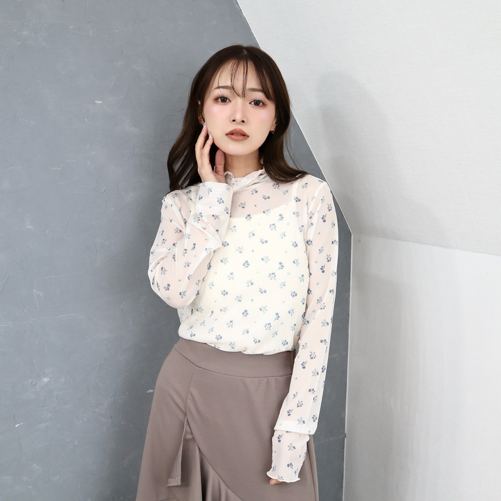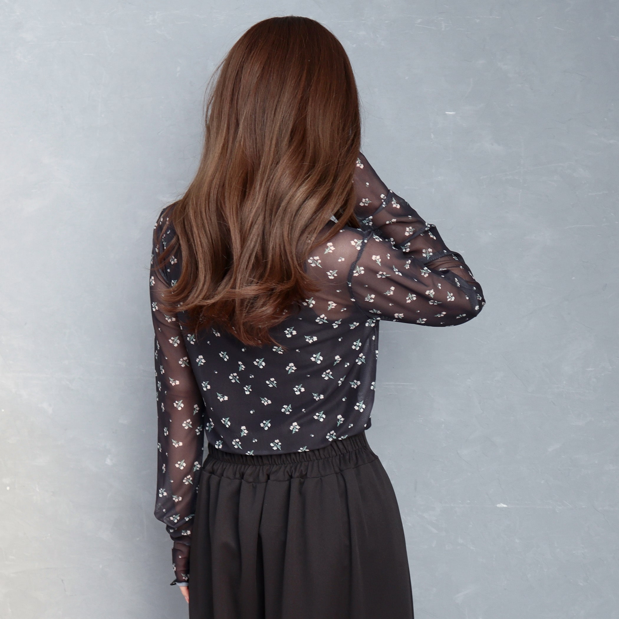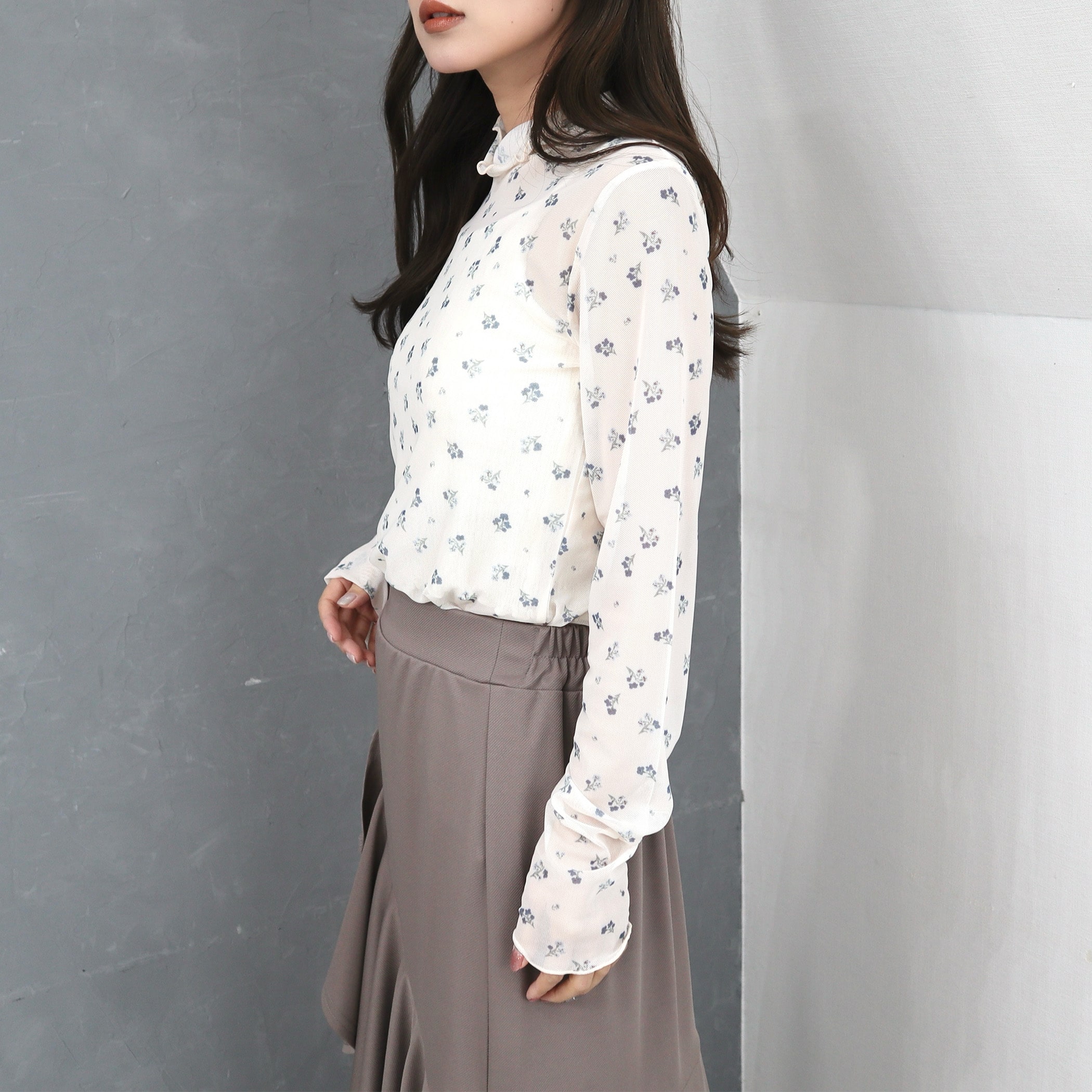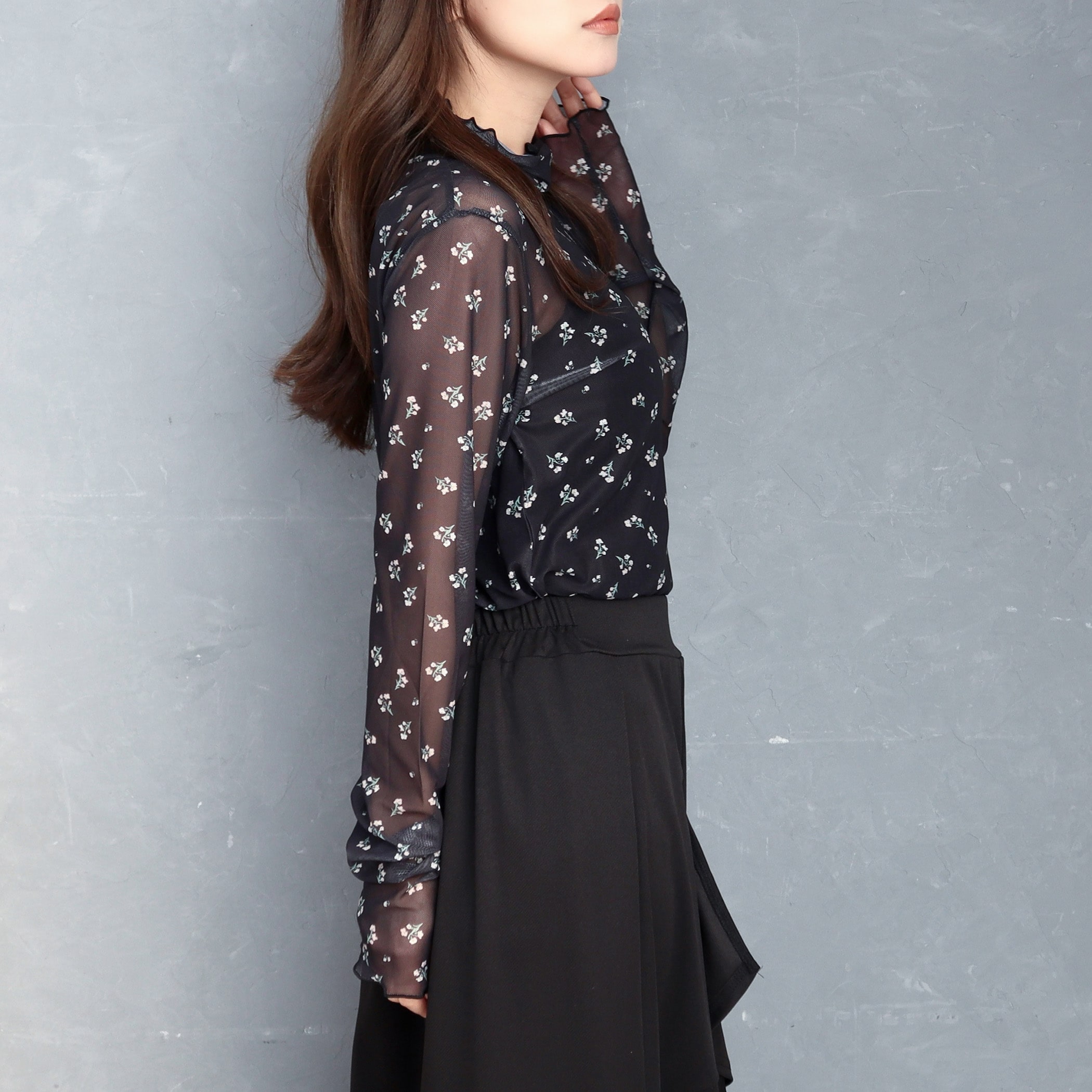 小花柄がガーリーでオシャレなメロウトップス。トップスとしてはもちろん、ワンピースやベストなどと合わせてトレンドのレイヤードスタイルも楽しめるアイテムです。薄手の生地ですが上品な透け感なので肌見せが苦手な方にもおすすめです。