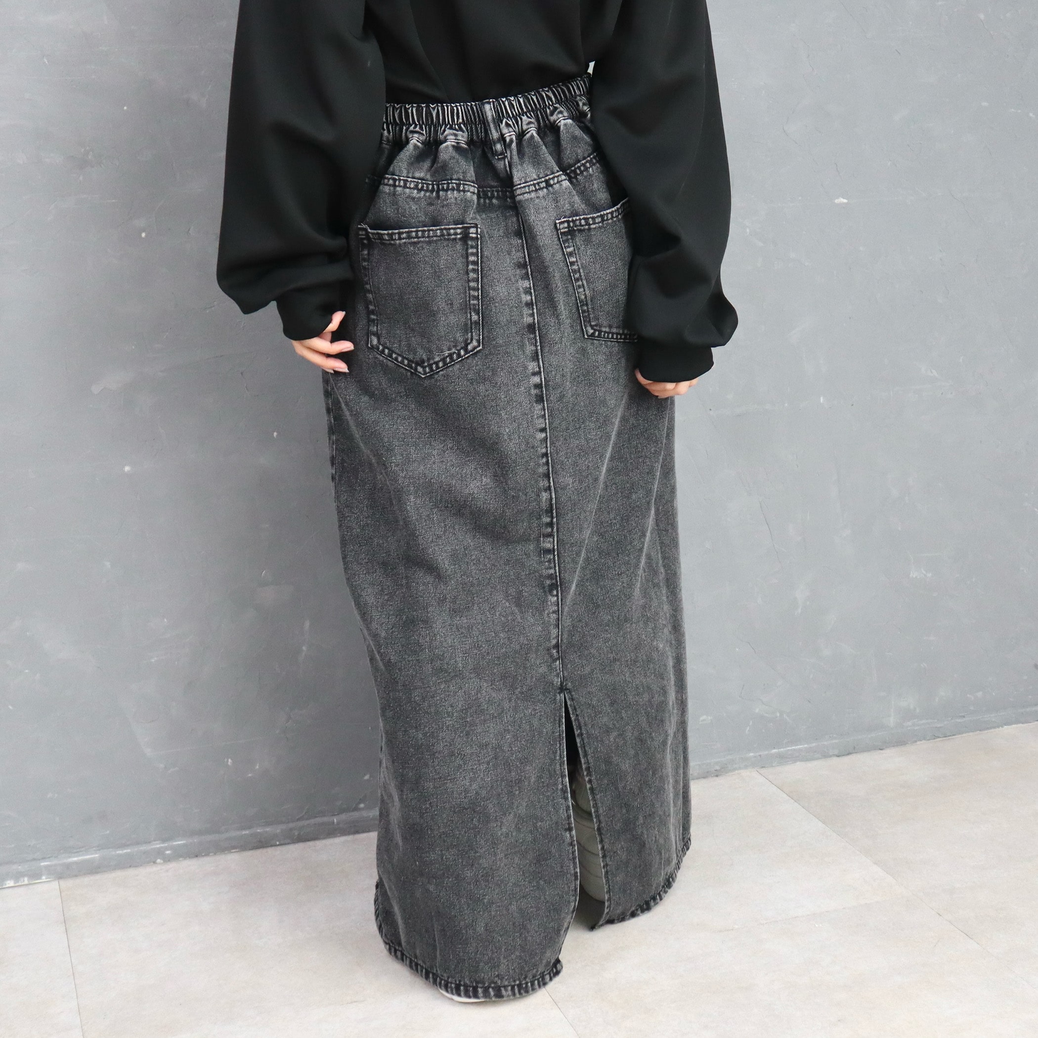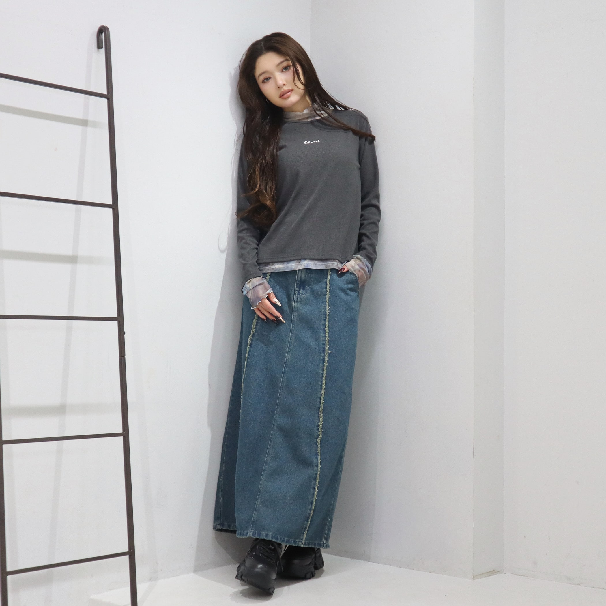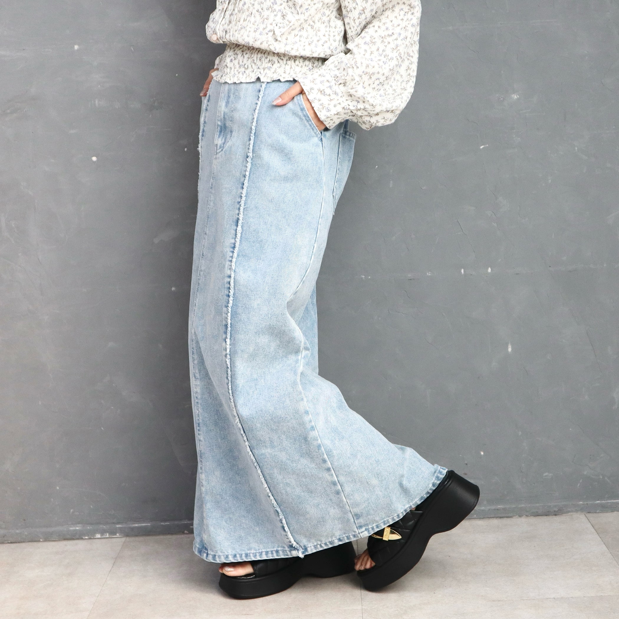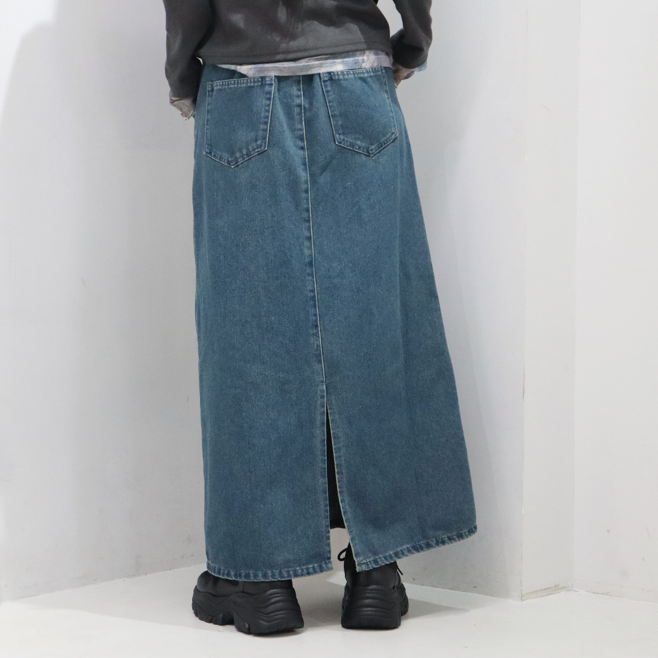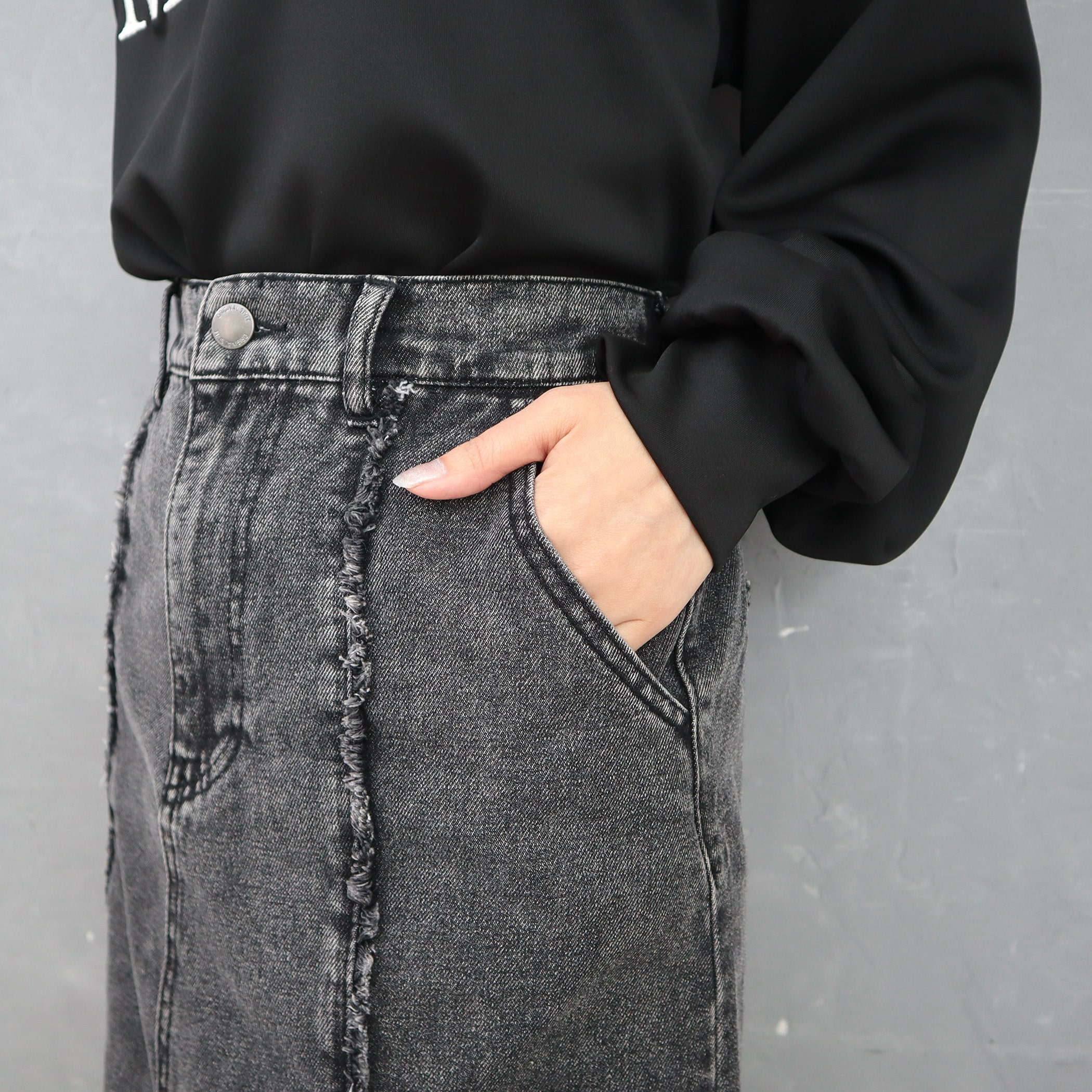 9.5ozデニムフロントフリンジロングスカート