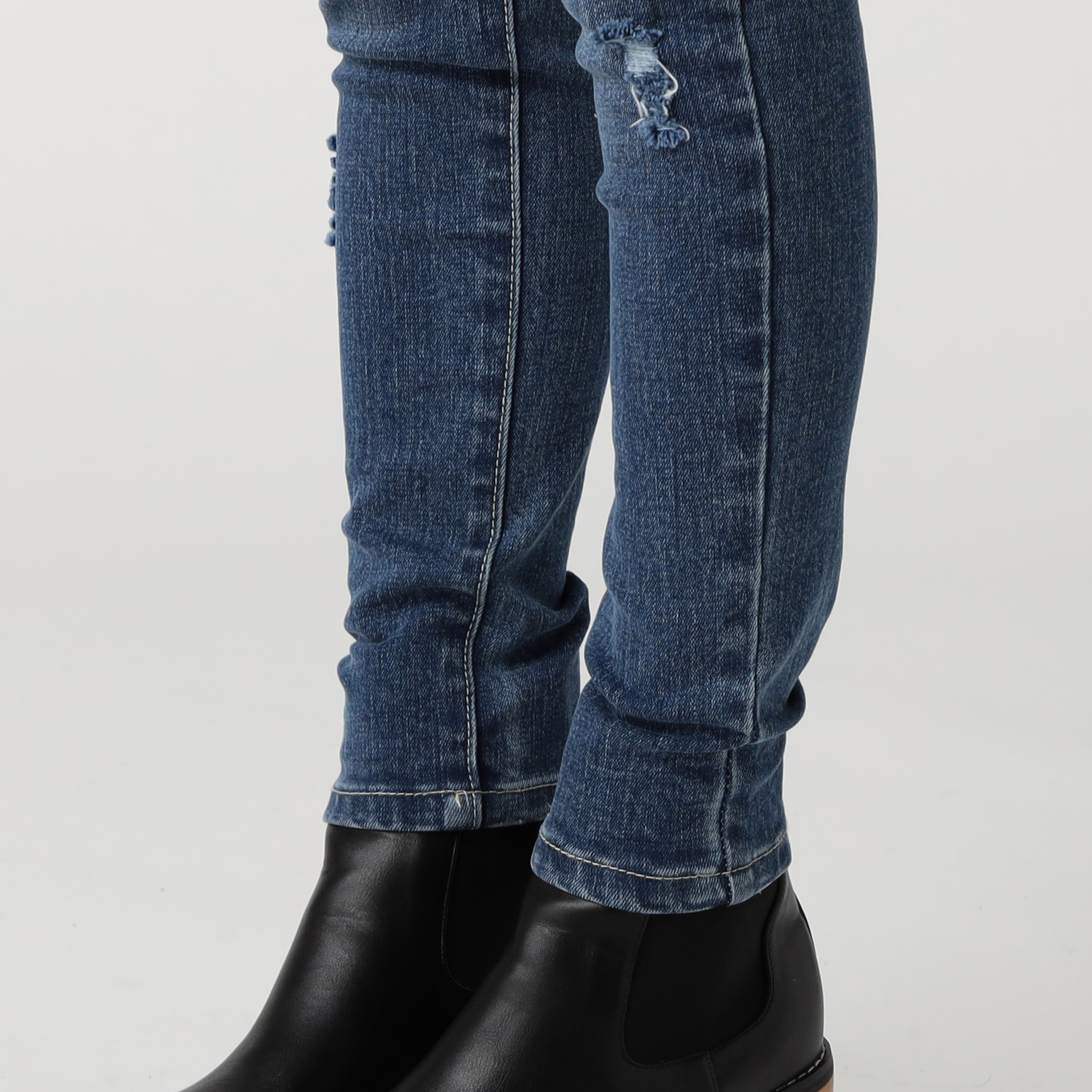クラッシュディテールを随所に施した、ヴィンテージテイストのスキニーフィットジーンズです。脚のラインがすらっと見えて、トレンドのビッグトップスや秋冬らしいボリュームブーツとベストバランスを構成。トレンドに左右されることなく、長く活躍します。