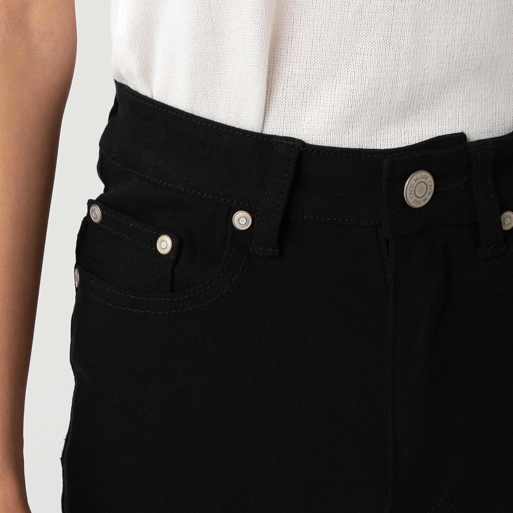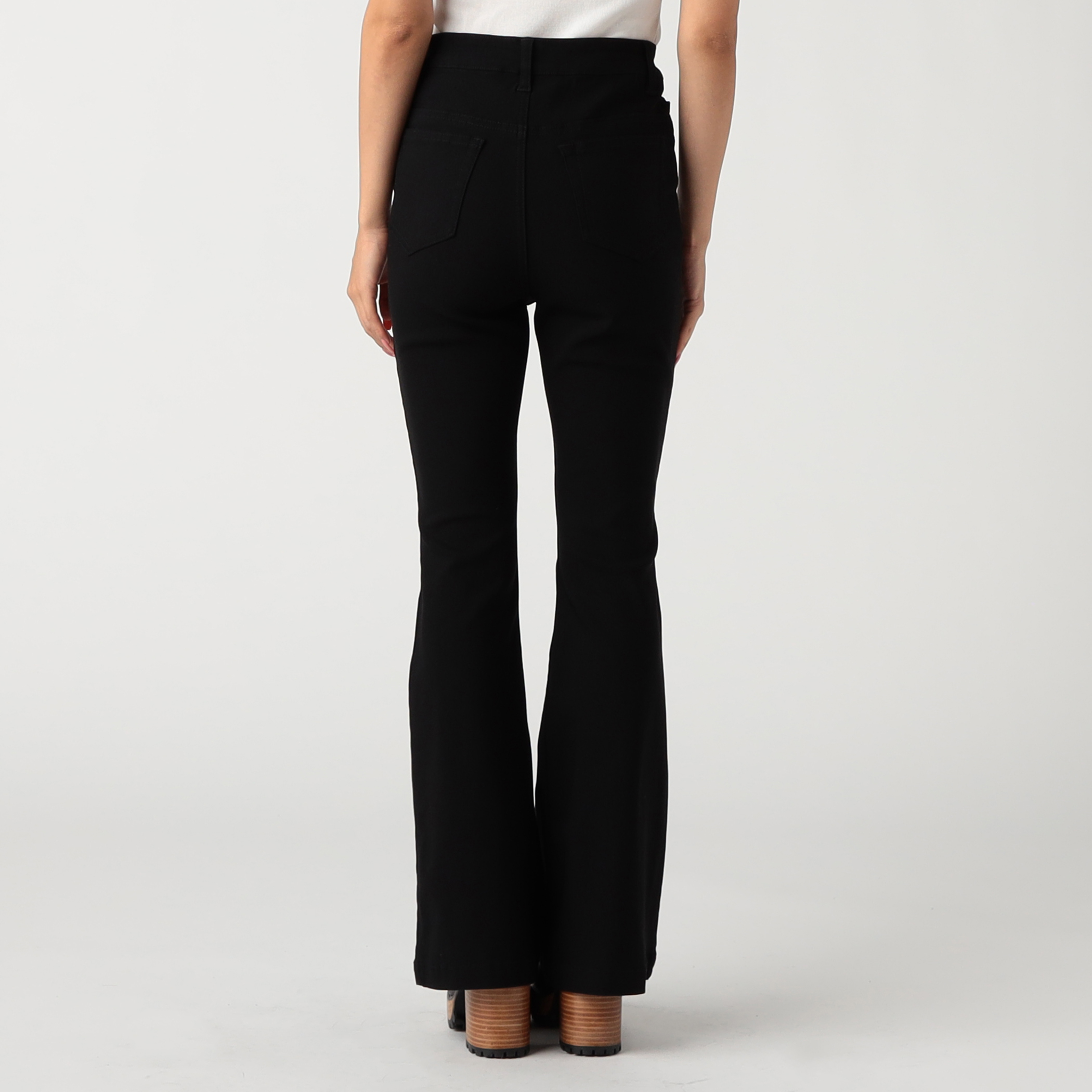 股上深めで仕上げた、カジュアルな5ポケットタイプのフレアパンツです。スーパーストレッチ素材を使用していて、動きやすく快適な穿き心地。膝まですっきりとフィットし、膝下から広がるメリハリシルエットで、脚のラインが綺麗に引き立ちます。