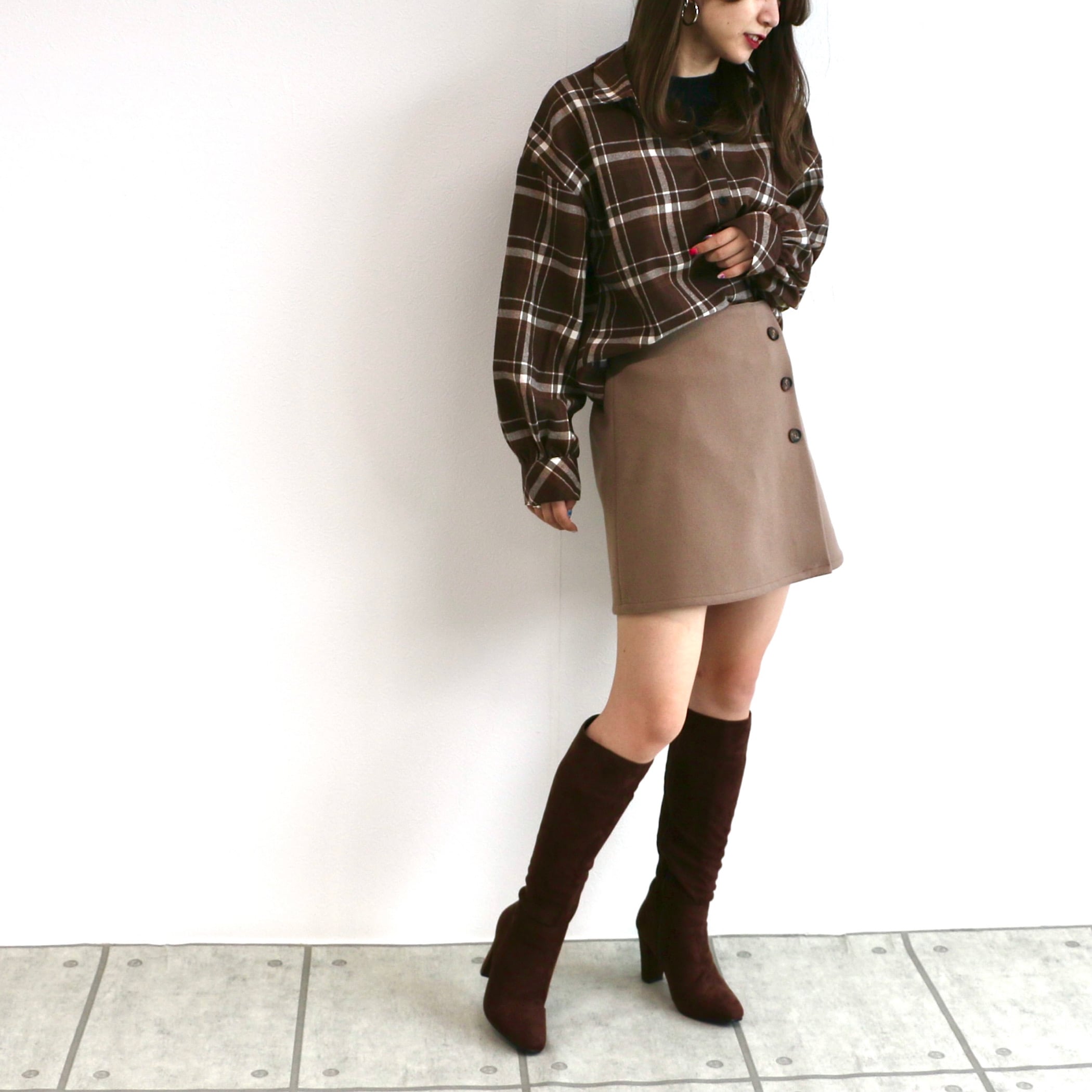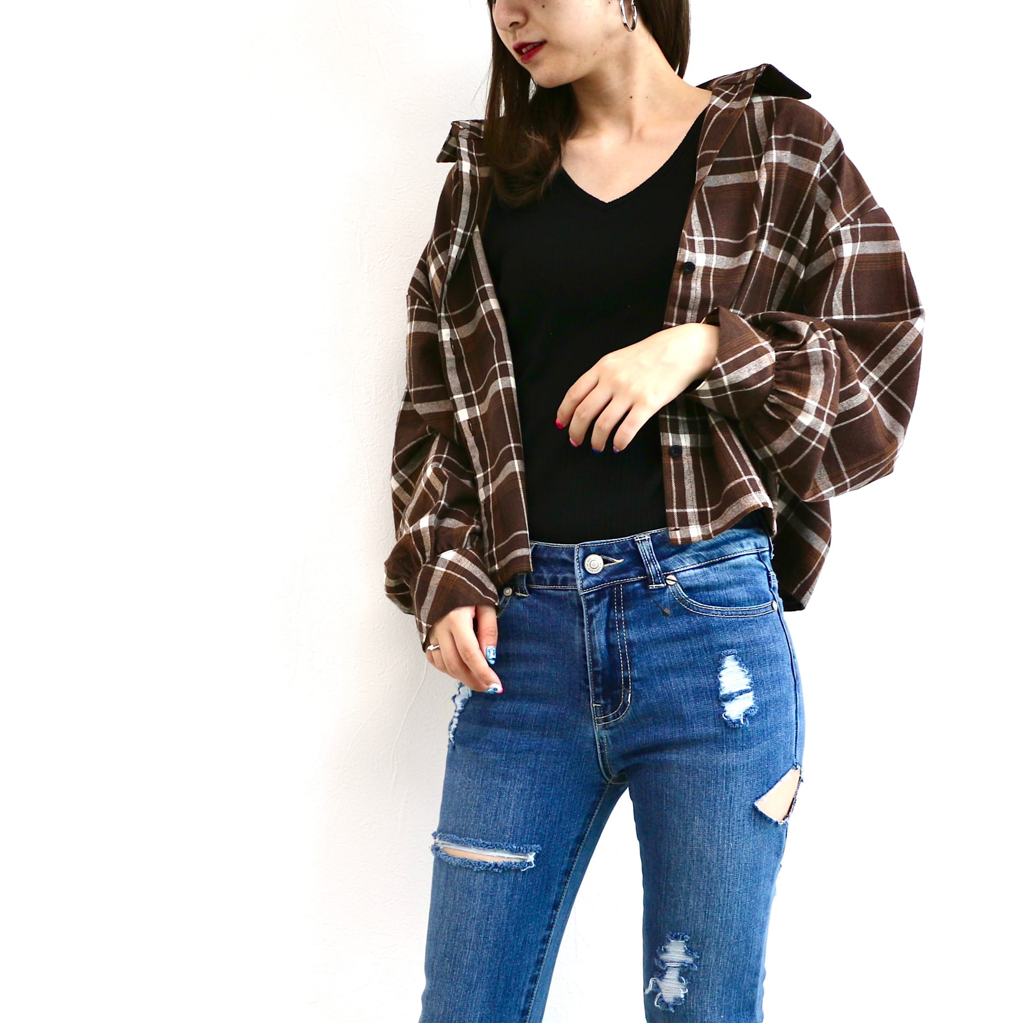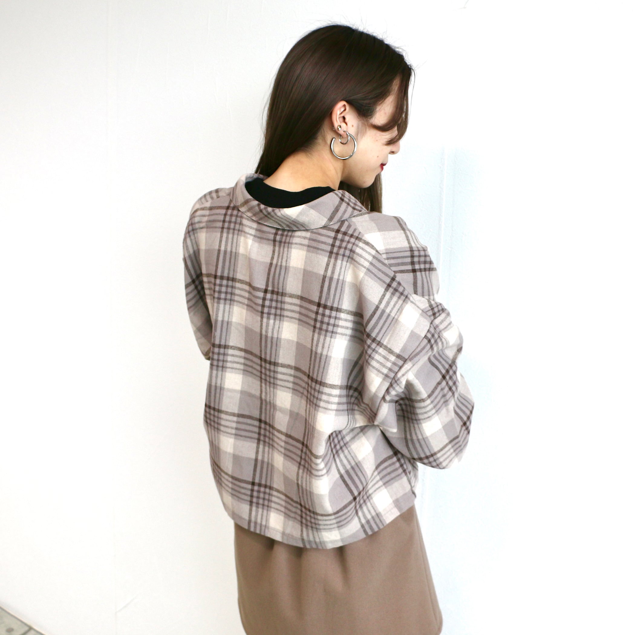 短丈がオシャレなチェックシャツです。袖口はギャザーを入れてゆったりボリューム袖です。シャツを後ろに抜いてこなれた感で着用するのがおすすめです。