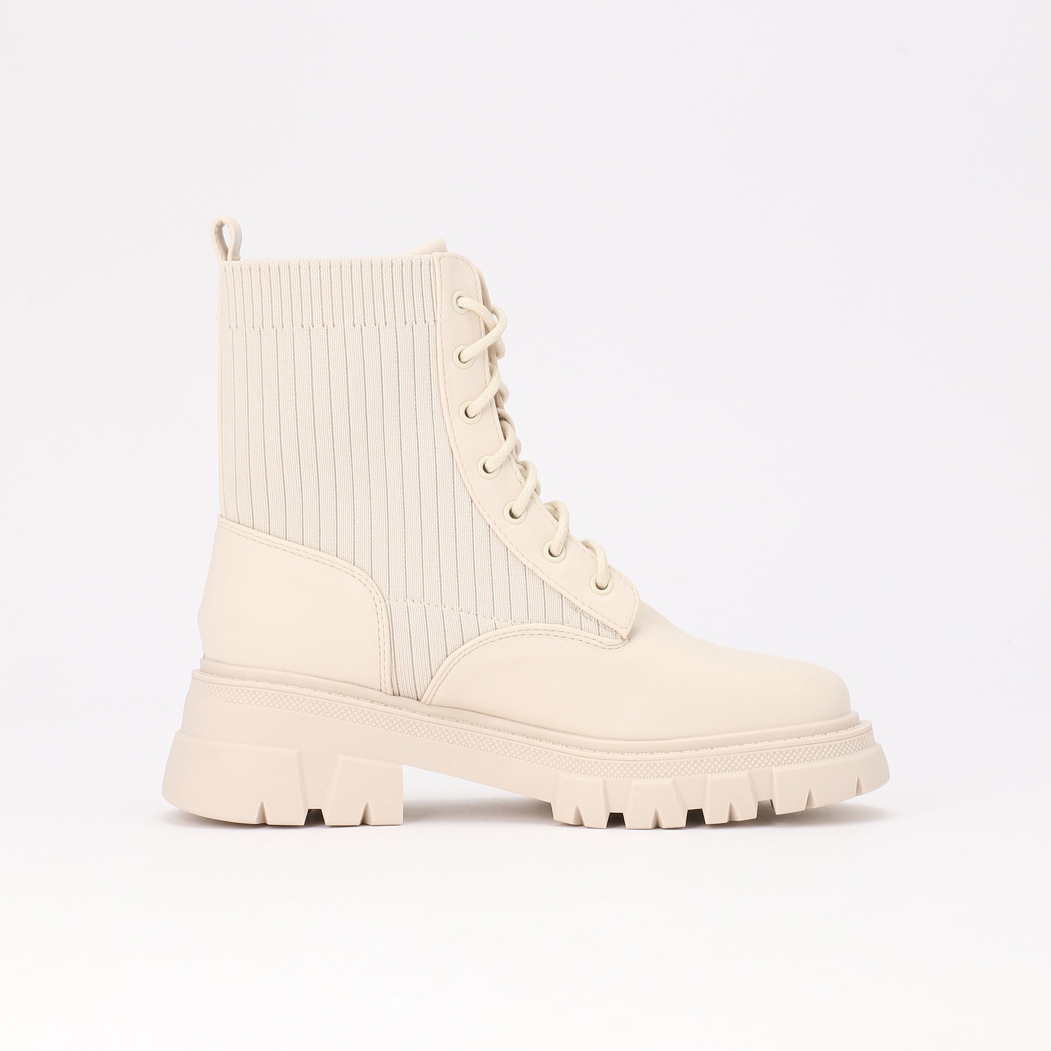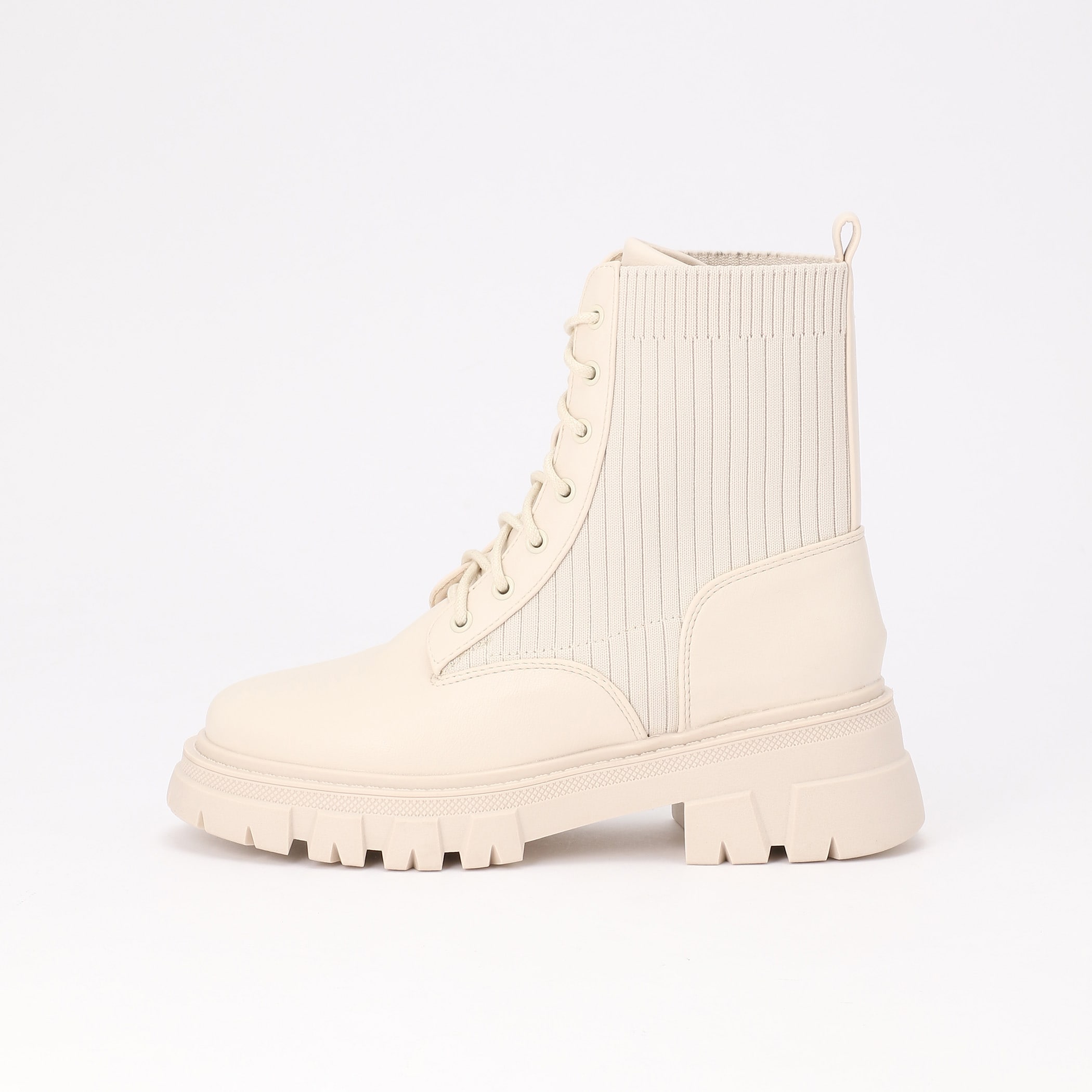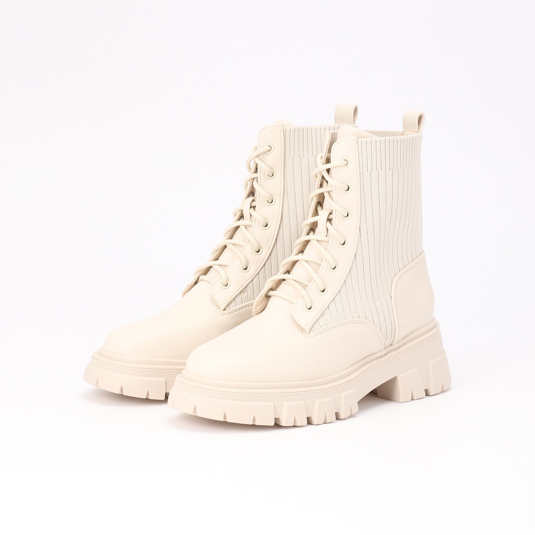 今シーズンも人気のミリタリーテイストのコンバットブーツ。トレンドのサイドニット素材の切り替えはデザイン性と足にフィットする履き心地の機能性両方兼ね備えています。程よい厚底でスタイルアップを叶えつつ、レースアップ初心者でも取り入れやすい形です。