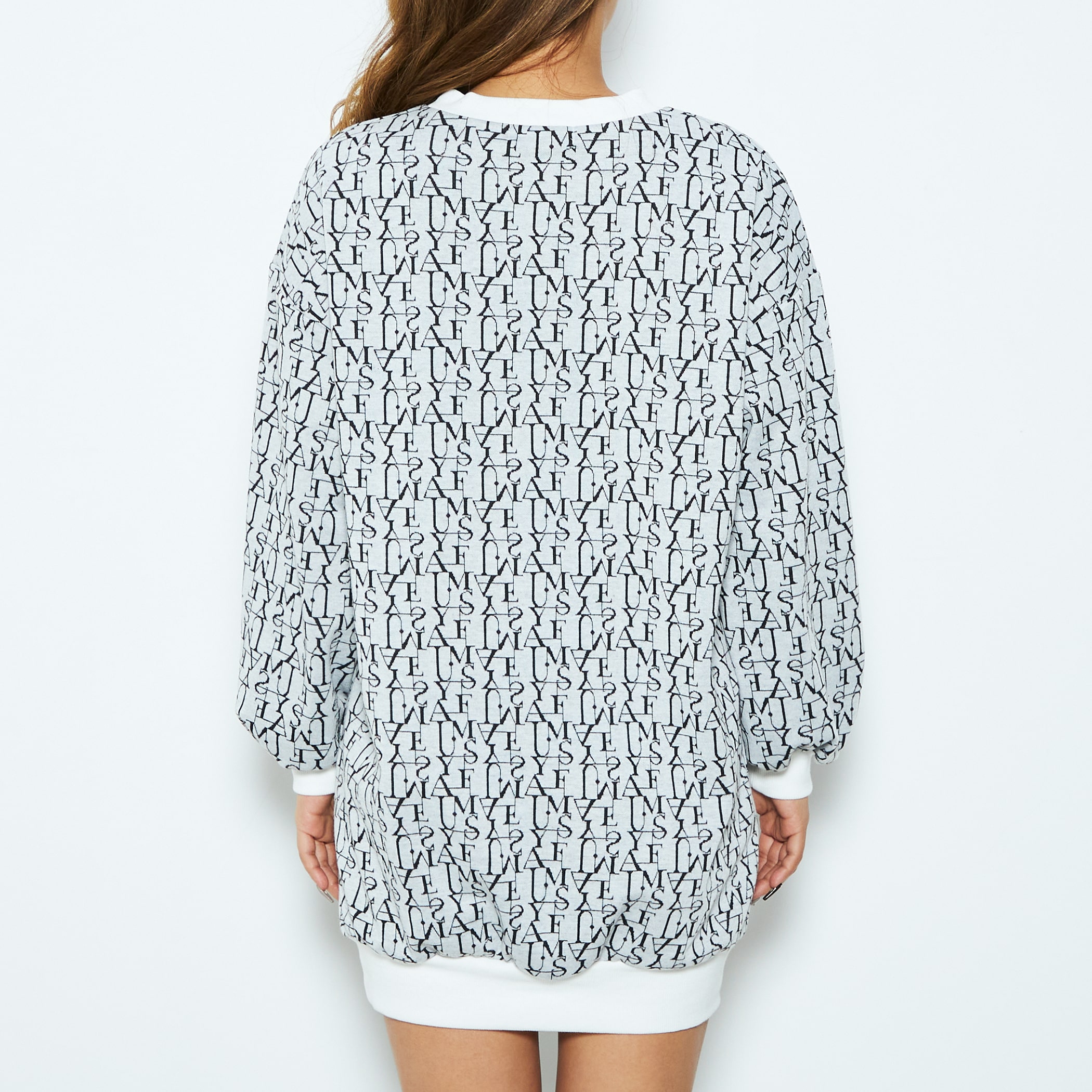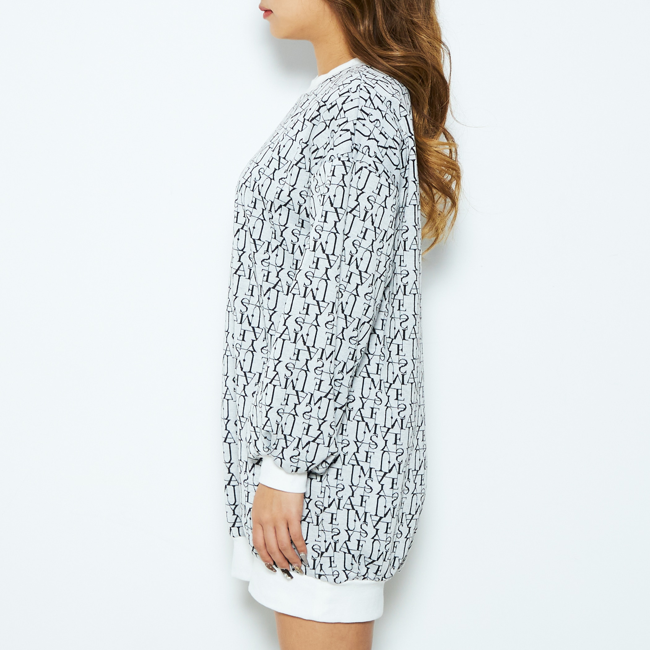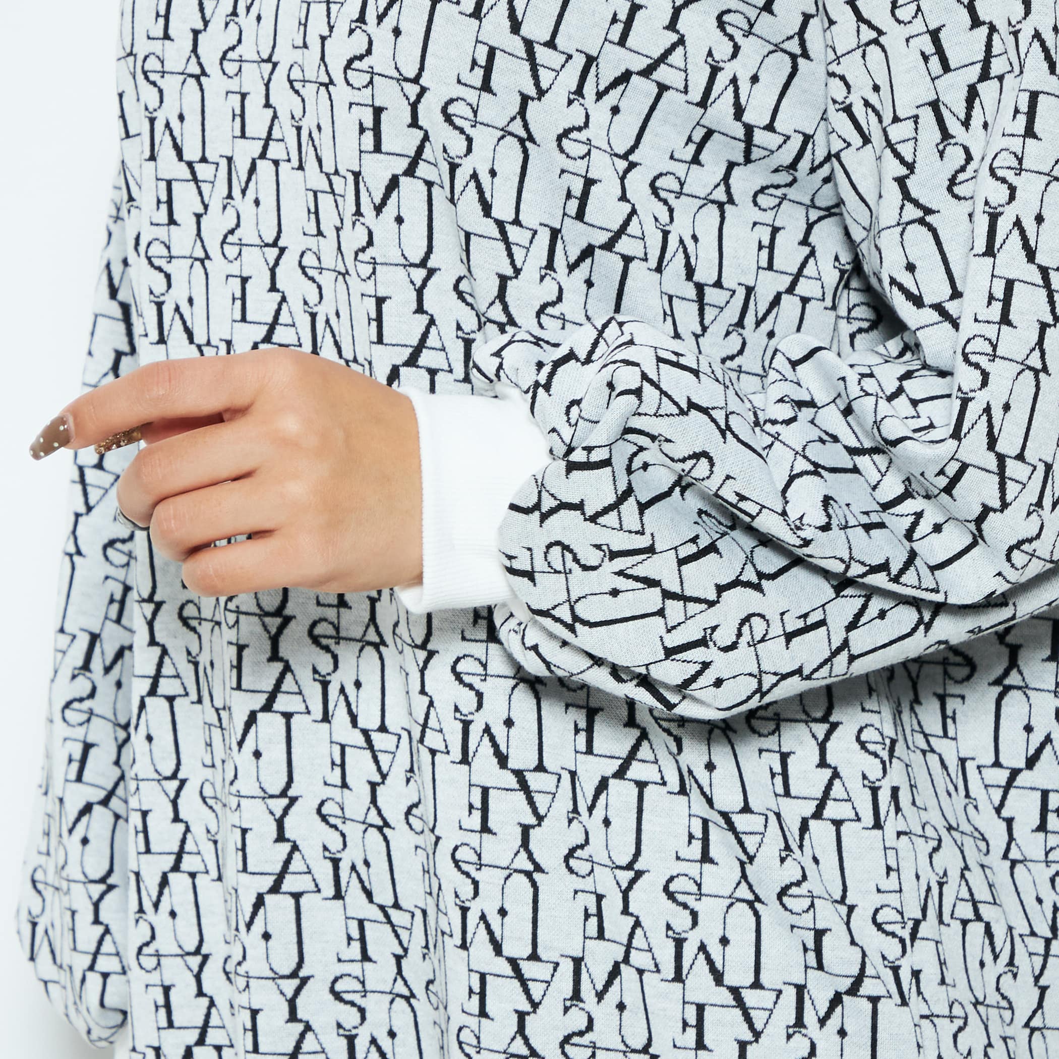 ロゴをモノグラム風にデザインし、総柄で仕上げたジャカードニットワンピースです。90年代のエッセンス漂うミニ丈は、ロングブーツと好相性。ビッグシルエットのスウェットを着ているような、こなれ感のあるルックスも魅力的です。