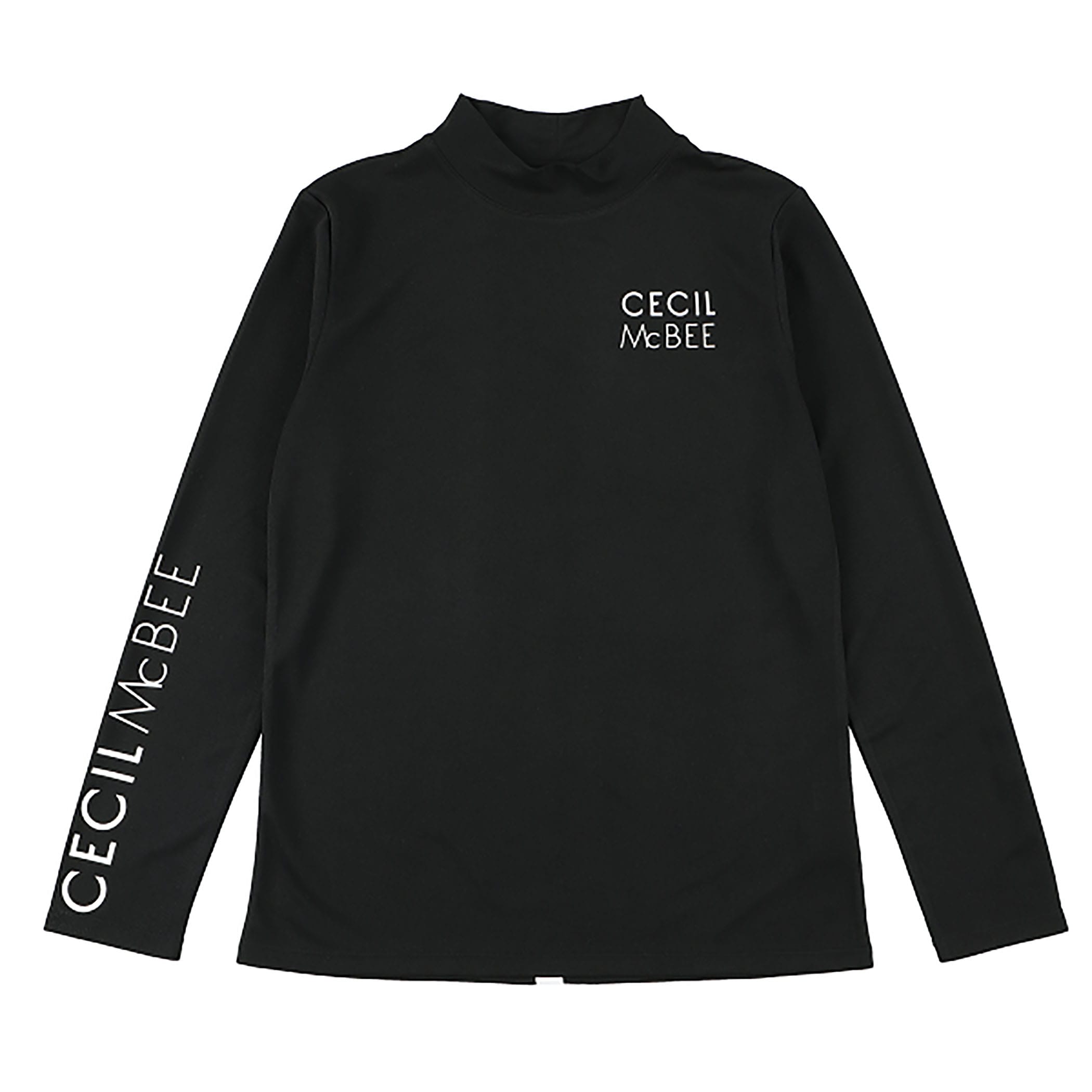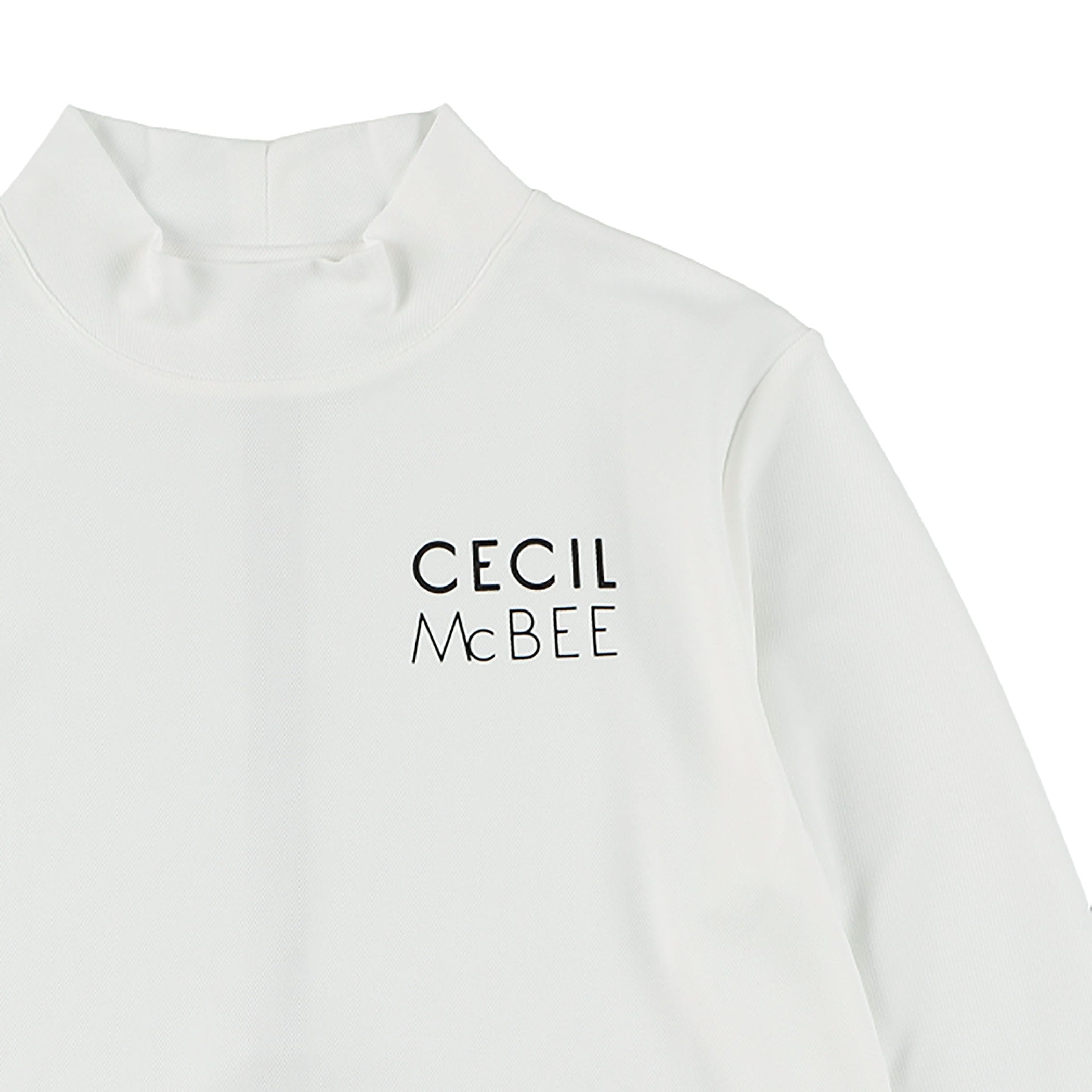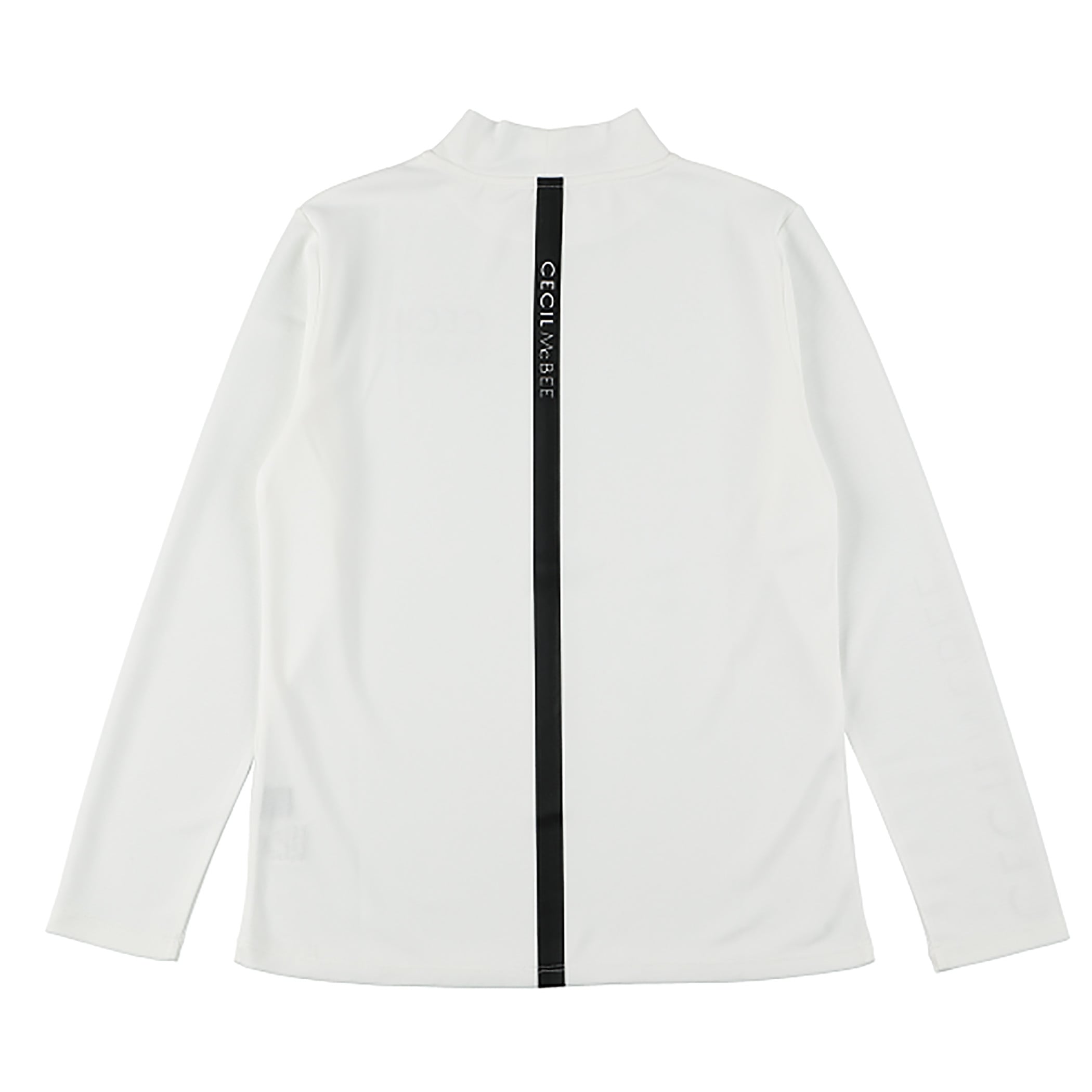 左胸と右袖にCECIL McBEE のロゴが入ったモックネックロングスリーブTシャツ。バックには立てラインにCECIL McBEE のロゴが小さく入っています。どこから見てもロゴがアクセントになるようにしています。ウエストを少し絞っているので、着やせ効果もあるシルエットにしています。シンプルなモックネックロングTシャツなので、1枚で着るのはもちろん、ベストやアウターのインナーとしても、コーディネートの幅が広がります。ポリエステルなので、速乾性があります。