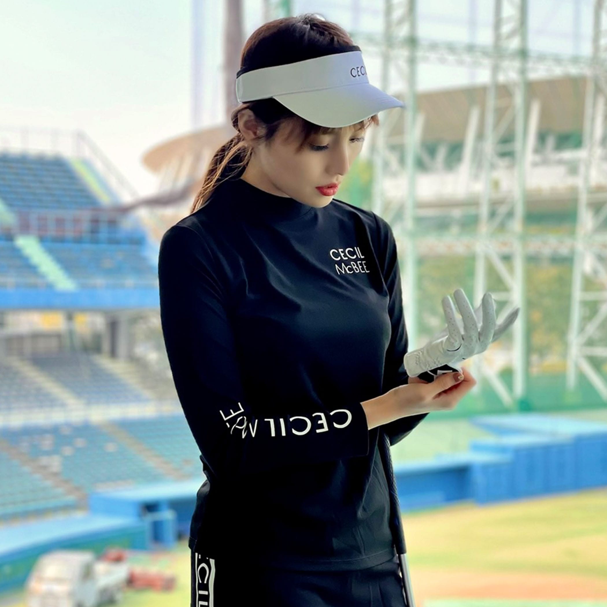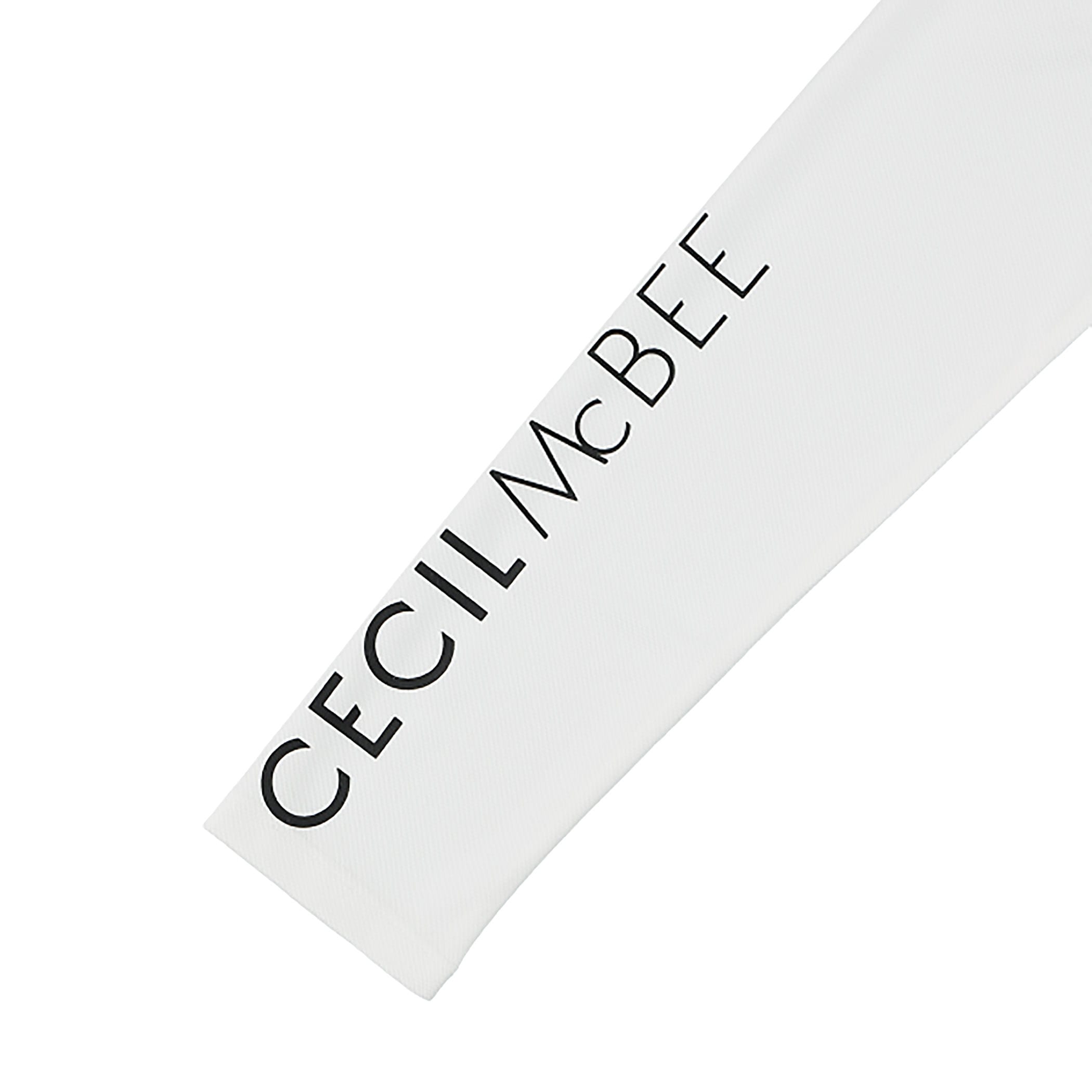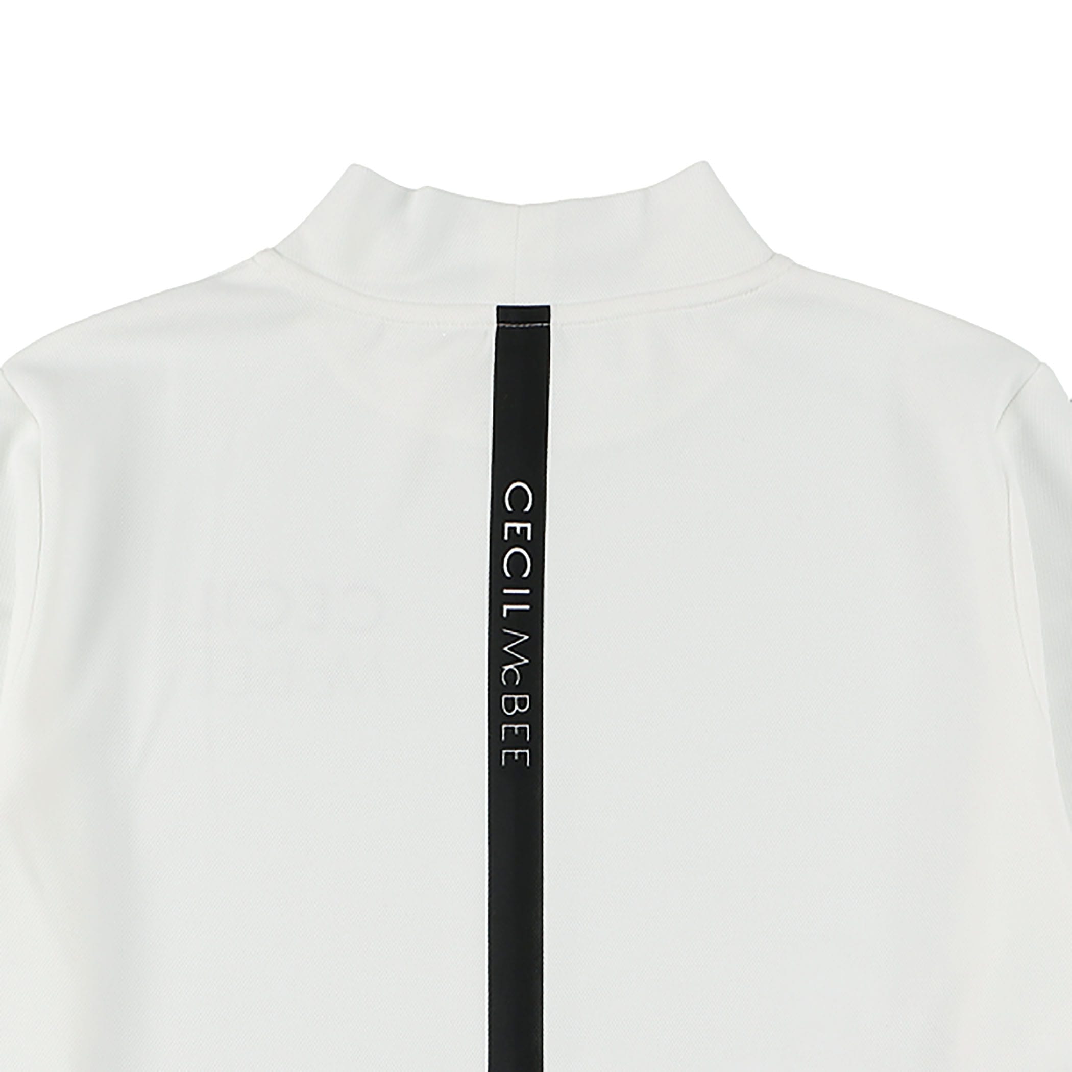 左胸と右袖にCECIL McBEE のロゴが入ったモックネックロングスリーブTシャツ。バックには立てラインにCECIL McBEE のロゴが小さく入っています。どこから見てもロゴがアクセントになるようにしています。ウエストを少し絞っているので、着やせ効果もあるシルエットにしています。シンプルなモックネックロングTシャツなので、1枚で着るのはもちろん、ベストやアウターのインナーとしても、コーディネートの幅が広がります。ポリエステルなので、速乾性があります。