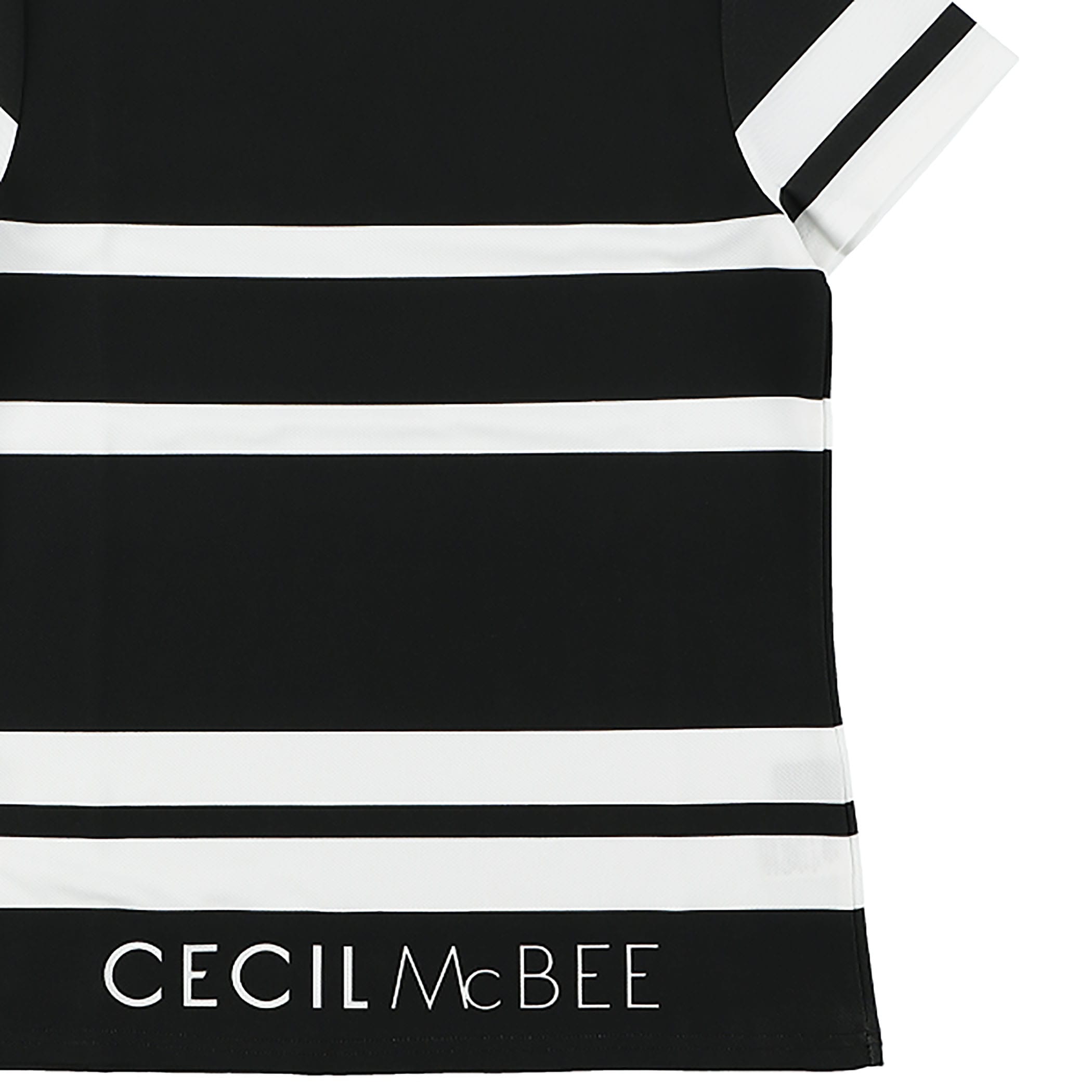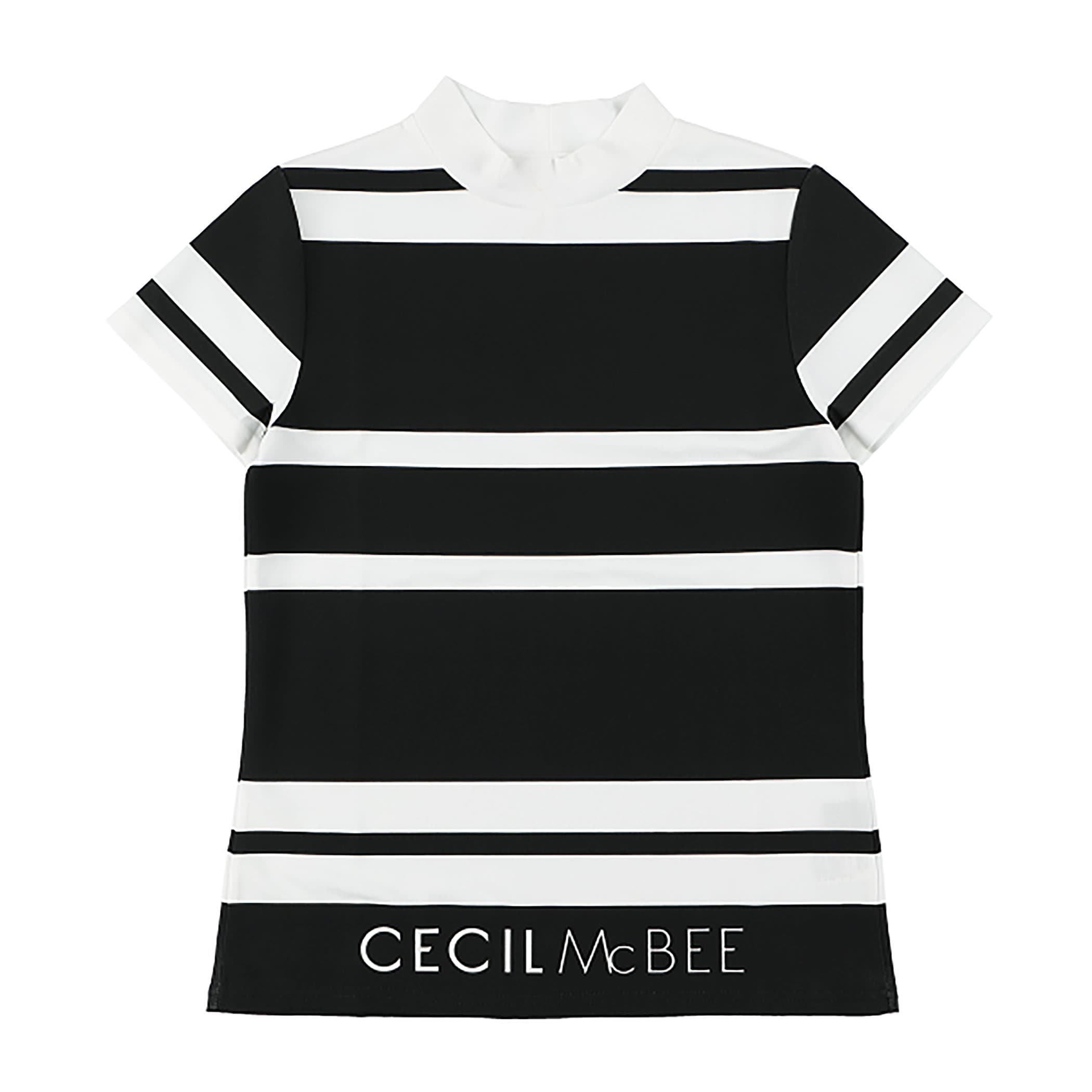ボーダープリントモックネックTシャツ。裾にはCECIL McBEE のロゴがアクセントになっています。ウエストを少し絞っているので、着やせ効果もあるシルエットにしています。マルチボーダーなので、カジュアルにもシックな感じでもコーディネートできます。ポリエステルなので、速乾性があります。
