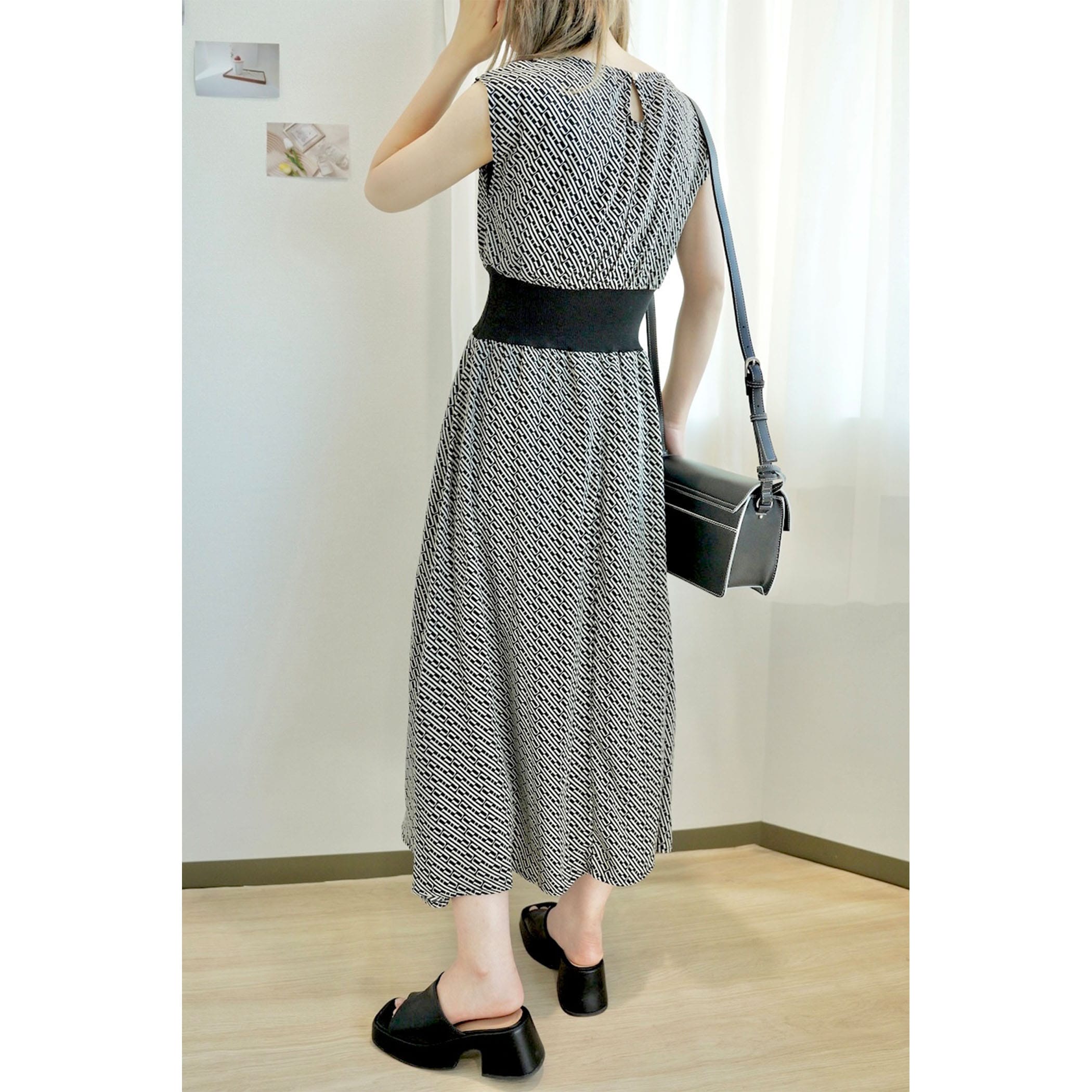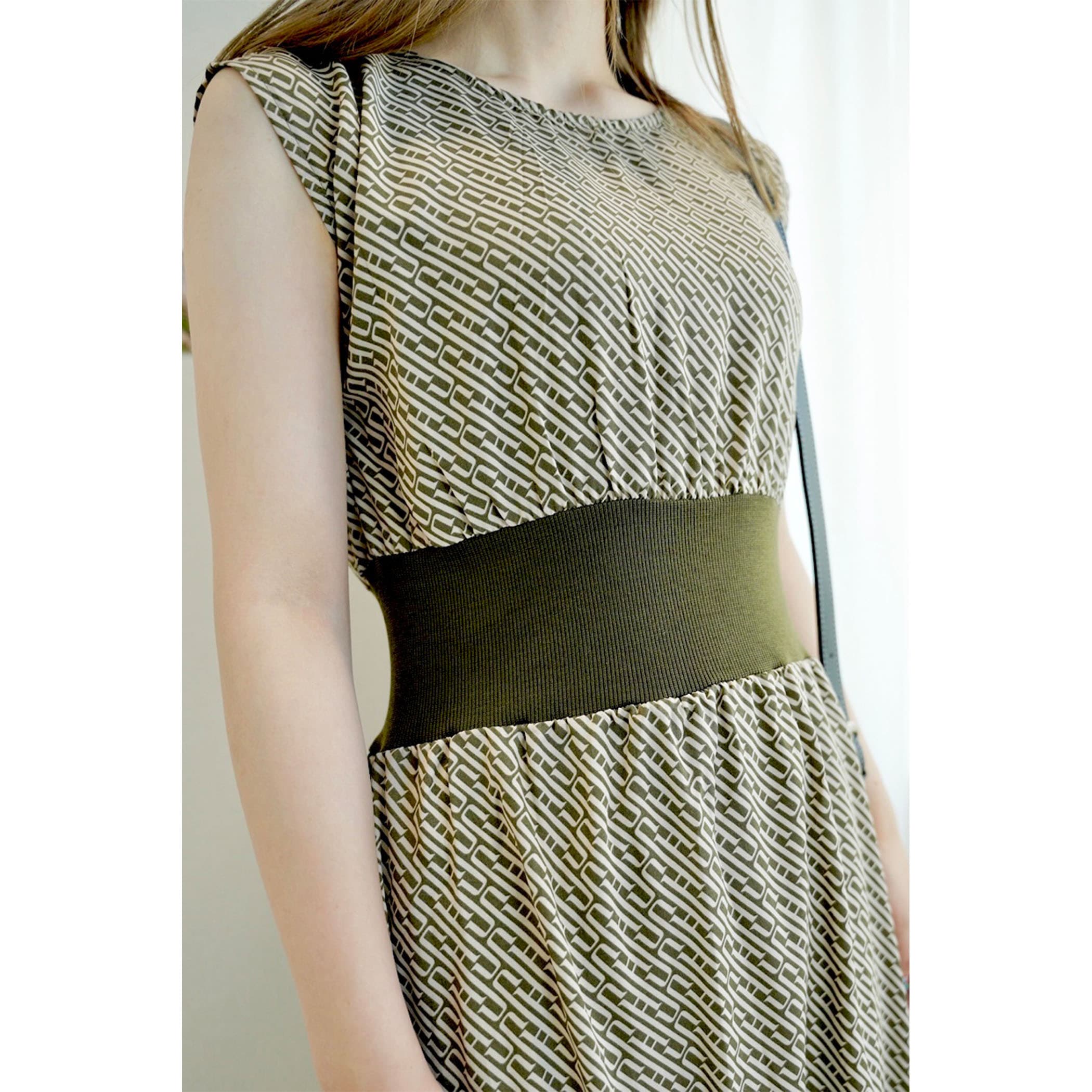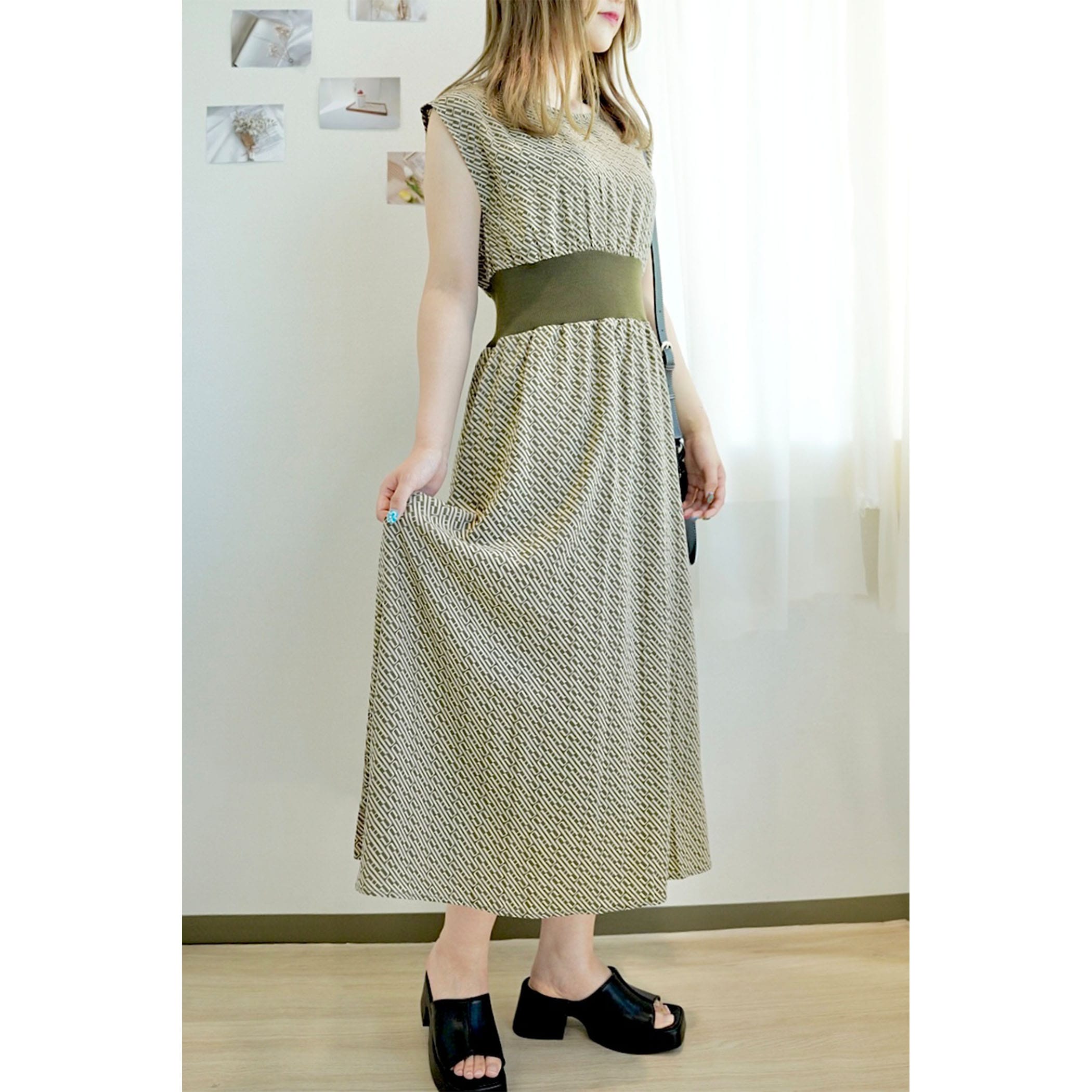 今年っぽいレトロなモノグラム柄のワンピース。落ち感のある素材でこなれた印象に。ウエストマークのリブがスタイルアップ効果も。フレンチスリーブがほどよく肩回りをカバーしてくれてスッキリ見せてくれます。