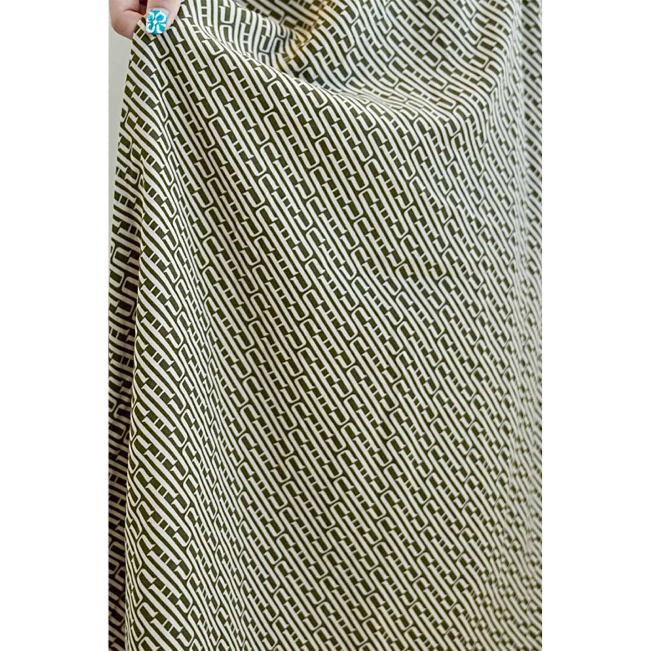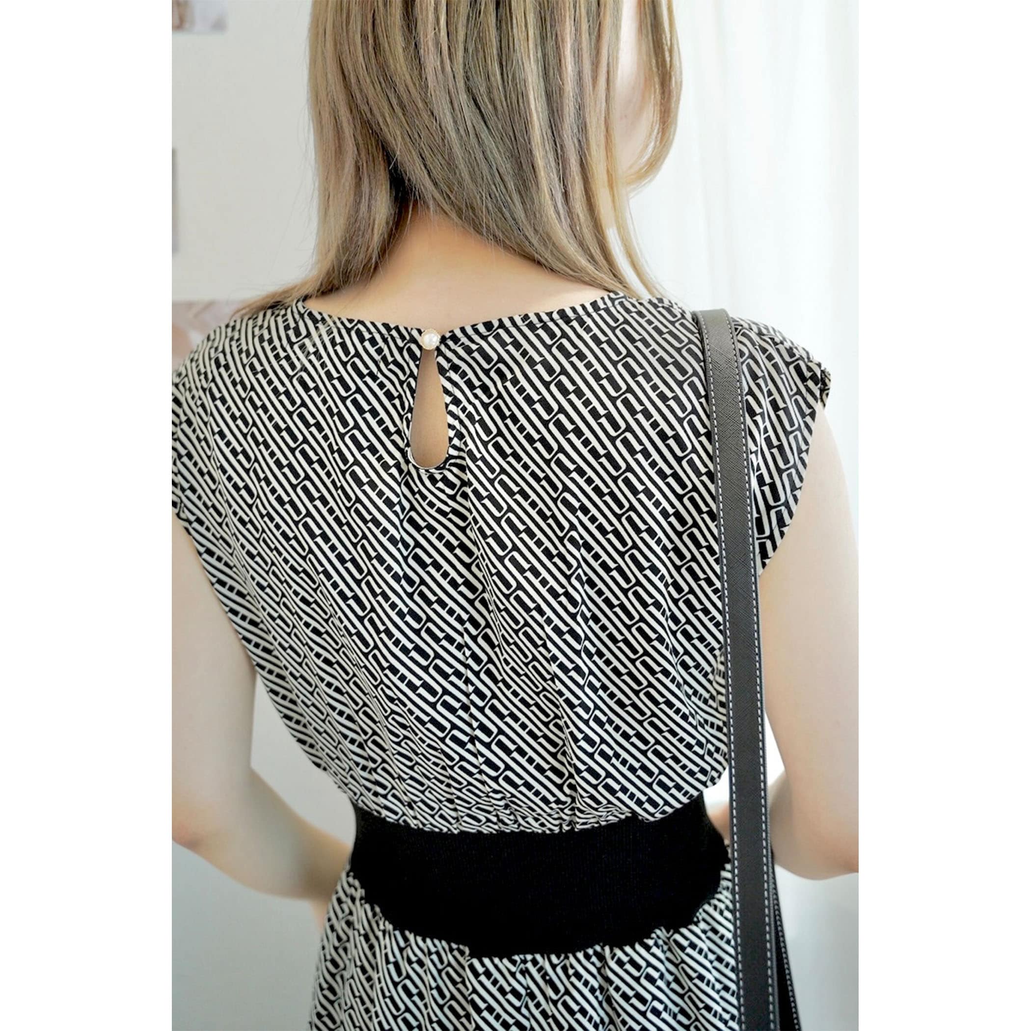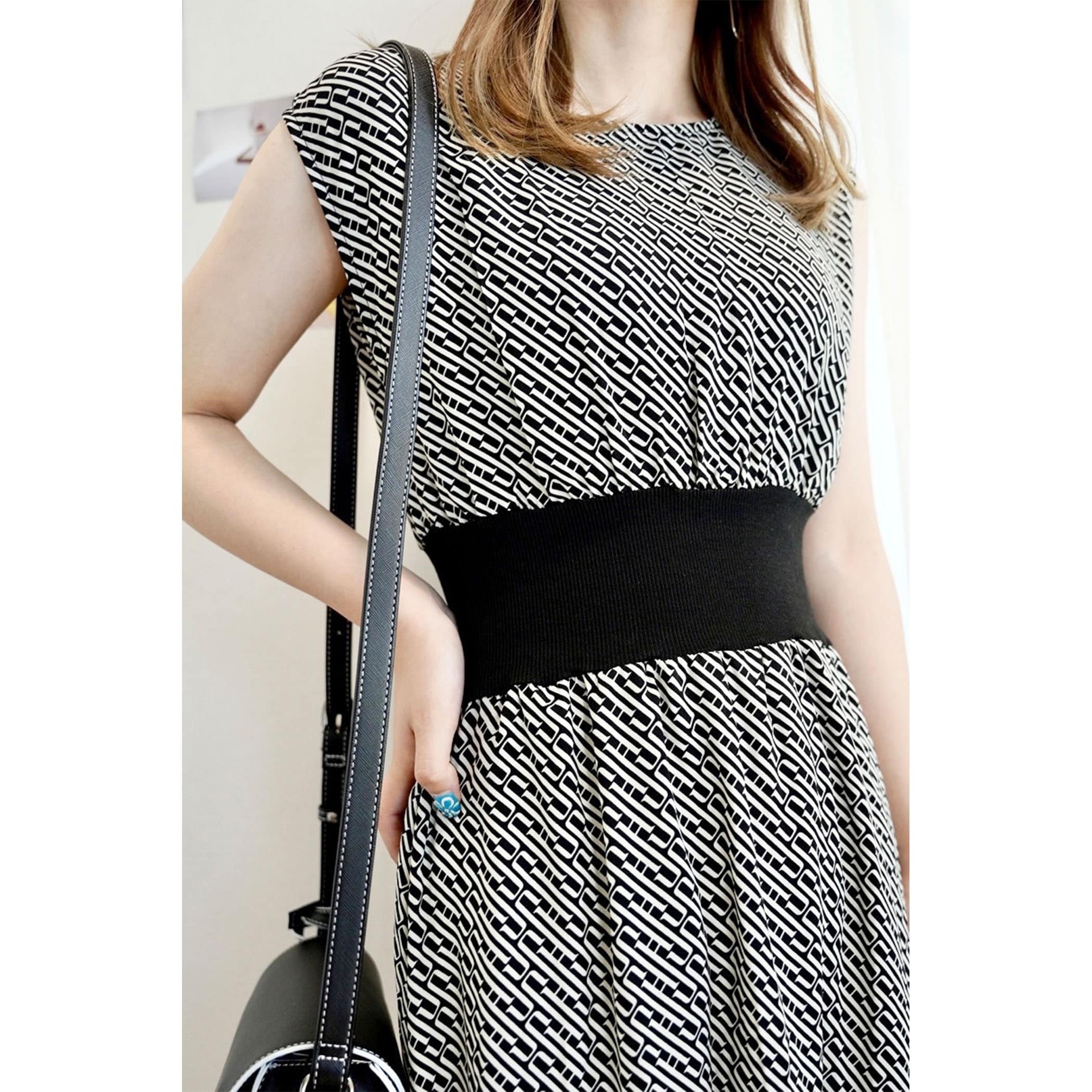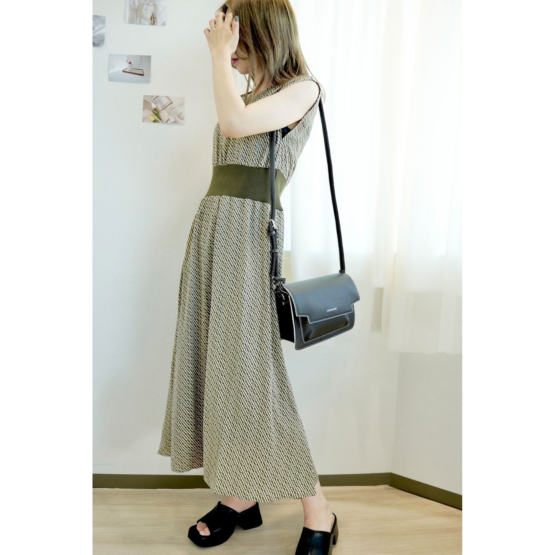 今年っぽいレトロなモノグラム柄のワンピース。落ち感のある素材でこなれた印象に。ウエストマークのリブがスタイルアップ効果も。フレンチスリーブがほどよく肩回りをカバーしてくれてスッキリ見せてくれます。