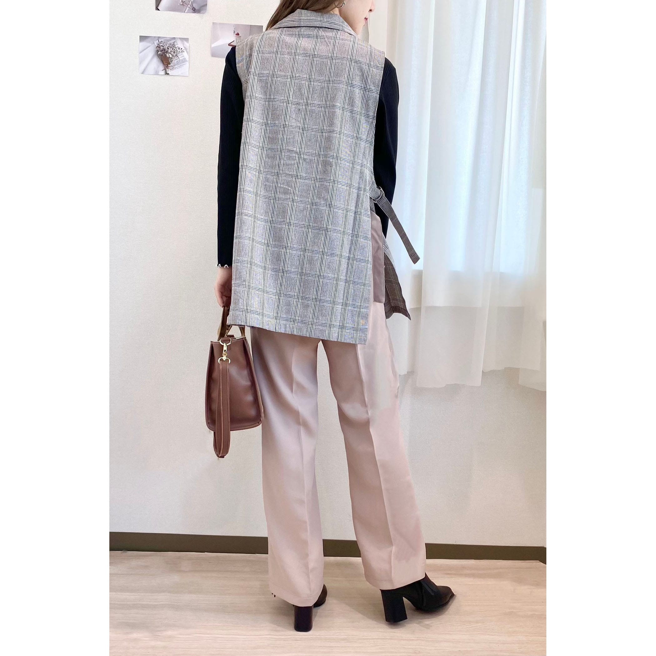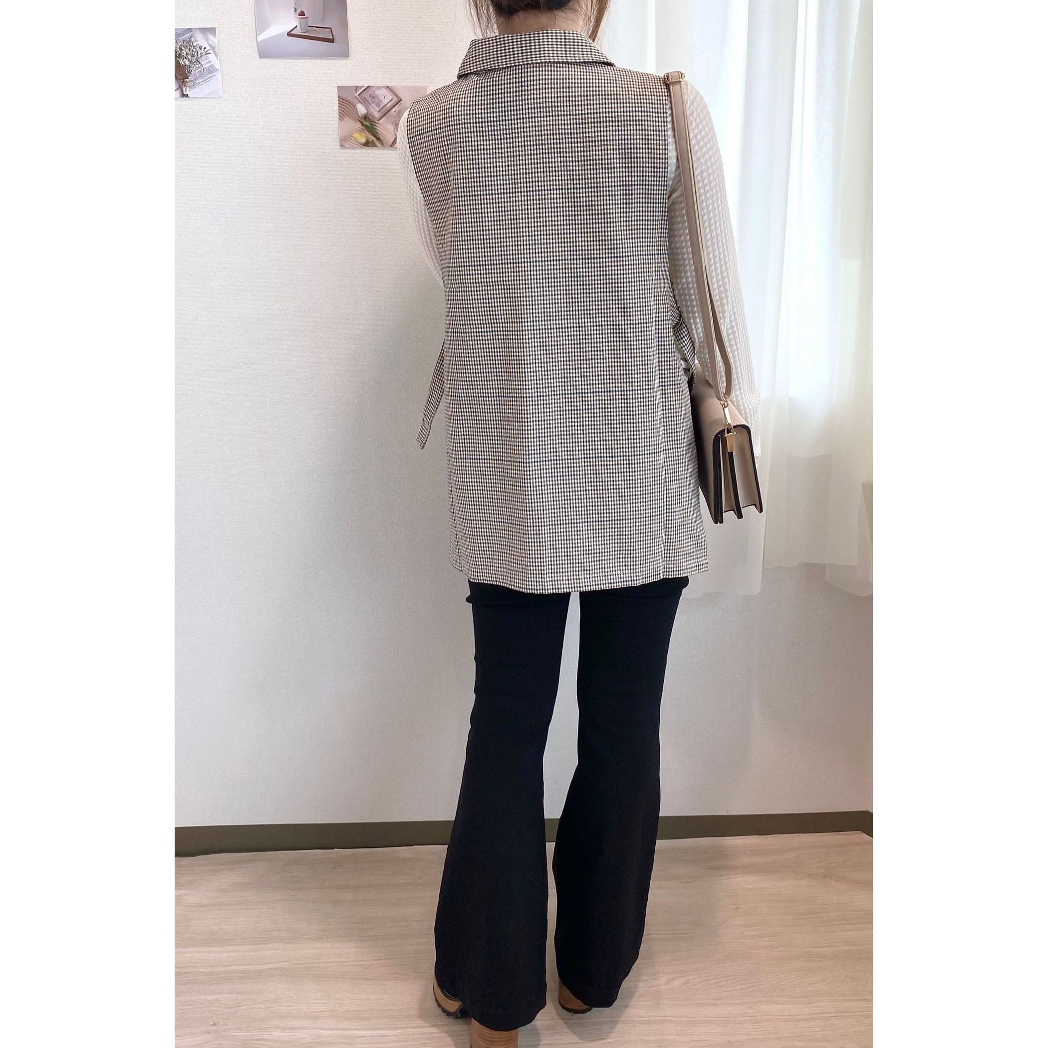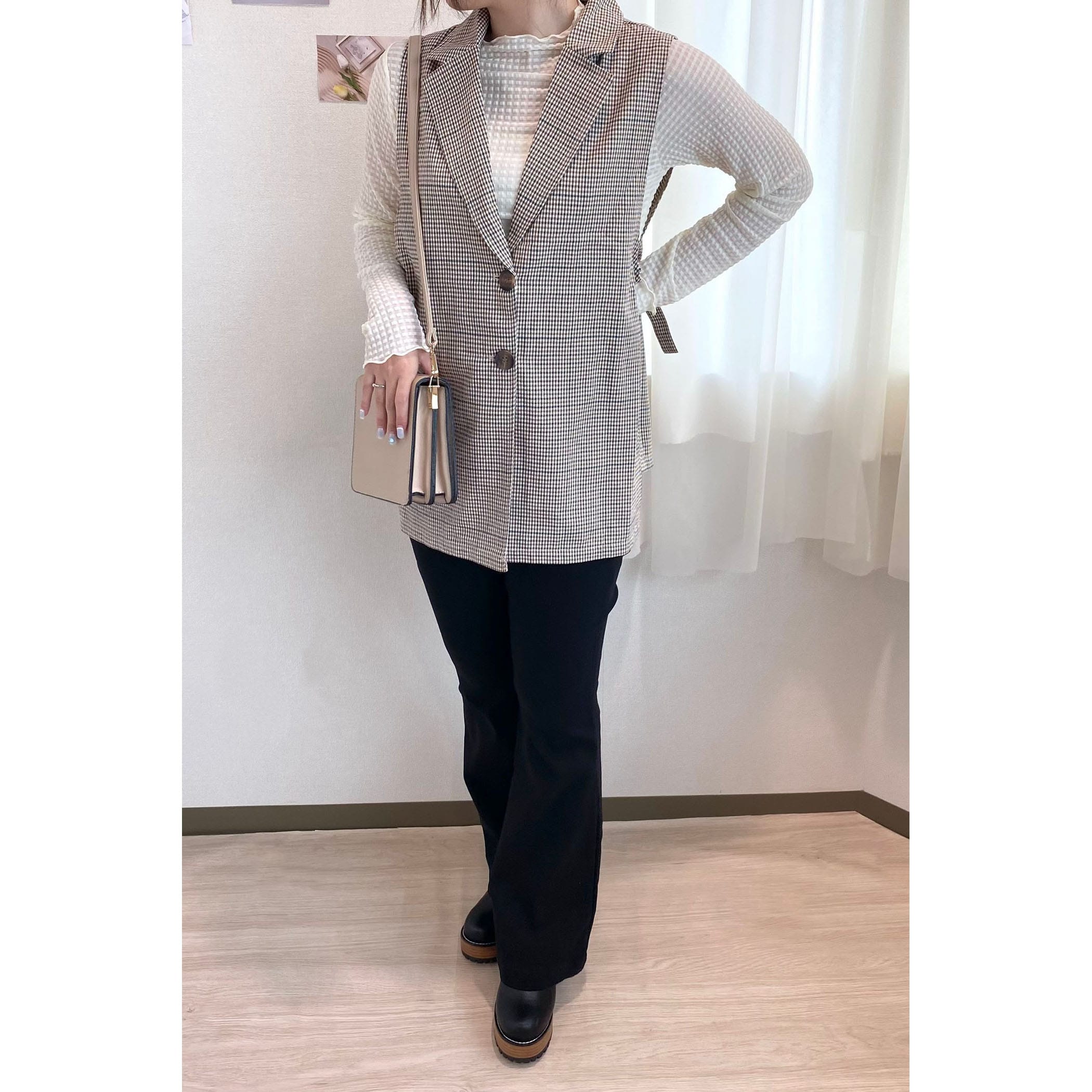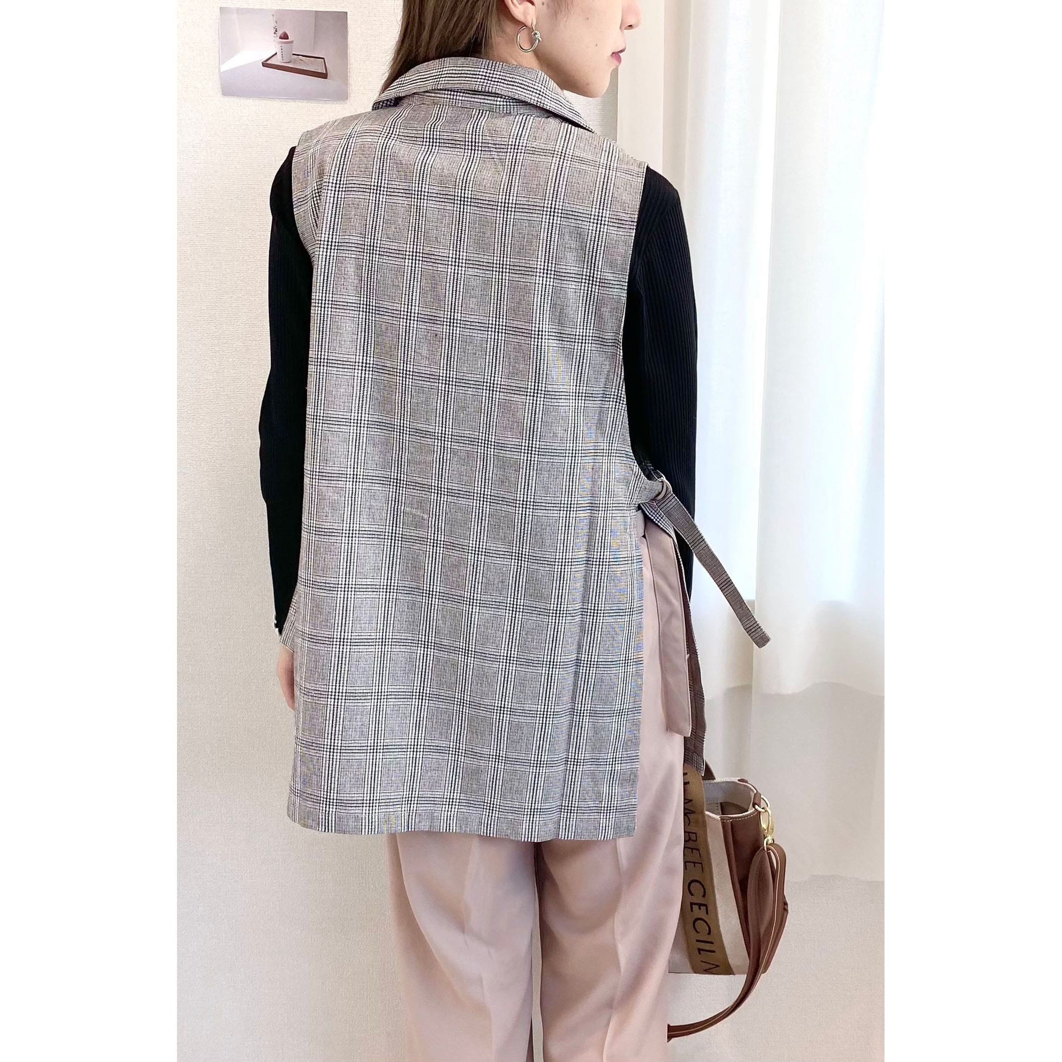 トレンドのノースリジレがチェック柄で登場。パンツにもスカートにも合わせやすいアイテムなので、いつものコーディネートにプラスするだけで、こなれた印象に。落ち着いた色合いなので、秋スタイルにオススメの一枚です。
