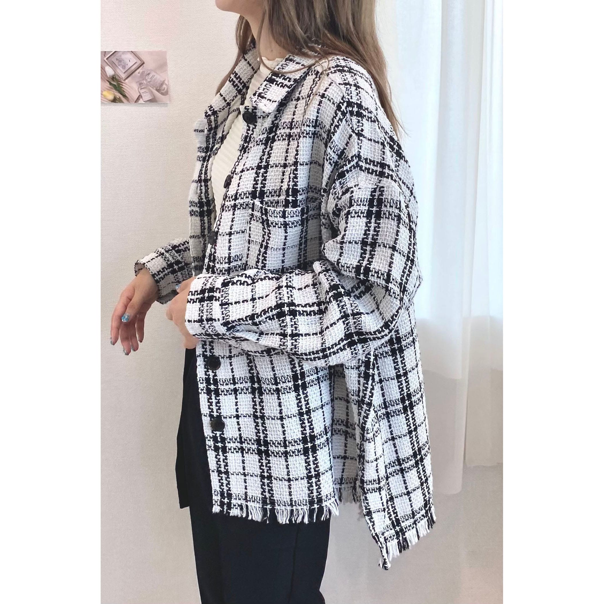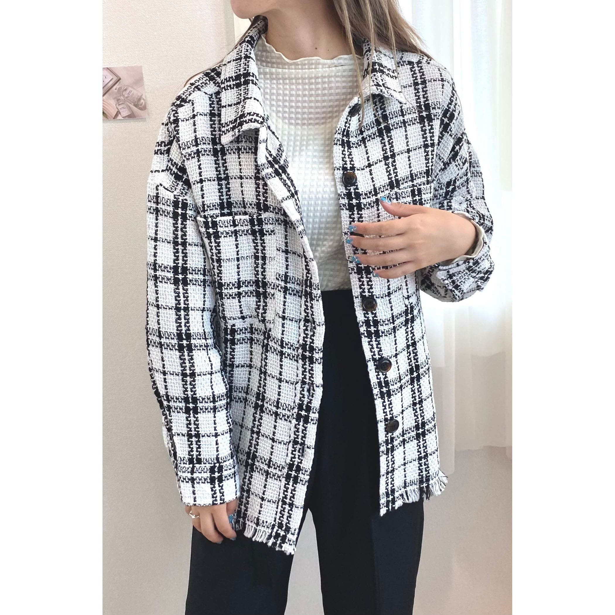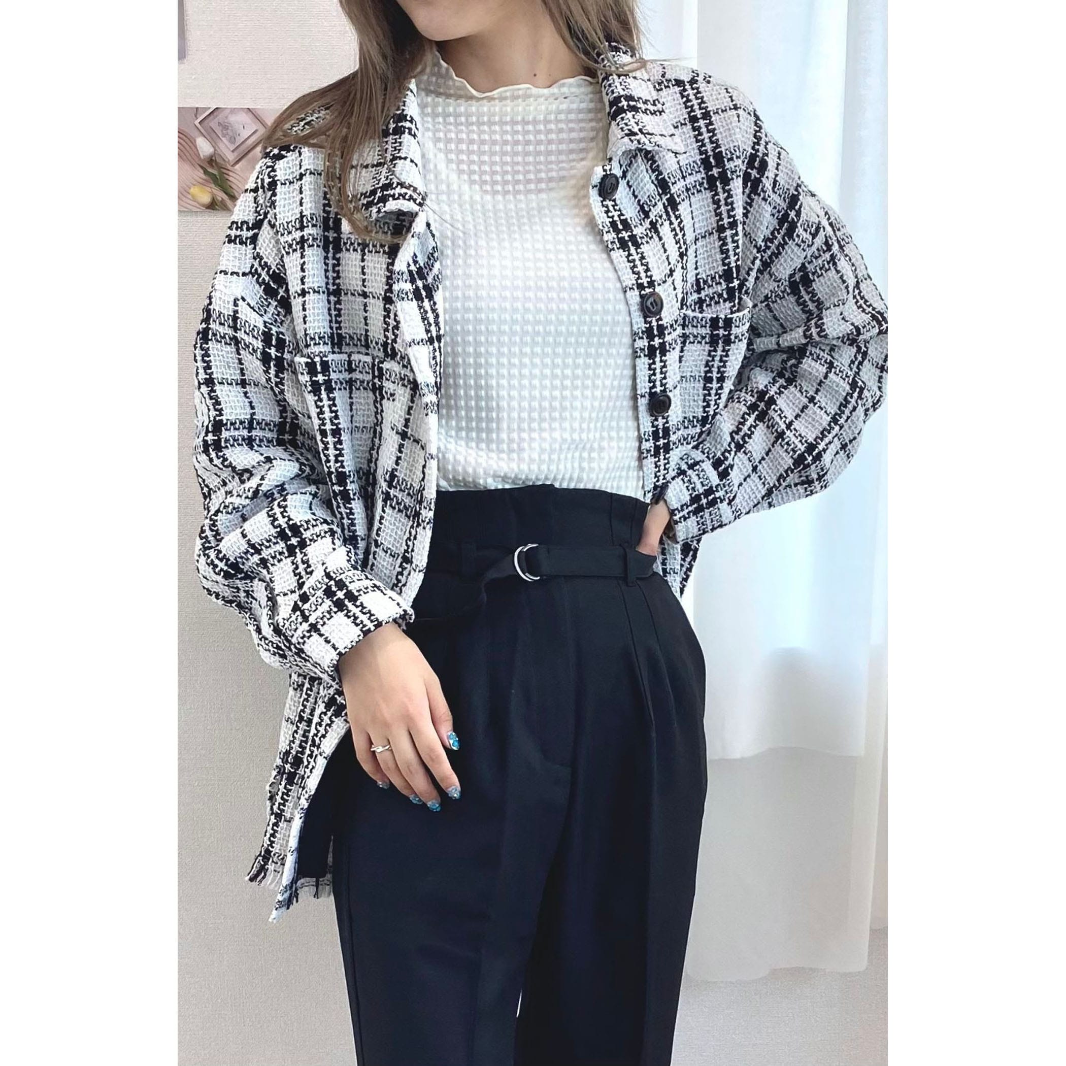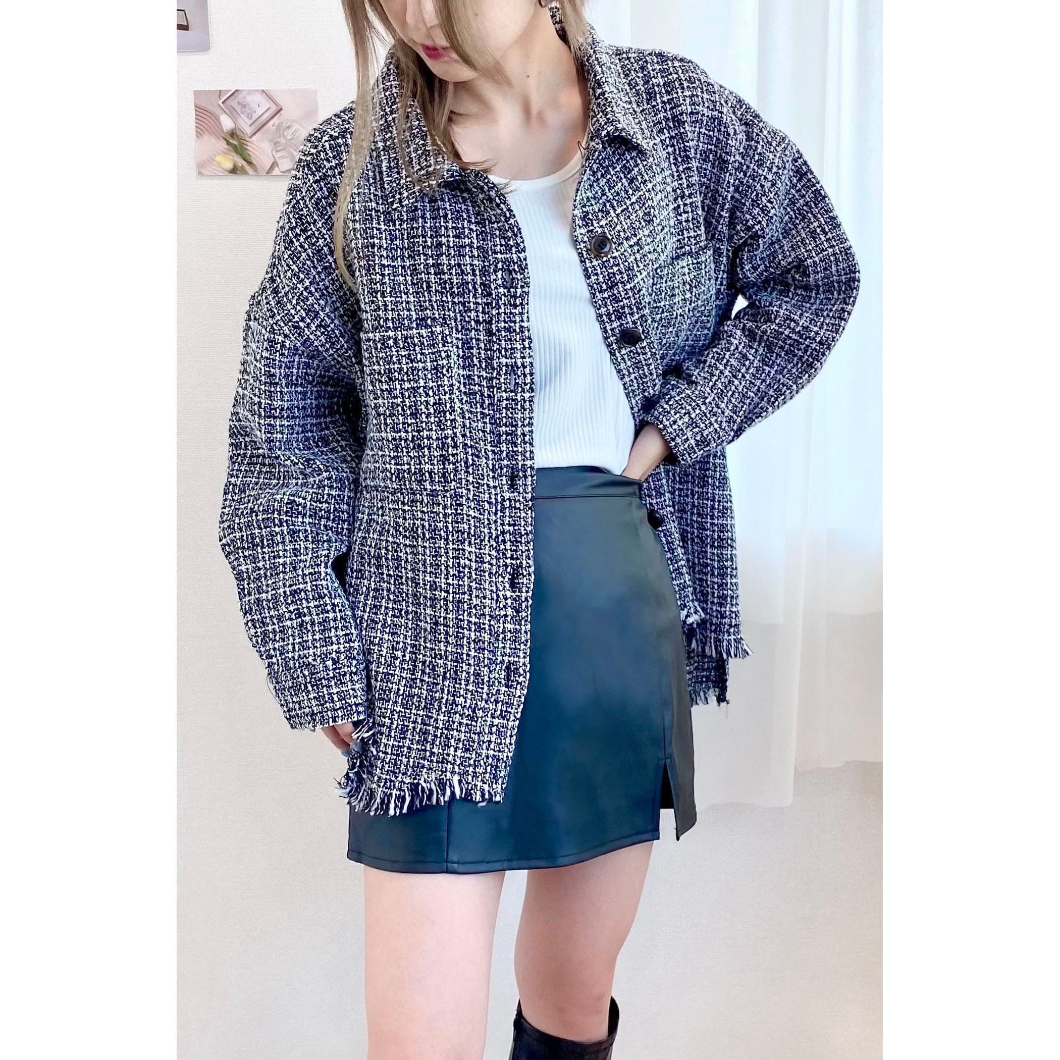 一枚でコーディネートが高見えするツイードシャツジャケット。裾がフリンジでオーバーサイズなので、ラフな雰囲気の中に上品さがプラスされたオシャレな一枚です。デニムはもちろん、パンツやスカートどちらにもコーディネートしやすいアイテムです。