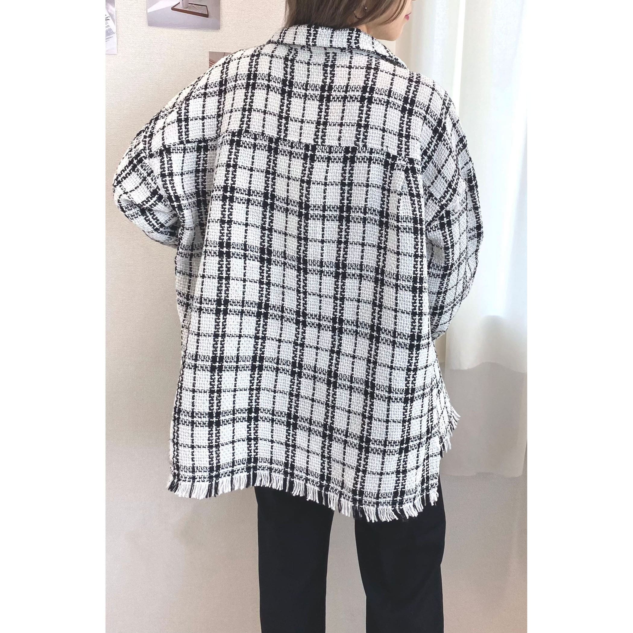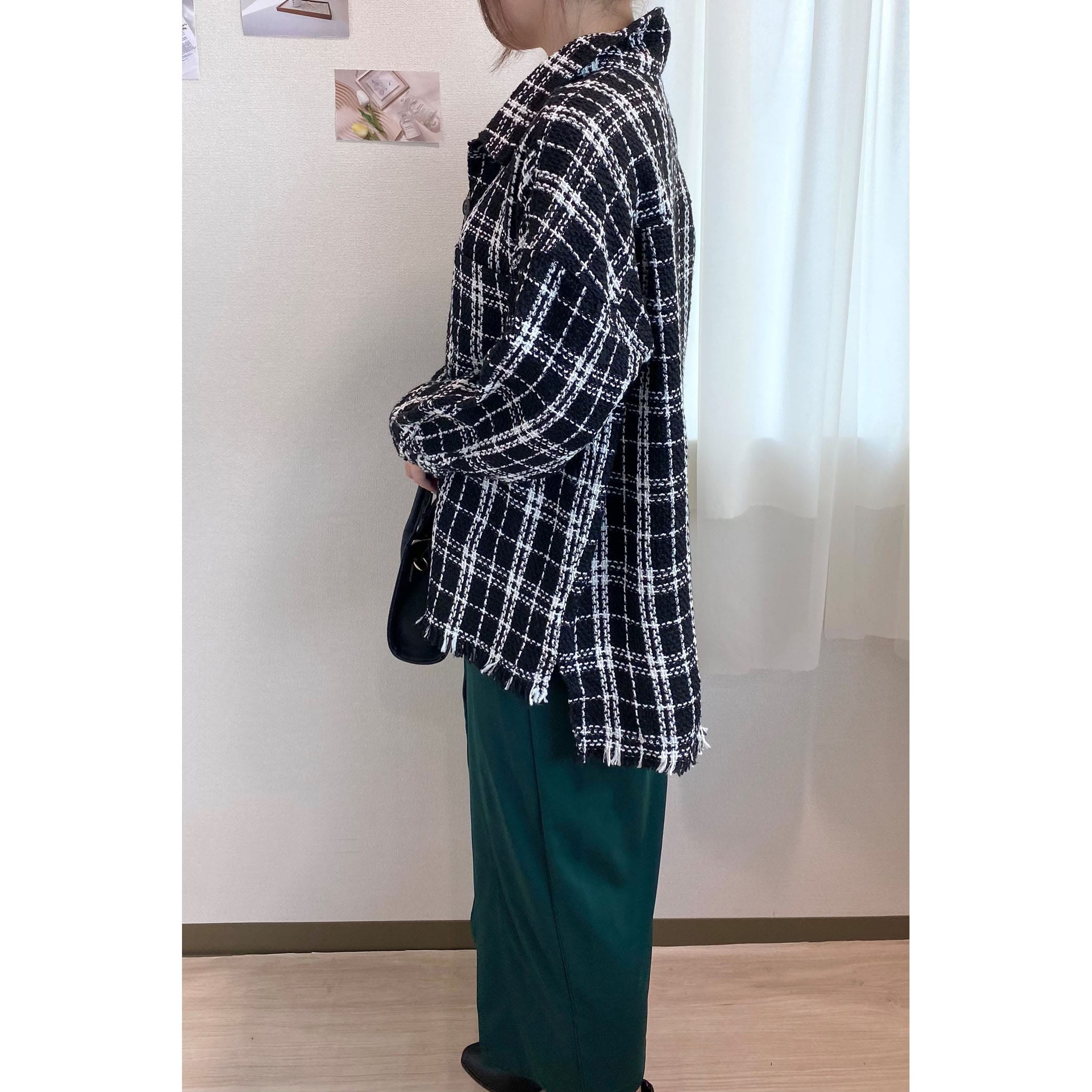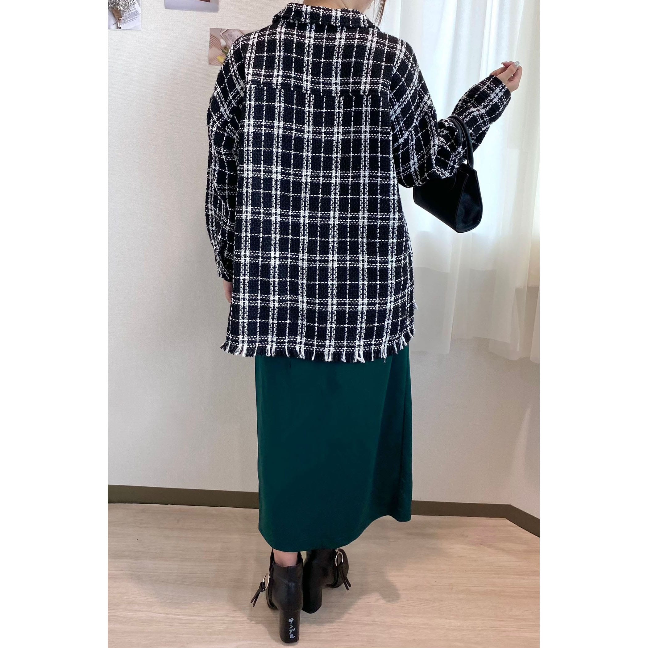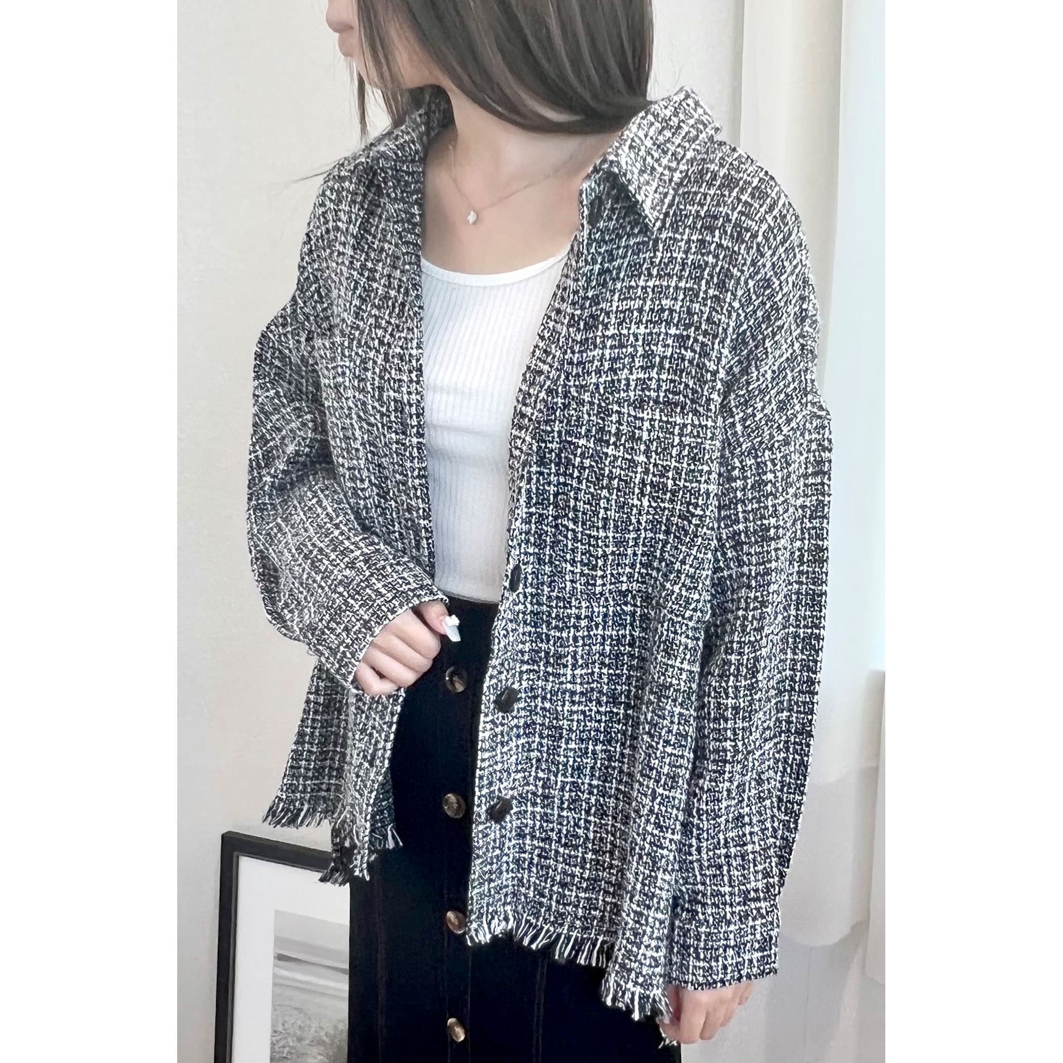 一枚でコーディネートが高見えするツイードシャツジャケット。裾がフリンジでオーバーサイズなので、ラフな雰囲気の中に上品さがプラスされたオシャレな一枚です。デニムはもちろん、パンツやスカートどちらにもコーディネートしやすいアイテムです。
