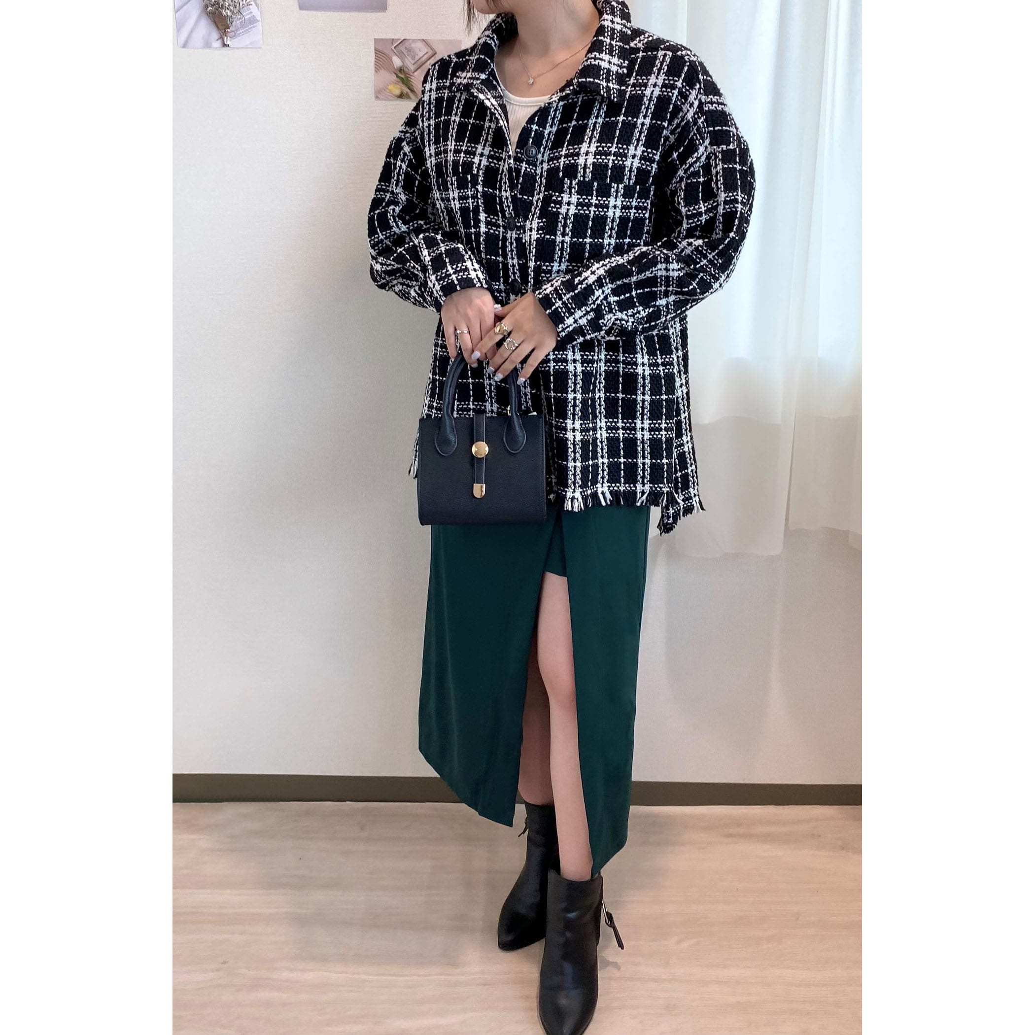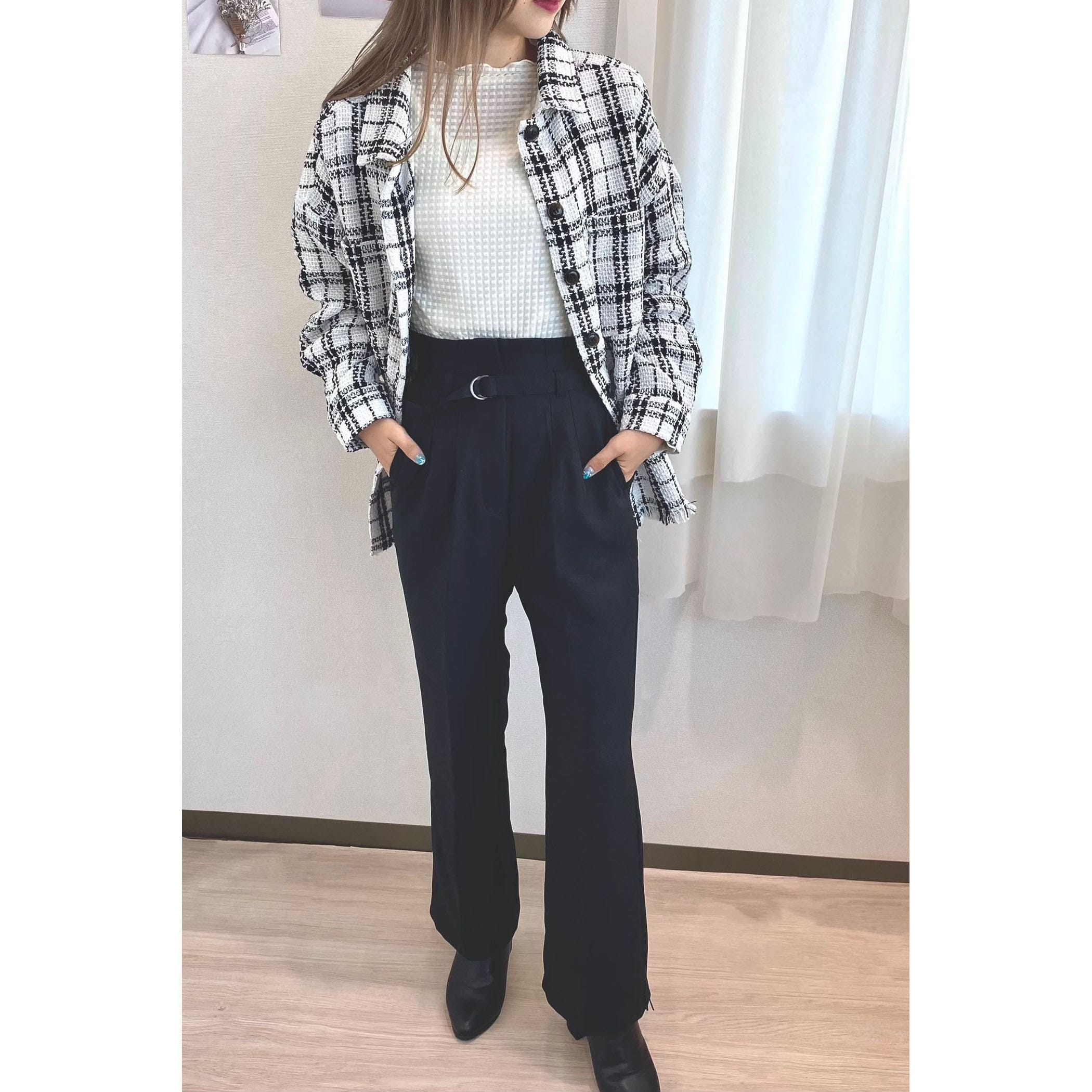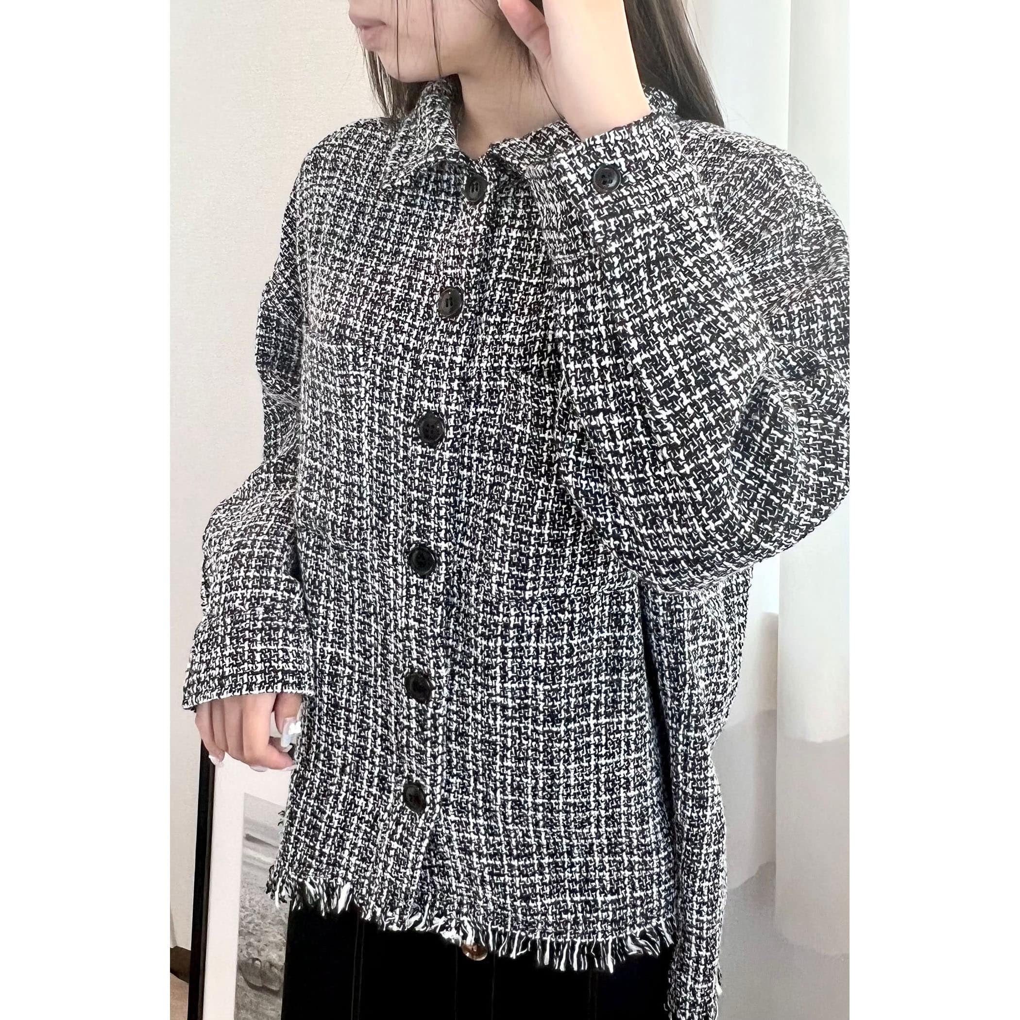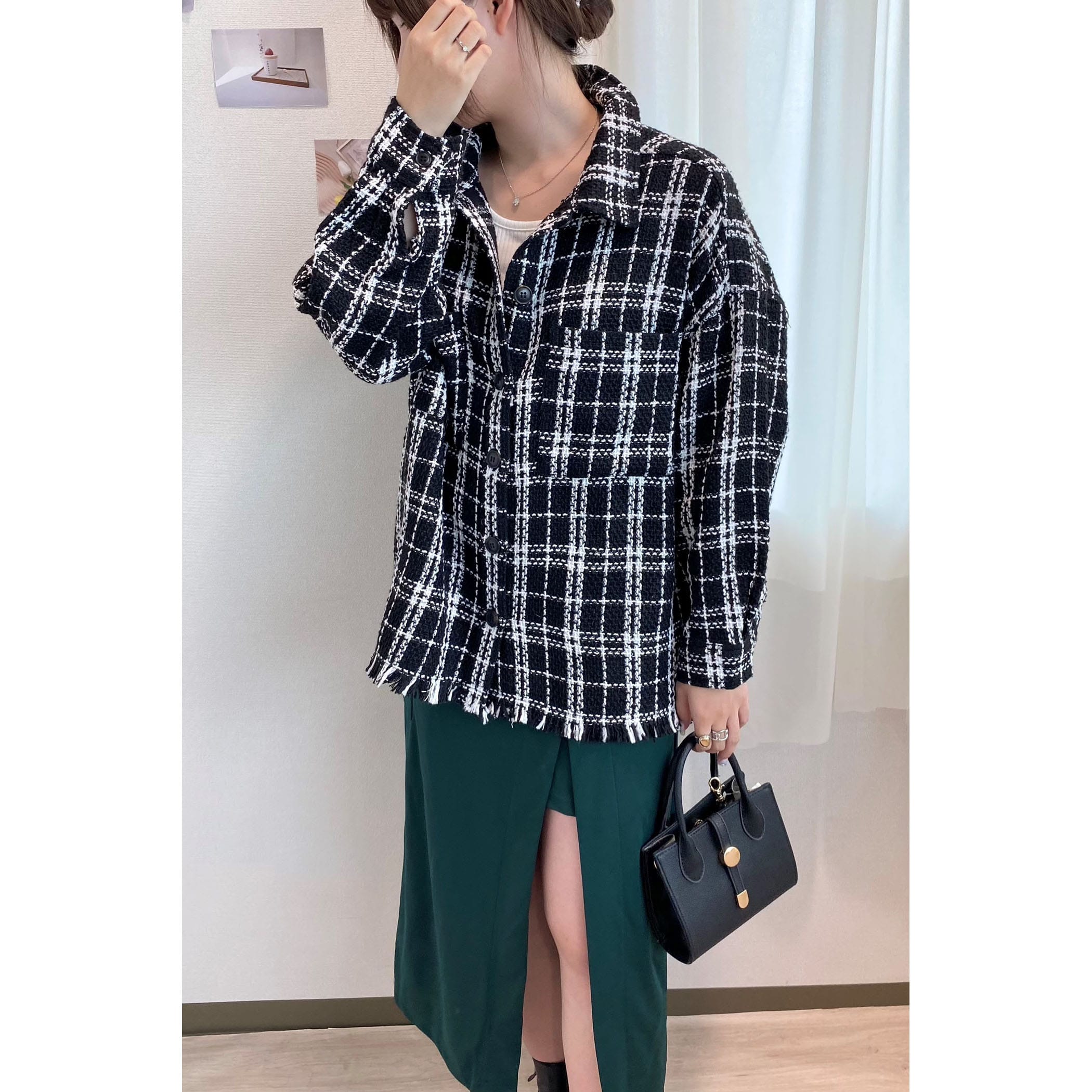 一枚でコーディネートが高見えするツイードシャツジャケット。裾がフリンジでオーバーサイズなので、ラフな雰囲気の中に上品さがプラスされたオシャレな一枚です。デニムはもちろん、パンツやスカートどちらにもコーディネートしやすいアイテムです。