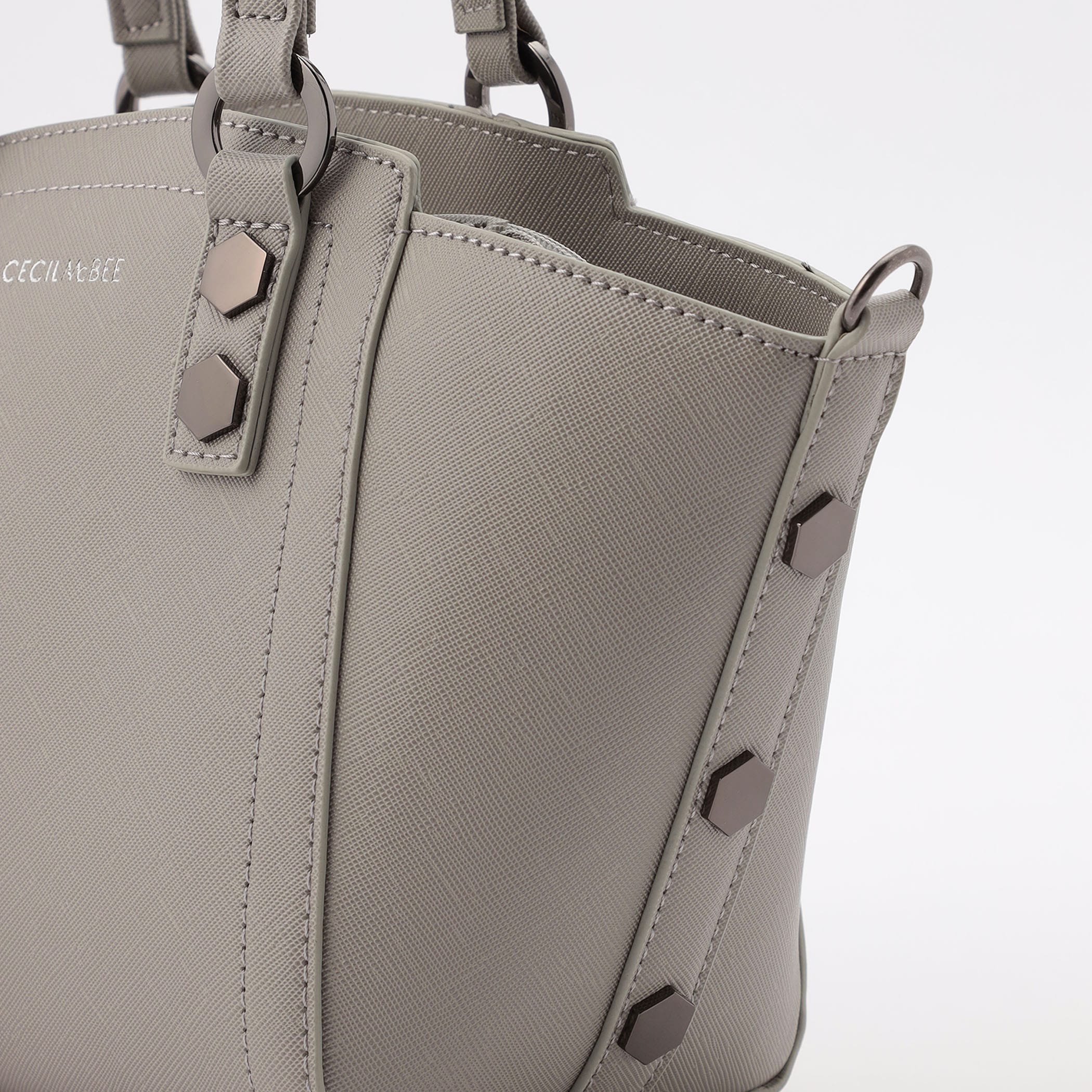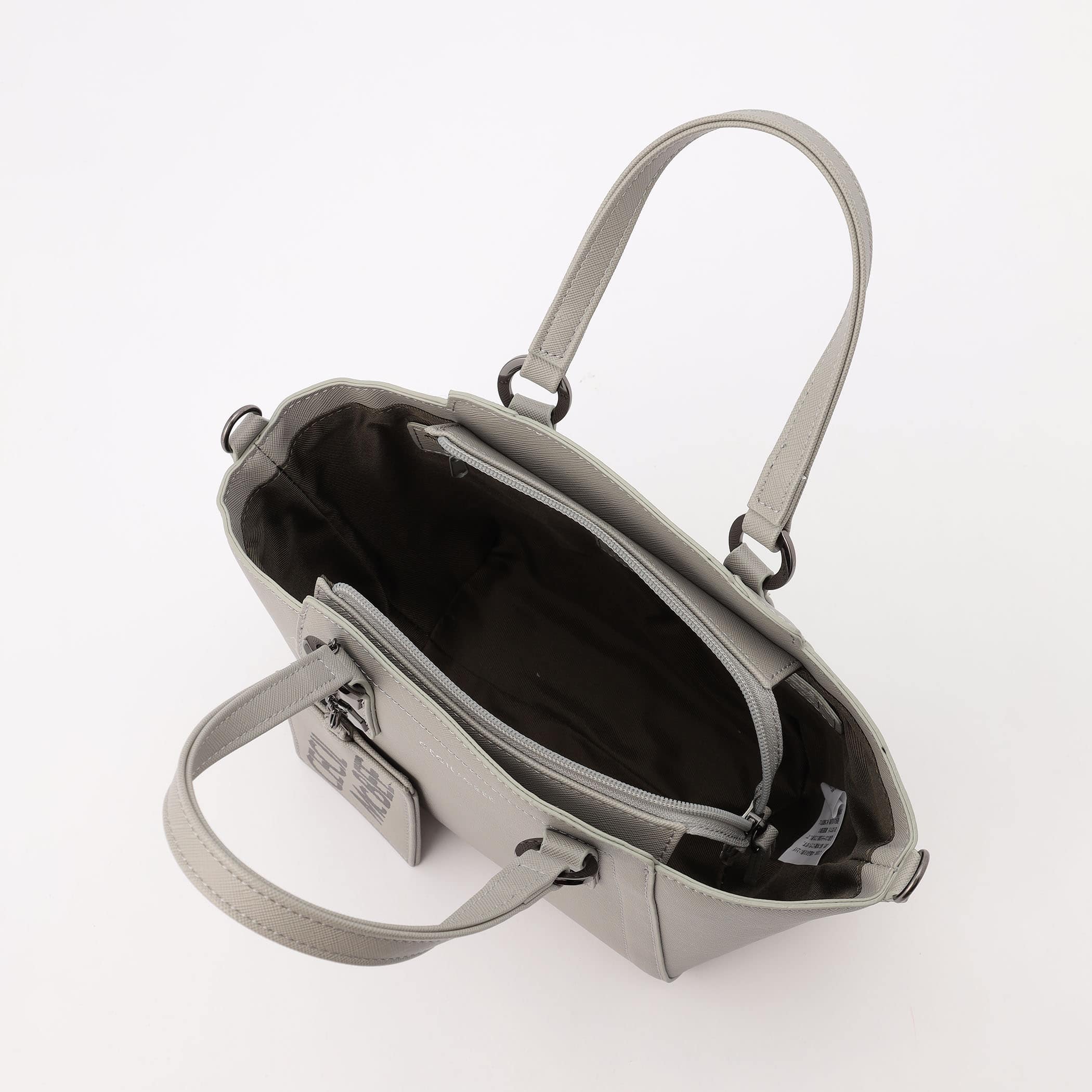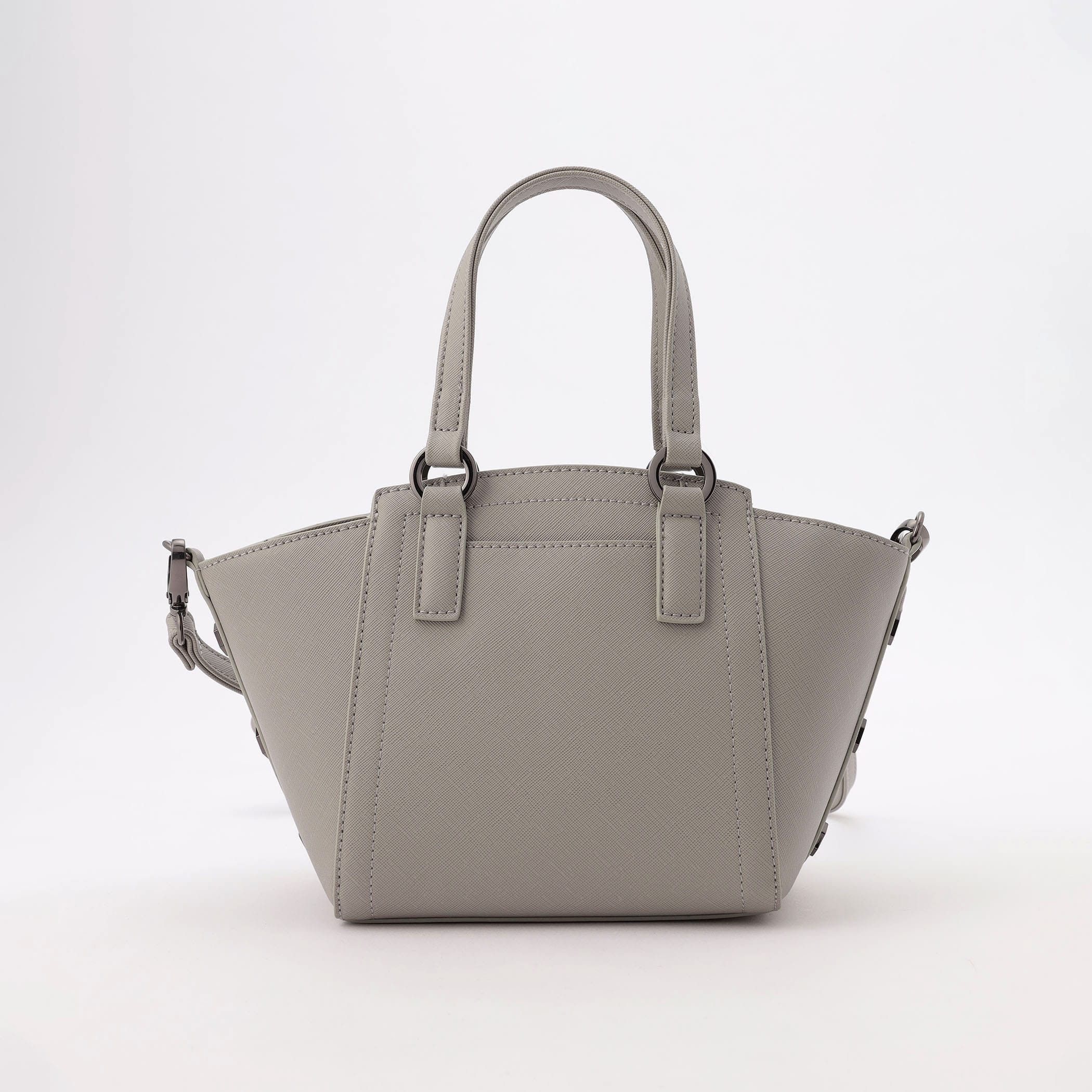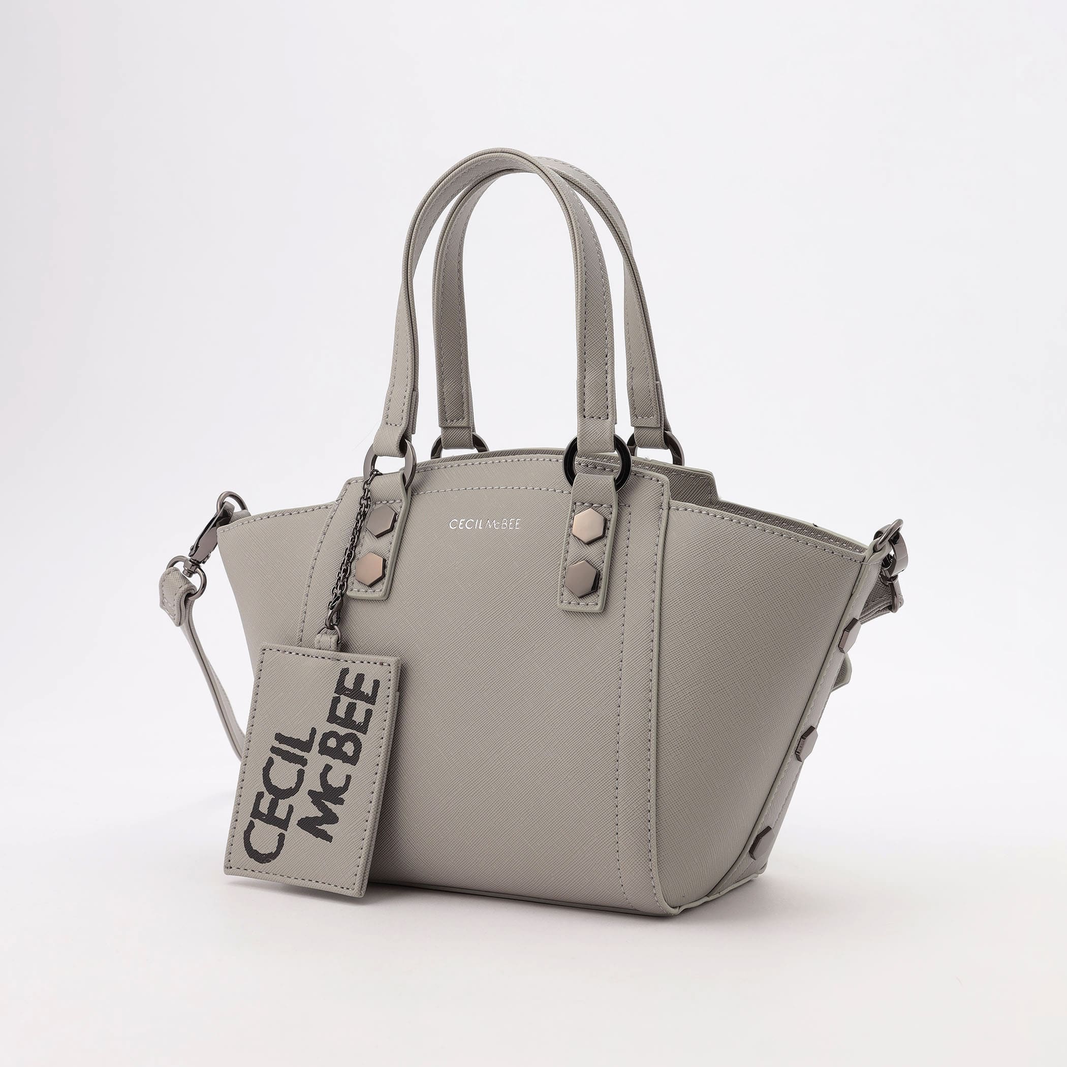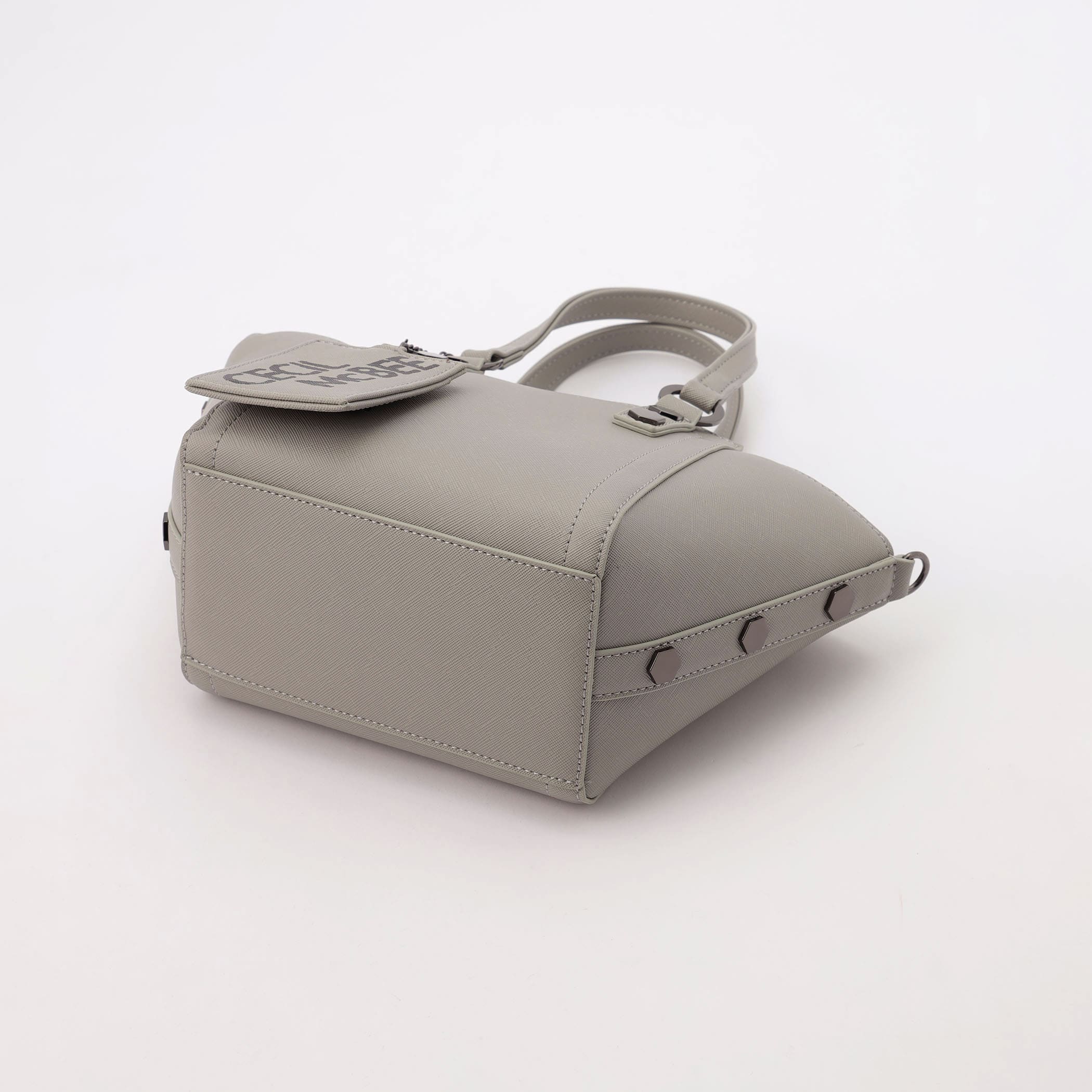 ダイヤ形状のブラックスタッズがクールさを演出。取り外し可能な付属の手書き風ロゴのパスケースがカジュアル感をプラス。シンプルな形状ながら存在感抜群のバッグです。