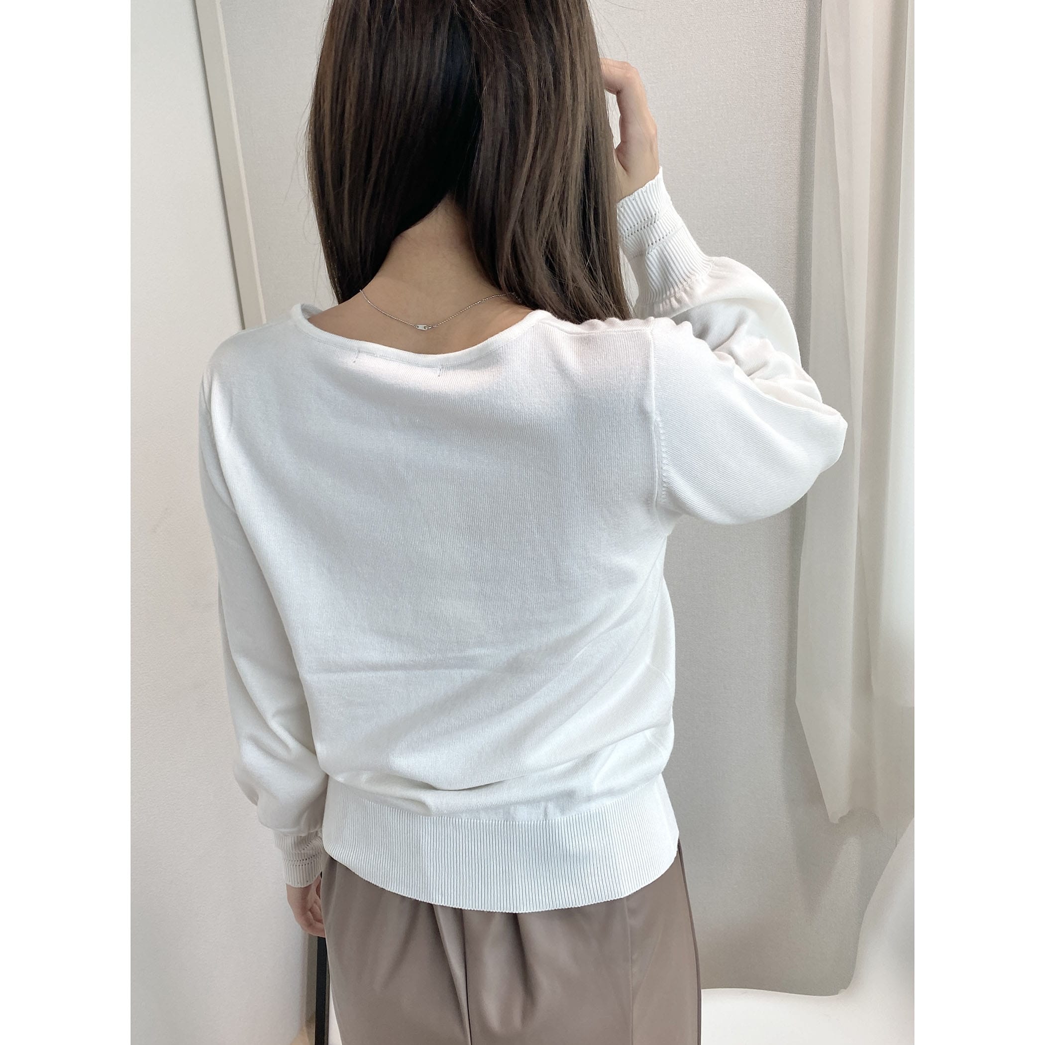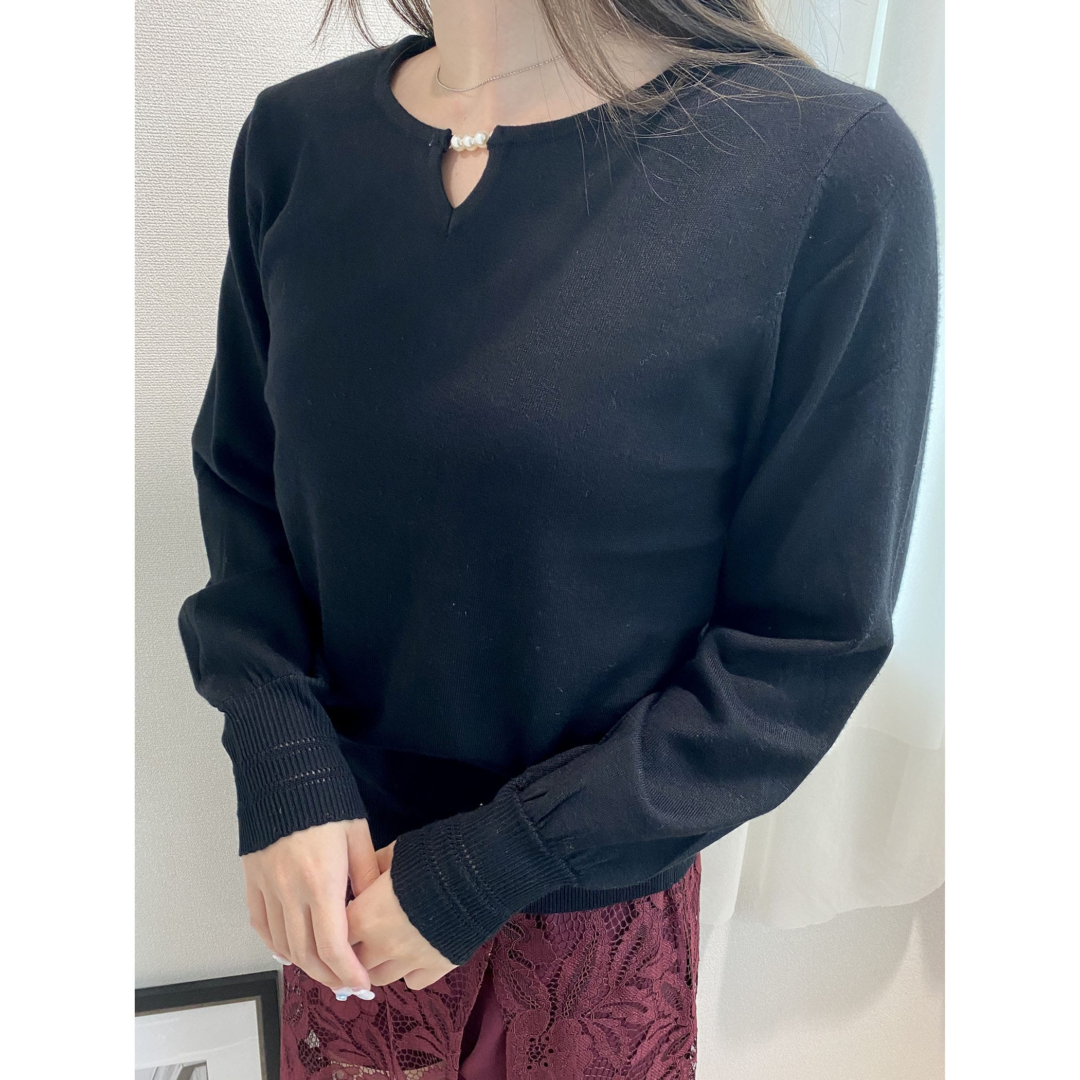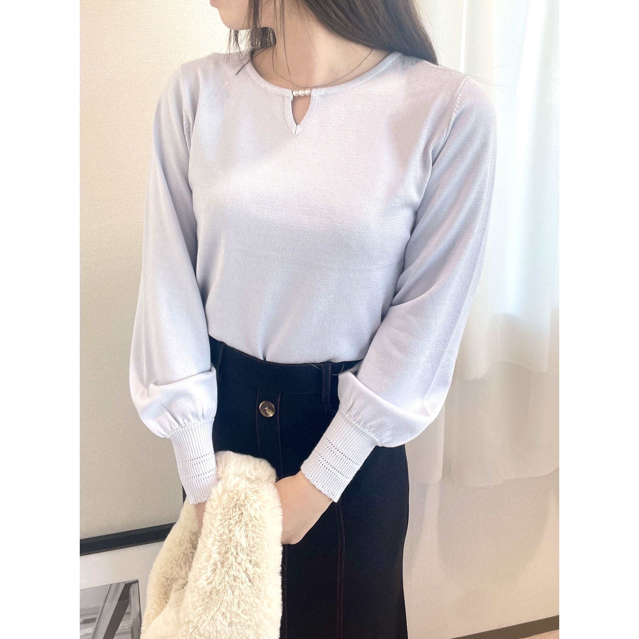 デコルテのパールが大人可愛いプルオーバー。ふんわりとした袖のボリュームと、透かし編みのリブが上品さも演出。スカート、パンツどちらにでも合わせやすいサイズ感で、着回し抜群の一枚です。ご家庭で手洗いも可能です。