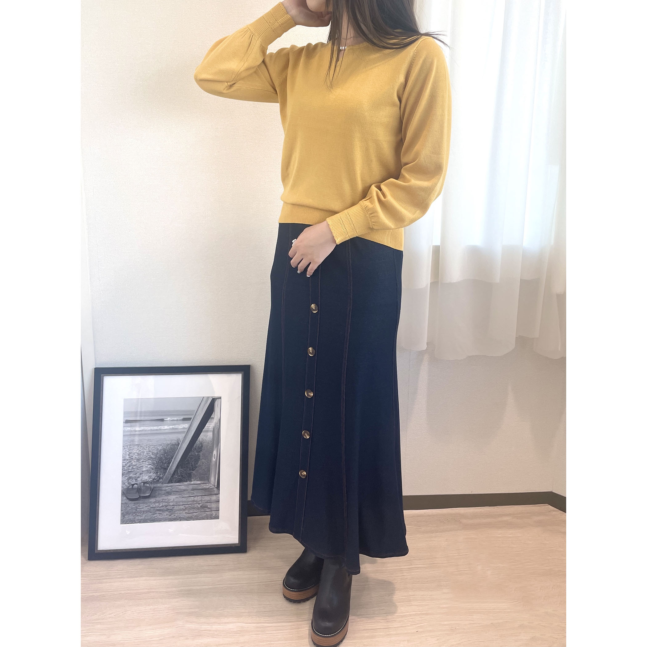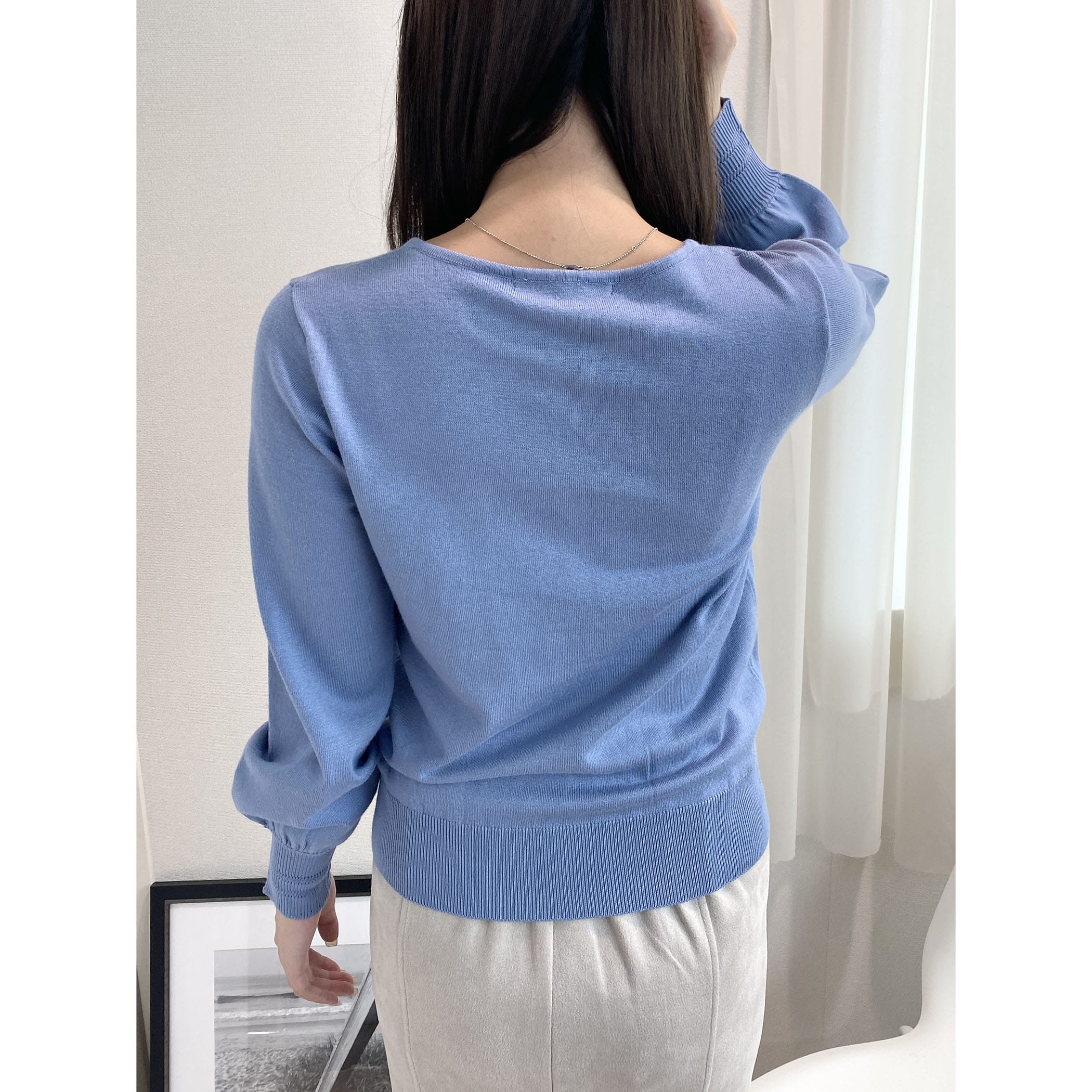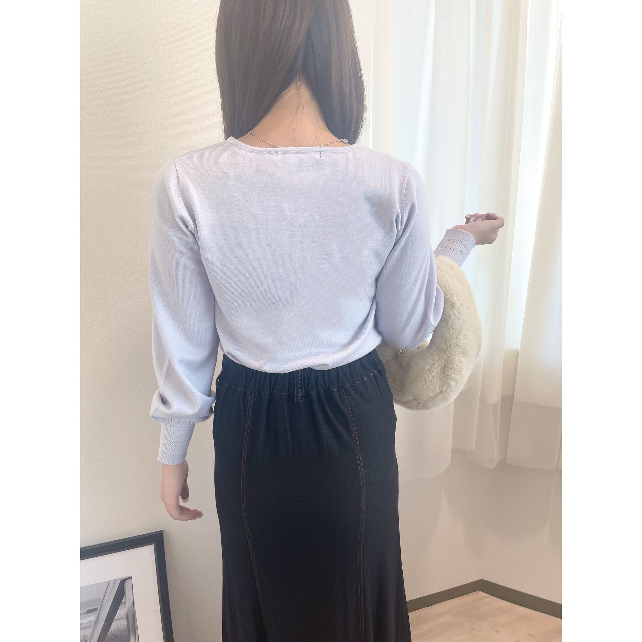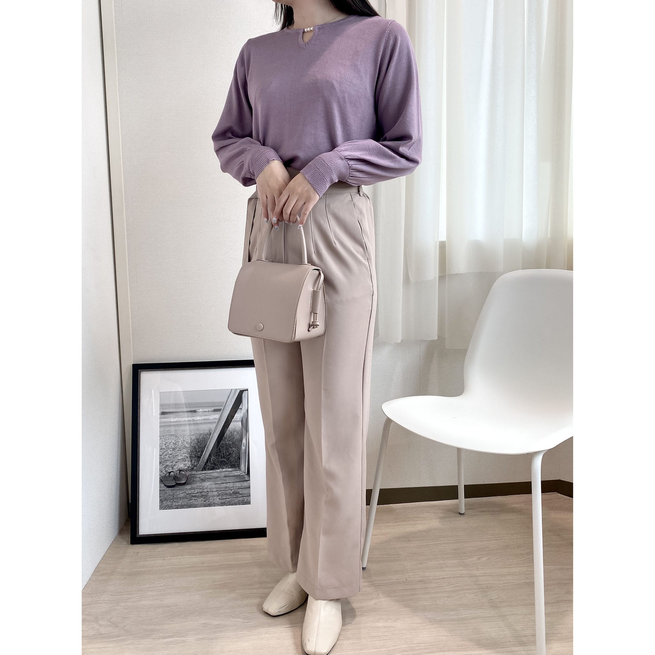 デコルテのパールが大人可愛いプルオーバー。ふんわりとした袖のボリュームと、透かし編みのリブが上品さも演出。スカート、パンツどちらにでも合わせやすいサイズ感で、着回し抜群の一枚です。ご家庭で手洗いも可能です。