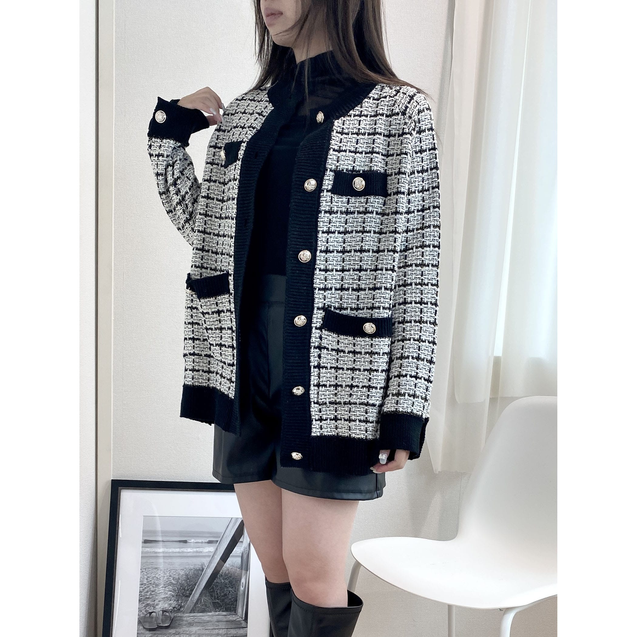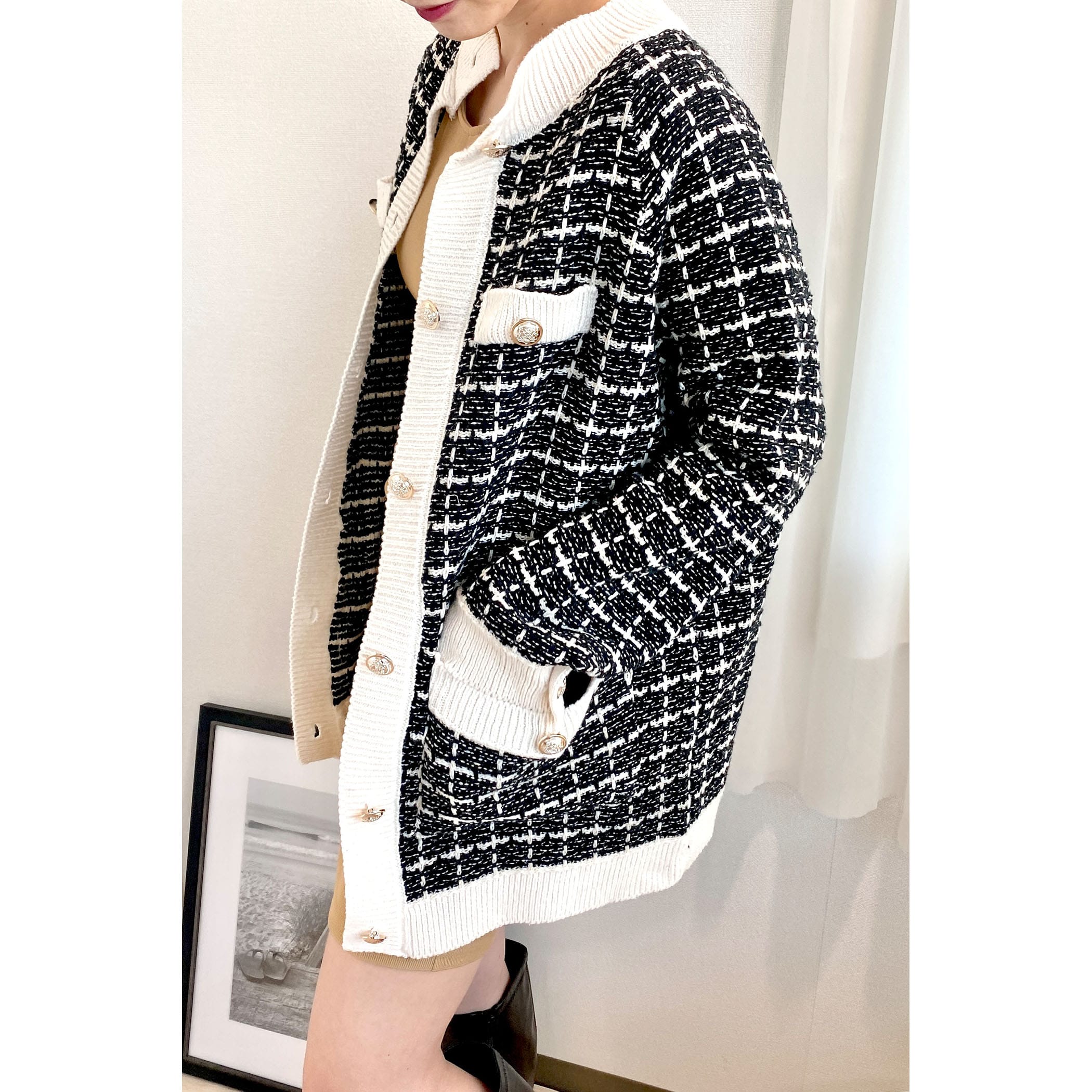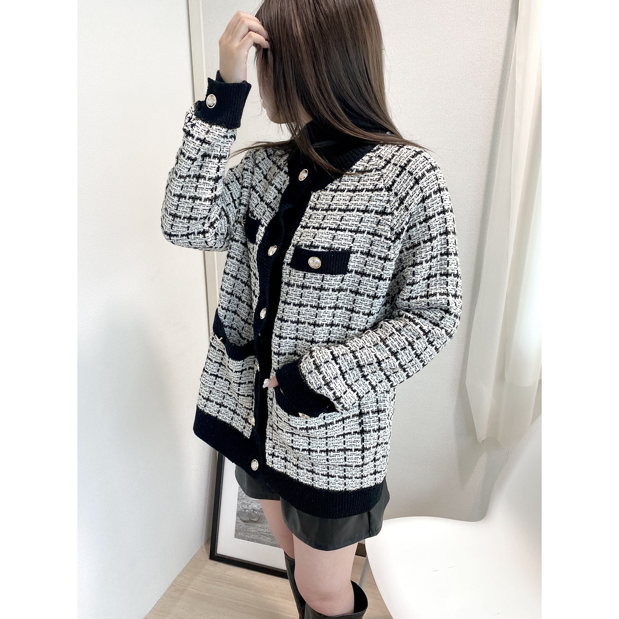 今季トレンドのツイードアイテムを、ニットカーディガンに落とし込むことでデイリーに使えるアイテムに◎