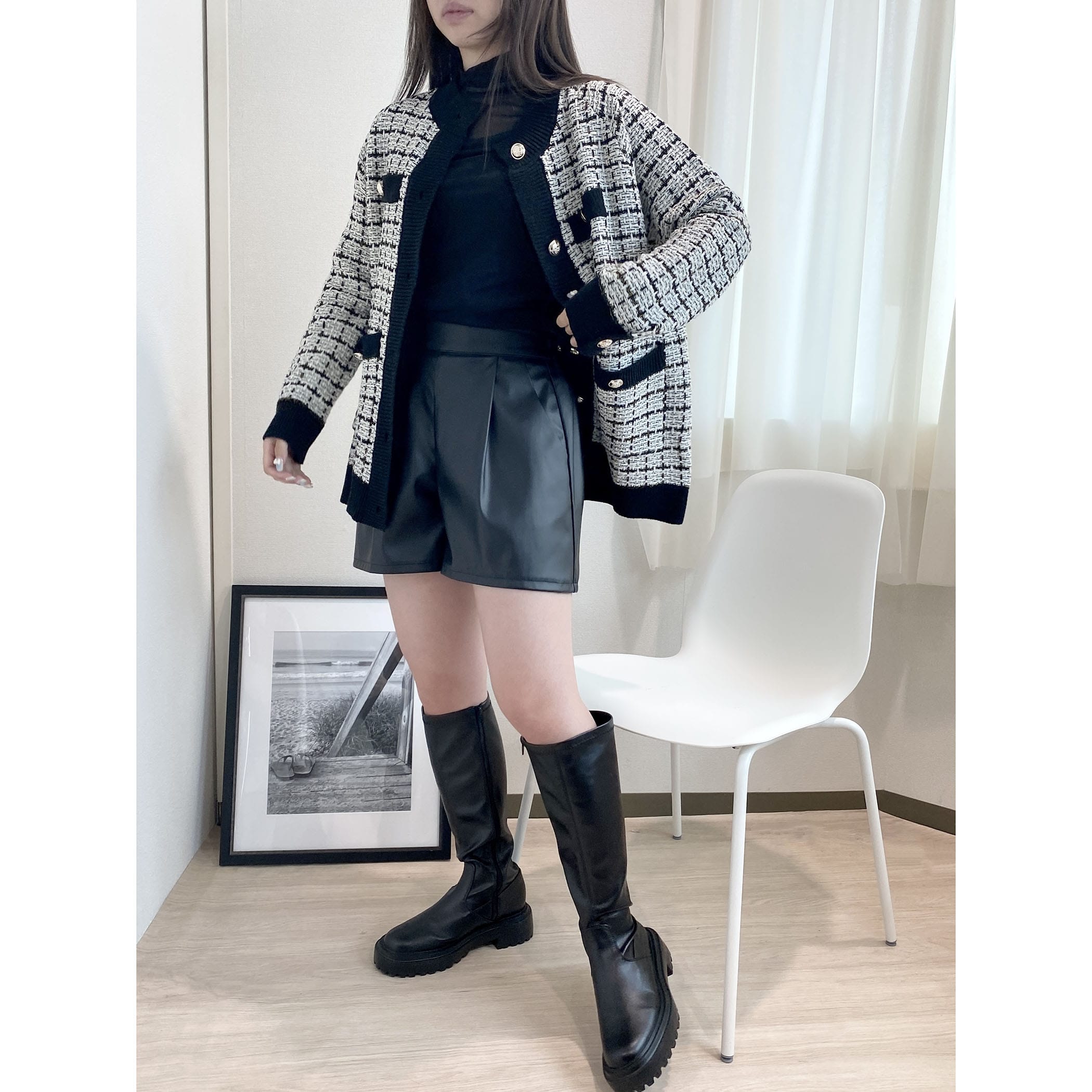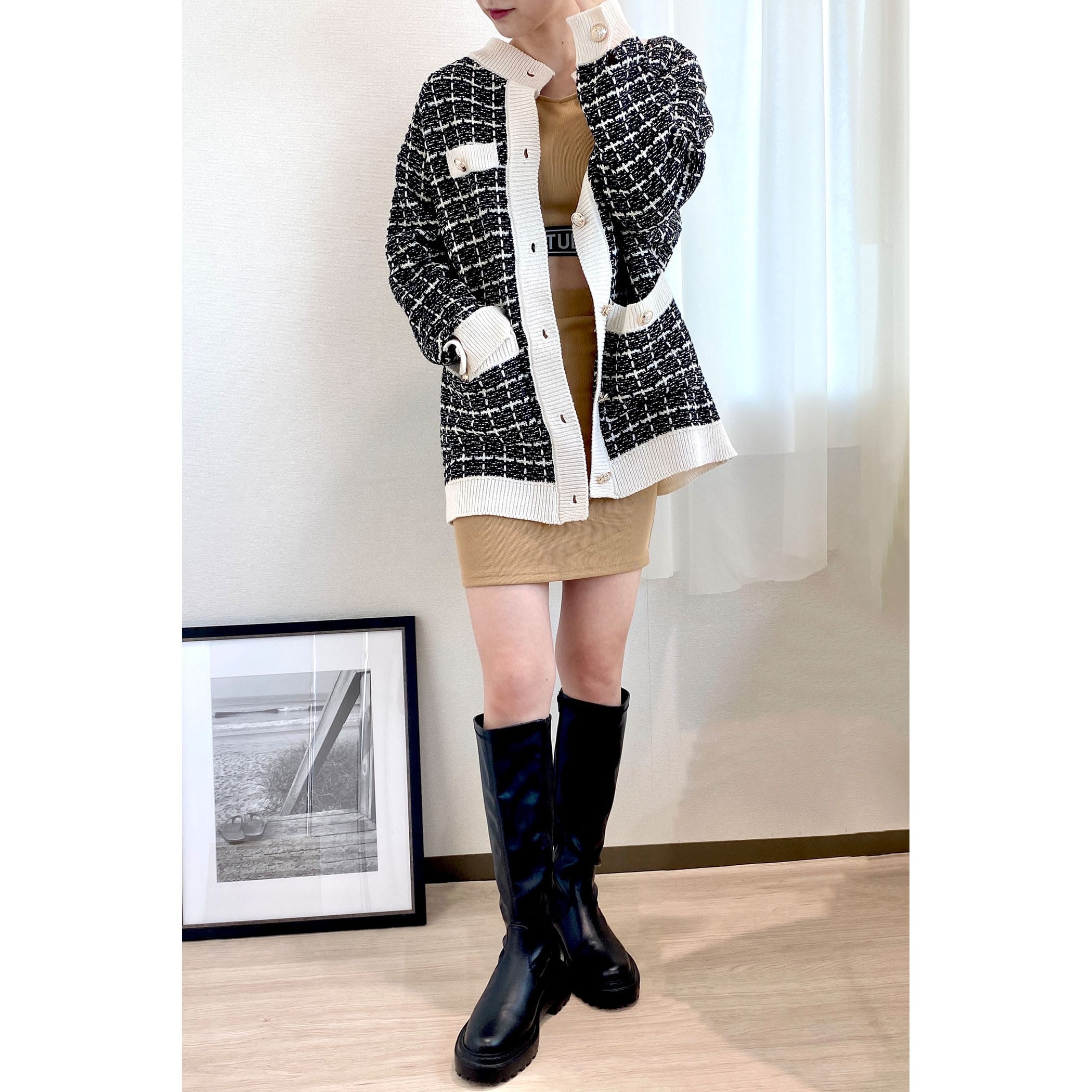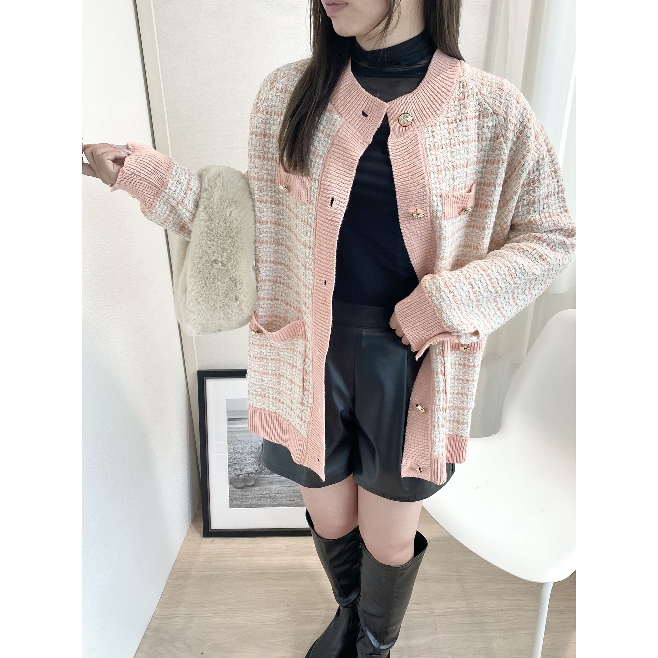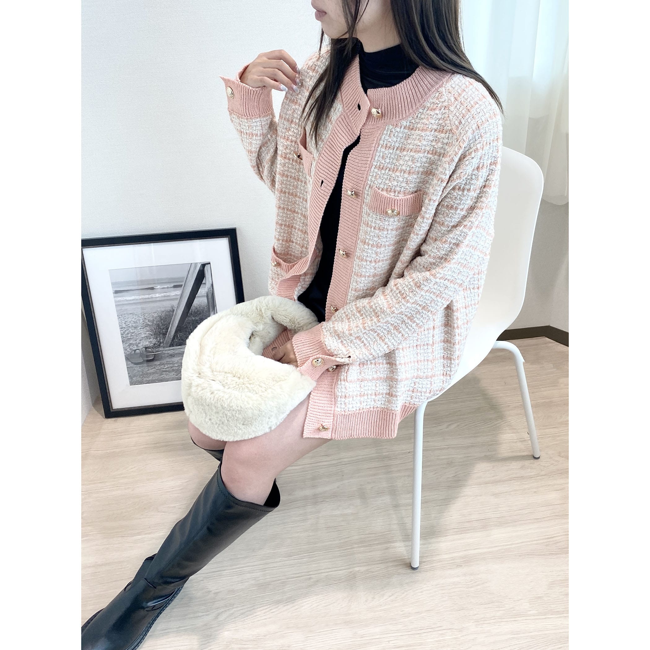 今季トレンドのツイードアイテムを、ニットカーディガンに落とし込むことでデイリーに使えるアイテムに◎