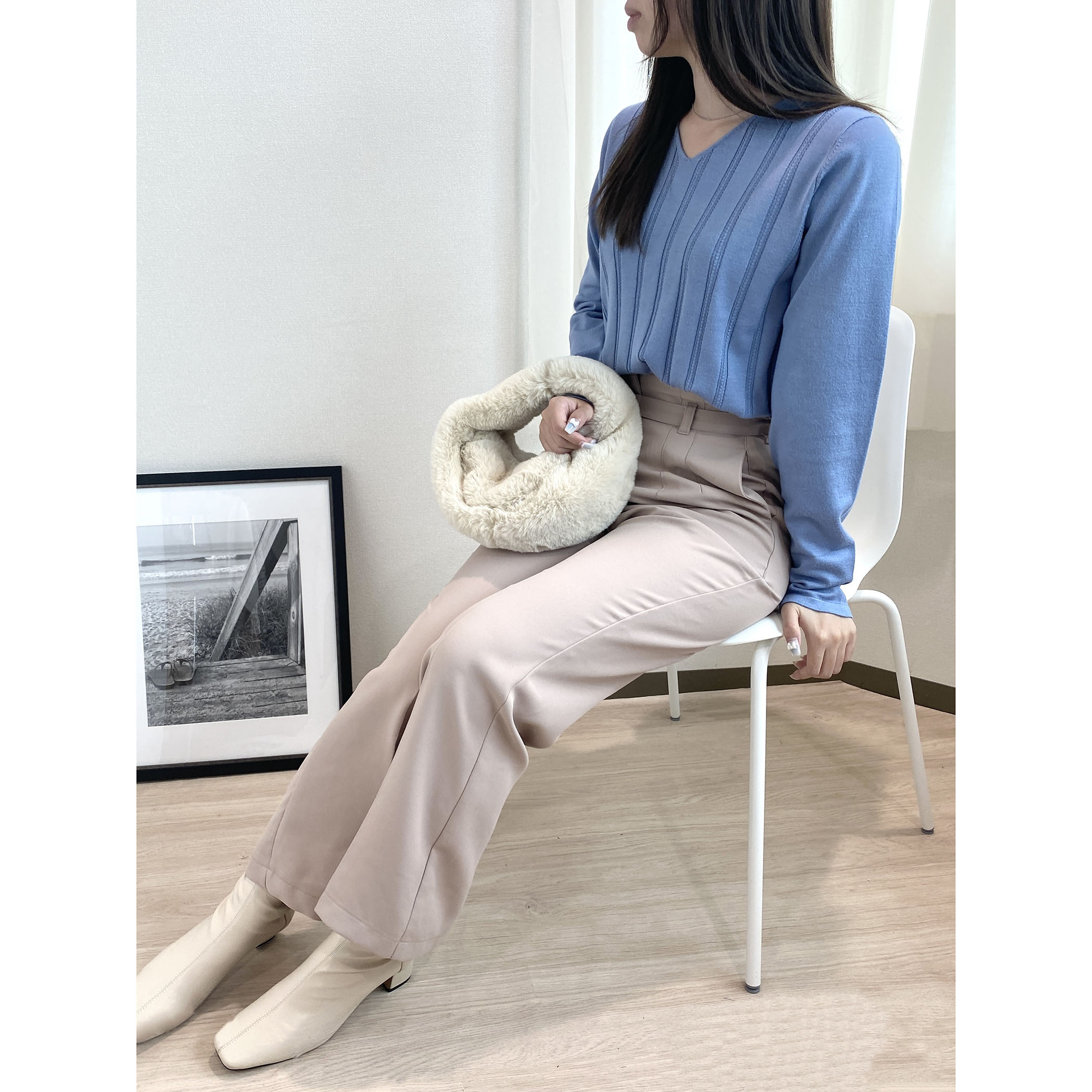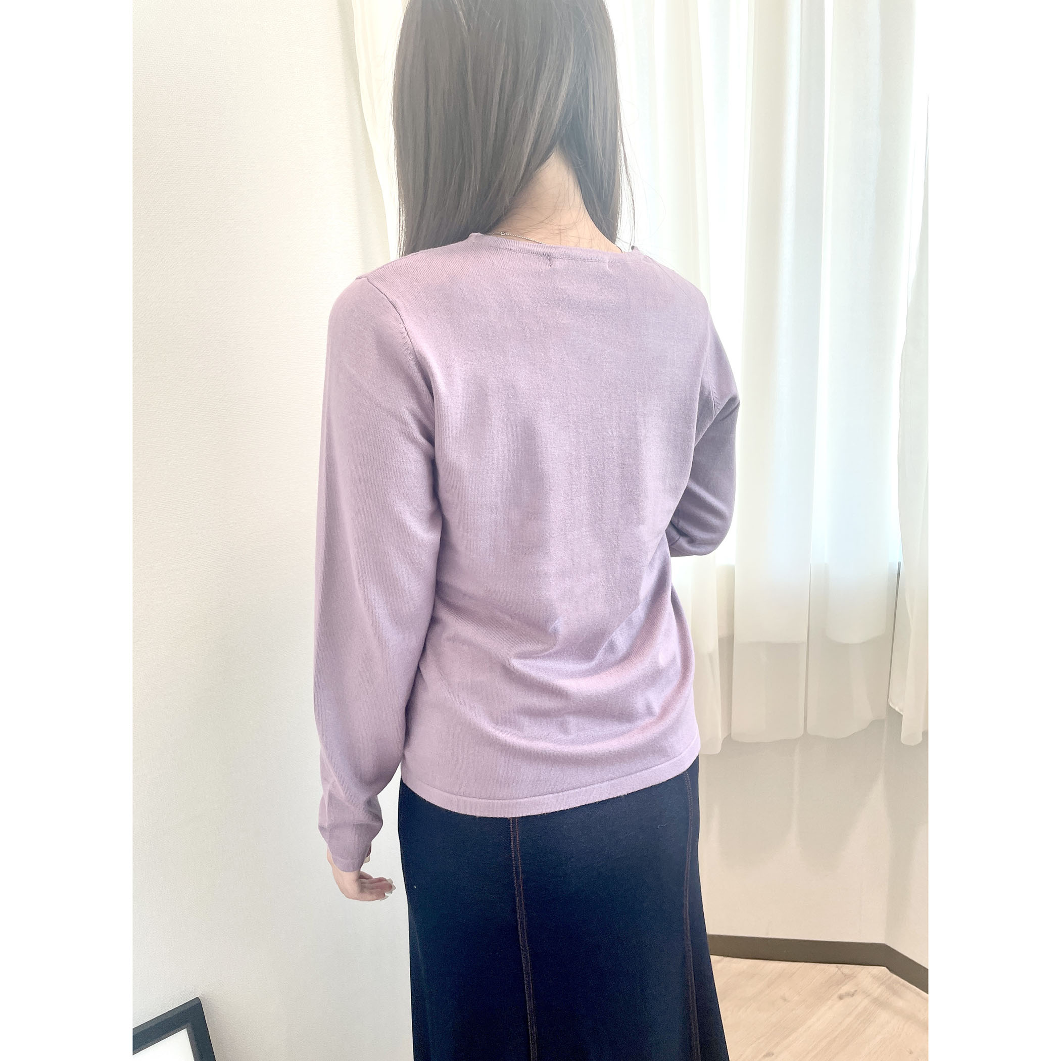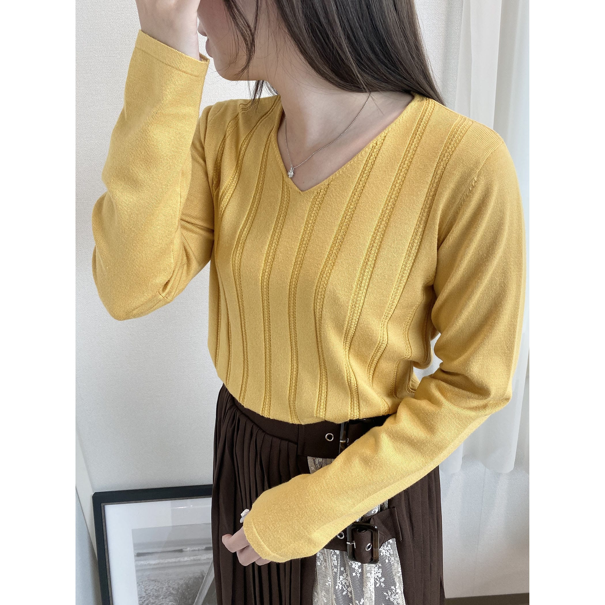 縦ラインの柄編みとVネックがスッキリと見せてくれるプルオーバー。やわらかく肌触りのいい素材感で着心地も抜群です。ご家庭で手洗いも可能です。