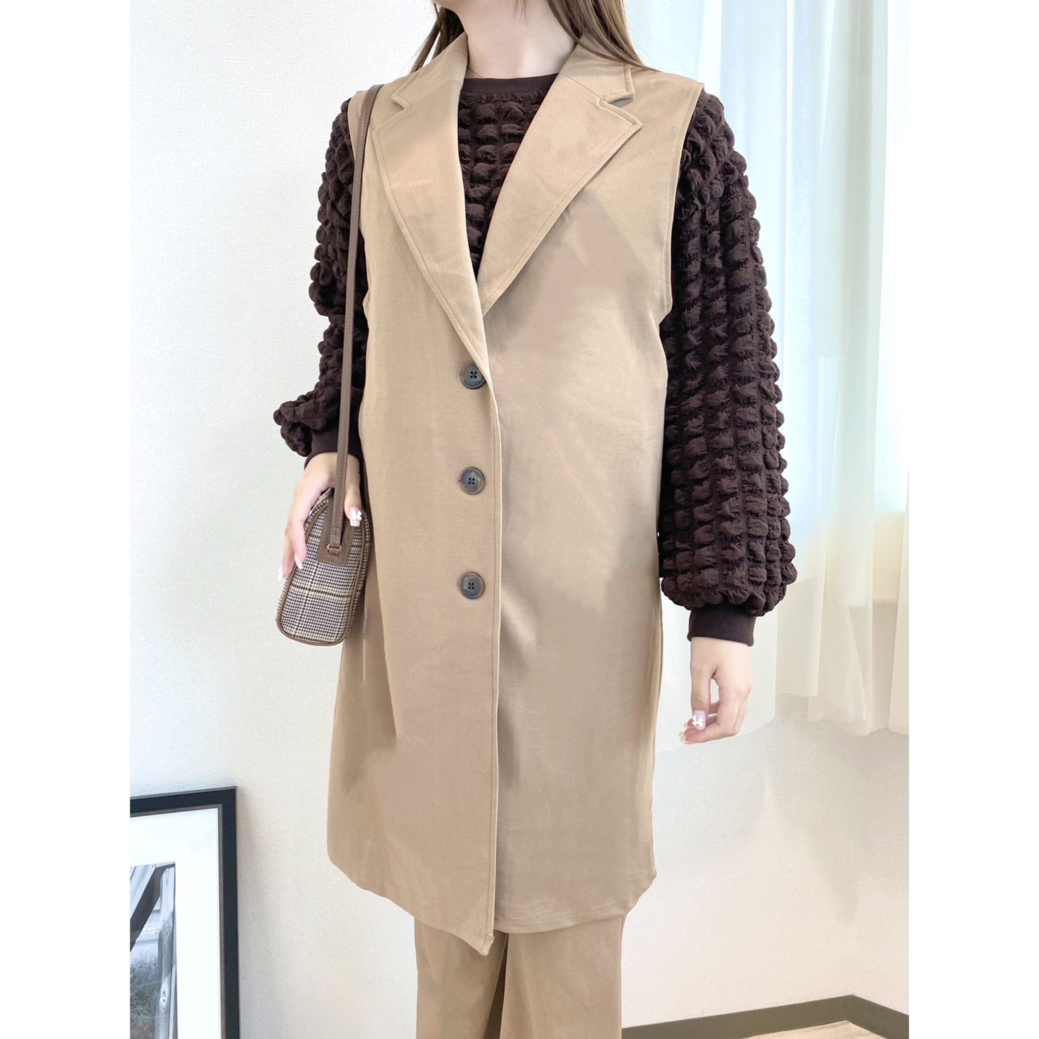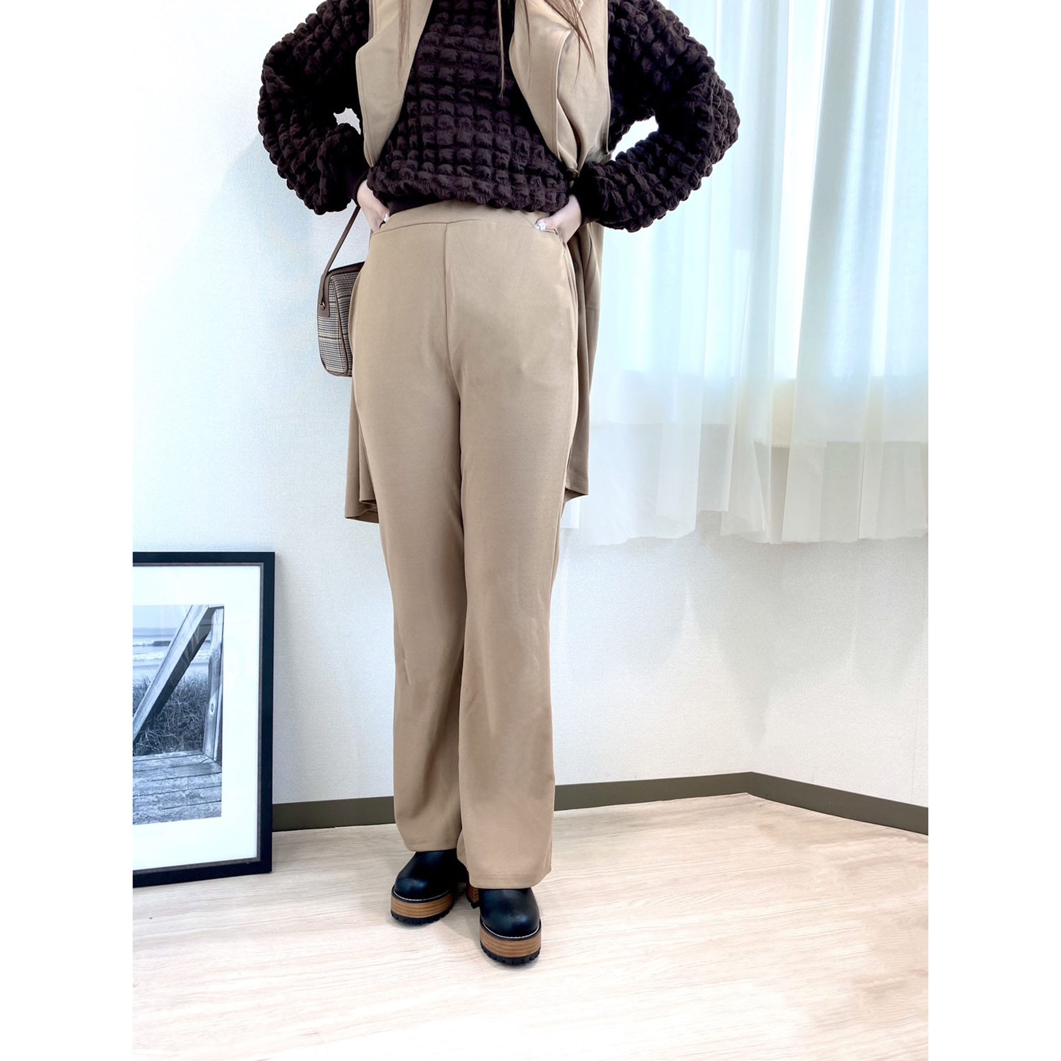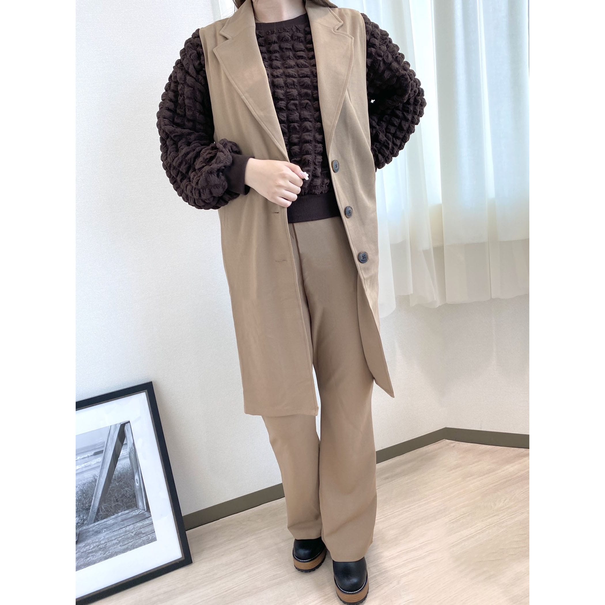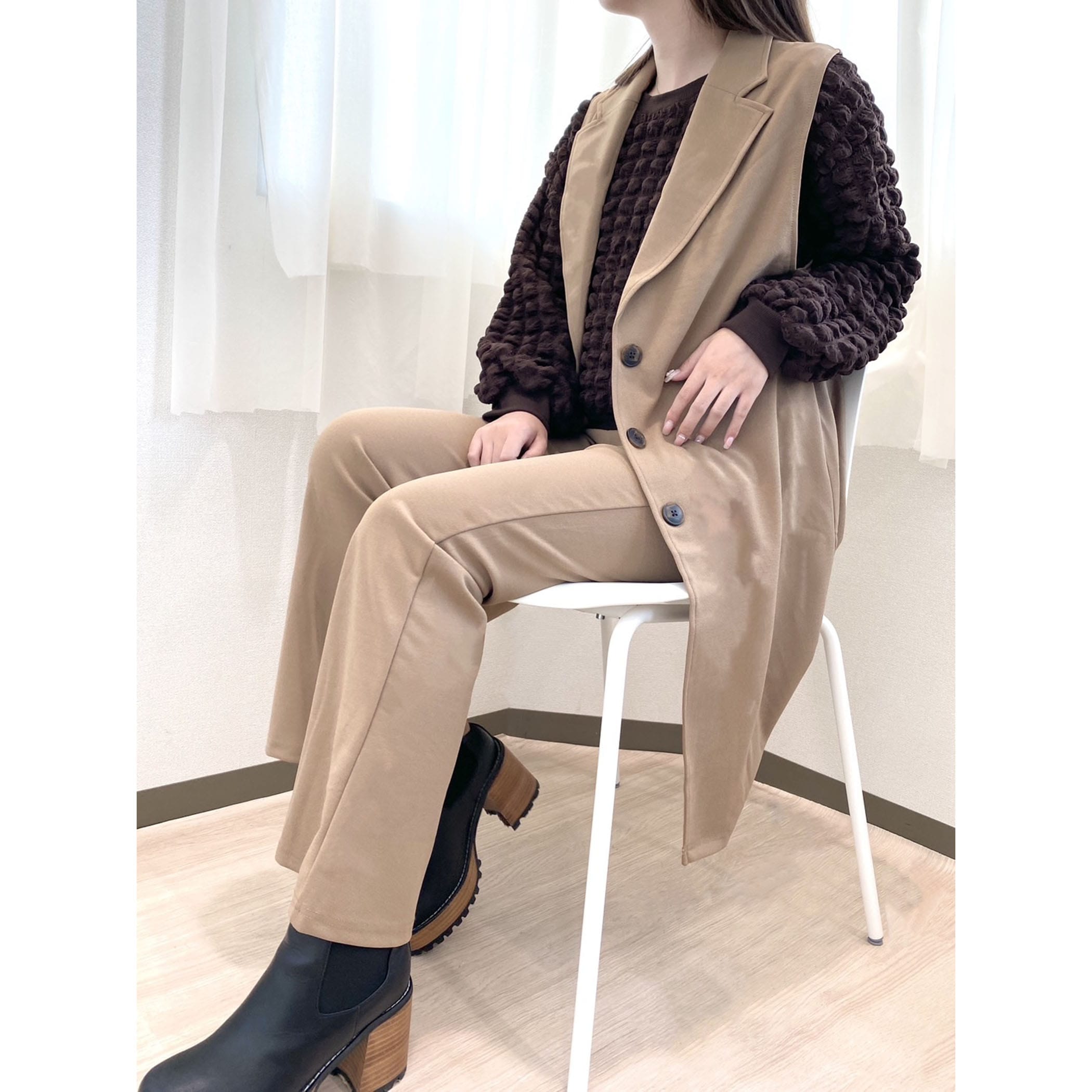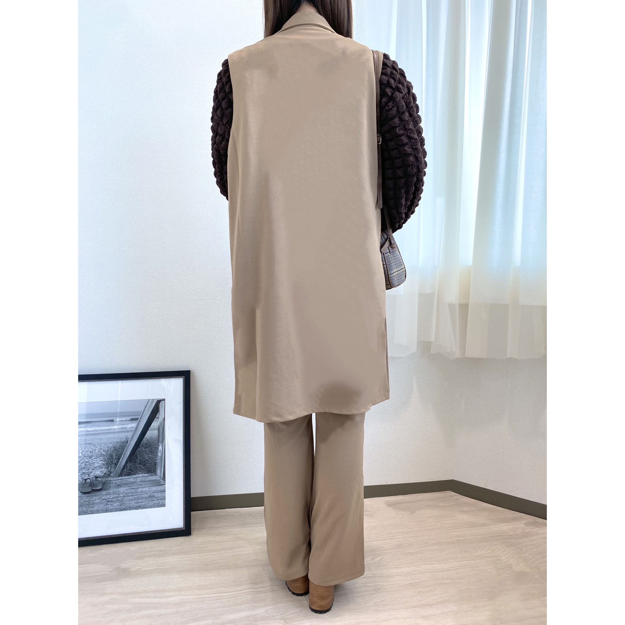 シーズンレスで活躍するセットアップ対応のテーラードジレとフレアパンツのセットアップです。インナーにレイヤードコーデするだけで旬のスタイリングが完成。セットアップではもちろん上下別々にも着用いただけるので、コーデの幅が広がるアイテムです。