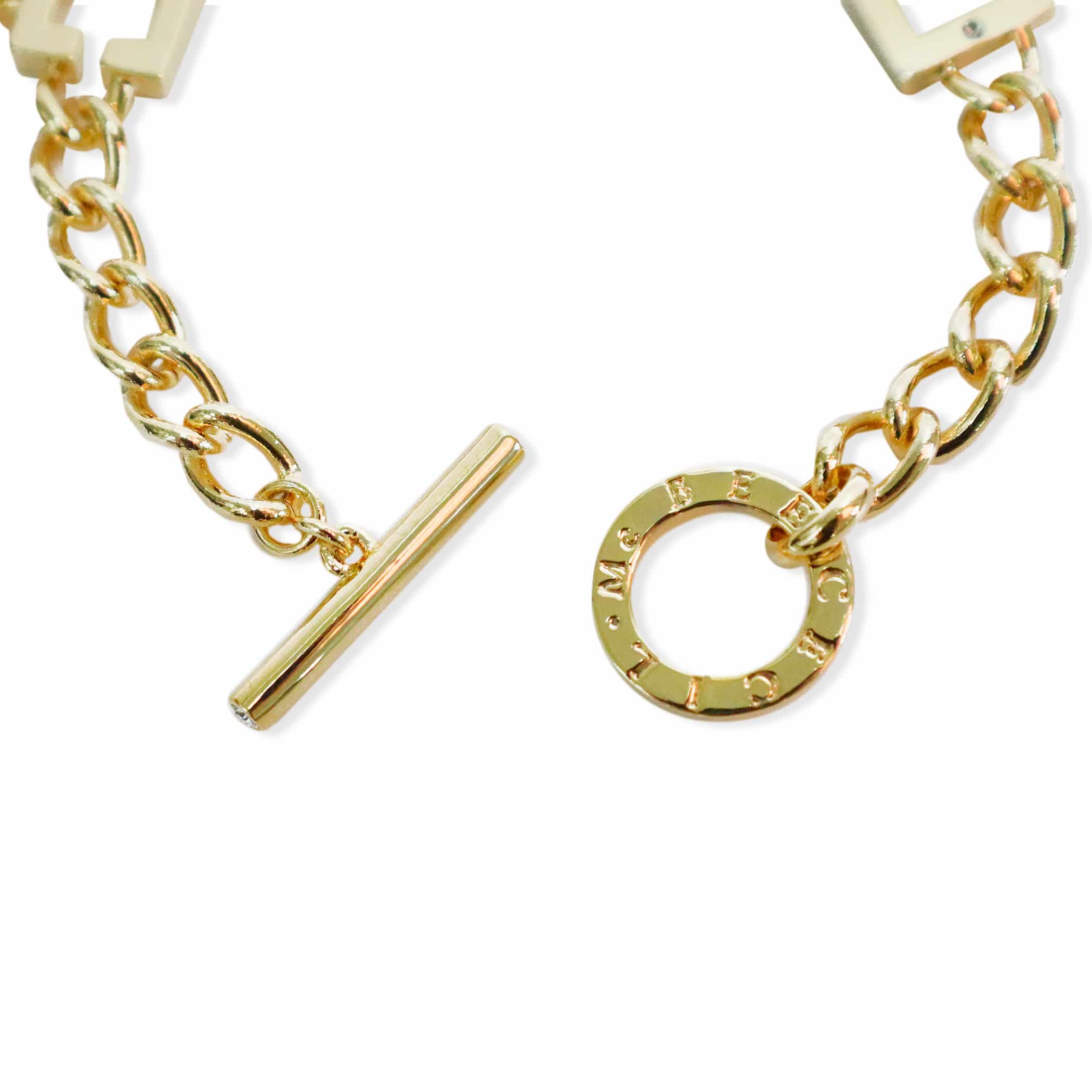 CマークがついたボリュームのあるチェーンにCMロゴとピンクストーン、お花モチーフのチャームが付いたレスレット。手元にアクセントをプラスしてくれます。